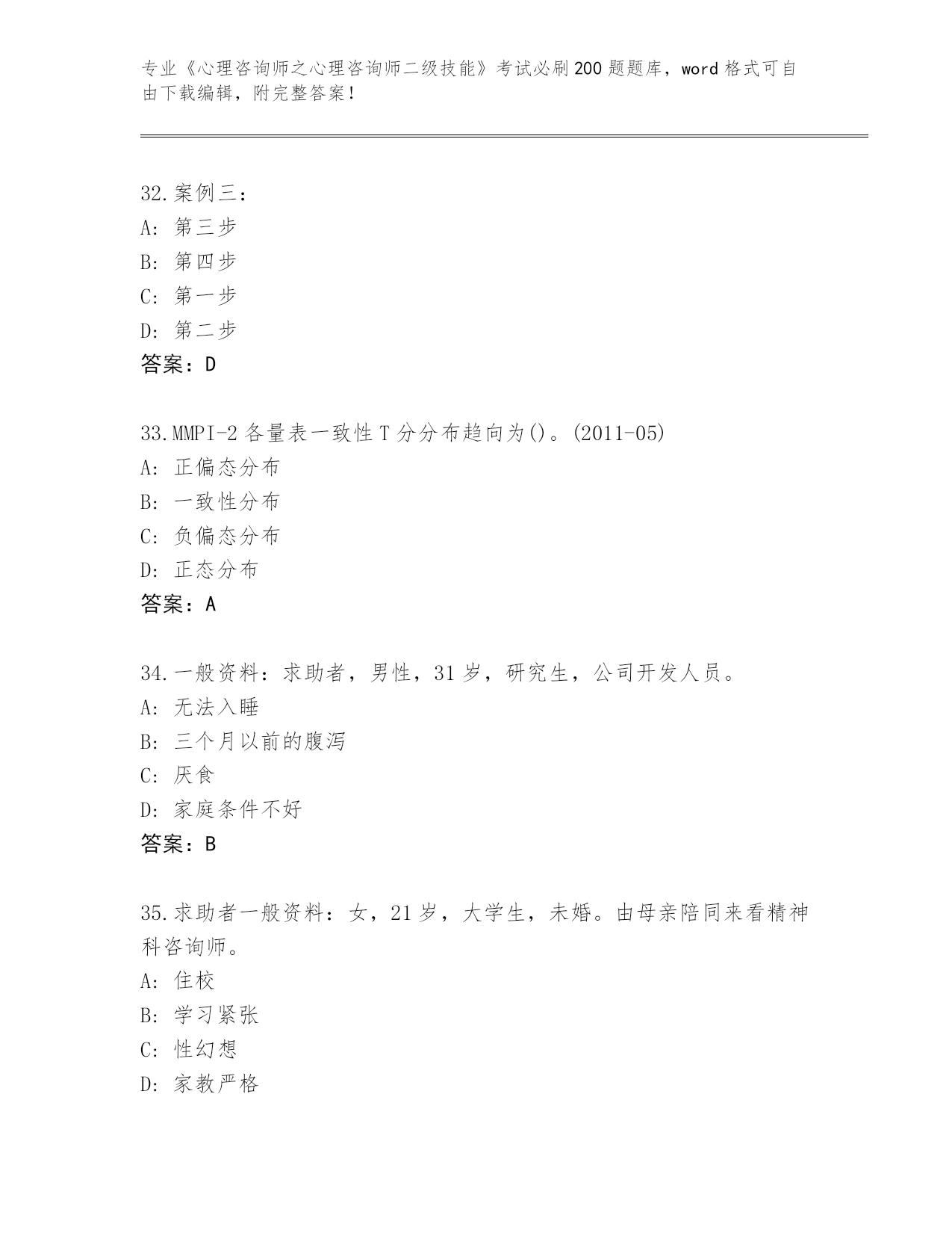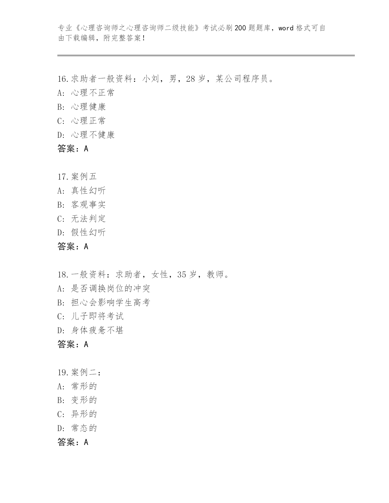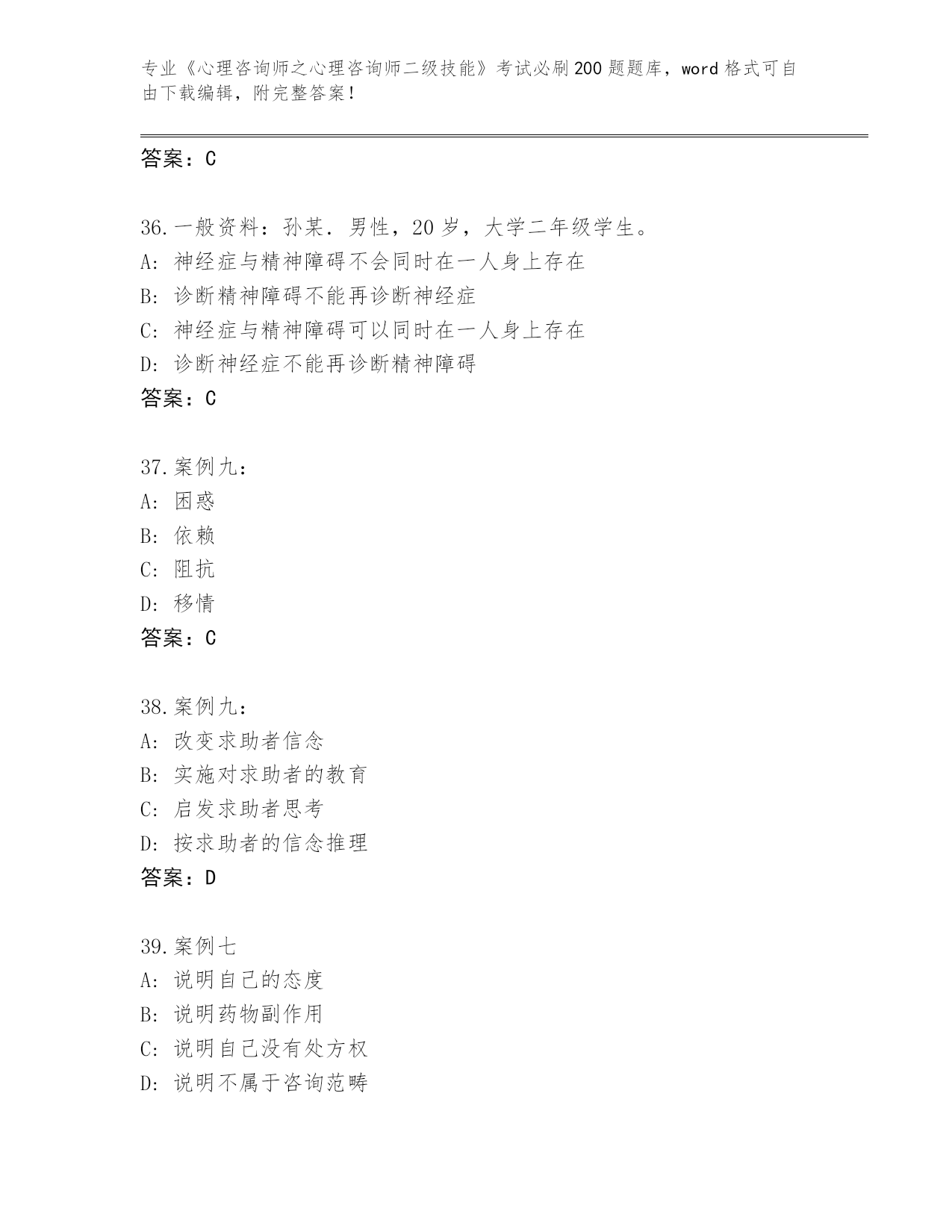 内部使用江苏省《心理咨询师之心理咨询师二级技能》考试必刷200题真题题库带下载答案