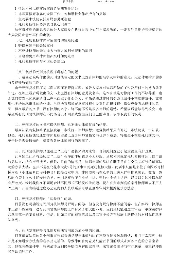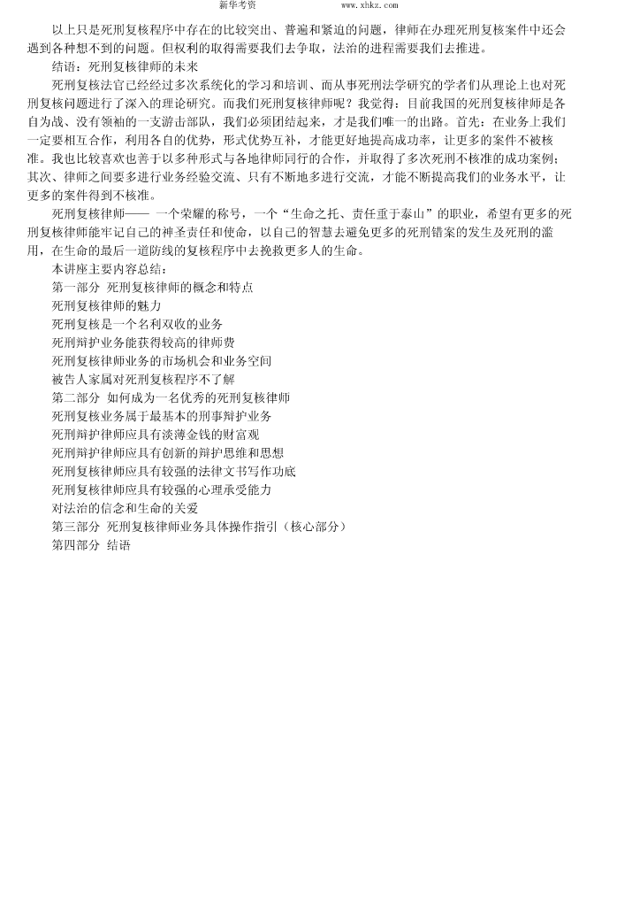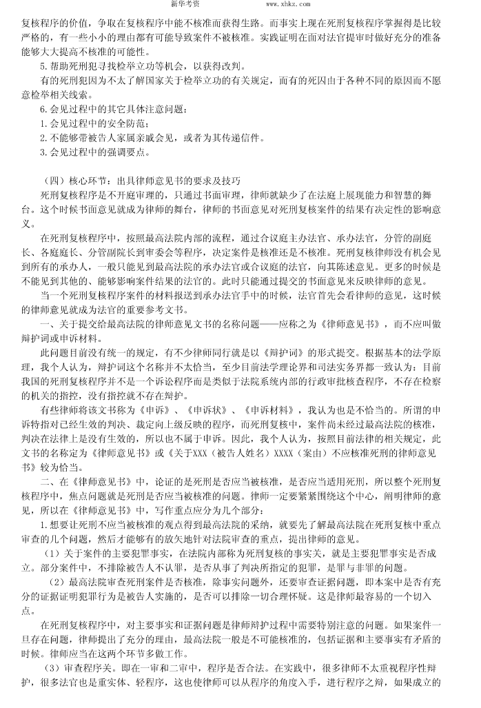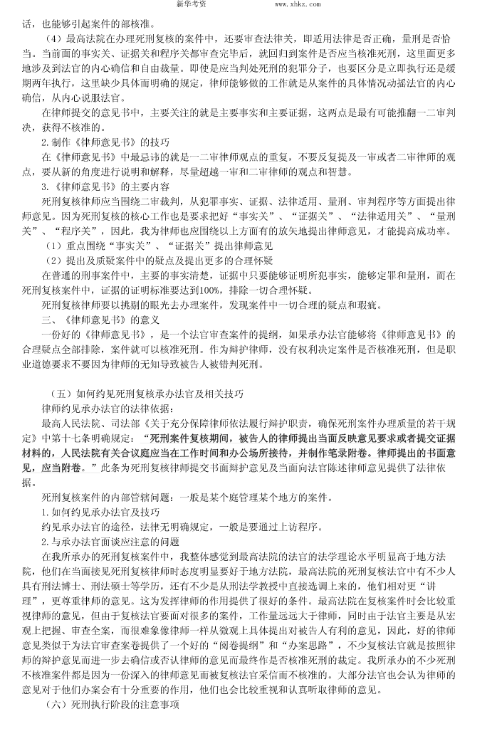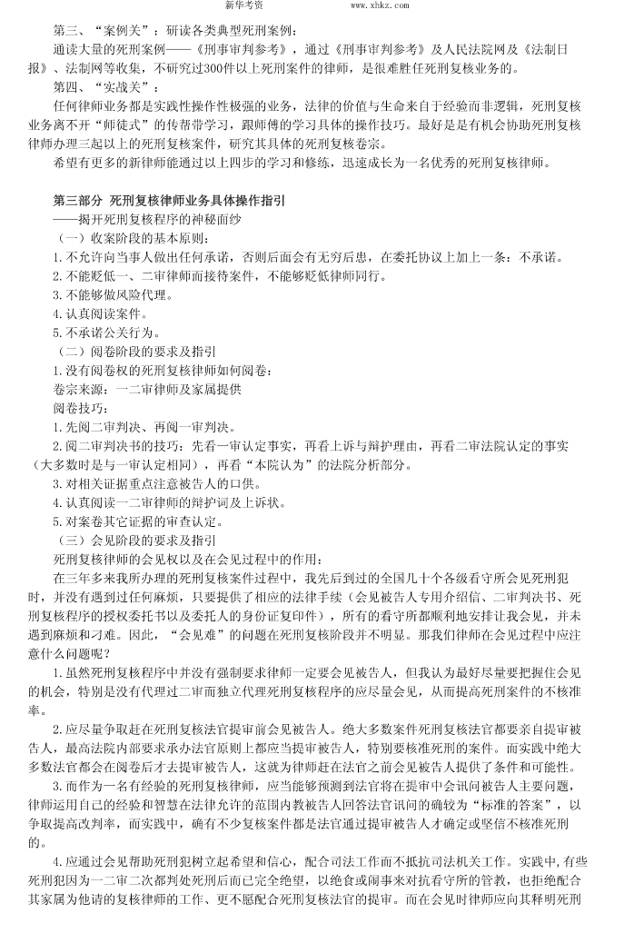 法律实务大讲堂网上辅导《死刑复核案件实务技巧》第一部分(孙中伟老师主...Page1of6新华考资www.xhkz.com死刑复核案件实务技巧打印:省纸版>>清晰版>>自定字体:大中小义>>第一部分死刑复核律师的概念与特点一、死刑复核律师的概念:关于死刑复核律师的概念,目前在学术上没有标准统一的定义,我个人将其简单概括为:死刑复核律师是指接受已被中级法院及高院法院一二审判处死刑或裁定维持死刑的被告人本人及家属的委托,在最高人民法院的死刑复核程序中,为被告人提供法律帮助,以争取被告人的死刑不被核准的律师。死刑复核律师仅特指在最高法院承办已被判处死刑立即执行案件的律师,不包括被判处死缓而在高级法院复核的律师;由于被判处死缓而在高级法院复核的案件同样是二审和复核程序合二为一,死刑复核程序形同虚设,因此此阶段不可能有真正意义上的死刑复核律师。二、死刑复核律师的特点:1.案件的当事人特指只能是判处死刑立即执行的被告人:如果被告人在判处死刑缓刑二年执行的不适用。因为判处死刑缓期二年执行的被告人其死刑复核权在省一级高级法院,目前的现状往往依然是死刑复核程序与二审程序合二为一,这种情况下律师无法承办独立的死刑复核业务。2.只能是委托而不能是接受指派:目前的死刑复核程序不适用法律援助的指派。3.案件的受理机关只能是最高人民法院,不包括省一级高级法院判处死刑缓期二年执行的情况。4.死刑复核律师所提供的不是辩护,而是类似于提供法律帮助的人:死刑复核程序不是诉讼程序,没有检方的指控,没有指控就没有辩护,而是内似于最高法院内部的行政核查程序。死刑复核律师作为一种独立新兴的专业律师的真正起源应源于2007年1月1日死刑复核权正式收归最高法院之后。我在2007年初接收《法制日报》记者的专题采访时首次提出死刑复核律师的概念。我首次预言提出:随着死刑复核权最高人民法院,中国律师业中将会产生一批专业从事死刑复核业务的死刑复核律师;死刑复核程序为死刑复核律师提供了施展才华和智慧的舞台,而死刑复核程序因为有死刑复核律师的参与而将会更加公正。第二部分如何成为一名优秀的死刑复核律师——成为优秀的死刑复核律师的“四步曲”死刑复核业务并非人们想象中那样高不可攀、高深莫测,年轻律师也可以涉足死刑复核业务,迅速成长为一名优秀的死刑复核律师。死刑复核业务源于最基本的刑事辩护业务,又高于刑事辩护业务,其所涉及的业务范围相对较窄、专业性极强,所涉及的知识面相对较为单一,新律师能在较短时间内掌握相关知识及技能迅速成长为一名优秀的死刑复核律师。1.死刑复核业务不需要涉外业务所需要的外语专业背景;2.死刑复核业务也不需要具体医疗事故、房地产、金融证券、知识产权等业务所需要的相关知识背景;3.大多数律师的基本素质经过学习训练后都能在短期内成长为优秀的死刑复核律师。因此,年轻的新律师能在短期内通过自学熟练掌握操作此项业务!那如何才能成长为一名优秀的死刑复核律师呢?成长为优秀的死刑复核律师的“四步曲”:第一、“法规关”:通读研究死刑复核法规司法解释,会议纪要、领导讲话;第二、“理论关”:学习国内最基本、最前沿、最顶端的死刑理论及辩护技巧,认真通读目前一流的死刑研究专家关于死刑研究的最新理论成果,了解其关于死刑的最新观点。http://www.chinalawedu.com/courses/swcz/sxfh/kcjy/main0101.asp?id=01012010-3-6法律实务大讲堂网上辅导《死刑复核案件实务技巧》第一部分(孙中伟老师主...Page2of6新华考资www.xhkz.com第三、“案例关”:研读各类典型死刑案例:通读大量的死刑案例——《刑事审判参考》,通过《刑事审判参考》及人民法院网及《法制日报》、法制网等收集,不研究过300件以上死刑案件的律师,是很难胜任死刑复核业务的。第四、“实战关”:任何律师业务都是实践性操作性极强的业务,法律的价值与生命来自于经验而非逻辑,死刑复核业务离不开“师徒式”的传帮带学习,跟师傅的学习具体的操作技巧。最好是是有机会协助死刑复核律师办理三起以上的死刑复核案件,研究其具体的死刑复核卷宗。希望有更多的新律师能通过以上四步的学习和修练,迅速成长为一名优秀的死刑复核律师。第三部分死刑复核律师业务具体操作指引——揭开死刑复核程序的神秘面纱(一)收案阶段的基本原则:1.不允许向当事人做出任何承诺,否则后面会有无穷后患,在委托协议上加上一条:不承诺。2.不能贬低一、二审律师而接待案件,不能够贬低律师同行。3.不能够做风险代理。4.认真阅读案件。5.不承诺公关行为。(二)阅卷阶段的要求及指引1.没有阅卷权的