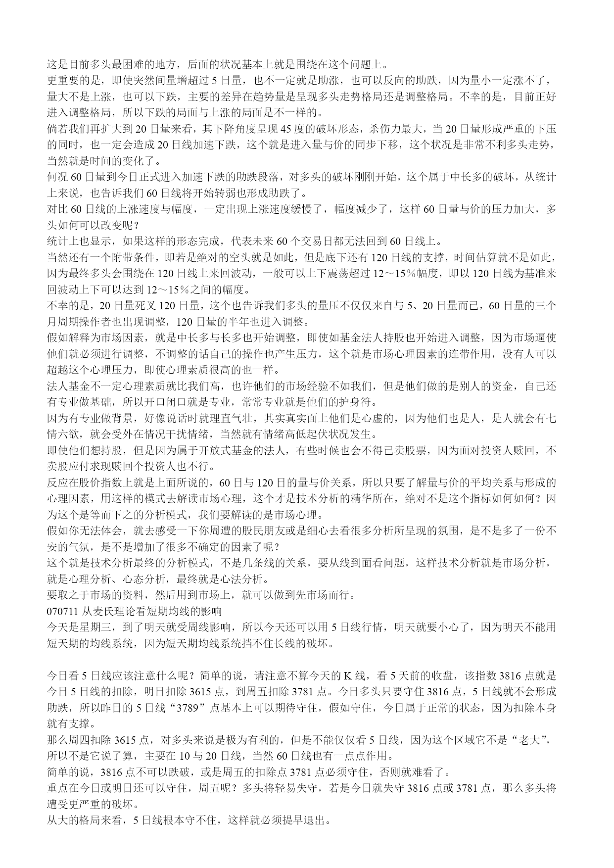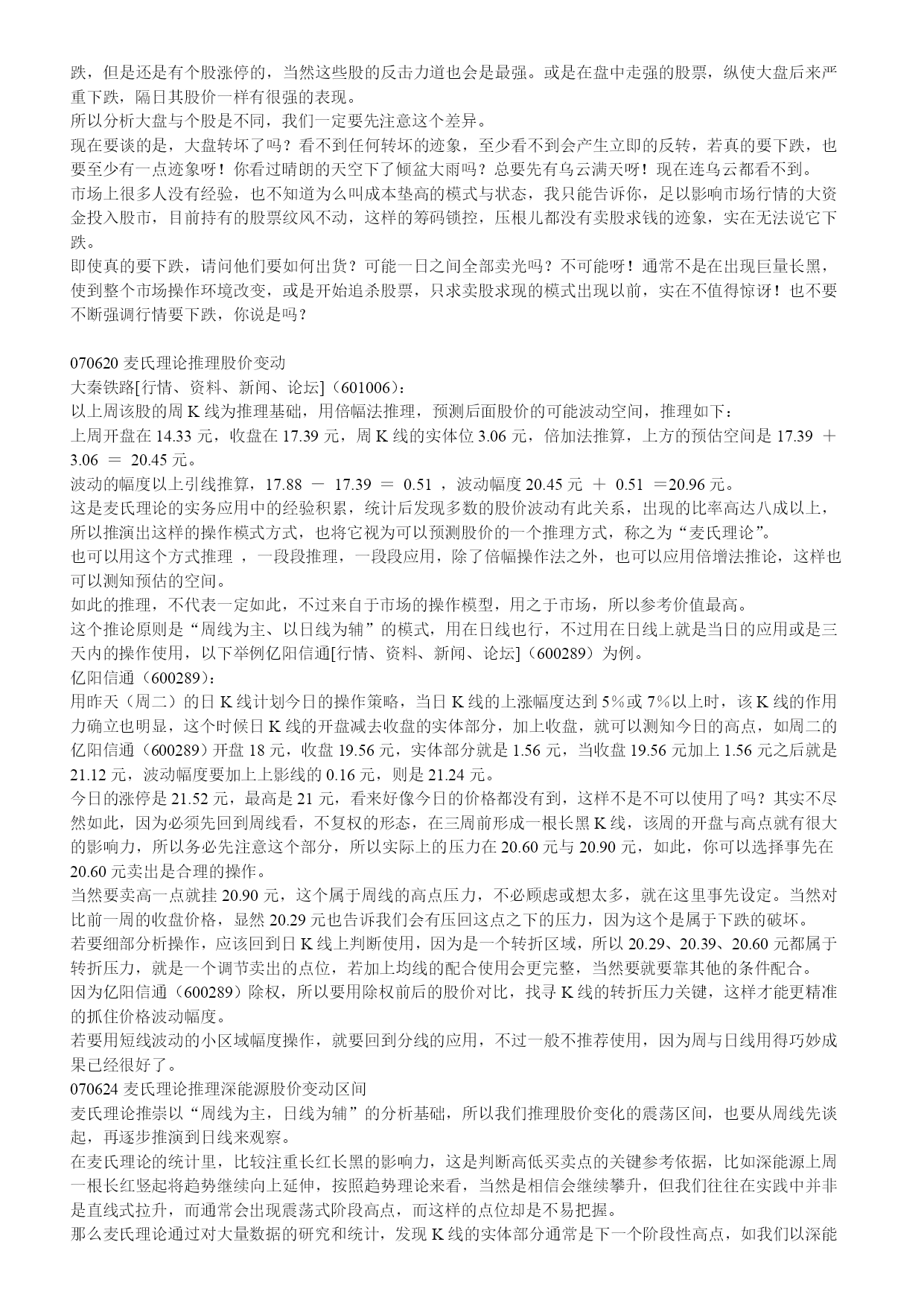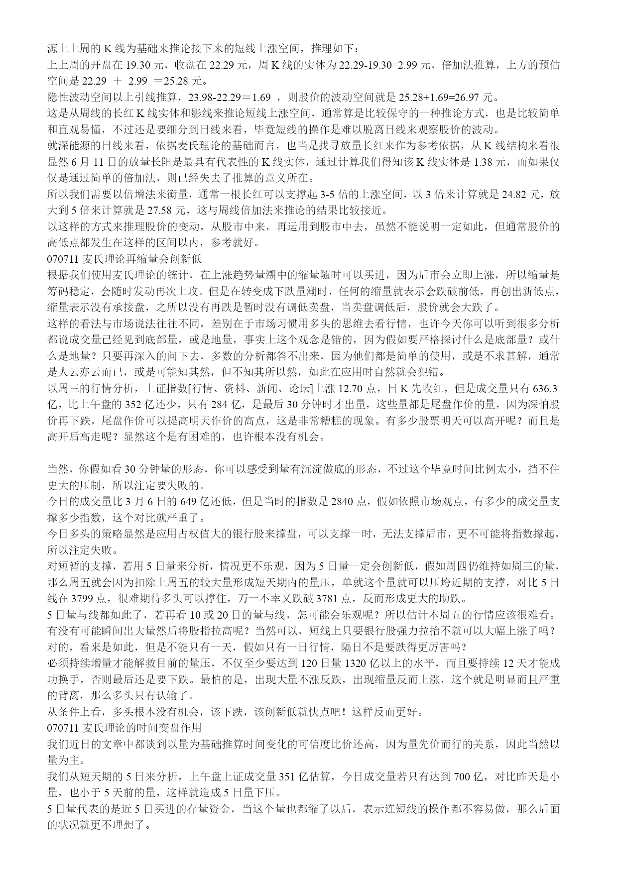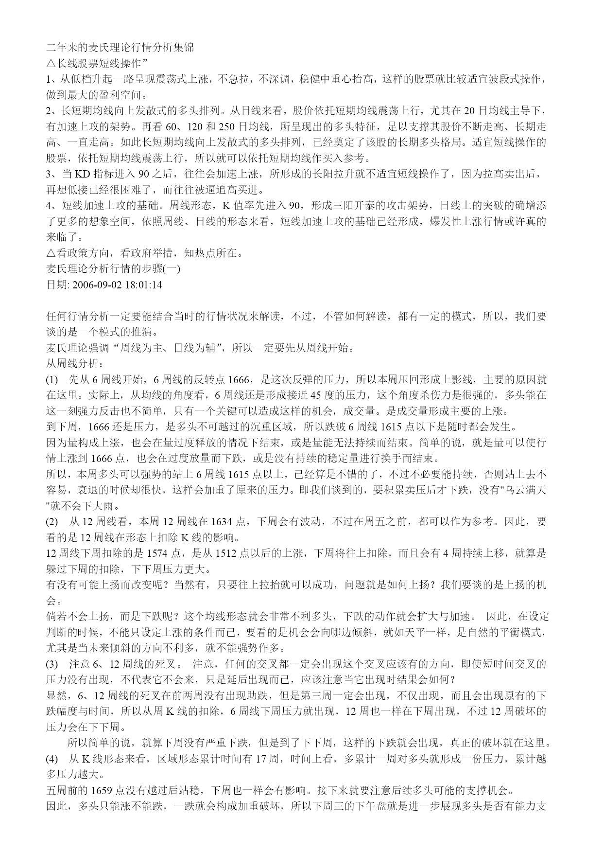 什么是《麦氏理论》“十大战法”?将“十大战法”列出如下:一、绝对多头??依据量与价的绝对多头条件操作;二、五子送财??只要量与价形成的五条线都上扬才做多;三、短兵相接??应用有效的短期条件进行积极的操作;四、三量交叉??应用区域运行量潮形成压缩以后形成的三叉形态;五、简易指标??应用KD及MACD指标的设定在日与分线上操作;六、预测顶部??波动的应用高点的掌握非常重要,逃顶的应用;七、掌握抄底??把握低位的操作是赢钱的关键,抄底的掌握;八、不当老大??第一波发动错过,请等第二波再承接;九、分时定价??从分时走势中的大小量与价格关系的应用;十、攻击涨停??符合那些条件的个股可以冲击涨停呢?一、所谓“绝对多头组合”的战法说明的是理论中很重要的一个多头排列组合,即形成一个多头趋势形态以后的个股,其方向确定以后,你的操作已经很简单,只要选择在“任何回调时买入”即可,如果要主动出击及把握放大量的那一刻马上跟进,然后继续持股,直到该股的换手量达到一定的比率,或是爆出滚动比率的大量以后再设定回调变化的周期模式,如此反复使用,就可以掌握这个波动的股价走势。二、五子送财是价格的五子送财及成交量的五子送财,或是两个相结合的形态,不过当两个相结合以后就正如第一个模式了,所以一般针对其中一个状况说明,在市场人气或是气势的高度为导向时掌握价格优势,进入必须力度导向时就依据成交量研判。三、短兵相接是针对每个波段的强势股操作,属于主动出击的应用,这个部份是本栏讲述最多的部份,因为它常常出现立即有效的操作效益,实用性非常高的一个战术使用,所以本栏几乎常常依据这个战法掌握到行情的优势。四、三量交叉是针对量潮的应用,反应在价格上也就是三差价,在重要的阶段中产生的一个趋势模式,对多与空的应用非常重要。它本身就是属于“三线鼎立”模型的应用,因为会交叉,所以在“未交叉”、“正交叉”及“已交叉”的三个阶段就是如何使用与把握的关键。五、简易指标的使用是让很多初步学习者使用的一个简易模式,因为要学习量与价的趋势必须花时间,假如还没有花时间学习前如何使用?简易指标战法就是一个让学习者立即可以使用的一个模式。六、预测顶部的应用不是天天都要谈论,是在一个重要又关键的反转时应用即可,所以一般都比较少谈论,只是因为常常出现很多所谓“逃顶操作”,其实《麦氏理论》的量潮见顶模式本身就已经俱备,所以可以谈也可以不谈。七、掌握抄底是对称预测顶部的对比应用,不过因为设定的条件不同,所以使用的状况也有差异。八、不当老大就是老二战法,即错过第一次的大涨,或是不想在爆发的初期投入,可以等待第二个阶段压回时操作。九、分时定价是从分时走势图形中找寻买卖中的买盘支撑或是卖盘的压力来源,从中探寻最佳的买入点及最佳的卖出点,这个部份可以轻易感受到主力介入的成本关键点,用在基金法人机构的股票操作会更加有利、好用。十、攻击涨停模式的应用是在短线的基础里头去判断,坦白说,这个战法是所有战法中最没有把握的,因为不可能知道会涨停,很多时候必须抱持涨停是“可遇不可求”,因为从来就没有人可以预知涨停,往往涨停都会是“碰巧”而已,但是一般散户不理解,以为一定有这样的战法,其实是大错特错,编出这个战法只要还是让散户知道,如何应用一个可靠的方法模式应用,往往就会冲击涨停。二年来的麦氏理论行情分析集锦△长线股票短线操作”1、从低档升起一路呈现震荡式上涨,不急拉,不深调,稳健中重心抬高,这样的股票就比较适宜波段式操作,做到最大的盈利空间。2、长短期均线向上发散式的多头排列。从日线来看,股价依托短期均线震荡上行,尤其在20日均线主导下,有加速上攻的架势。再看60、120和250日均线,所呈现出的多头特征,足以支撑其股价不断走高、长期走高、一直走高。如此长短期均线向上发散式的多头排列,已经奠定了该股的长期多头格局。适宜短线操作的股票,依托短期均线震荡上行,所以就可以依托短期均线作买入参考。3、当KD指标进入90之后,往往会加速上涨,所形成的长阳拉升就不适宜短线操作了,因为拉高卖出后,再想低接已经很困难了,而往往被逼追高买进。4、短线加速上攻的基础。周线形态,K值率先进入90,形成三阳开泰的攻击架势,日线上的突破的确增添了更多的想象空间,依照周线、日线的形态来看,短线加速上攻的基础已经形成,爆发性上涨行情或许真的来临了。△看政策方向,看政府举措,知热点所在。麦氏理论分析行情的步骤(一)日期:2006-09-0218:01:14任何行情分析一定要能结合当时的行情状况来解读,不过,不管如何解读,都有一定的模式,所以,我们要谈的是一个模式的推演。麦氏理论强调“周线为主、日线为辅”,所以一定要先从周线开始。从周线分析:(1)先从6周线开始,6周线的反转点166