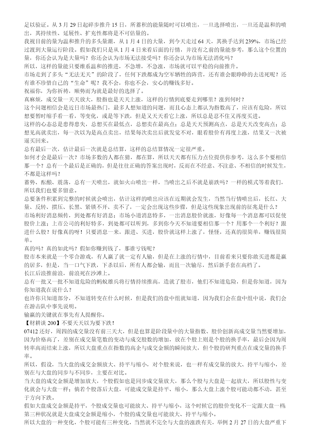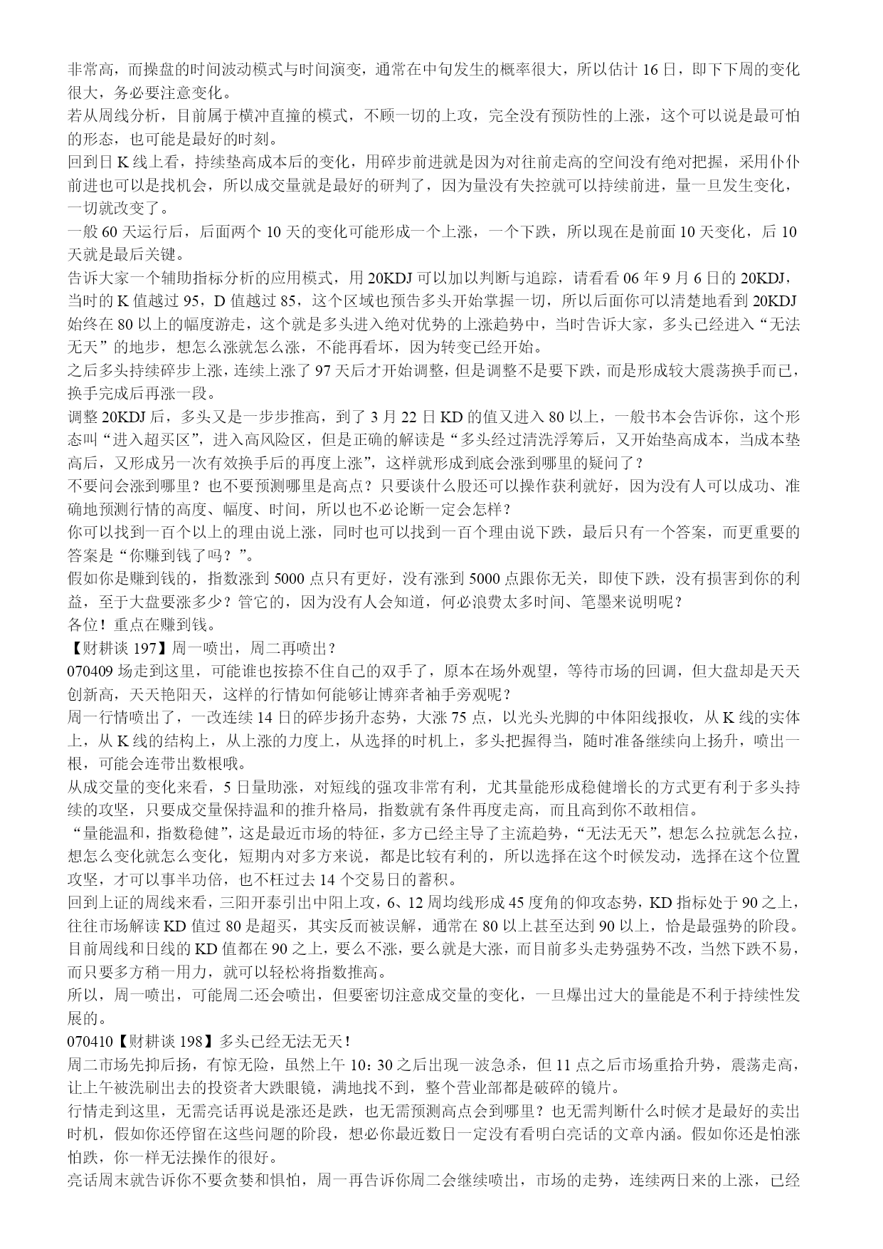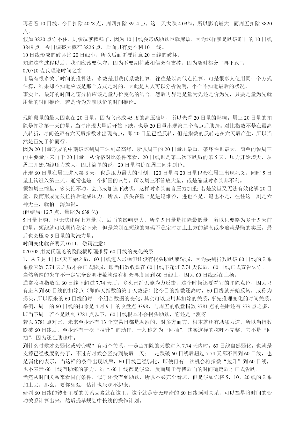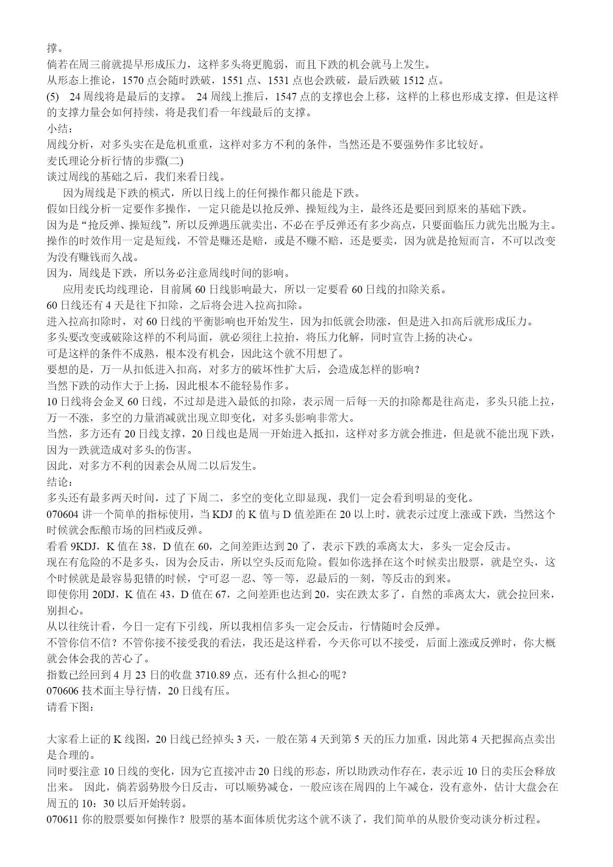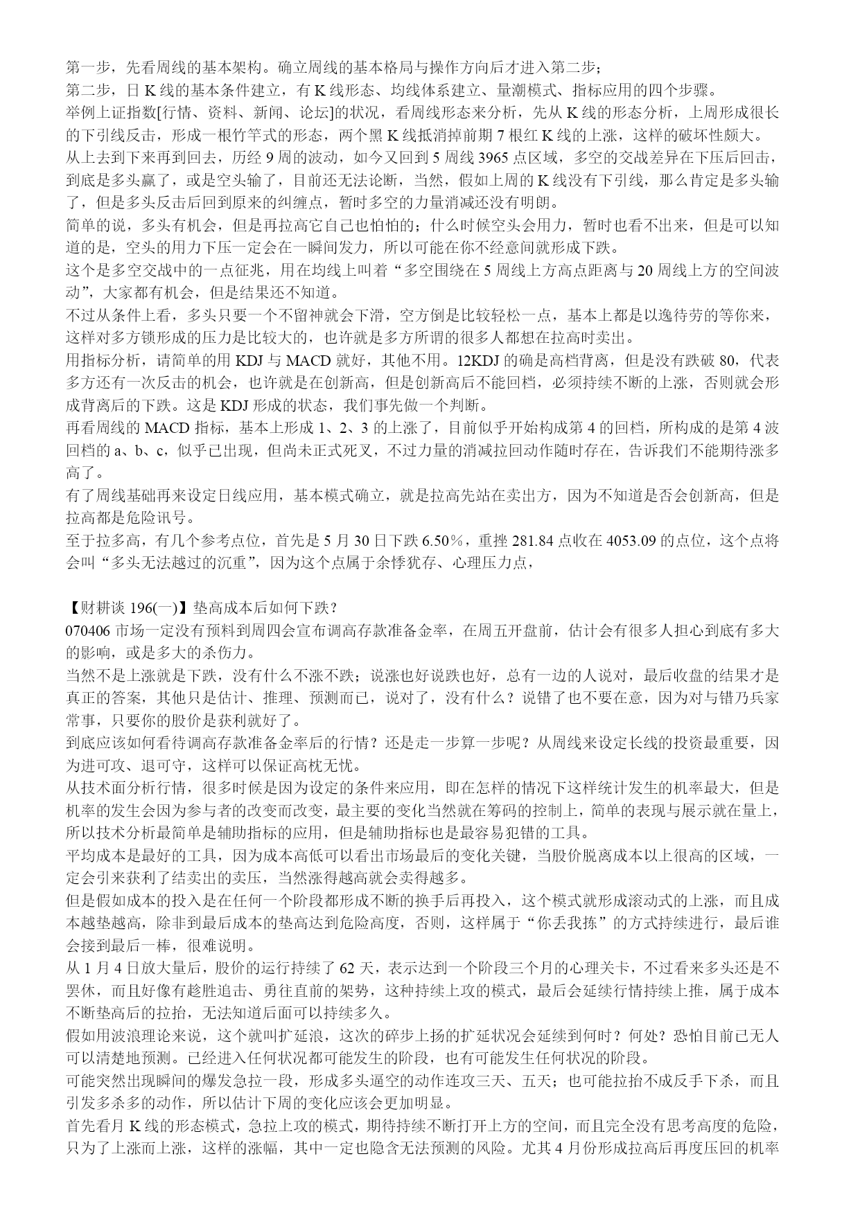 什么是《麦氏理论》“十大战法”?将“十大战法”列出如下:一、绝对多头??依据量与价的绝对多头条件操作;二、五子送财??只要量与价形成的五条线都上扬才做多;三、短兵相接??应用有效的短期条件进行积极的操作;四、三量交叉??应用区域运行量潮形成压缩以后形成的三叉形态;五、简易指标??应用KD及MACD指标的设定在日与分线上操作;六、预测顶部??波动的应用高点的掌握非常重要,逃顶的应用;七、掌握抄底??把握低位的操作是赢钱的关键,抄底的掌握;八、不当老大??第一波发动错过,请等第二波再承接;九、分时定价??从分时走势中的大小量与价格关系的应用;十、攻击涨停??符合那些条件的个股可以冲击涨停呢?一、所谓“绝对多头组合”的战法说明的是理论中很重要的一个多头排列组合,即形成一个多头趋势形态以后的个股,其方向确定以后,你的操作已经很简单,只要选择在“任何回调时买入”即可,如果要主动出击及把握放大量的那一刻马上跟进,然后继续持股,直到该股的换手量达到一定的比率,或是爆出滚动比率的大量以后再设定回调变化的周期模式,如此反复使用,就可以掌握这个波动的股价走势。二、五子送财是价格的五子送财及成交量的五子送财,或是两个相结合的形态,不过当两个相结合以后就正如第一个模式了,所以一般针对其中一个状况说明,在市场人气或是气势的高度为导向时掌握价格优势,进入必须力度导向时就依据成交量研判。三、短兵相接是针对每个波段的强势股操作,属于主动出击的应用,这个部份是本栏讲述最多的部份,因为它常常出现立即有效的操作效益,实用性非常高的一个战术使用,所以本栏几乎常常依据这个战法掌握到行情的优势。四、三量交叉是针对量潮的应用,反应在价格上也就是三差价,在重要的阶段中产生的一个趋势模式,对多与空的应用非常重要。它本身就是属于“三线鼎立”模型的应用,因为会交叉,所以在“未交叉”、“正交叉”及“已交叉”的三个阶段就是如何使用与把握的关键。五、简易指标的使用是让很多初步学习者使用的一个简易模式,因为要学习量与价的趋势必须花时间,假如还没有花时间学习前如何使用?简易指标战法就是一个让学习者立即可以使用的一个模式。六、预测顶部的应用不是天天都要谈论,是在一个重要又关键的反转时应用即可,所以一般都比较少谈论,只是因为常常出现很多所谓“逃顶操作”,其实《麦氏理论》的量潮见顶模式本身就已经俱备,所以可以谈也可以不谈。七、掌握抄底是对称预测顶部的对比应用,不过因为设定的条件不同,所以使用的状况也有差异。八、不当老大就是老二战法,即错过第一次的大涨,或是不想在爆发的初期投入,可以等待第二个阶段压回时操作。九、分时定价是从分时走势图形中找寻买卖中的买盘支撑或是卖盘的压力来源,从中探寻最佳的买入点及最佳的卖出点,这个部份可以轻易感受到主力介入的成本关键点,用在基金法人机构的股票操作会更加有利、好用。十、攻击涨停模式的应用是在短线的基础里头去判断,坦白说,这个战法是所有战法中最没有把握的,因为不可能知道会涨停,很多时候必须抱持涨停是“可遇不可求”,因为从来就没有人可以预知涨停,往往涨停都会是“碰巧”而已,但是一般散户不理解,以为一定有这样的战法,其实是大错特错,编出这个战法只要还是让散户知道,如何应用一个可靠的方法模式应用,往往就会冲击涨停。二年来的麦氏理论行情分析集锦△长线股票短线操作”1、从低档升起一路呈现震荡式上涨,不急拉,不深调,稳健中重心抬高,这样的股票就比较适宜波段式操作,做到最大的盈利空间。2、长短期均线向上发散式的多头排列。从日线来看,股价依托短期均线震荡上行,尤其在20日均线主导下,有加速上攻的架势。再看60、120和250日均线,所呈现出的多头特征,足以支撑其股价不断走高、长期走高、一直走高。如此长短期均线向上发散式的多头排列,已经奠定了该股的长期多头格局。适宜短线操作的股票,依托短期均线震荡上行,所以就可以依托短期均线作买入参考。3、当KD指标进入90之后,往往会加速上涨,所形成的长阳拉升就不适宜短线操作了,因为拉高卖出后,再想低接已经很困难了,而往往被逼追高买进。4、短线加速上攻的基础。周线形态,K值率先进入90,形成三阳开泰的攻击架势,日线上的突破的确增添了更多的想象空间,依照周线、日线的形态来看,短线加速上攻的基础已经形成,爆发性上涨行情或许真的来临了。△看政策方向,看政府举措,知热点所在。麦氏理论分析行情的步骤(一)日期:2006-09-0218:01:14任何行情分析一定要能结合当时的行情状况来解读,不过,不管如何解读,都有一定的模式,所以,我们要谈的是一个模式的推演。麦氏理论强调“周线为主、日线为辅”,所以一定要先从周线开始。从周线分析:(1)先从6周线开始,6周线的反转点166