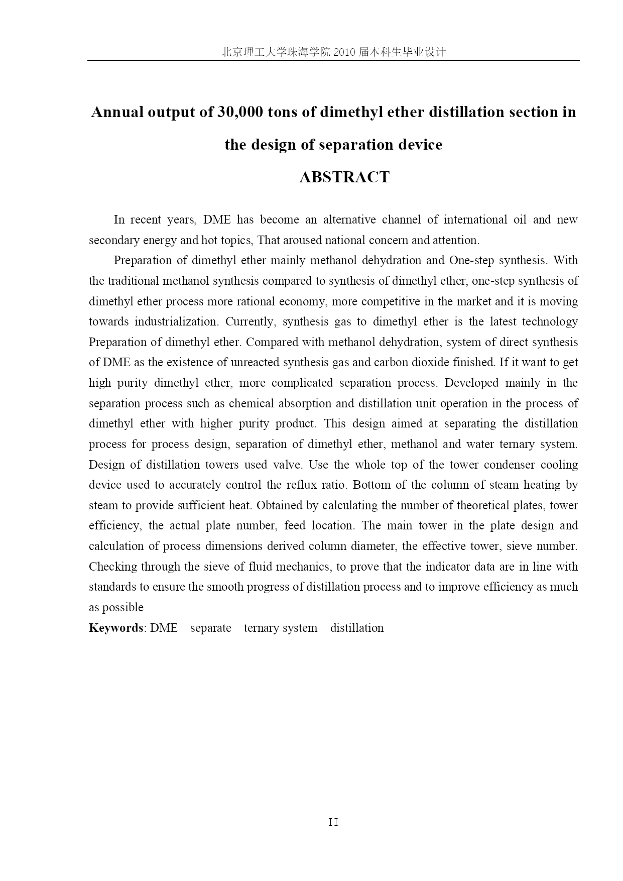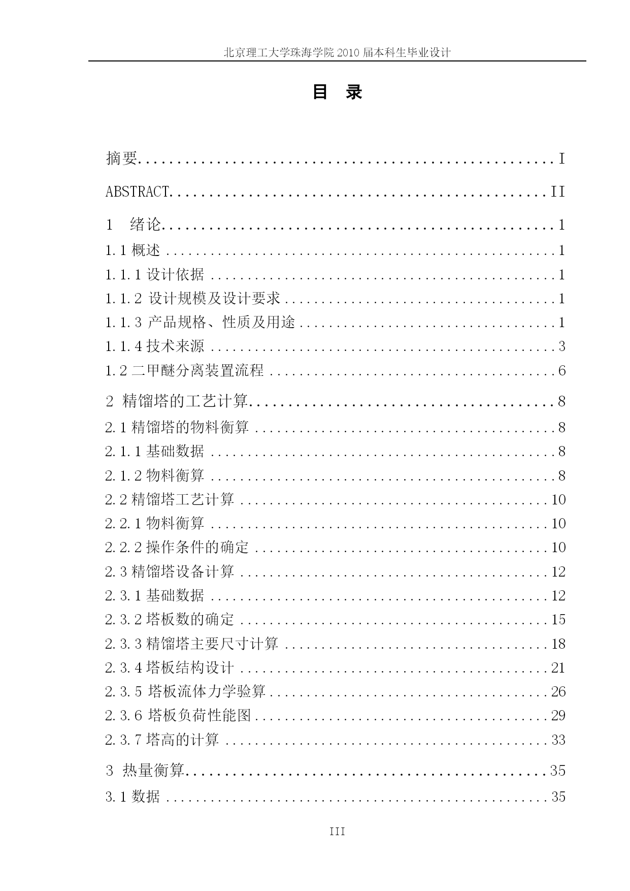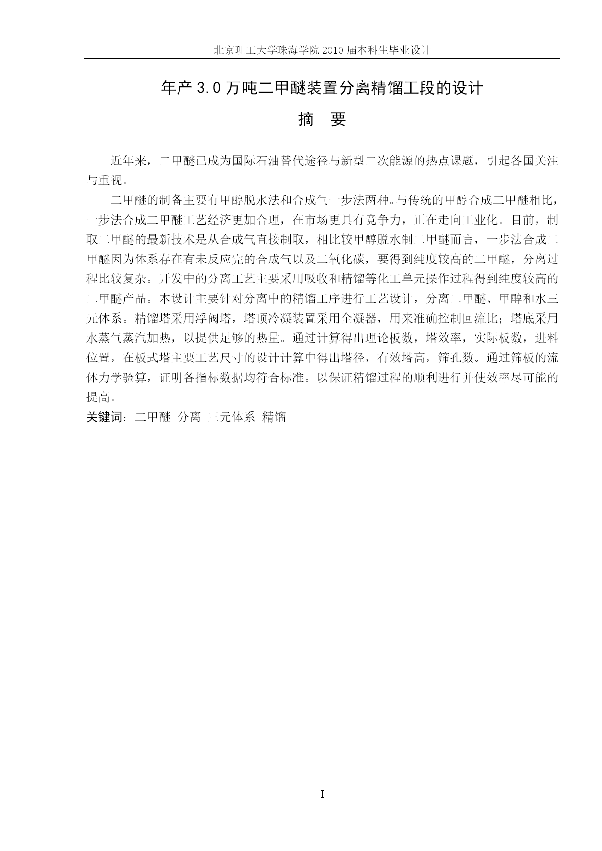 PAGE北京理工大学珠海学院2008届本科生毕业设计(论文)年产3.0万吨二甲醚装置分离精馏工段的设计学院:化工与材料学院专业:姓名:指导老师:化学工程与工艺吴晓玲学号:职称:0605211027冯彤英讲师中国·珠海二○一○年五月北京理工大学珠海学院毕业设计诚信承诺书本人郑重承诺:我所呈交的毕业设计《年产3.0万吨二甲醚装置分离精馏工段设计》是在指导教师的指导下,独立开展研究取得的成果,文中引用他人的观点和材料,均在文后按顺序列出其参考文献,设计使用的数据真实可靠。承诺人签名:日期:年月日北京理工大学珠海学院2010届本科生毕业设计PAGE\*MERGEFORMATIV年产3.0万吨二甲醚装置分离精馏工段的设计摘要近年来,二甲醚已成为国际石油替代途径与新型二次能源的热点课题,引起各国关注与重视。二甲醚的制备主要有甲醇脱水法和合成气一步法两种。与传统的甲醇合成二甲醚相比,一步法合成二甲醚工艺经济更加合理,在市场更具有竞争力,正在走向工业化。目前,制取二甲醚的最新技术是从合成气直接制取,相比较甲醇脱水制二甲醚而言,一步法合成二甲醚因为体系存在有未反应完的合成气以及二氧化碳,要得到纯度较高的二甲醚,分离过程比较复杂。开发中的分离工艺主要采用吸收和精馏等化工单元操作过程得到纯度较高的二甲醚产品。本设计主要针对分离中的精馏工序进行工艺设计,分离二甲醚、甲醇和水三元体系。精馏塔采用浮阀塔,塔顶冷凝装置采用全凝器,用来准确控制回流比;塔底采用水蒸气蒸汽加热,以提供足够的热量。通过计算得出理论板数,塔效率,实际板数,进料位置,在板式塔主要工艺尺寸的设计计算中得出塔径,有效塔高,筛孔数。通过筛板的流体力学验算,证明各指标数据均符合标准。以保证精馏过程的顺利进行并使效率尽可能的提高。关键词:二甲醚分离三元体系精馏Annualoutputof30,000tonsofdimethyletherdistillationsectioninthedesignofseparationdeviceABSTRACTInrecentyears,DMEhasbecomeanalternativechannelofinternationaloilandnewsecondaryenergyandhottopics,Thatarousednationalconcernandattention.PreparationofdimethylethermainlymethanoldehydrationandOne-stepsynthesis.Withthetraditionalmethanolsynthesiscomparedtosynthesisofdimethylether,one-stepsynthesisofdimethyletherprocessmorerationaleconomy,morecompetitiveinthemarketanditismovingtowardsindustrialization.Currently,synthesisgastodimethyletheristhelatesttechnologyPreparationofdimethylether.Comparedwithmethanoldehydration,systemofdirectsynthesisofDMEastheexistenceofunreactedsynthesisgasandcarbondioxidefinished.Ifitwanttogethighpuritydimethylether,morecomplicatedseparationprocess.Developedmainlyintheseparationprocesssuchaschemicalabsorptionanddistillationunitoperationintheprocessofdimethyletherwithhigherpurityproduct.Thisdesignaimedatseparatingthedistillationprocessforprocessdesign,separationofdimethylether,methanolandwaterternarysystem.Designofdistillationtowersusedvalve.Usethewholetopofthetowercondensercoolingdeviceusedtoaccuratelycontroltherefluxr