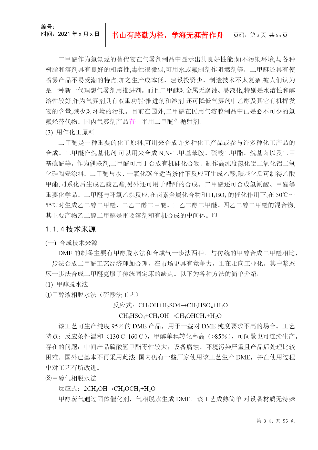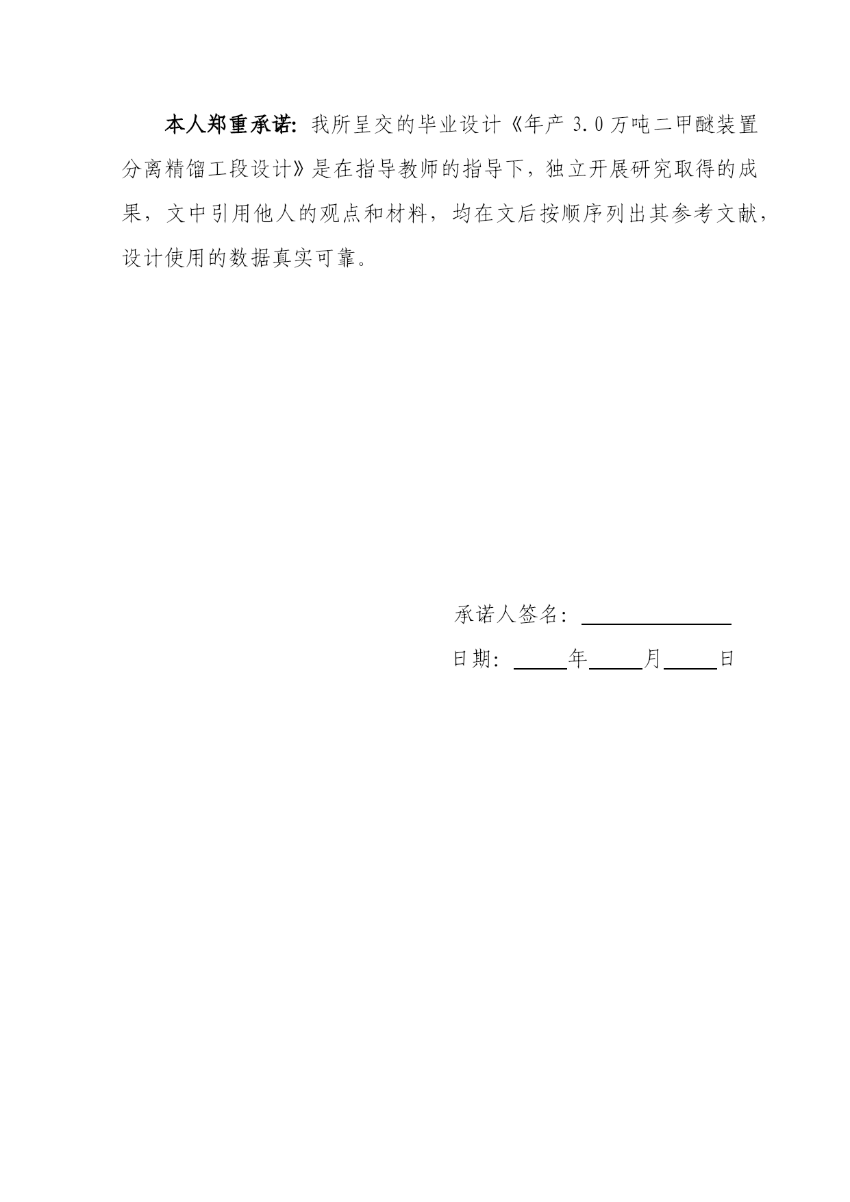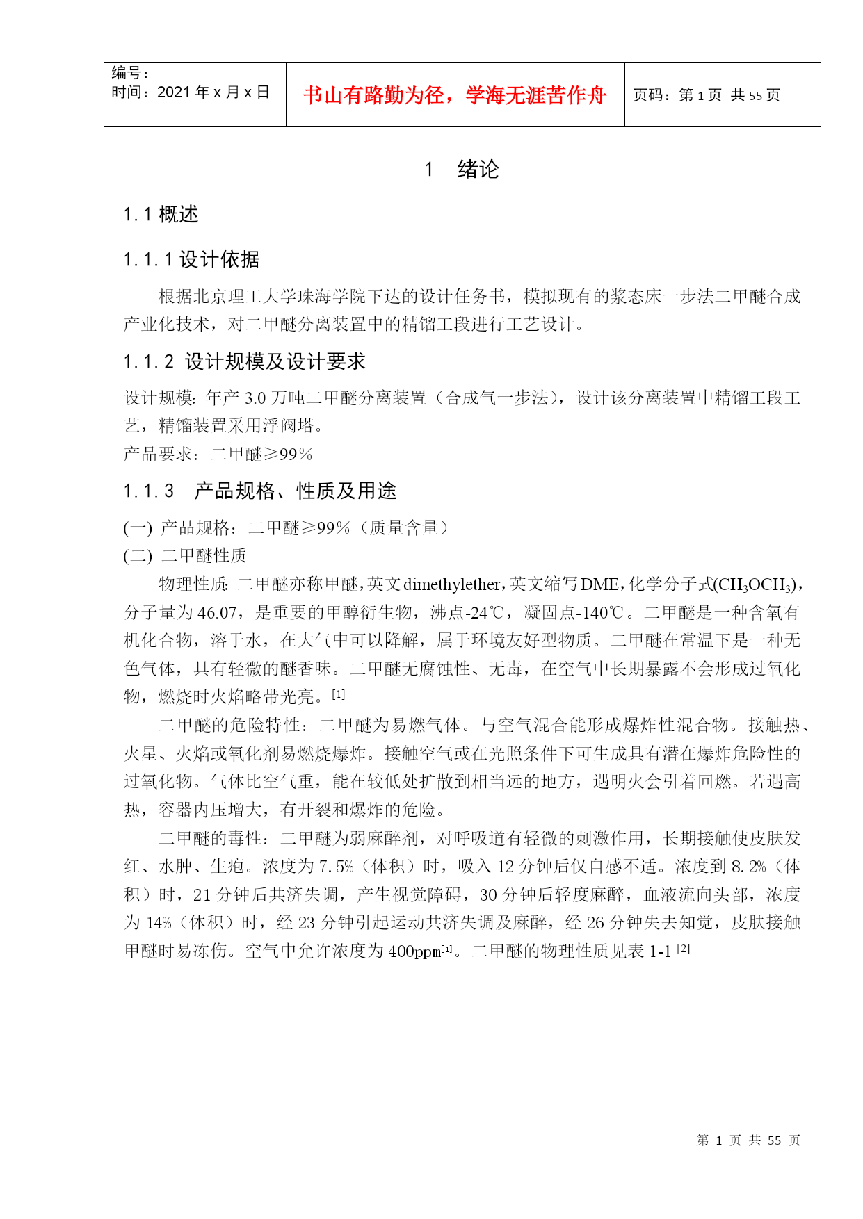 PAGE北京理工大学珠海学院2008届本科生毕业设计(论文)年产3.0万吨二甲醚装置分离精馏工段的设计学院:化工与材料学院专业:姓名:指导老师:化学工程与工艺吴晓玲学号:职称:0605211027冯彤英讲师中国·珠海二○一○年五月北京理工大学珠海学院毕业设计诚信承诺书本人郑重承诺:我所呈交的毕业设计《年产3.0万吨二甲醚装置分离精馏工段设计》是在指导教师的指导下,独立开展研究取得的成果,文中引用他人的观点和材料,均在文后按顺序列出其参考文献,设计使用的数据真实可靠。承诺人签名:日期:年月日北京理工大学珠海学院2010届本科生毕业设计PAGE\*MERGEFORMATIV年产3.0万吨二甲醚装置分离精馏工段的设计摘要近年来,二甲醚已成为国际石油替代途径与新型二次能源的热点课题,引起各国关注与重视。二甲醚的制备主要有甲醇脱水法和合成气一步法两种。与传统的甲醇合成二甲醚相比,一步法合成二甲醚工艺经济更加合理,在市场更具有竞争力,正在走向工业化。目前,制取二甲醚的最新技术是从合成气直接制取,相比较甲醇脱水制二甲醚而言,一步法合成二甲醚因为体系存在有未反应完的合成气以及二氧化碳,要得到纯度较高的二甲醚,分离过程比较复杂。开发中的分离工艺主要采用吸收和精馏等化工单元操作过程得到纯度较高的二甲醚产品。本设计主要针对分离中的精馏工序进行工艺设计,分离二甲醚、甲醇和水三元体系。精馏塔采用浮阀塔,塔顶冷凝装置采用全凝器,用来准确控制回流比;塔底采用水蒸气蒸汽加热,以提供足够的热量。通过计算得出理论板数,塔效率,实际板数,进料位置,在板式塔主要工艺尺寸的设计计算中得出塔径,有效塔高,筛孔数。通过筛板的流体力学验算,证明各指标数据均符合标准。以保证精馏过程的顺利进行并使效率尽可能的提高。关键词:二甲醚分离三元体系精馏Annualoutputof30,000tonsofdimethyletherdistillationsectioninthedesignofseparationdeviceABSTRACTInrecentyears,DMEhasbecomeanalternativechannelofinternationaloilandnewsecondaryenergyandhottopics,Thatarousednationalconcernandattention.PreparationofdimethylethermainlymethanoldehydrationandOne-stepsynthesis.Withthetraditionalmethanolsynthesiscomparedtosynthesisofdimethylether,one-stepsynthesisofdimethyletherprocessmorerationaleconomy,morecompetitiveinthemarketanditismovingtowardsindustrialization.Currently,synthesisgastodimethyletheristhelatesttechnologyPreparationofdimethylether.Comparedwithmethanoldehydration,systemofdirectsynthesisofDMEastheexistenceofunreactedsynthesisgasandcarbondioxidefinished.Ifitwanttogethighpuritydimethylether,morecomplicatedseparationprocess.Developedmainlyintheseparationprocesssuchaschemicalabsorptionanddistillationunitoperationintheprocessofdimethyletherwithhigherpurityproduct.Thisdesignaimedatseparatingthedistillationprocessforprocessdesign,separationofdimethylether,methanolandwaterternarysystem.Designofdistillationtowersusedvalve.Usethewholetopofthetowercondensercoolingdeviceusedtoaccuratelycontroltherefluxr