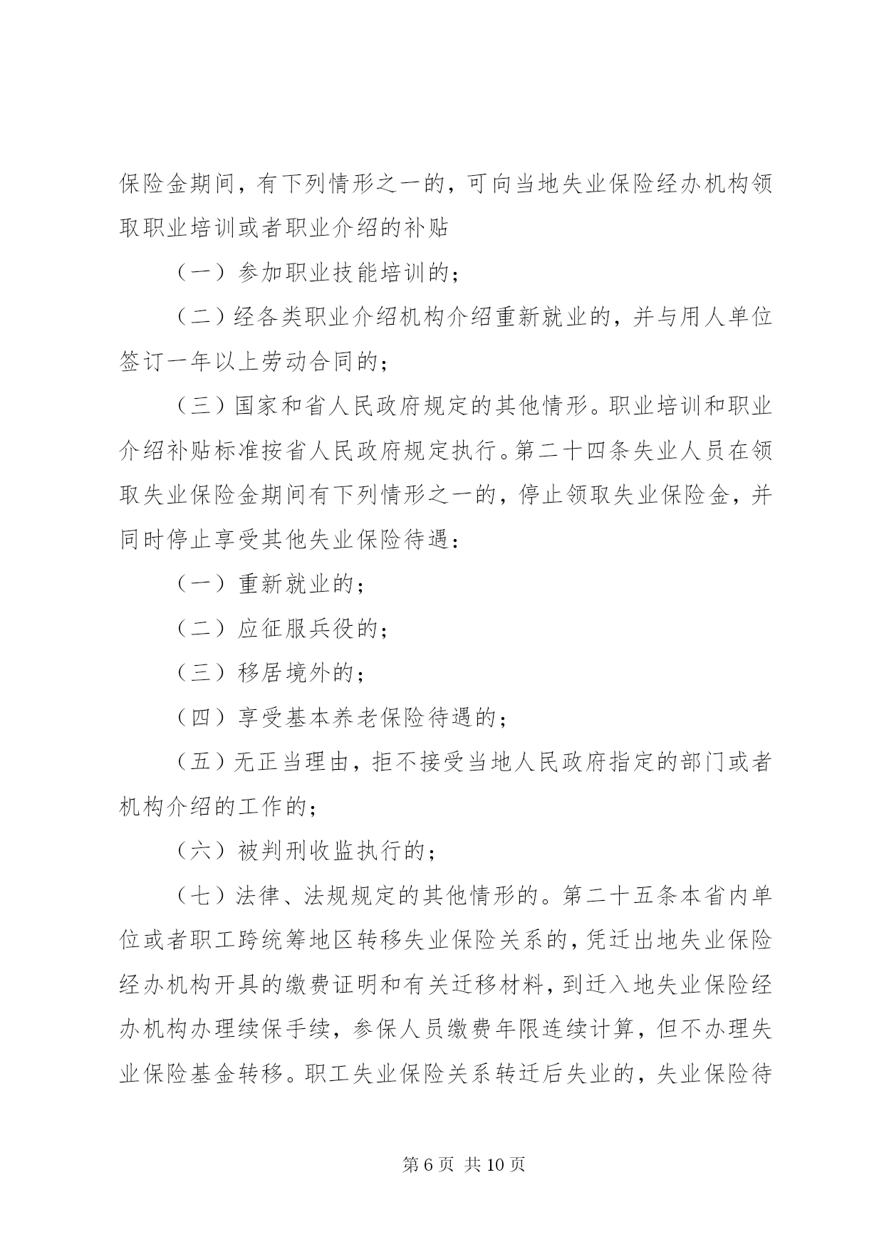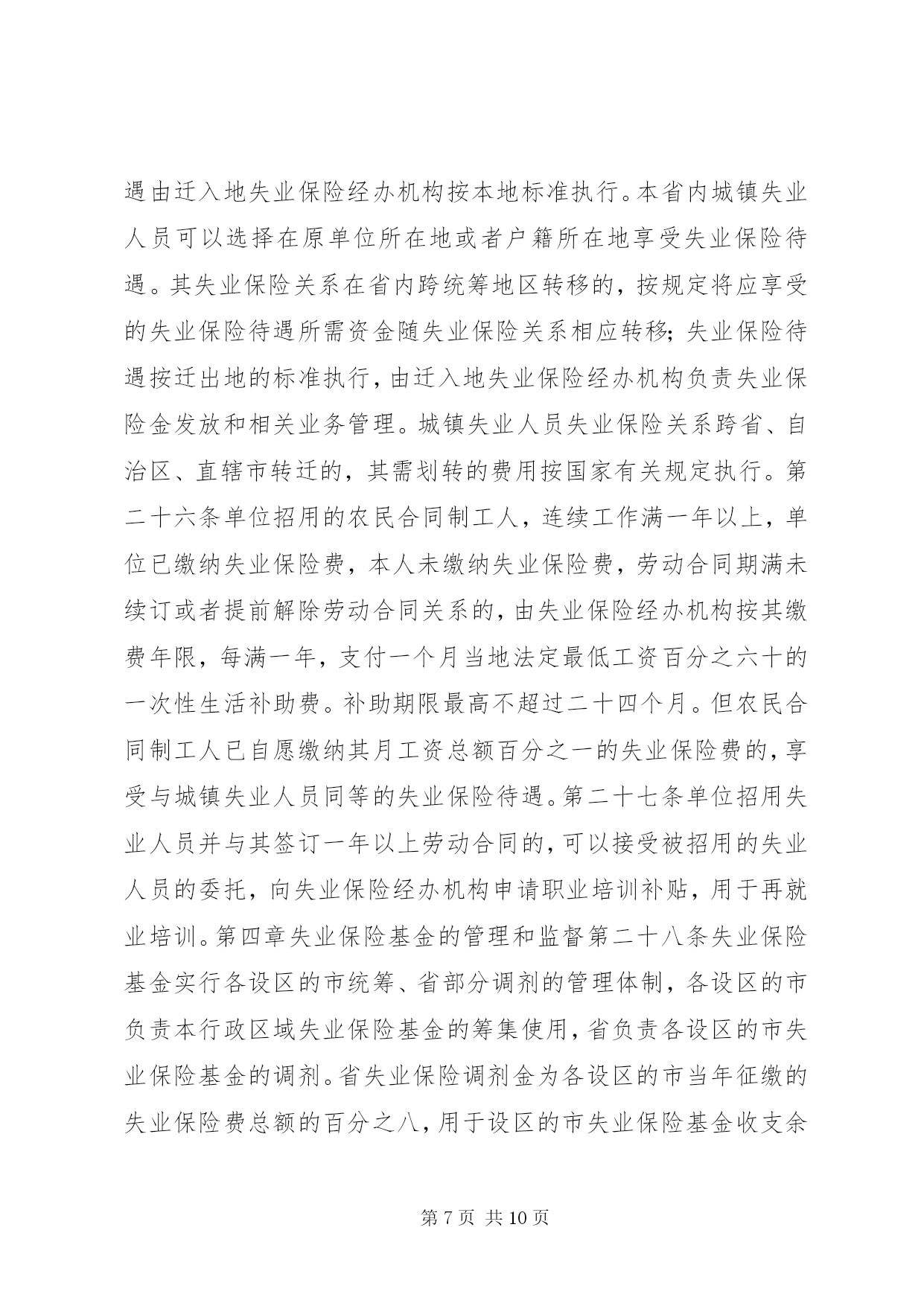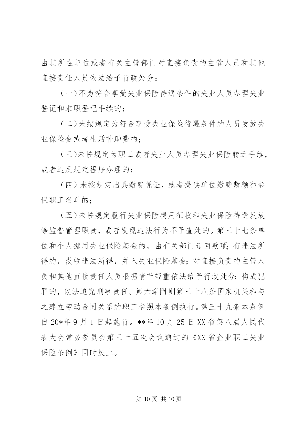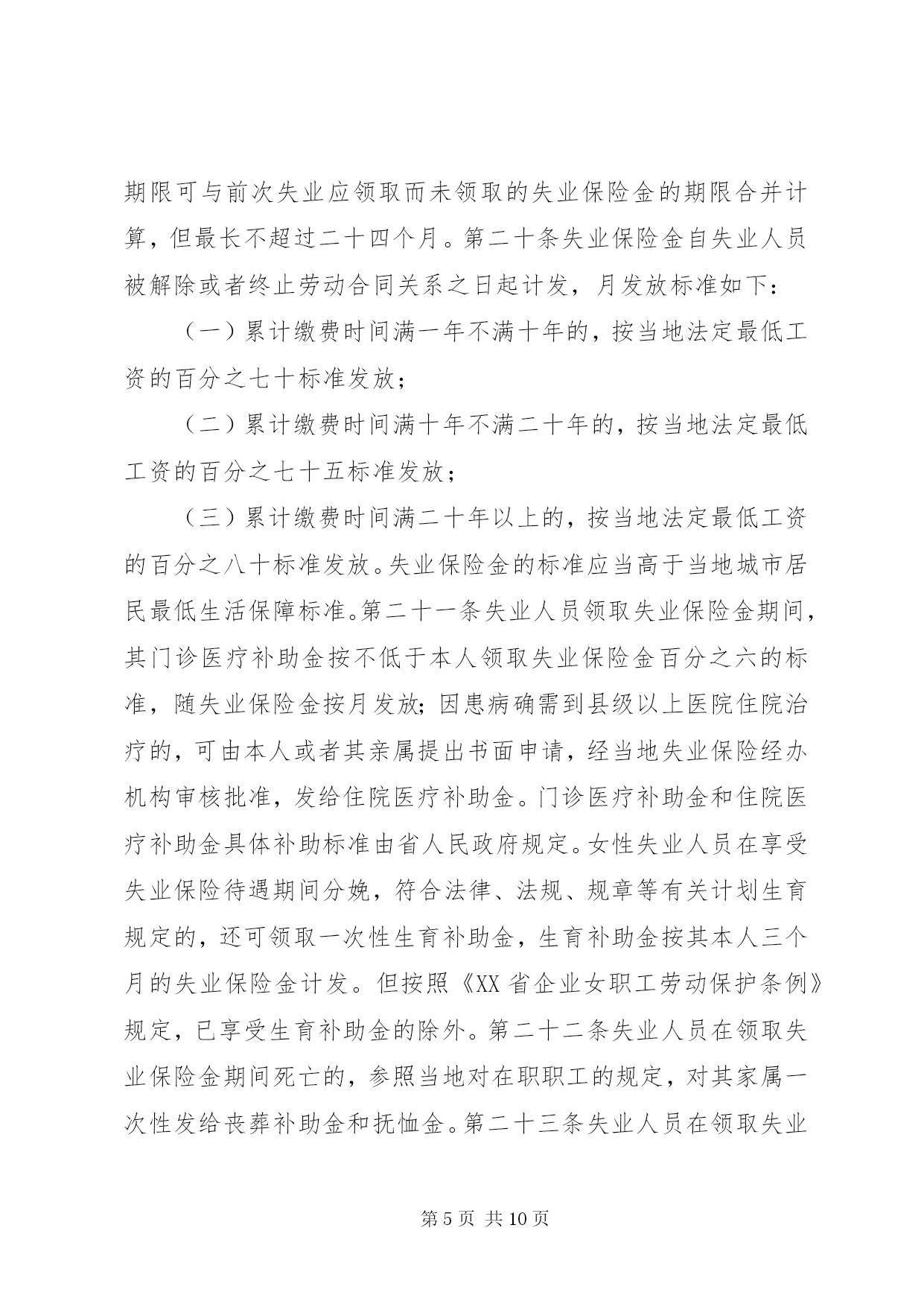 第PAGE\*Arabic\*MERGEFORMAT10页共NUMPAGES\*MERGEFORMAT10页企业失业保险条例第一章总则第一条为了保障劳动者失业期间的基本生活,促进再就业,根据《中华人民共和国劳动法》和国务院《失业保险条例》等有关法律、法规,结合本省实际,制定本条例。第二条本省行政区域内依法成立的各类企业、事业单位、社会团体、民办非企业单位、有雇工的个体工商户(以下统称单位)及与之建立劳动合同关系的劳动者(以下统称职工),应当按照本条例参加失业保险。第三条具备下列条件的失业人员,可以领取失业保险金:(一)按照规定参加失业保险,所在单位和本人已按照规定履行缴费义务满一年的;(二)非因本人意愿中断就业的;(三)已办理失业登记,并有求职要求的。失业人员在领取失业保险金期间,按照规定同时享受其他失业保险待遇。第四条失业保险基金,按照国家、单位、职工合理负担的原则,实行社会统筹。失业保险费由各级地方税务机关按照属地管理原则负责征收。第五条县级以上地方人民政府应当加快失业保险工作的信息化建设,建立失业保险基础数据库,做到信息互通、操作简便、管理规范。第六条县级以上地方人民政府劳动保障行政部门主管本行政区域内的失业保险工作。失业保险经办机构具体承办失业保险业务,其经费列入同级财政预算。县级以上地方人民政府有关主管部门和机构依法对失业保险工作实行监督。第二章失业保险基金的筹集第七条失业保险基金由下列各项构成:(一)单位和职工缴纳的失业保险费;(二)失业保险基金的利息;(三)财政补贴;(四)依法纳入失业保险基金的其他资金。第八条单位按照与之建立劳动合同关系职工的月工资总额的百分之二缴纳失业保险费,职工按照其月工资总额的百分之一缴纳失业保险费。单位招用的农民合同制工人本人不缴纳失业保险费。但本人自愿缴纳的除外。工资总额的组成按照国家统计局的统一规定执行。第九条单位应当在依法成立之日起三十日内,向受劳动保障行政部门委托的主管地方税务机关办理失业保险登记。单位变更、终止的,应当在变更、终止之日起十日内,向受劳动保障行政部门委托的主管地方税务机关办理变更、注销登记。单位招用、辞退、裁减人员的,应当在建立、解除或者终止劳动合同关系之日起三日内办妥相应的变更手续。第十条单位应当在每月发放工资之日起五日内,向主管地方税务机关申报单位缴纳失业保险费的数额和参保职工名单。单位和职工缴纳的失业保险费在缴纳所得税前列支。其中属于应当由职工缴纳的失业保险费,由单位从职工工资中代扣代缴。主管地方税务机关应当向缴纳失业保险费的单位出具缴费凭证,并于征收之日起五日内,向失业保险经办机构提供单位缴费数额和参保职工名单。失业保险经办机构应当建立单位和职工的缴费档案,并于收到主管地方税务机关提交的单位缴费数额和参保职工名单之日起五日内,向单位和职工分别出具单位缴费手册和职工缴费凭证。第十一条单位因严重亏损不能按时缴纳失业保险费的,可向主管地方税务机关申请缓缴;经批准缓缴的,在缓缴期内免缴滞纳金,缓缴期满后,应当如数补缴失业保险费及其利息。第十二条单位因破产、解散等原因终止的,在清算财产时,应当依法向主管地方税务机关清偿欠缴的失业保险费。第十三条单位应当每季度公布一次本单位及其职工缴纳失业保险费的情况。职工有权向本单位和失业保险经办机构查询失业保险费的缴纳情况,单位和失业保险经办机构应当及时为其提供。职工发现单位未按规定按时足额缴纳失业保险费,有权向劳动保障行政部门举报或者投诉。第三章失业保险基金的使用第十四条失业保险基金用于下列支出:(一)失业保险金和生活补助费;(二)领取失业保险金期间的医疗补助金、生育补助金;(三)领取失业保险金期间死亡的失业人员的丧葬补助金和其供养的配偶、直系亲属的抚恤金;(四)领取失业保险金期间接受职业培训、职业介绍的补贴;(五)国务院规定或者批准的与失业保险有关的其他费用。失业保险基金依法免征税费。第十五条单位与职工解除或者终止劳动合同关系时,应当即时向职工出具解除或者终止劳动合同关系的证明,书面告知其依法享有失业保险待遇的权利,并将职工的名单、单位缴费手册、解除或者终止劳动合同关系证明,自解除或者终止劳动合同关系之日起五日内,送达失业保险经办机构和主管地方税务机关。第十六条职工可以在与单位解除或者终止劳动合同关系之日起,持原单位为其出具的解除或者终止劳动合同关系的证明、职工缴费凭证和身份证明,到受理原单位失业保险业务的经办机构办理领取失业保险金或者生活补助费单证的手续。办理领取失业保险金单证手续的,应当事先进行失业和求职登记。第十七条失业保险经办机构应当在五日内对领取者及其单位提供的材料进行审核,并将审核结果告知本人。其中,对领取生活补助费的,应当在三日内办结审核手续。但有特殊情况的,经失业保险经办机构负责人批准