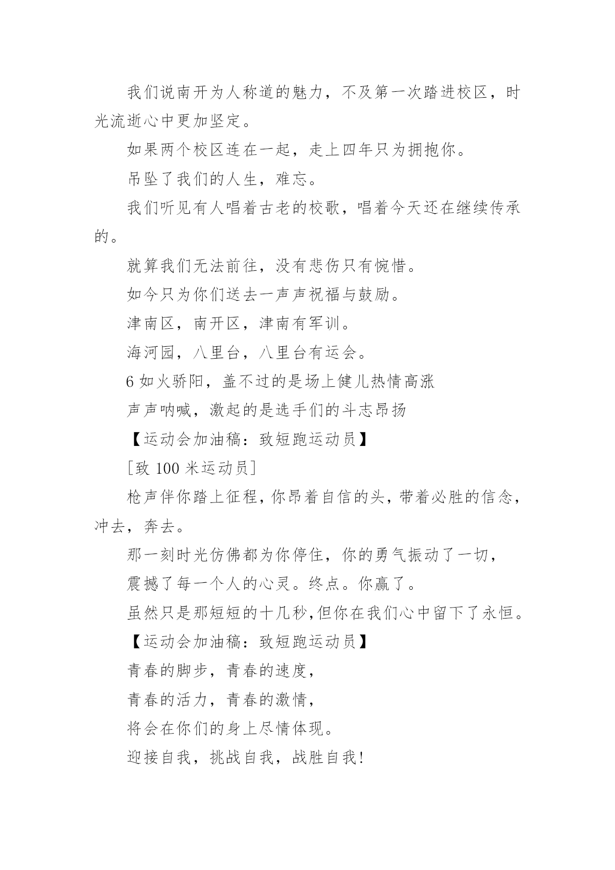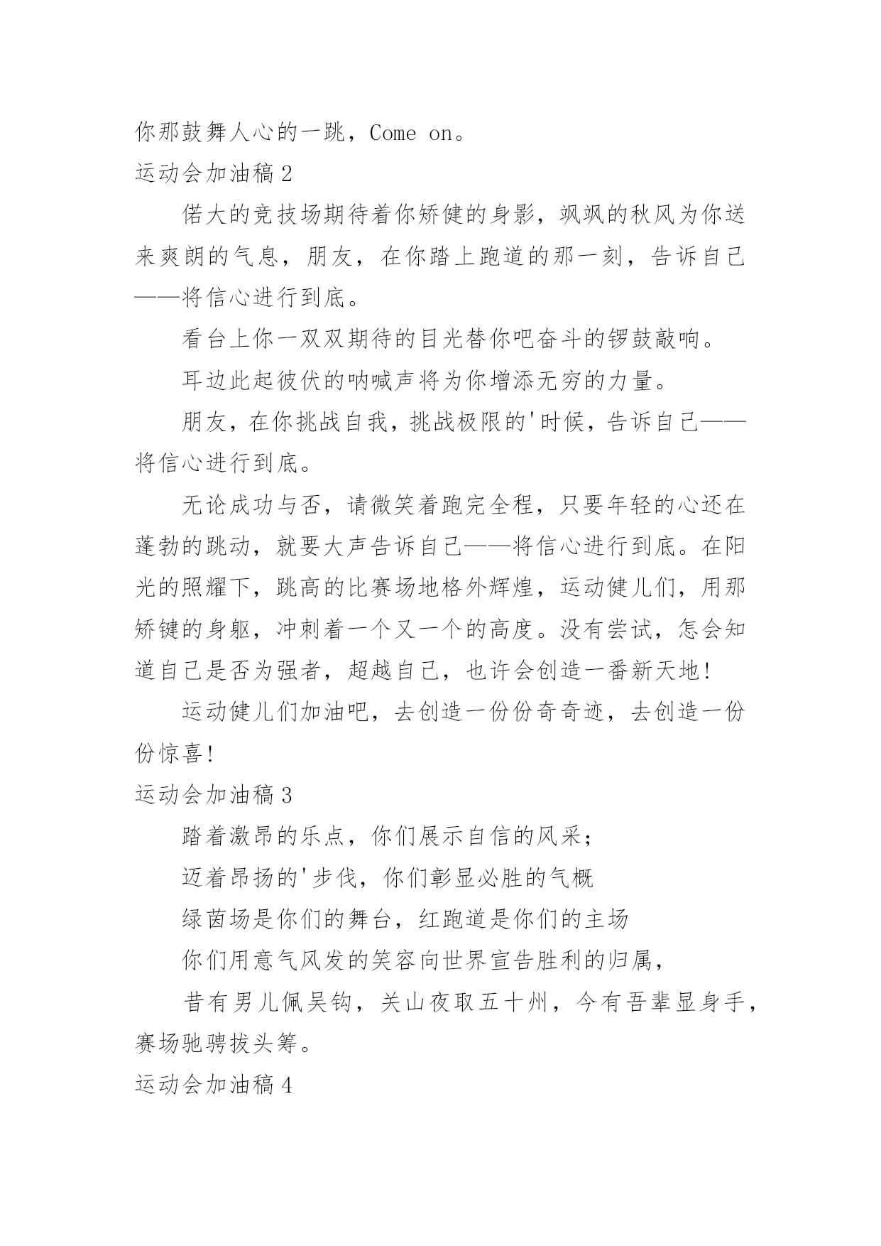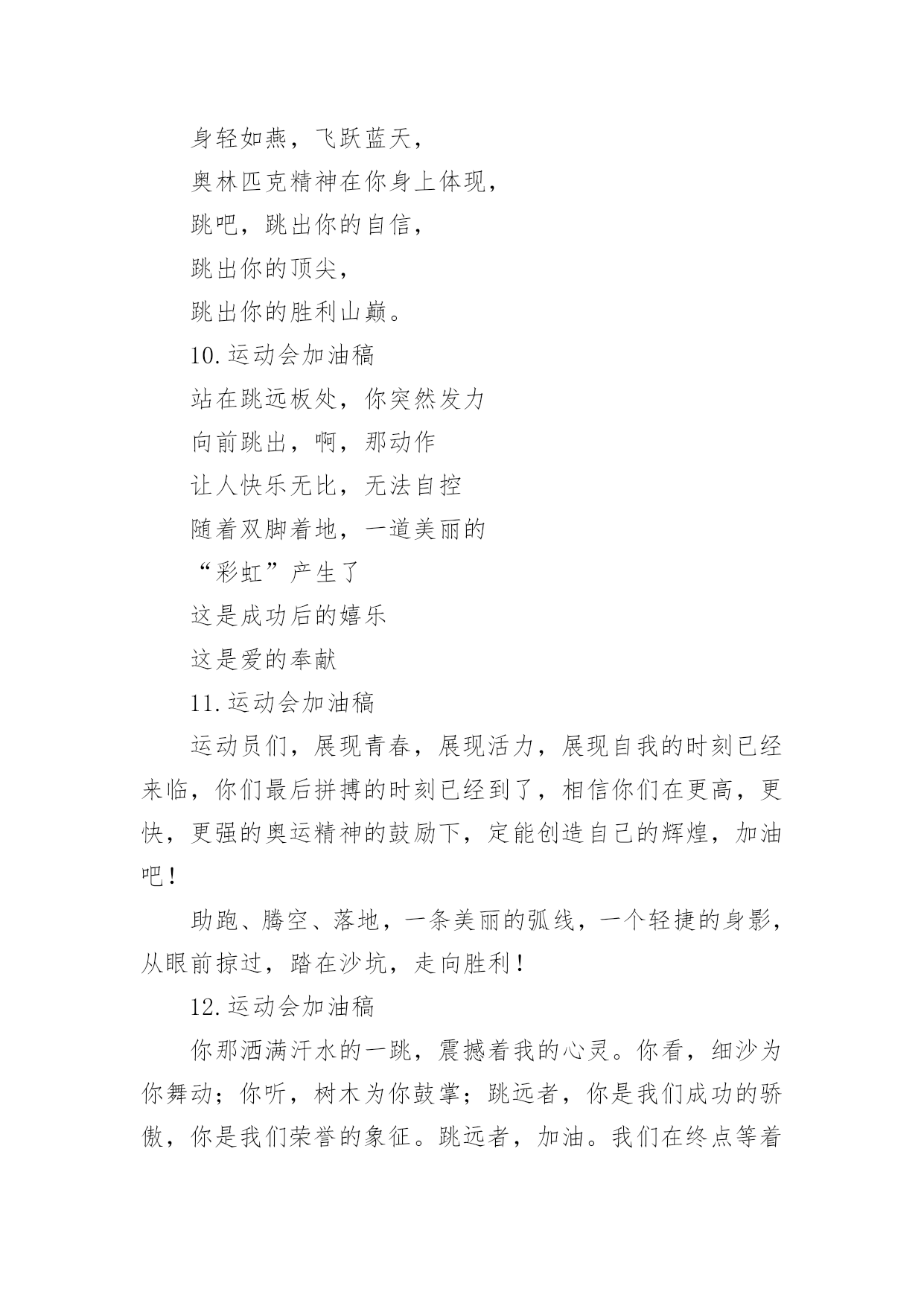运动会加油稿运动会加油稿常用[15篇]在充满活力,日益开放的今天,我们需要用到加油稿的情形越来越多,借助加油稿可以给对方传达鼓励。那么加油稿一般是怎么写的呢?以下是小编为大家收集的运动会加油稿,希望能够帮助到大家。运动会加油稿11.运动会加油稿向前冲吧把所有的希望都洒在这几十米的跑道上加足油吧把所有的汗水都融在这十几米的坑道中吧一二三跳!跳一阵有力的助跑后你腾空跃起顿时——然后——就会有个属于你的距离无论远近都是青春的风采无论胜负都是动人的旋律2.运动会加油稿好似猛虎跳闸恰似虎跃深潭你这奋力一跃犹如天堂一道闪电跳吧!奔向新的目标跳吧!飞向新的起点第一步,跳出你积攒的力量;第二步,跨出你心中的梦想;最后一步,展开你有力的翅膀。跳吧,运动员,跳出一个属于自己的距离!3.运动会加油稿跳远,选择跳跃,选择汗水与泪水浇灌的沃野,生命的绿草丰茂浓密。跳得更远吧,跨过崭新的里程碑——我在这里等你,用我嫩绿的诗句,装点你鲜艳的胜利!秋风飒爽,含载了多少人的期盼与等待。4.运动会加油稿泰戈尔在诗中说,天空没有翅膀的影子,但我已飞过;艾青对朋友说,也许有人到达不了彼岸,但我们共同拥有大海。也许你们没有显赫的成绩,但运动场上留下了你们的足迹。也许你们没有奖品,但我们心中留下了你们拼搏的身影。所有的努力都是为了迎接这一刹那,所有的拼搏都是为了这一声令下。5.运动会加油稿运动员们,你们是团结互助的象征,你们的拼搏就是我们集体的奋斗,你们的成功就是我们的胜利,不经风雨,怎能见彩虹,你们为了集体的荣誉,为了集体的胜利,经历了无数的风风雨雨,现在,是你们享受喜悦的'时候了,运动健将们,加油吧!6.运动会加油稿希望是种子,就该有绿色的自信;希望是种子,就该有金色的梦想。不要躺在封闭的暖房,怕什么秋日薄薄的风霜,既然已走上了运动场,心里就不要多想。跑道已洒满阳光,不要羞涩、不要紧张,听秋雁在空中为你歌唱,快去拾取片片金黄,充满信心,就有希望。7.运动会加油稿运动场上有你们的飒爽英姿,运动场上有你们拼搏的身影,面对漫漫的征程,你没有畏惧和退缩,任汗水打湿脊背,任疲惫爬满全身,依然奋力追赶,只有一个目标,只有一个信念,为班级赢得荣誉,拼搏吧,我为你们呐喊,加油!8.运动会加油稿汗水,泪水;笑声,歌声;我们尽情挥洒。开幕式上,运动场上,我们尽情展现,多少艰辛,多少困苦,我们勇敢承担。因为年轻,因为张扬,因为我们知道:用今天的汗水换来明天的微笑。9.运动会加油稿大地属于你,蓝天属于你,在你一跃的瞬间,同时跃出了我们的希望。草儿欣赏你,白云欢迎你,身轻如燕,飞跃蓝天,奥林匹克精神在你身上体现,跳吧,跳出你的自信,跳出你的顶尖,跳出你的胜利山巅。10.运动会加油稿站在跳远板处,你突然发力向前跳出,啊,那动作让人快乐无比,无法自控随着双脚着地,一道美丽的“彩虹”产生了这是成功后的嬉乐这是爱的奉献11.运动会加油稿运动员们,展现青春,展现活力,展现自我的时刻已经来临,你们最后拼搏的时刻已经到了,相信你们在更高,更快,更强的奥运精神的鼓励下,定能创造自己的辉煌,加油吧!助跑、腾空、落地,一条美丽的弧线,一个轻捷的身影,从眼前掠过,踏在沙坑,走向胜利!12.运动会加油稿你那洒满汗水的一跳,震撼着我的心灵。你看,细沙为你舞动;你听,树木为你鼓掌;跳远者,你是我们成功的骄傲,你是我们荣誉的象征。跳远者,加油。我们在终点等着你那鼓舞人心的一跳,Comeon。运动会加油稿2偌大的竞技场期待着你矫健的身影,飒飒的秋风为你送来爽朗的气息,朋友,在你踏上跑道的那一刻,告诉自己——将信心进行到底。看台上你一双双期待的目光替你吧奋斗的锣鼓敲响。耳边此起彼伏的呐喊声将为你增添无穷的力量。朋友,在你挑战自我,挑战极限的'时候,告诉自己——将信心进行到底。无论成功与否,请微笑着跑完全程,只要年轻的心还在蓬勃的跳动,就要大声告诉自己——将信心进行到底。在阳光的照耀下,跳高的比赛场地格外辉煌,运动健儿们,用那矫键的身躯,冲刺着一个又一个的高度。没有尝试,怎会知道自己是否为强者,超越自己,也许会创造一番新天地!运动健儿们加油吧,去创造一份份奇奇迹,去创造一份份惊喜!运动会加油稿3踏着激昂的乐点,你们展示自信的风采;迈着昂扬的'步伐,你们彰显必胜的气概绿茵场是你们的舞台,红跑道是你们的主场你们用意气风发的笑容向世界宣告胜利的归属,昔有男儿佩吴钩,关山夜取五十州,今有吾辈显身手,赛场驰骋拔头筹。运动会加油稿41、年轻的我们自信飞扬,青春的气息如同出生的朝阳,蓬勃的力量如同阳光的挥洒。此时此刻,跑道便是我们精彩的舞台,声声加油便是我们的奖项!论何成功,谈何荣辱,心中的信念只有一个:拼搏!2、在今日的赛场上运动会通讯稿简短,我只是个场边的看客。我用眼睛见证了赛场上的是非成败,用心灵感受了运动员的喜怒哀乐。他坚持跑完