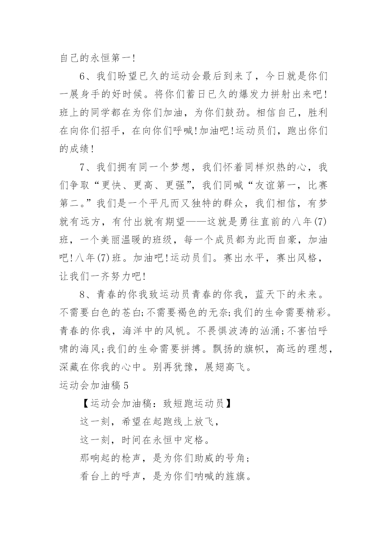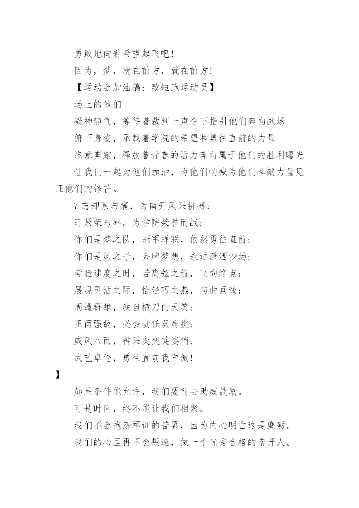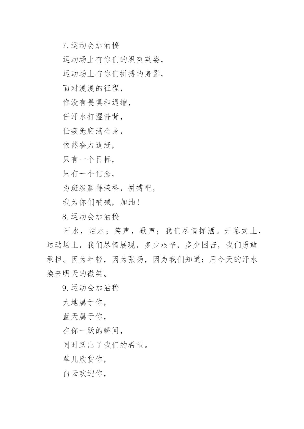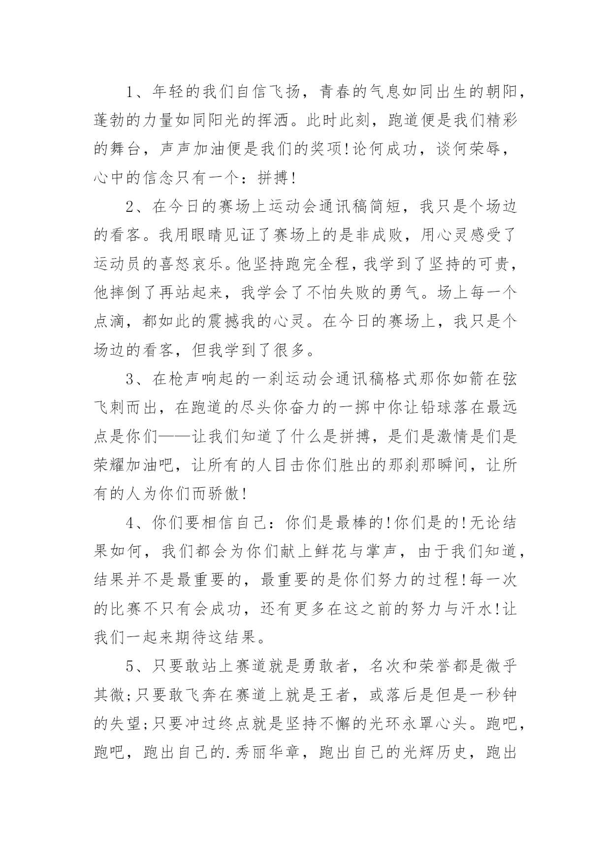 运动会加油稿运动会加油稿常用[15篇]在充满活力,日益开放的今天,我们需要用到加油稿的情形越来越多,借助加油稿可以给对方传达鼓励。那么加油稿一般是怎么写的呢?以下是小编为大家收集的运动会加油稿,希望能够帮助到大家。运动会加油稿11.运动会加油稿向前冲吧把所有的希望都洒在这几十米的跑道上加足油吧把所有的汗水都融在这十几米的坑道中吧一二三跳!跳一阵有力的助跑后你腾空跃起顿时——然后——就会有个属于你的距离无论远近都是青春的风采无论胜负都是动人的旋律2.运动会加油稿好似猛虎跳闸恰似虎跃深潭你这奋力一跃犹如天堂一道闪电跳吧!奔向新的目标跳吧!飞向新的起点第一步,跳出你积攒的力量;第二步,跨出你心中的梦想;最后一步,展开你有力的翅膀。跳吧,运动员,跳出一个属于自己的距离!3.运动会加油稿跳远,选择跳跃,选择汗水与泪水浇灌的沃野,生命的绿草丰茂浓密。跳得更远吧,跨过崭新的里程碑——我在这里等你,用我嫩绿的诗句,装点你鲜艳的胜利!秋风飒爽,含载了多少人的期盼与等待。4.运动会加油稿泰戈尔在诗中说,天空没有翅膀的影子,但我已飞过;艾青对朋友说,也许有人到达不了彼岸,但我们共同拥有大海。也许你们没有显赫的成绩,但运动场上留下了你们的足迹。也许你们没有奖品,但我们心中留下了你们拼搏的身影。所有的努力都是为了迎接这一刹那,所有的拼搏都是为了这一声令下。5.运动会加油稿运动员们,你们是团结互助的象征,你们的拼搏就是我们集体的奋斗,你们的成功就是我们的胜利,不经风雨,怎能见彩虹,你们为了集体的荣誉,为了集体的胜利,经历了无数的风风雨雨,现在,是你们享受喜悦的'时候了,运动健将们,加油吧!6.运动会加油稿希望是种子,就该有绿色的自信;希望是种子,就该有金色的梦想。不要躺在封闭的暖房,怕什么秋日薄薄的风霜,既然已走上了运动场,心里就不要多想。跑道已洒满阳光,不要羞涩、不要紧张,听秋雁在空中为你歌唱,快去拾取片片金黄,充满信心,就有希望。7.运动会加油稿运动场上有你们的飒爽英姿,运动场上有你们拼搏的身影,面对漫漫的征程,你没有畏惧和退缩,任汗水打湿脊背,任疲惫爬满全身,依然奋力追赶,只有一个目标,只有一个信念,为班级赢得荣誉,拼搏吧,我为你们呐喊,加油!8.运动会加油稿汗水,泪水;笑声,歌声;我们尽情挥洒。开幕式上,运动场上,我们尽情展现,多少艰辛,多少困苦,我们勇敢承担。因为年轻,因为张扬,因为我们知道:用今天的汗水换来明天的微笑。9.运动会加油稿大地属于你,蓝天属于你,在你一跃的瞬间,同时跃出了我们的希望。草儿欣赏你,白云欢迎你,身轻如燕,飞跃蓝天,奥林匹克精神在你身上体现,跳吧,跳出你的自信,跳出你的顶尖,跳出你的胜利山巅。10.运动会加油稿站在跳远板处,你突然发力向前跳出,啊,那动作让人快乐无比,无法自控随着双脚着地,一道美丽的“彩虹”产生了这是成功后的嬉乐这是爱的奉献11.运动会加油稿运动员们,展现青春,展现活力,展现自我的时刻已经来临,你们最后拼搏的时刻已经到了,相信你们在更高,更快,更强的奥运精神的鼓励下,定能创造自己的辉煌,加油吧!助跑、腾空、落地,一条美丽的弧线,一个轻捷的身影,从眼前掠过,踏在沙坑,走向胜利!12.运动会加油稿你那洒满汗水的一跳,震撼着我的心灵。你看,细沙为你舞动;你听,树木为你鼓掌;跳远者,你是我们成功的骄傲,你是我们荣誉的象征。跳远者,加油。我们在终点等着你那鼓舞人心的一跳,Comeon。运动会加油稿2偌大的竞技场期待着你矫健的身影,飒飒的秋风为你送来爽朗的气息,朋友,在你踏上跑道的那一刻,告诉自己——将信心进行到底。看台上你一双双期待的目光替你吧奋斗的锣鼓敲响。耳边此起彼伏的呐喊声将为你增添无穷的力量。朋友,在你挑战自我,挑战极限的'时候,告诉自己——将信心进行到底。无论成功与否,请微笑着跑完全程,只要年轻的心还在蓬勃的跳动,就要大声告诉自己——将信心进行到底。在阳光的照耀下,跳高的比赛场地格外辉煌,运动健儿们,用那矫键的身躯,冲刺着一个又一个的高度。没有尝试,怎会知道自己是否为强者,超越自己,也许会创造一番新天地!运动健儿们加油吧,去创造一份份奇奇迹,去创造一份份惊喜!运动会加油稿3踏着激昂的乐点,你们展示自信的风采;迈着昂扬的'步伐,你们彰显必胜的气概绿茵场是你们的舞台,红跑道是你们的主场你们用意气风发的笑容向世界宣告胜利的归属,昔有男儿佩吴钩,关山夜取五十州,今有吾辈显身手,赛场驰骋拔头筹。运动会加油稿41、年轻的我们自信飞扬,青春的气息如同出生的朝阳,蓬勃的力量如同阳光的挥洒。此时此刻,跑道便是我们精彩的舞台,声声加油便是我们的奖项!论何成功,谈何荣辱,心中的信念只有一个:拼搏!2、在今日的赛场上运动会通讯稿简短,我只是个场边的看客。我用眼睛见证了赛场上的是非成败,用心灵感受了运动员的喜怒哀乐。他坚持跑完