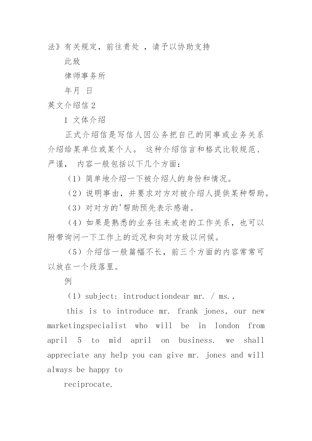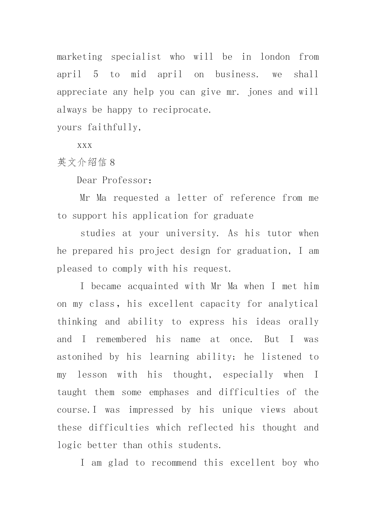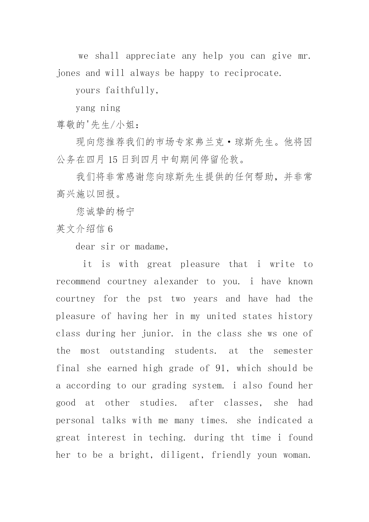 英文介绍信英文介绍信9篇在现实社会中,很多情况下我们需要用到介绍信,介绍信是用来介绍联系接洽事宜的一种函件。怎么写介绍信才能避免踩雷呢?下面是小编为大家整理的英文介绍信,欢迎大家借鉴与参考,希望对大家有所帮助。英文介绍信1介绍信(存根联)﹝201﹞介字第号因_____________,(必填项)律师,依据《中华人民共和国律师法》有关规定,前往(写明去向和事由)北京大成(武汉)律师事务所年月日有效期限截止年月日领取人(签名):批准人(签名):——————————————齐缝章处—————————————裁剪线北京大成(武汉)律师事务所﹝201﹞大成武汉介字第号介绍信————————————————:兹有我律师事务所律师,依据《中华人民共和国律师法》有关规定,前往贵处,请予以协助支持此致律师事务所年月日英文介绍信21文体介绍正式介绍信是写信人因公务把自己的同事或业务关系介绍给某单位或某个人。这种介绍信言和格式比较规范、严谨,内容一般包括以下几个方面:(1)简单地介绍一下被介绍人的身份和情况。(2)说明事由,并要求对方对被介绍人提供某种帮助。(3)对对方的'帮助预先表示感谢。(4)如果是熟悉的业务往来或老的工作关系,也可以附带询问一下工作上的近况和向对方致以问候。(5)介绍信一般篇幅不长,前三个方面的内容常常可以放在一个段落里。例(1)subject:introductiondearmr./ms.,thisistointroducemr.frankjones,ournewmarketingspecialistwhowillbeinlondonfromapril5tomidaprilonbusiness.weshallappreciateanyhelpyoucangivemr.jonesandwillalwaysbehappytoreciprocate.yoursfaithfully,yangning英文介绍信3Dearxxx,iamxxx.iamthatamanisbraveisxxxcirclespecialityismeasuredandmaintained,graduatefromthexxxcollegeofautoindustryofxxx.istudyspecializedcoursediligentlyinthetimeatschool,trainonesownself-studybeenadmittedtothetimeatschoolcarsteeringxxandshone,repairthecardinautomobilegadmittedtotheautomobilesaleandafter-saleservicespecialityofundergraduatecourseofself-studyexaminationoftheuniversityofalwaysloadinjettaandfieldslyingfallowinrotationofthetreasureofourcompanyoneispractised,receivetheleaderstrust,withtheheavyrepairshopoftheaudinow.today,theautomobileisfierceincompetition,itishigherandhighertopeoplesdemand.iliketheautomobileverymuch,iliketheworkoftheautomobileverymuchtoo.icanbecompetentatthecompanyandhandoveranyposttome.iisitisithopeleadercangivemechancetoletmemakecontributionforcompanytoprogresstodemandmeoffersomestrengthforbeautifultomorrowofthecompany,expressgratitudetotheleadersksforyourattention,thatsall.英文介绍信4Dear:howaboutyourecently?fromyouletter,ilearnedyouwanttoknowmyhometown,iamveryhappyintroduceittoyou.myhometownisaveryhistoricalcity,youkonw,inthisplacemanygreatpersonhavetheirnamekonwn,themostfamousiszhounenlai,isn`tit?andnow,ourcityisdevelopingveryfast,i
