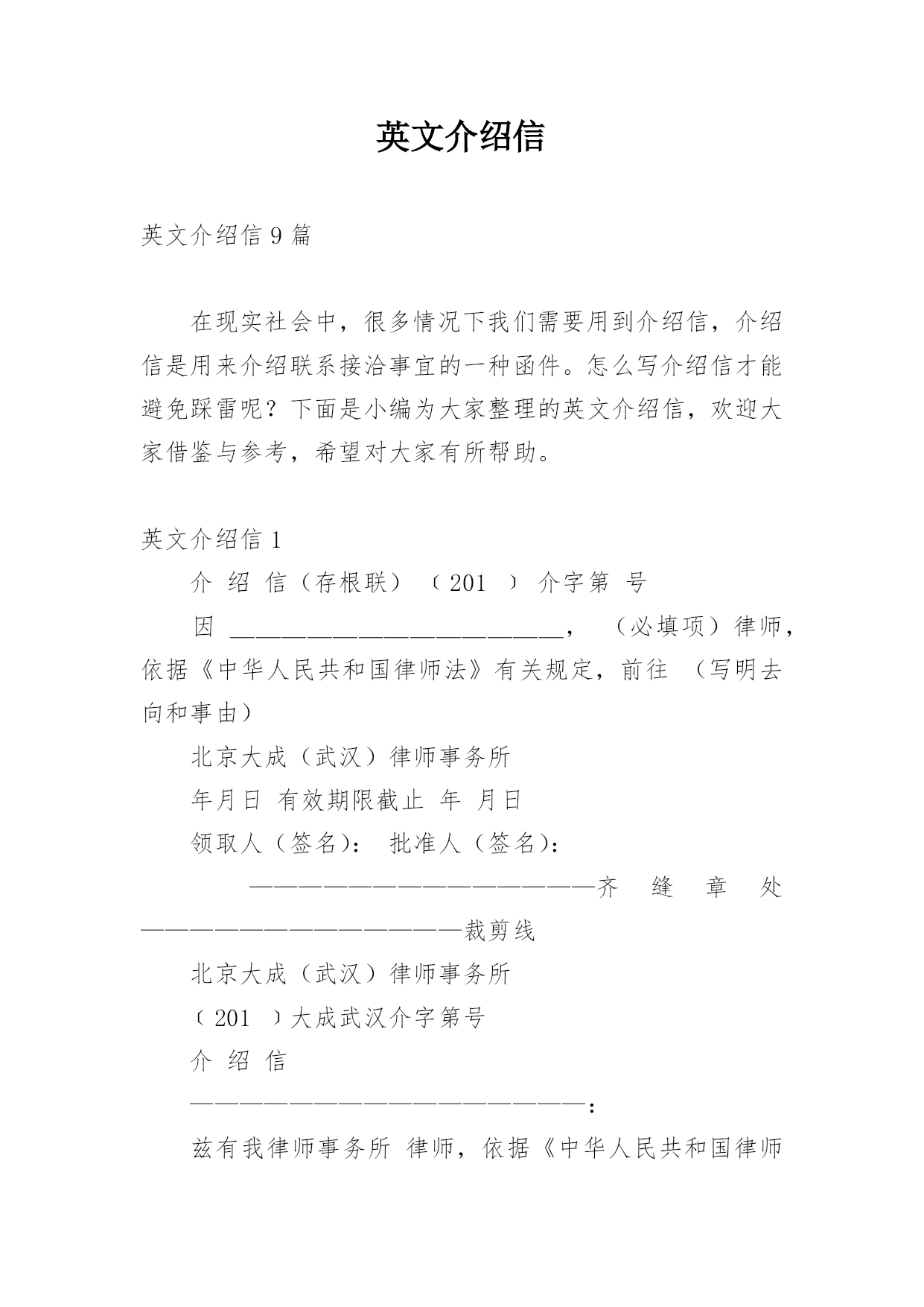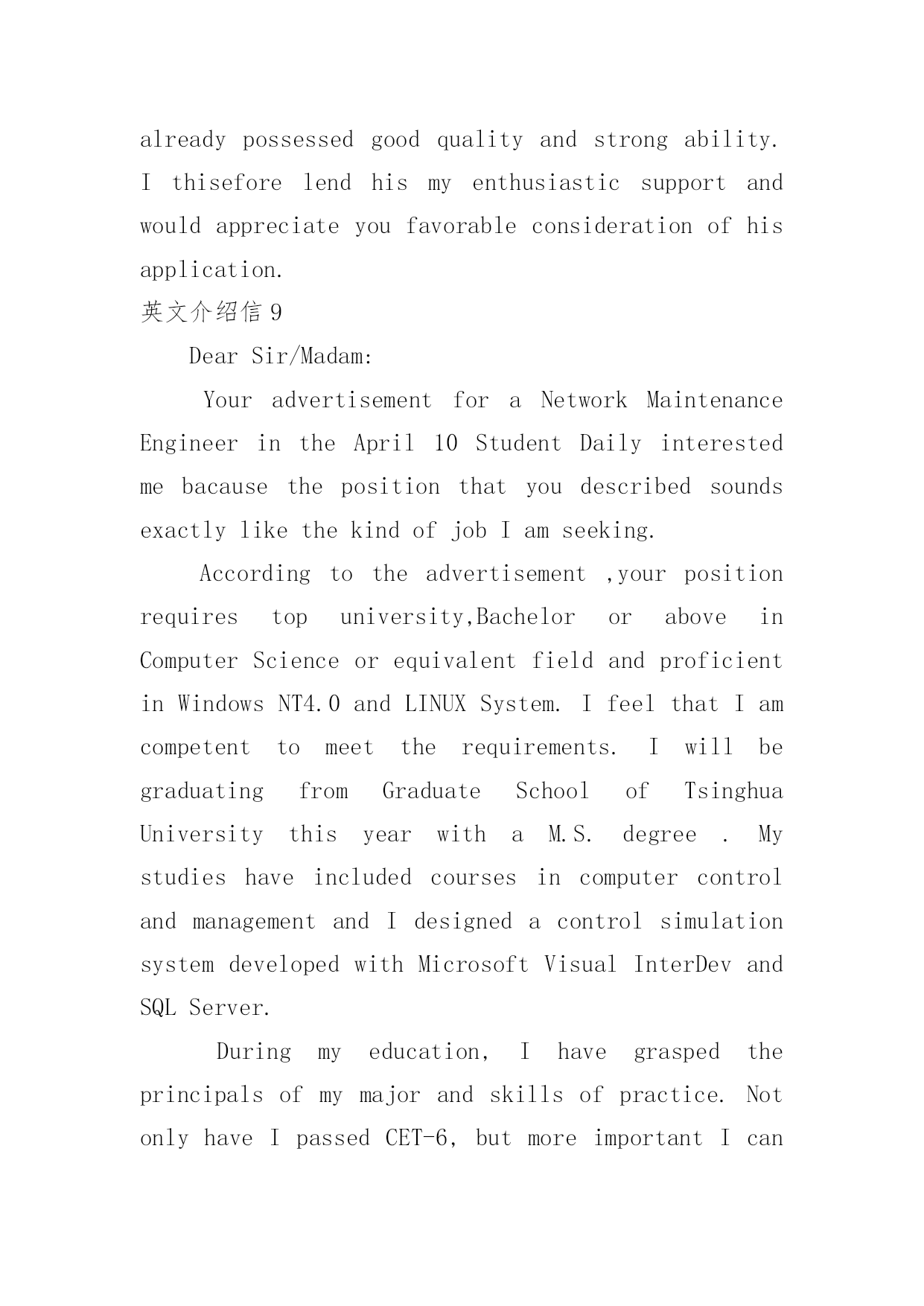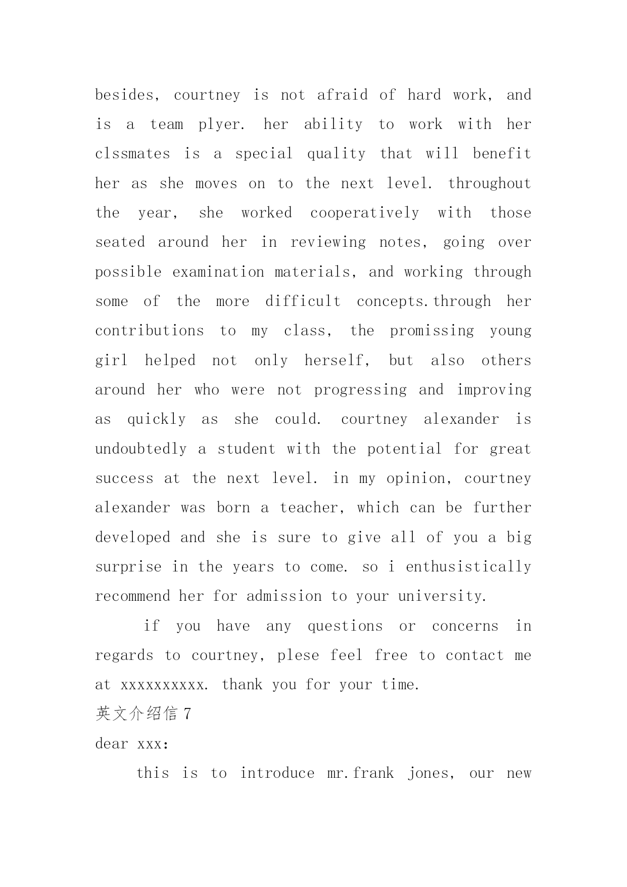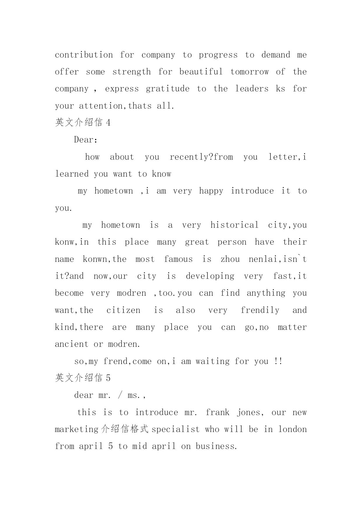 英文介绍信英文介绍信9篇在现实社会中,很多情况下我们需要用到介绍信,介绍信是用来介绍联系接洽事宜的一种函件。怎么写介绍信才能避免踩雷呢?下面是小编为大家整理的英文介绍信,欢迎大家借鉴与参考,希望对大家有所帮助。英文介绍信1介绍信(存根联)﹝201﹞介字第号因_____________,(必填项)律师,依据《中华人民共和国律师法》有关规定,前往(写明去向和事由)北京大成(武汉)律师事务所年月日有效期限截止年月日领取人(签名):批准人(签名):——————————————齐缝章处—————————————裁剪线北京大成(武汉)律师事务所﹝201﹞大成武汉介字第号介绍信————————————————:兹有我律师事务所律师,依据《中华人民共和国律师法》有关规定,前往贵处,请予以协助支持此致律师事务所年月日英文介绍信21文体介绍正式介绍信是写信人因公务把自己的同事或业务关系介绍给某单位或某个人。这种介绍信言和格式比较规范、严谨,内容一般包括以下几个方面:(1)简单地介绍一下被介绍人的身份和情况。(2)说明事由,并要求对方对被介绍人提供某种帮助。(3)对对方的'帮助预先表示感谢。(4)如果是熟悉的业务往来或老的工作关系,也可以附带询问一下工作上的近况和向对方致以问候。(5)介绍信一般篇幅不长,前三个方面的内容常常可以放在一个段落里。例(1)subject:introductiondearmr./ms.,thisistointroducemr.frankjones,ournewmarketingspecialistwhowillbeinlondonfromapril5tomidaprilonbusiness.weshallappreciateanyhelpyoucangivemr.jonesandwillalwaysbehappytoreciprocate.yoursfaithfully,yangning英文介绍信3Dearxxx,iamxxx.iamthatamanisbraveisxxxcirclespecialityismeasuredandmaintained,graduatefromthexxxcollegeofautoindustryofxxx.istudyspecializedcoursediligentlyinthetimeatschool,trainonesownself-studybeenadmittedtothetimeatschoolcarsteeringxxandshone,repairthecardinautomobilegadmittedtotheautomobilesaleandafter-saleservicespecialityofundergraduatecourseofself-studyexaminationoftheuniversityofalwaysloadinjettaandfieldslyingfallowinrotationofthetreasureofourcompanyoneispractised,receivetheleaderstrust,withtheheavyrepairshopoftheaudinow.today,theautomobileisfierceincompetition,itishigherandhighertopeoplesdemand.iliketheautomobileverymuch,iliketheworkoftheautomobileverymuchtoo.icanbecompetentatthecompanyandhandoveranyposttome.iisitisithopeleadercangivemechancetoletmemakecontributionforcompanytoprogresstodemandmeoffersomestrengthforbeautifultomorrowofthecompany,expressgratitudetotheleadersksforyourattention,thatsall.英文介绍信4Dear:howaboutyourecently?fromyouletter,ilearnedyouwanttoknowmyhometown,iamveryhappyintroduceittoyou.myhometownisaveryhistoricalcity,youkonw,inthisplacemanygreatpersonhavetheirnamekonwn,themostfamousiszhounenlai,isn`tit?andnow,ourcityisdevelopingveryfast,i