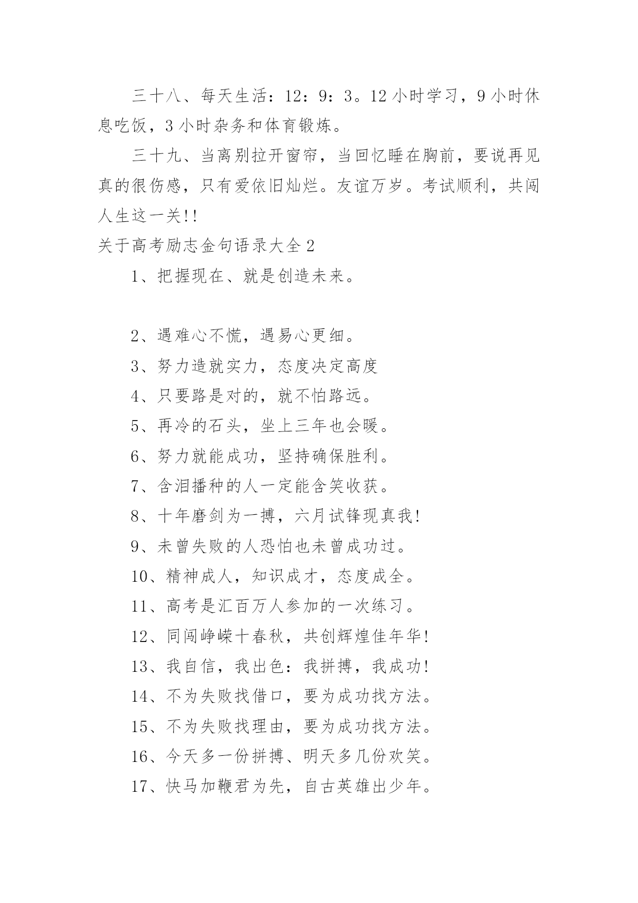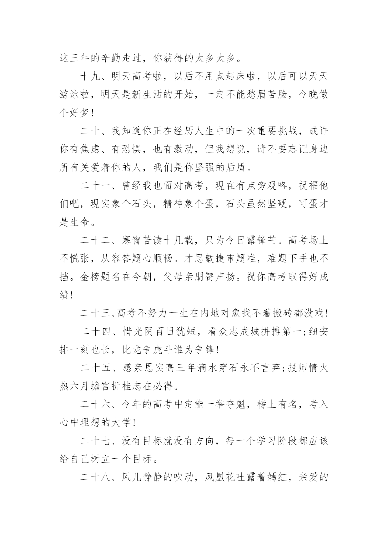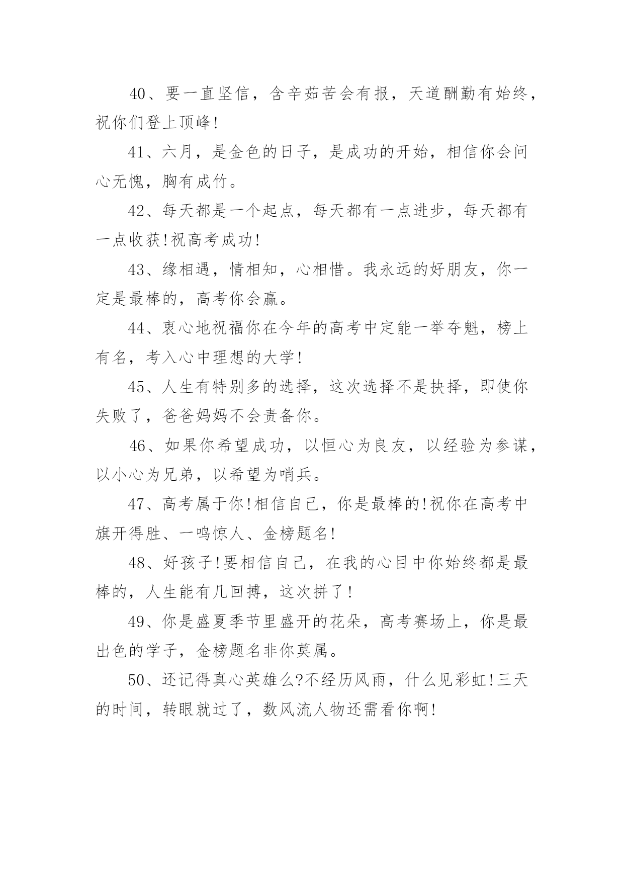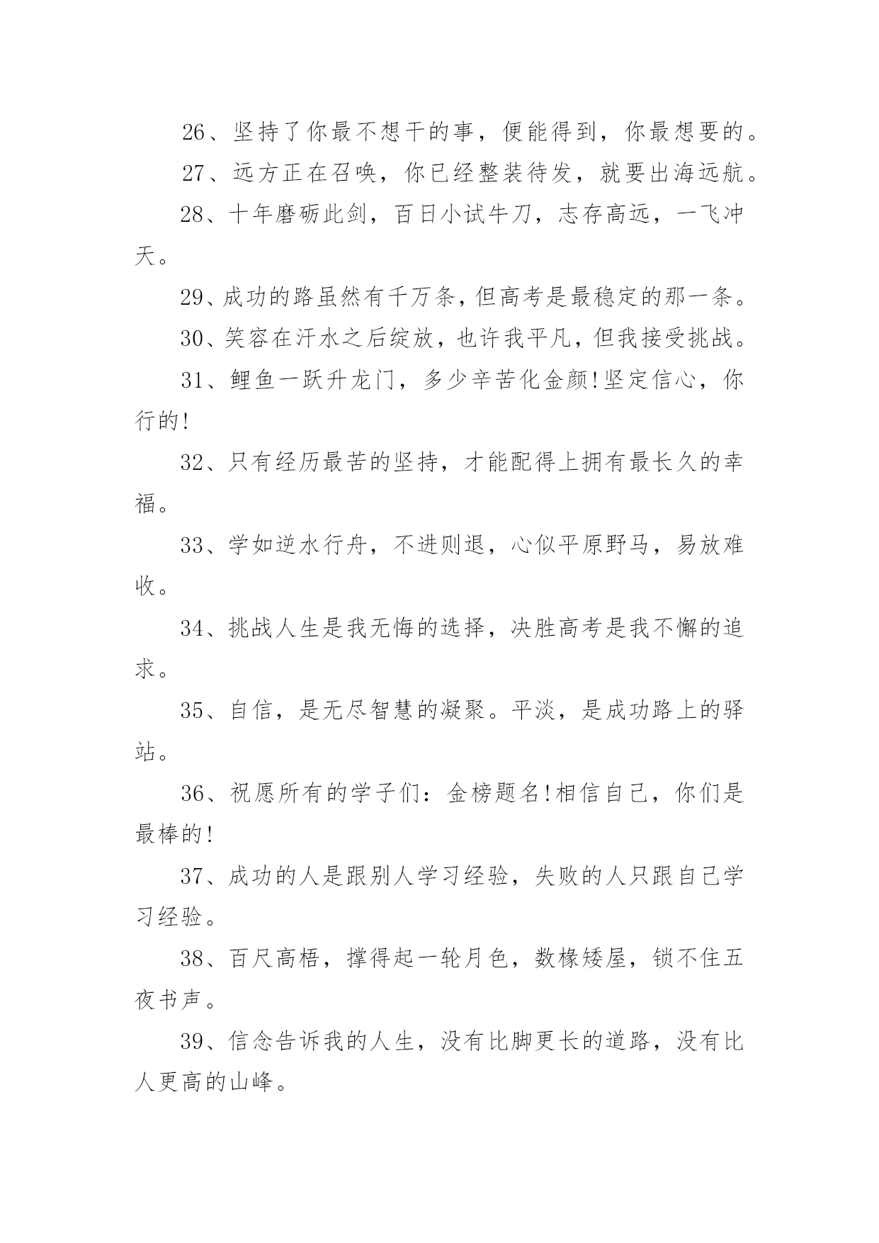 高考励志金句语录关于高考励志金句语录大全在生活、工作和学习中,大家对语录都再熟悉不过了吧,语录是中国古代散文的一种体式,常用于门人弟子记录先生的言行,也用于佛门的传教记录。你所见过的语录是什么样的呢?下面是小编精心整理的关于高考励志金句语录大全,供大家参考借鉴,希望可以帮助到有需要的朋友。关于高考励志金句语录大全1一、家中父母吃苦受累盼的是捷报频传,灯下学子沤心沥血想的是金板题名二、我自信,故我成功”、“我行,我一定能行”三、送走了五月花丛的芬芳,迎来六月桃李的时光。高考在即,给你发条短信:你可以不用理我,但不能失去自我;你可以不看短信,但不能没有自信,预祝高考顺利!四、天再热,热不过心;有信心,一切皆有可能。祝高考顺利,前程似锦。五、这两天的考试过程中,要调整好自己的情绪,考过一门,就不要再想了,重要的是吃好,喝好,休息好,营造一种良好的应考氛围,祝愿你考试顺利!六、考试顺利,共闯人生这一关!七、为你倒数,还有几个小时就要上战场了,希望你能够放松心情,不要紧张。我知道你平时学习一向都很努力,学得很不错,相信你考好成绩是没问题的!八、健康身体是基础,良好学风是条件,勤奋刻苦是前提,学习方法是关键,心理素质是保证。九、嗨,你还有空看短信呢?证明你没用功学习:P不过既然你看到的这条短信,我还是想把我一直想说的话告诉你:考试顺利,一起努力!十、高考试卷是一把刻度不均匀的尺子:对于你自己来说,难题的分值不一定高。十一、不苦不累,高三无味;不拼不搏,等于白活。十二、废话不多说,祝年年有今日,岁岁有今朝。十三、想摘玫瑰,就要先折刺枝;想走坦途,就要斩除荆棘;想看到天明,就要勇闯夜寂;想考试高中,就要倍加努力:厚德载物,天道酬勤,祝高考顺利!十四、十年苦读,十二年付出,十二年挥洒自如,十二年寒窗无数。睡个好觉,做个好梦,让信心更加充足,你一定会取得锦绣前途。十五、静下来,铸我实力;拼上去,亮我风采。十六、推荐阅读:给高考朋友加油的短信句子高考成功祝福语十七、高考是一个实现人生的省力杠杆,此时是你撬动它的最佳时机,并且以后你的人生会呈弧线上升。十八、高考着实是一种丰收,它包蕴着太多的内涵。无论高考成绩如何,你的成长与成熟是任何人无法改变的事实,这三年的辛勤走过,你获得的太多太多。十九、明天高考啦,以后不用点起床啦,以后可以天天游泳啦,明天是新生活的开始,一定不能愁眉苦脸,今晚做个好梦!二十、我知道你正在经历人生中的一次重要挑战,或许你有焦虑、有恐惧,也有激动,但我想说,请不要忘记身边所有关爱着你的人,我们是你坚强的后盾。二十一、曾经我也面对高考,现在有点旁观咯,祝福他们吧,现实象个石头,精神象个蛋,石头虽然坚硬,可蛋才是生命。二十二、寒窗苦读十几载,只为今日露锋芒。高考场上不慌张,从容答题心顺畅。才思敏捷审题准,难题下手也不挡。金榜题名在今朝,父母亲朋赞声扬。祝你高考取得好成绩!二十三、高考不努力一生在内地对象找不着搬砖都没戏!二十四、惜光阴百日犹短,看众志成城拼搏第一;细安排一刻也长,比龙争虎斗谁为争锋!二十五、感亲恩实高三年滴水穿石永不言弃;报师情火热六月蟾宫折桂志在必得。二十六、今年的高考中定能一举夺魁,榜上有名,考入心中理想的大学!二十七、没有目标就没有方向,每一个学习阶段都应该给自己树立一个目标。二十八、风儿静静的吹动,凤凰花吐露着嫣红,亲爱的朋友请握一握手,明天就要各奔西东!但不要忘记彼此的约定:高考成功!二十九、远没有刚考完时那样为高考的朋友所有参加高考的朋友不管怎样我们走过衷心地祝福你在三十、废话不多说,祝所有今年高考的小朋友们,高考成绩一年更比一年好。三十一、十年寒窗苦读日,只盼金榜题名时,祝你高考拿高分,鲤鱼跳龙门!加油!三十二、开启高考成功之门,钥匙有三。其一:勤奋的精神;其二:科学的方法;其三:良好的心态。三十三、高考在即,紧张难免;适量放松,方位上策;书本暂放,好好休息;临阵磨枪,效果甚微;心态良好,至关重要;平常心待,万事皆宜,愿你高考,取得佳绩!三十四、就要考试了,希望我的问候短信会为你送去一份轻松清爽的心情,不要太紧张哦!不然可会把答案忘掉的!我在这里支持着你,鼓励着你,为你祝福!三十五、废话不多说,祝所有今年高考的小朋友们,都能在复读班交到合适的女朋友。三十六、我们讲同的家三年,漫长而又短暂。在这不同寻常的三年中,我们风雨兼程,肩并HAPPY_好像越到知道成绩的时候,心里越是忐忑不安!三十七、高考加油!亲爱的.朋友,平和一下自己的心态,控制自己的情绪,以平常心态应考,考完一门忘一门,让自己尽量放松,好好休息。希望你一举高中喔!三十八、每天生活:12:9:3。12小时学习,9小时休息吃饭,3小时杂务和体育锻炼。三十九、当离别拉开窗帘,当回忆睡在胸前,要说再见真的很伤感,只有爱依旧灿烂。友谊万岁。考试顺利,共
