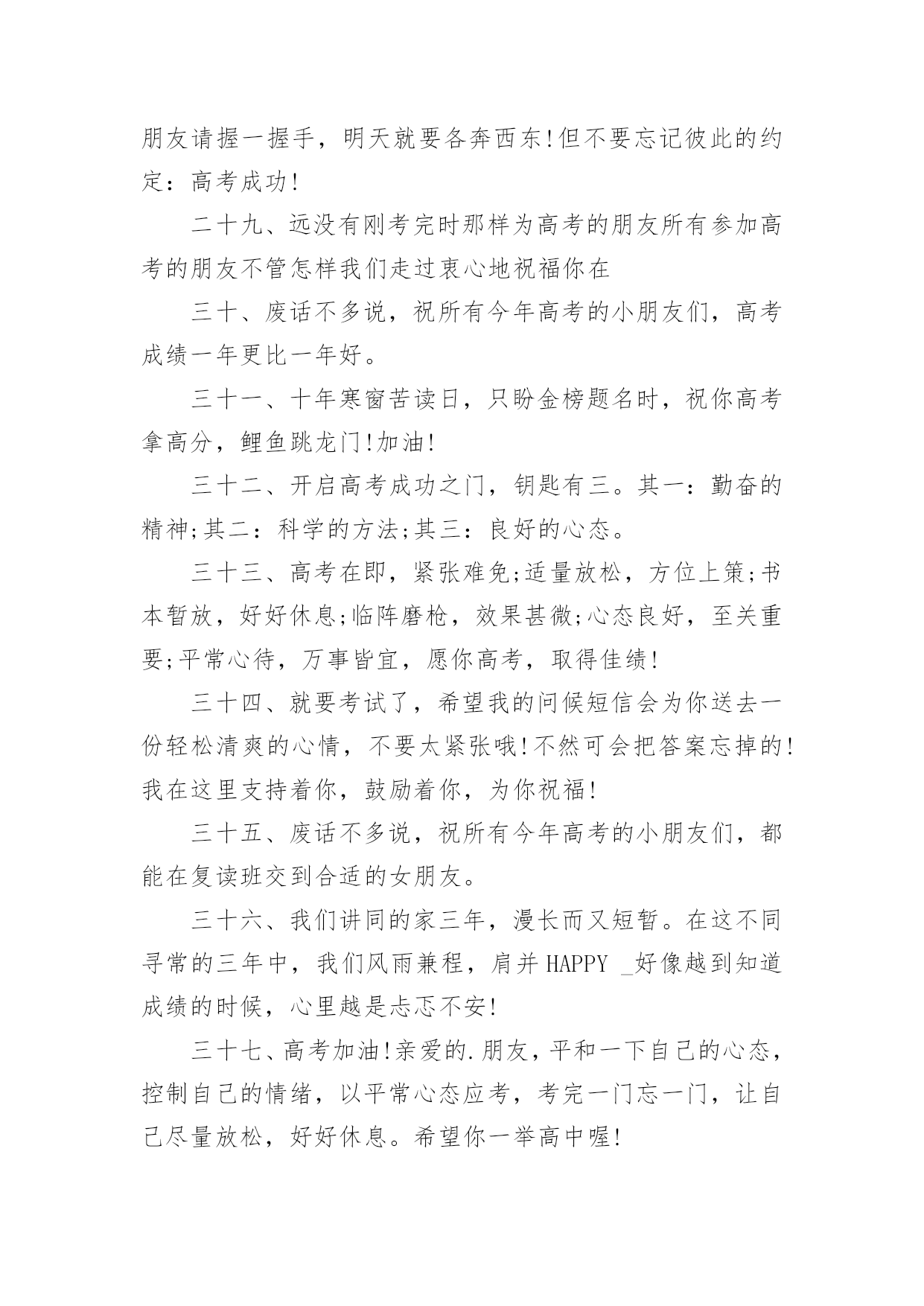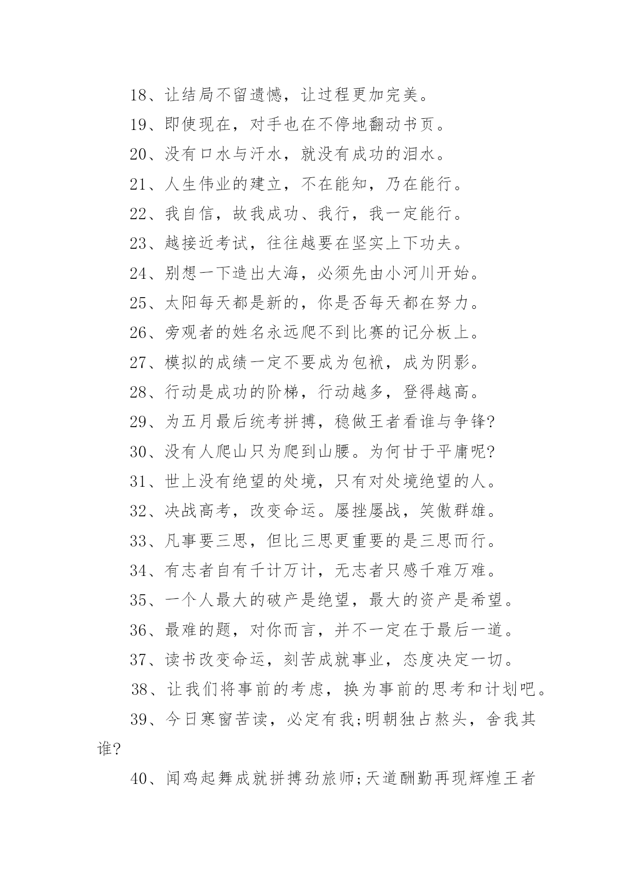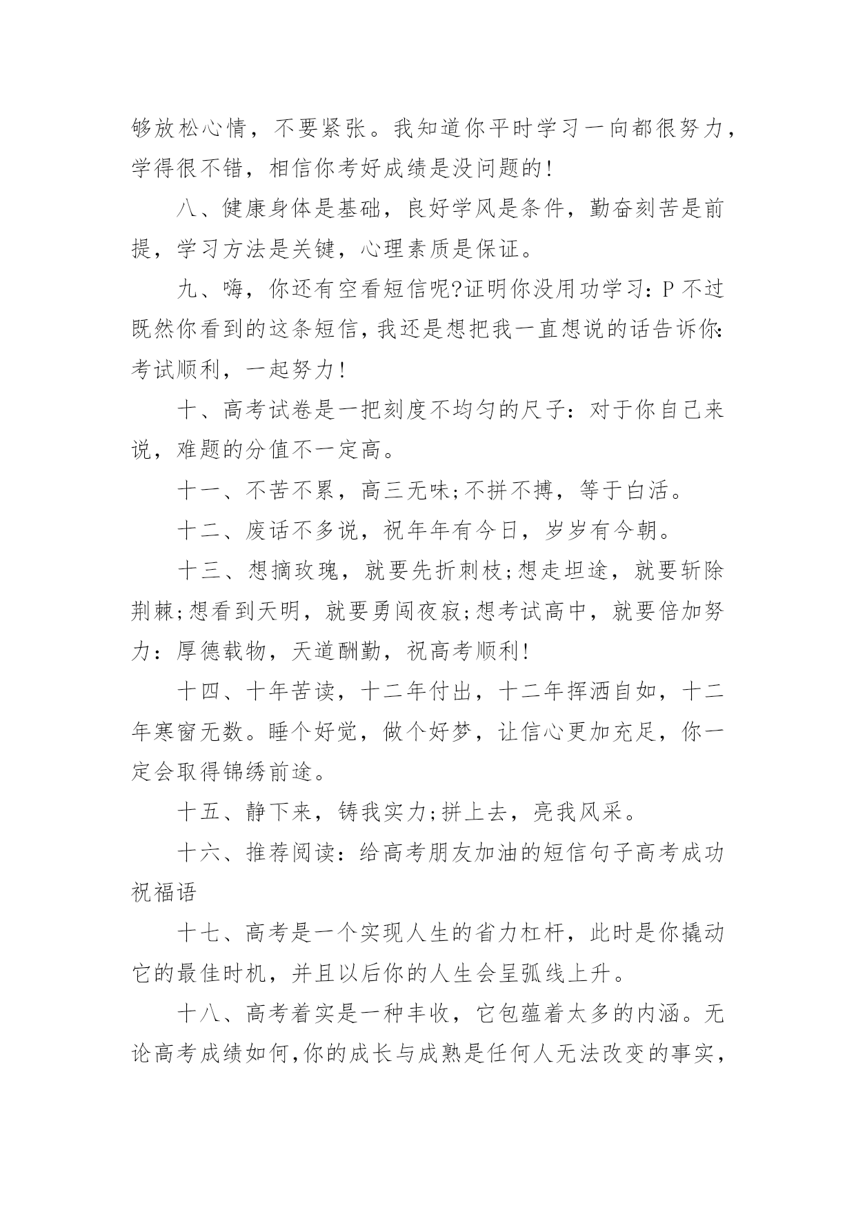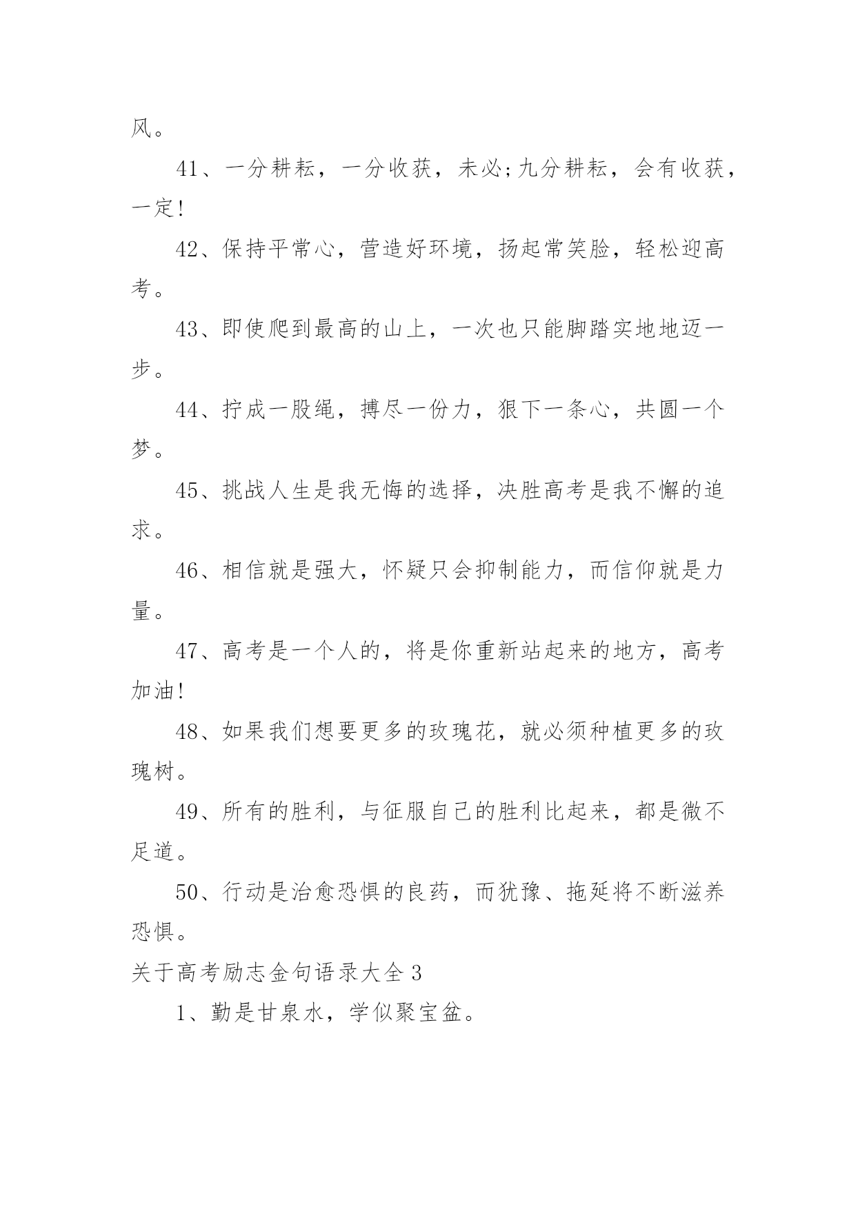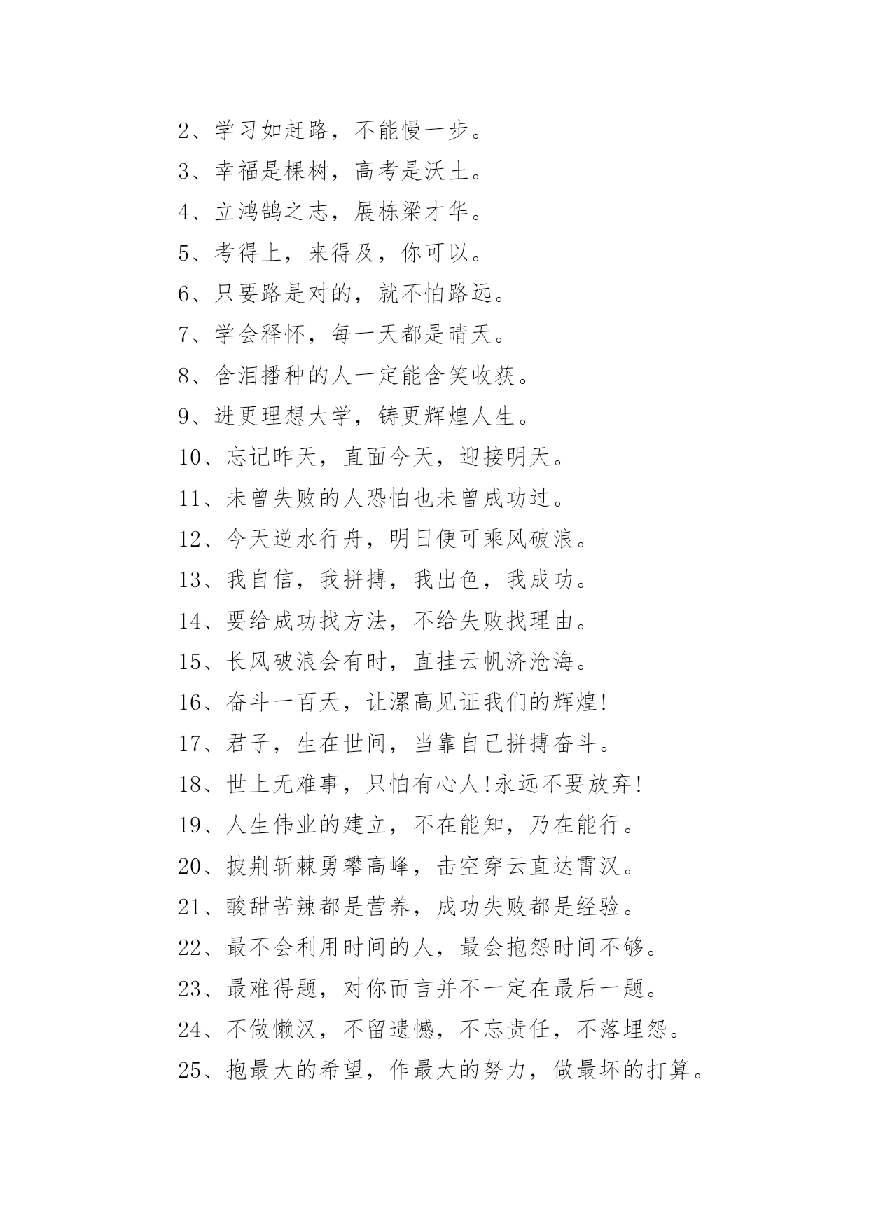 高考励志金句语录关于高考励志金句语录大全在生活、工作和学习中,大家对语录都再熟悉不过了吧,语录是中国古代散文的一种体式,常用于门人弟子记录先生的言行,也用于佛门的传教记录。你所见过的语录是什么样的呢?下面是小编精心整理的关于高考励志金句语录大全,供大家参考借鉴,希望可以帮助到有需要的朋友。关于高考励志金句语录大全1一、家中父母吃苦受累盼的是捷报频传,灯下学子沤心沥血想的是金板题名二、我自信,故我成功”、“我行,我一定能行”三、送走了五月花丛的芬芳,迎来六月桃李的时光。高考在即,给你发条短信:你可以不用理我,但不能失去自我;你可以不看短信,但不能没有自信,预祝高考顺利!四、天再热,热不过心;有信心,一切皆有可能。祝高考顺利,前程似锦。五、这两天的考试过程中,要调整好自己的情绪,考过一门,就不要再想了,重要的是吃好,喝好,休息好,营造一种良好的应考氛围,祝愿你考试顺利!六、考试顺利,共闯人生这一关!七、为你倒数,还有几个小时就要上战场了,希望你能够放松心情,不要紧张。我知道你平时学习一向都很努力,学得很不错,相信你考好成绩是没问题的!八、健康身体是基础,良好学风是条件,勤奋刻苦是前提,学习方法是关键,心理素质是保证。九、嗨,你还有空看短信呢?证明你没用功学习:P不过既然你看到的这条短信,我还是想把我一直想说的话告诉你:考试顺利,一起努力!十、高考试卷是一把刻度不均匀的尺子:对于你自己来说,难题的分值不一定高。十一、不苦不累,高三无味;不拼不搏,等于白活。十二、废话不多说,祝年年有今日,岁岁有今朝。十三、想摘玫瑰,就要先折刺枝;想走坦途,就要斩除荆棘;想看到天明,就要勇闯夜寂;想考试高中,就要倍加努力:厚德载物,天道酬勤,祝高考顺利!十四、十年苦读,十二年付出,十二年挥洒自如,十二年寒窗无数。睡个好觉,做个好梦,让信心更加充足,你一定会取得锦绣前途。十五、静下来,铸我实力;拼上去,亮我风采。十六、推荐阅读:给高考朋友加油的短信句子高考成功祝福语十七、高考是一个实现人生的省力杠杆,此时是你撬动它的最佳时机,并且以后你的人生会呈弧线上升。十八、高考着实是一种丰收,它包蕴着太多的内涵。无论高考成绩如何,你的成长与成熟是任何人无法改变的事实,这三年的辛勤走过,你获得的太多太多。十九、明天高考啦,以后不用点起床啦,以后可以天天游泳啦,明天是新生活的开始,一定不能愁眉苦脸,今晚做个好梦!二十、我知道你正在经历人生中的一次重要挑战,或许你有焦虑、有恐惧,也有激动,但我想说,请不要忘记身边所有关爱着你的人,我们是你坚强的后盾。二十一、曾经我也面对高考,现在有点旁观咯,祝福他们吧,现实象个石头,精神象个蛋,石头虽然坚硬,可蛋才是生命。二十二、寒窗苦读十几载,只为今日露锋芒。高考场上不慌张,从容答题心顺畅。才思敏捷审题准,难题下手也不挡。金榜题名在今朝,父母亲朋赞声扬。祝你高考取得好成绩!二十三、高考不努力一生在内地对象找不着搬砖都没戏!二十四、惜光阴百日犹短,看众志成城拼搏第一;细安排一刻也长,比龙争虎斗谁为争锋!二十五、感亲恩实高三年滴水穿石永不言弃;报师情火热六月蟾宫折桂志在必得。二十六、今年的高考中定能一举夺魁,榜上有名,考入心中理想的大学!二十七、没有目标就没有方向,每一个学习阶段都应该给自己树立一个目标。二十八、风儿静静的吹动,凤凰花吐露着嫣红,亲爱的朋友请握一握手,明天就要各奔西东!但不要忘记彼此的约定:高考成功!二十九、远没有刚考完时那样为高考的朋友所有参加高考的朋友不管怎样我们走过衷心地祝福你在三十、废话不多说,祝所有今年高考的小朋友们,高考成绩一年更比一年好。三十一、十年寒窗苦读日,只盼金榜题名时,祝你高考拿高分,鲤鱼跳龙门!加油!三十二、开启高考成功之门,钥匙有三。其一:勤奋的精神;其二:科学的方法;其三:良好的心态。三十三、高考在即,紧张难免;适量放松,方位上策;书本暂放,好好休息;临阵磨枪,效果甚微;心态良好,至关重要;平常心待,万事皆宜,愿你高考,取得佳绩!三十四、就要考试了,希望我的问候短信会为你送去一份轻松清爽的心情,不要太紧张哦!不然可会把答案忘掉的!我在这里支持着你,鼓励着你,为你祝福!三十五、废话不多说,祝所有今年高考的小朋友们,都能在复读班交到合适的女朋友。三十六、我们讲同的家三年,漫长而又短暂。在这不同寻常的三年中,我们风雨兼程,肩并HAPPY_好像越到知道成绩的时候,心里越是忐忑不安!三十七、高考加油!亲爱的.朋友,平和一下自己的心态,控制自己的情绪,以平常心态应考,考完一门忘一门,让自己尽量放松,好好休息。希望你一举高中喔!三十八、每天生活:12:9:3。12小时学习,9小时休息吃饭,3小时杂务和体育锻炼。三十九、当离别拉开窗帘,当回忆睡在胸前,要说再见真的很伤感,只有爱依旧灿烂。友谊万岁。考试顺利,共