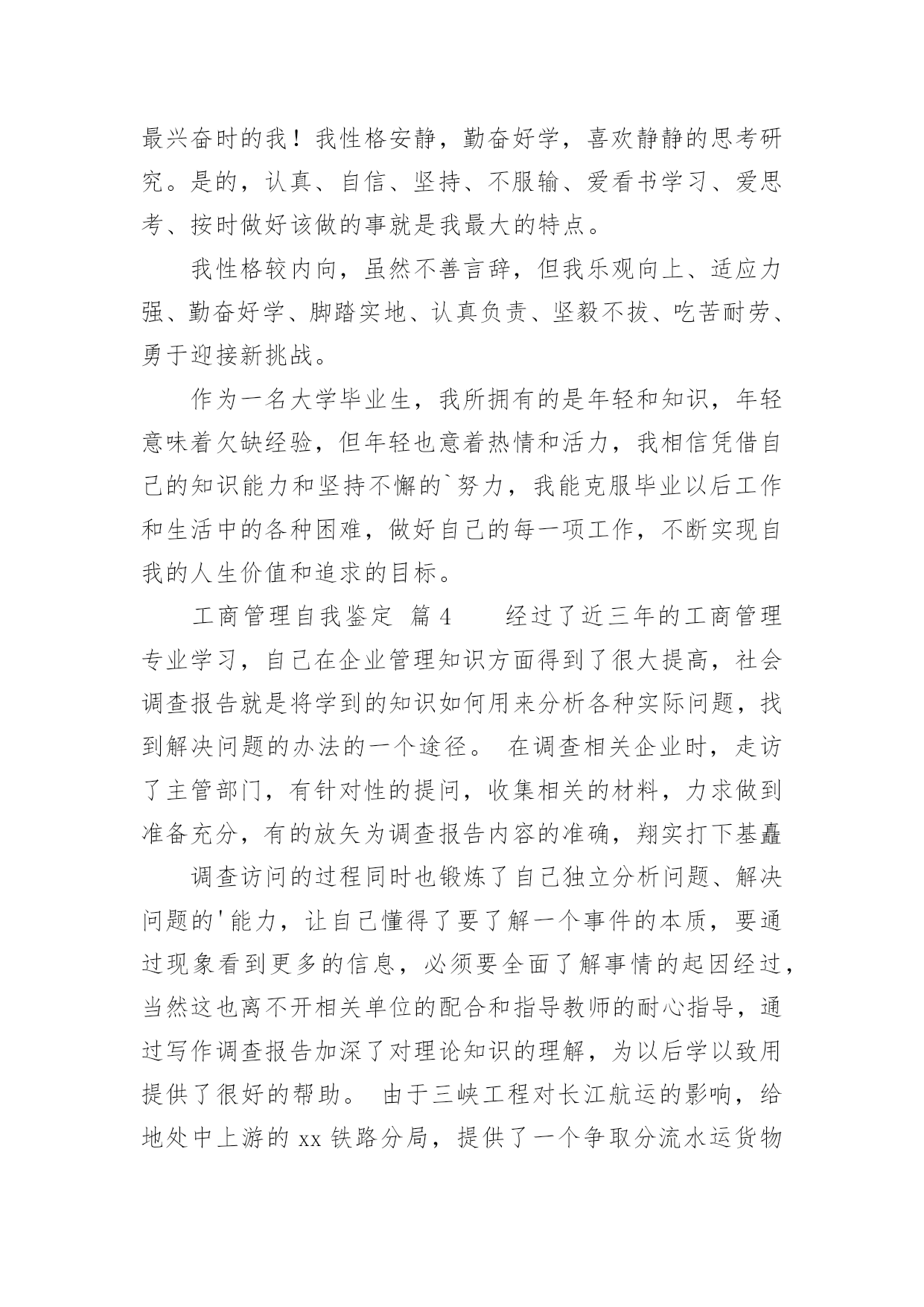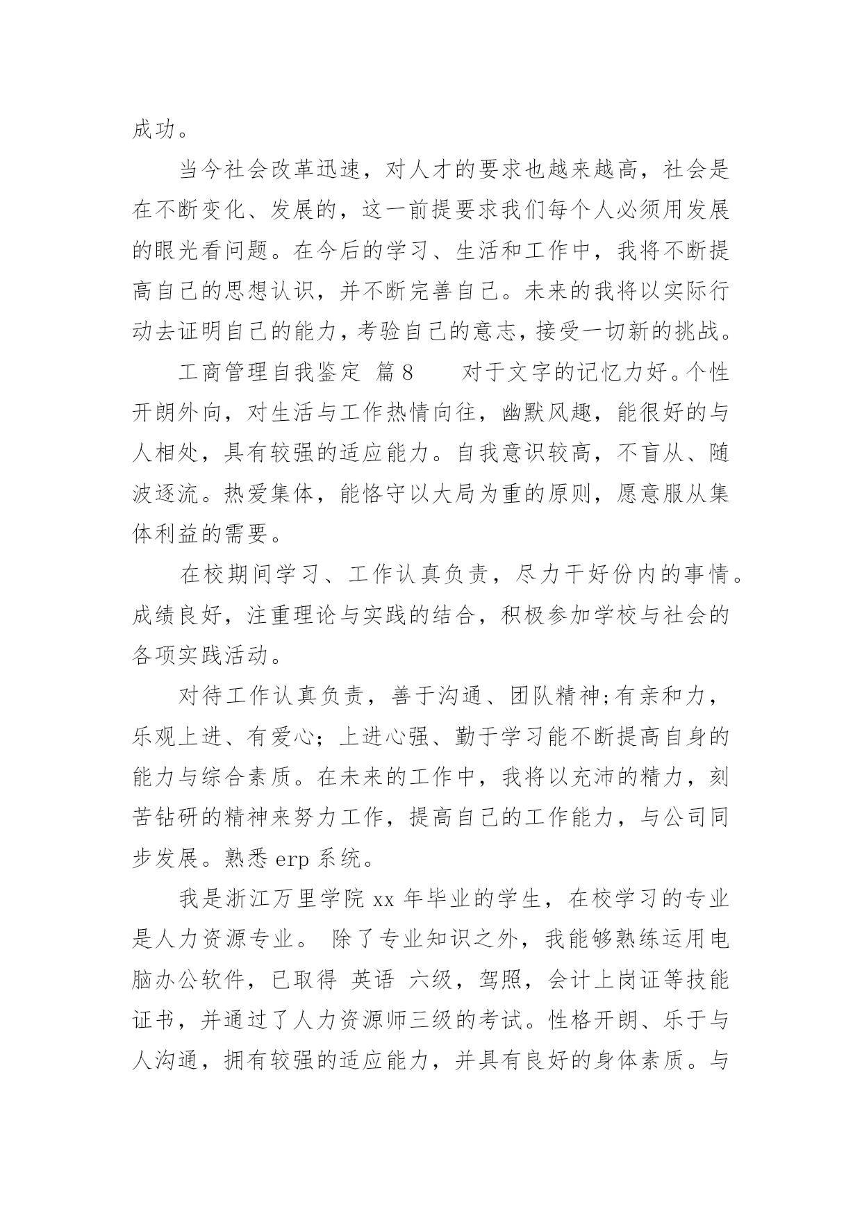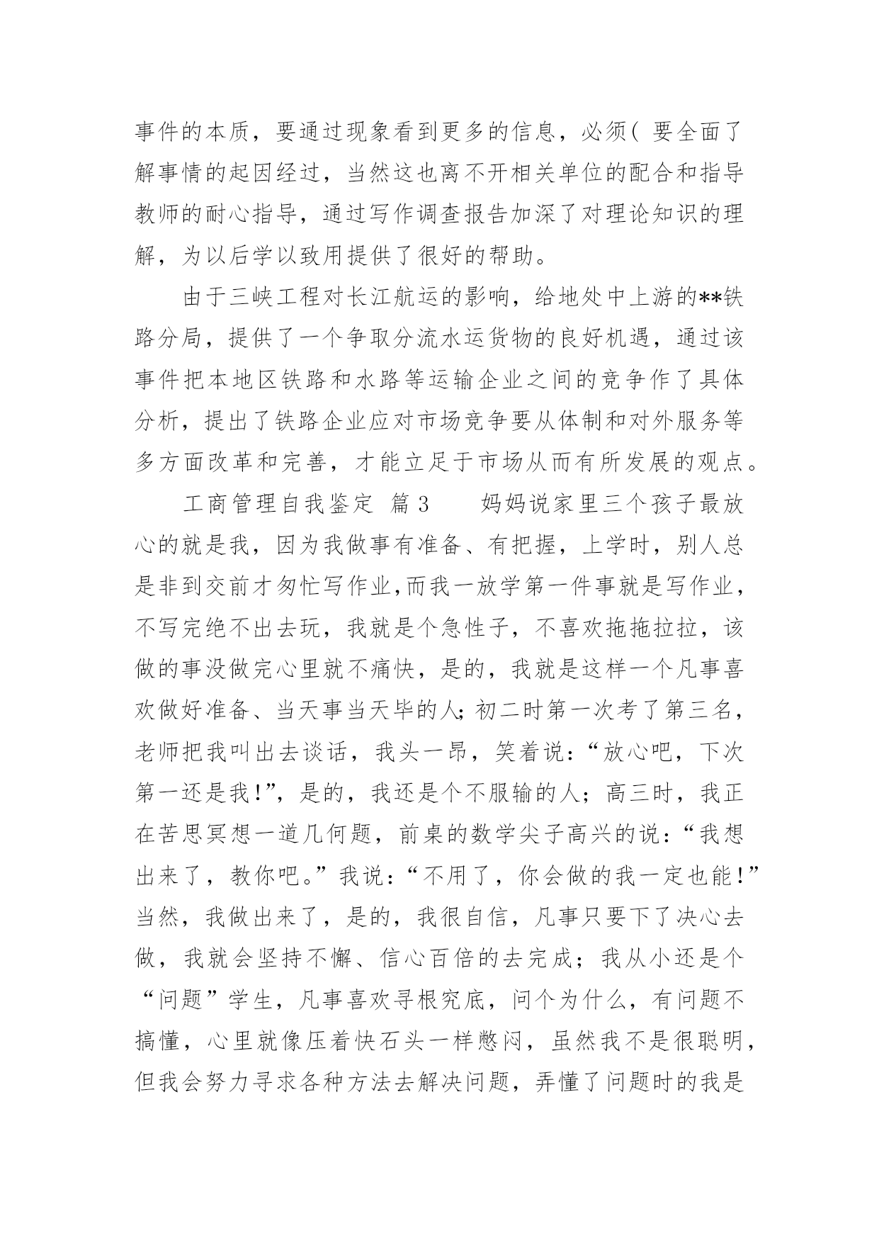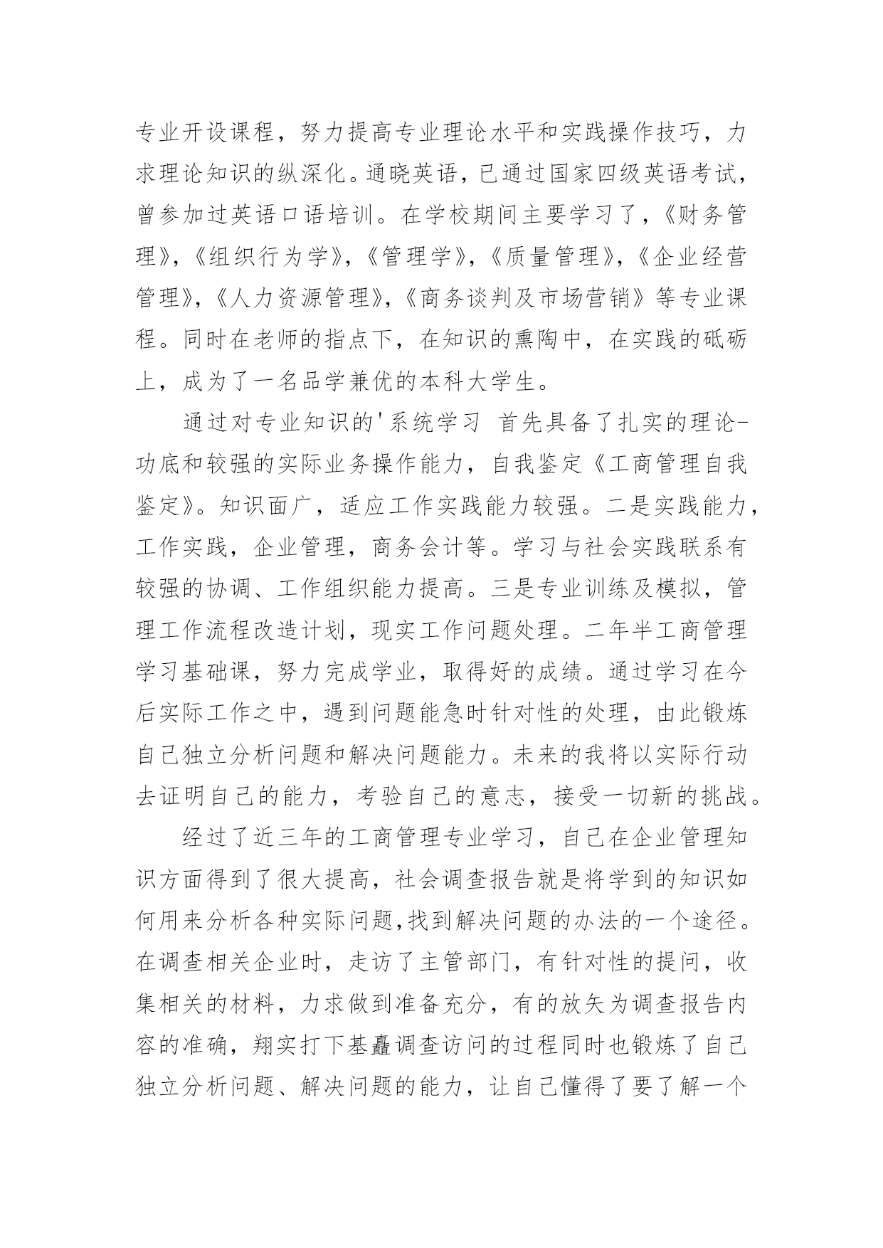 工商管理自我鉴定工商管理自我鉴定集合13篇自我鉴定是对一个阶段的学习或工作进行回顾检查并分析评价,它可以帮助我们有寻找学习和工作中的规律,因此我们是时候写一份自我鉴定了。自我鉴定一般是怎么写的呢?以下是小编整理的工商管理自我鉴定,欢迎大家借鉴与参考,希望对大家有所帮助。工商管理自我鉴定篇1转眼的学习生活已接近尾声,虽然我们都是已经走上工作岗位的学生,不能像全日制学生那样全天候的在校学习、生活,但这种工作→学习→实践,不断重复的学习模式,使我收获匪浅,受益终生。回顾这两年的学习历程,感受颇多。以前一直认为,学历不代表能力,只要有丰富的工作经验,就能弥补理论及专业知识的不足,所以,工作中一直很重视实践所总结出来的经验,再加上不同的工作环境,偶尔也有些小骄傲。虽然平时也有通过阅读增长自己的知识面,但效果似乎一直不大。直到这几年慢慢在工作中沉淀,开始有了自己的小团队,才更清楚的认识到,之前在校所学的知识及工作经验在一定程度上已经不能满足今后的'工作需要,急需补充更多的相关理论、专业技能知识。在参加学习后,更是认识到,通过的学习,能够学到许多理论知识,若将这些知识运用到工作中,可以不断增强工作的办事能力,提高工作效率,为更顺利地完成各项工作创造了良好条件。這樣理论与实践的结合,才能发挥出更大的效果,也才能更好的完善自己,提升自己。由于不同于全日制的授课方式,除了面授的机会外,可以说大部分时间要靠我们自学去完成。这就需要我们花更多的时间去理解和掌握到在课上每一位优秀的函授老师的授课内容和课本教材里的知识点。而同班的同学们,都是来自不同的行业和工作环境,有着各自丰富的经验和方方面面的知识,通过各种讨论,大家集思广益去探讨,总能得到许多意外的收获。除此之外,我们也会积极参加各种学校组织的活动和班会活动,这让我们在工作和课余后,能更好的放松、调整自己,因此,在面对许多的困难时,我们能更好的处理。两年的学习生涯和社会实践活动,是我不断挑战自我、充实自己的一段难忘的历程。经过两年的学习,让自己在理论与实践结合的过程中不断地成长。但我知道,这并非终点,还需要不断的学习、创新,不断的成长进步,才能更好的走完属于自己的人生之路。工商管理自我鉴定篇2经过二年半工商管理专业知识学习,提高学习工作管理能力,用业余时间学习紧张有序,边学习边工作,学好专业,扩大知识面,汲取知识,不断锻炼自己工作能力,从而适应社会发展需要和要求,工商管理自我鉴定。我系统地学习了工商管理专业理论及相关知识,具有了较强的理论素养,并在实践过程中将理论与实际结合,具有一定的理论联系实际能力。为了进一步完善知识结构,拓宽知识面,我认真学习本专业开设课程,努力提高专业理论水平和实践操作技巧,力求理论知识的纵深化。通晓英语,已通过国家四级英语考试,曾参加过英语口语培训。在学校期间主要学习了,《财务管理》,《组织行为学》,《管理学》,《质量管理》,《企业经营管理》,《人力资源管理》,《商务谈判及市场营销》等专业课程。同时在老师的指点下,在知识的熏陶中,在实践的砥砺上,成为了一名品学兼优的本科大学生。通过对专业知识的'系统学习首先具备了扎实的理论-功底和较强的实际业务操作能力,自我鉴定《工商管理自我鉴定》。知识面广,适应工作实践能力较强。二是实践能力,工作实践,企业管理,商务会计等。学习与社会实践联系有较强的协调、工作组织能力提高。三是专业训练及模拟,管理工作流程改造计划,现实工作问题处理。二年半工商管理学习基础课,努力完成学业,取得好的成绩。通过学习在今后实际工作之中,遇到问题能急时针对性的处理,由此锻炼自己独立分析问题和解决问题能力。未来的我将以实际行动去证明自己的能力,考验自己的意志,接受一切新的挑战。经过了近三年的工商管理专业学习,自己在企业管理知识方面得到了很大提高,社会调查报告就是将学到的知识如何用来分析各种实际问题,找到解决问题的办法的一个途径。在调查相关企业时,走访了主管部门,有针对性的提问,收集相关的材料,力求做到准备充分,有的放矢为调查报告内容的准确,翔实打下基矗调查访问的过程同时也锻炼了自己独立分析问题、解决问题的能力,让自己懂得了要了解一个事件的本质,要通过现象看到更多的信息,必须(要全面了解事情的起因经过,当然这也离不开相关单位的配合和指导教师的耐心指导,通过写作调查报告加深了对理论知识的理解,为以后学以致用提供了很好的帮助。由于三峡工程对长江航运的影响,给地处中上游的**铁路分局,提供了一个争取分流水运货物的良好机遇,通过该事件把本地区铁路和水路等运输企业之间的竞争作了具体分析,提出了铁路企业应对市场竞争要从体制和对外服务等多方面改革和完善,才能立足于市场从而有所发展的观点。工商管理自我鉴定篇3妈妈说家里三个孩子最放心的就是我,因为我做事有准备、有把握,上学时,别人