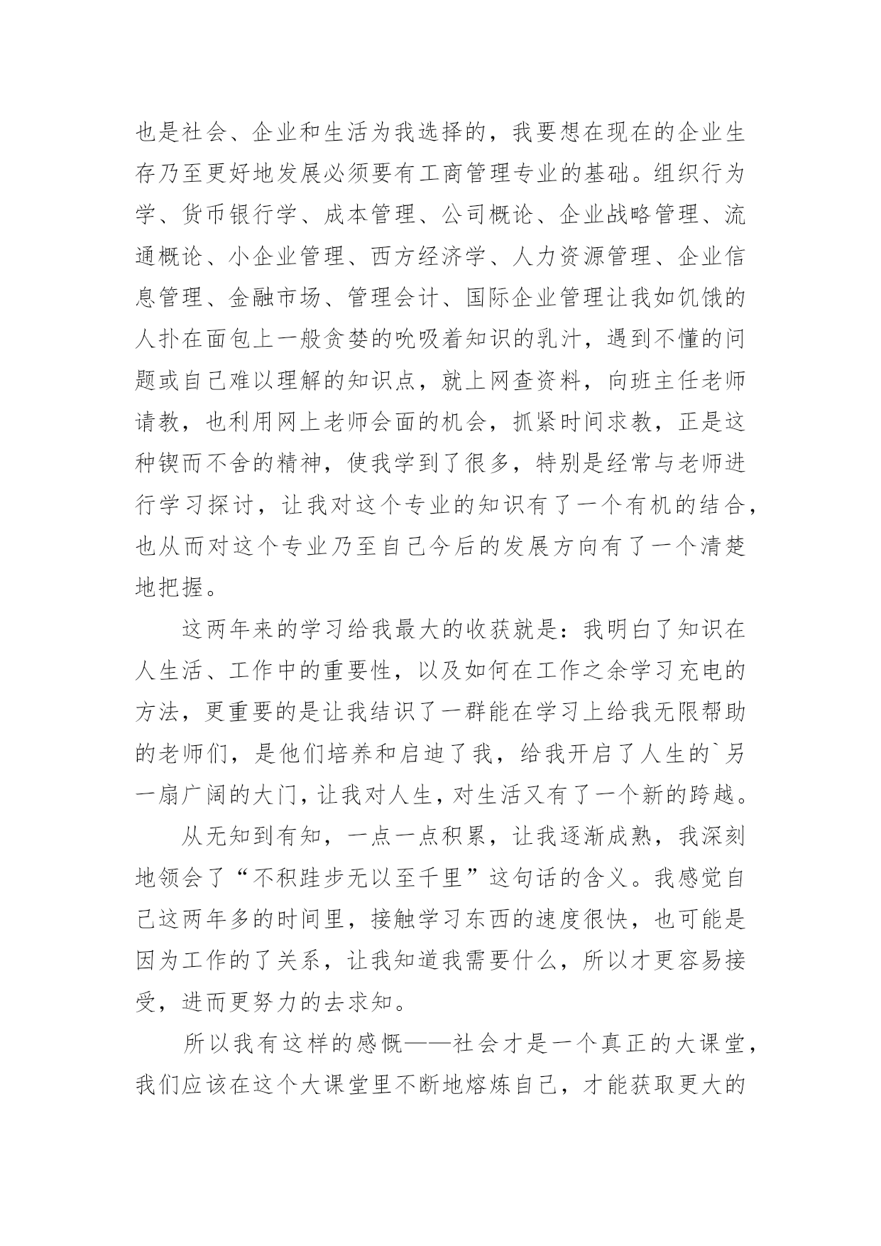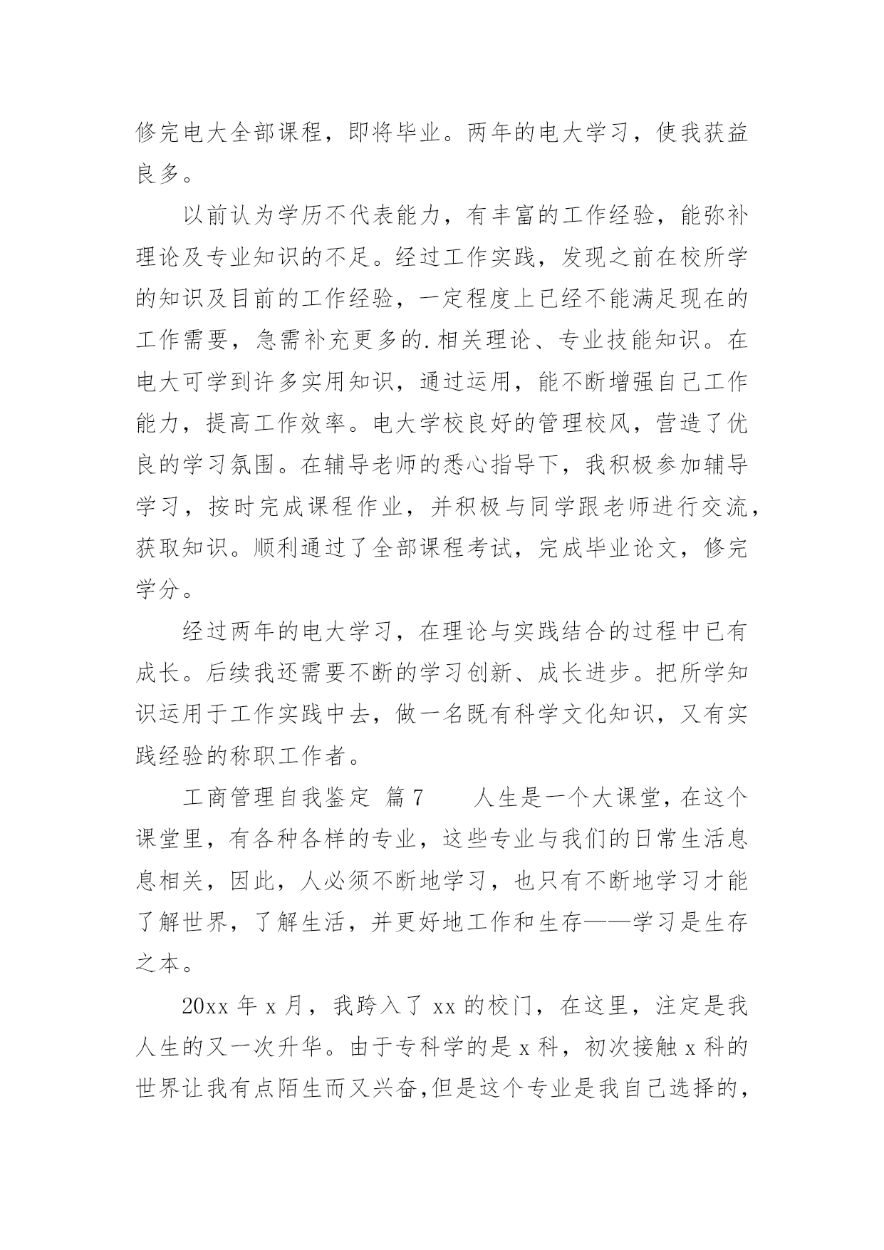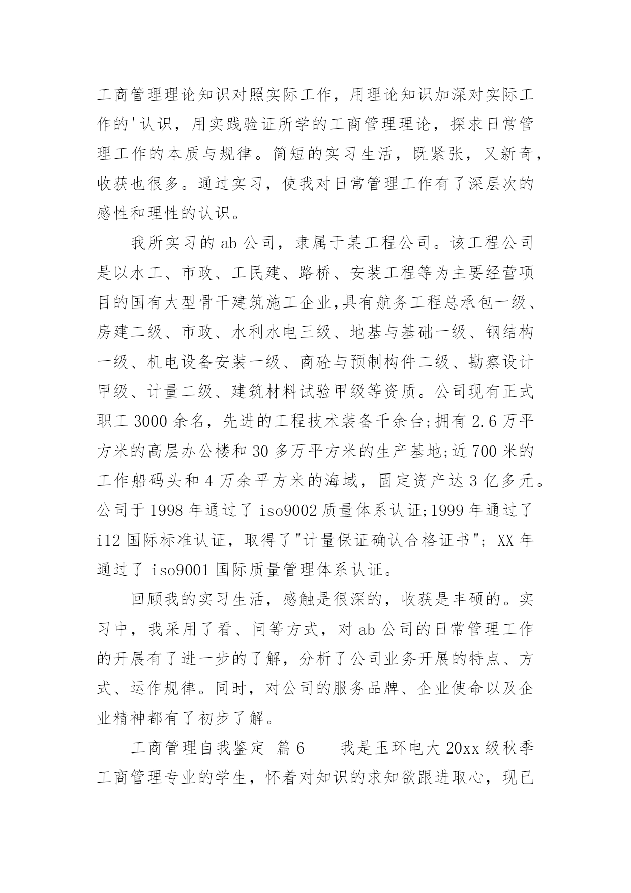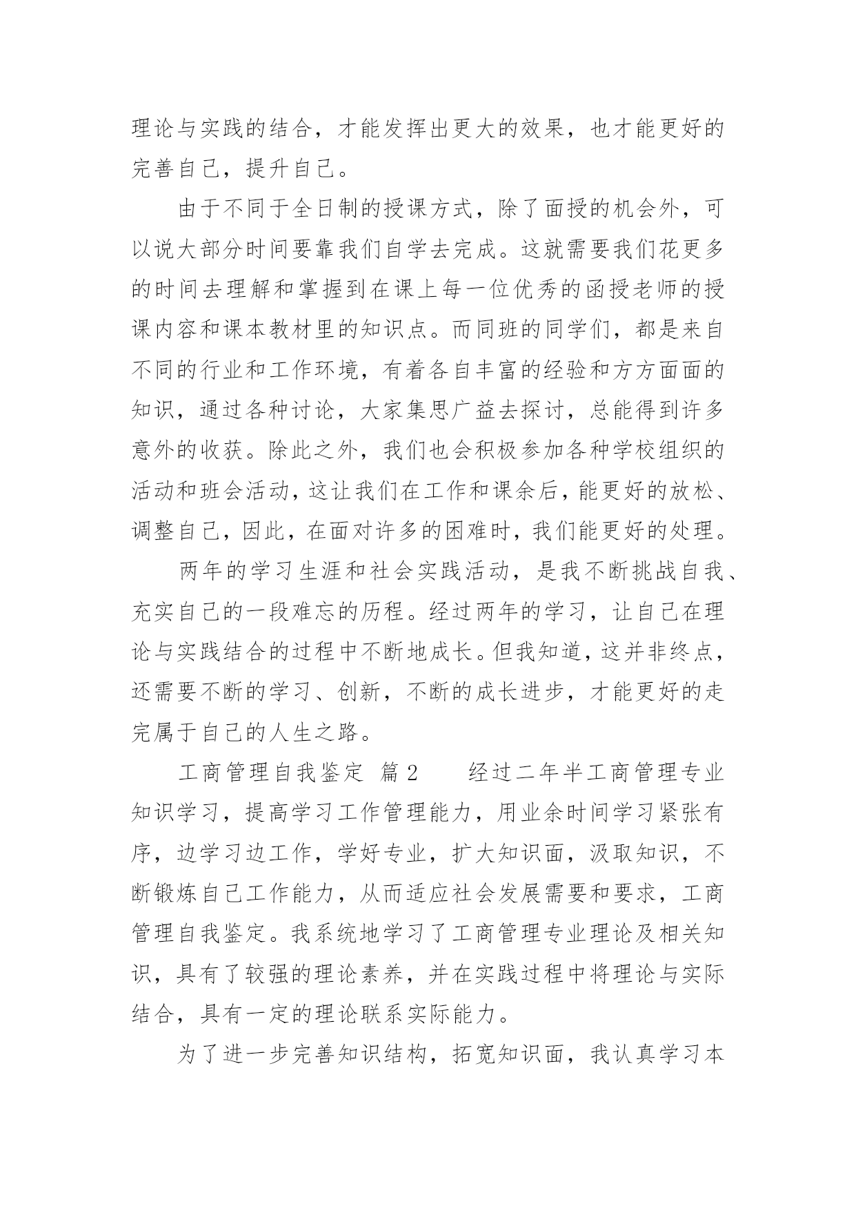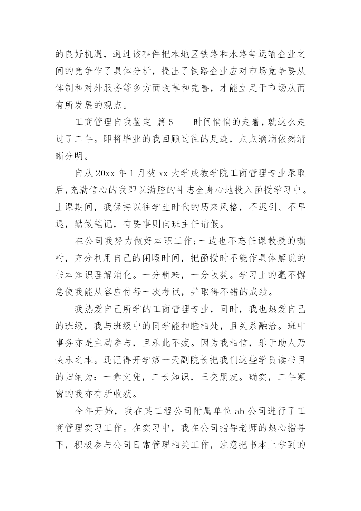 工商管理自我鉴定工商管理自我鉴定集合13篇自我鉴定是对一个阶段的学习或工作进行回顾检查并分析评价,它可以帮助我们有寻找学习和工作中的规律,因此我们是时候写一份自我鉴定了。自我鉴定一般是怎么写的呢?以下是小编整理的工商管理自我鉴定,欢迎大家借鉴与参考,希望对大家有所帮助。工商管理自我鉴定篇1转眼的学习生活已接近尾声,虽然我们都是已经走上工作岗位的学生,不能像全日制学生那样全天候的在校学习、生活,但这种工作→学习→实践,不断重复的学习模式,使我收获匪浅,受益终生。回顾这两年的学习历程,感受颇多。以前一直认为,学历不代表能力,只要有丰富的工作经验,就能弥补理论及专业知识的不足,所以,工作中一直很重视实践所总结出来的经验,再加上不同的工作环境,偶尔也有些小骄傲。虽然平时也有通过阅读增长自己的知识面,但效果似乎一直不大。直到这几年慢慢在工作中沉淀,开始有了自己的小团队,才更清楚的认识到,之前在校所学的知识及工作经验在一定程度上已经不能满足今后的'工作需要,急需补充更多的相关理论、专业技能知识。在参加学习后,更是认识到,通过的学习,能够学到许多理论知识,若将这些知识运用到工作中,可以不断增强工作的办事能力,提高工作效率,为更顺利地完成各项工作创造了良好条件。這樣理论与实践的结合,才能发挥出更大的效果,也才能更好的完善自己,提升自己。由于不同于全日制的授课方式,除了面授的机会外,可以说大部分时间要靠我们自学去完成。这就需要我们花更多的时间去理解和掌握到在课上每一位优秀的函授老师的授课内容和课本教材里的知识点。而同班的同学们,都是来自不同的行业和工作环境,有着各自丰富的经验和方方面面的知识,通过各种讨论,大家集思广益去探讨,总能得到许多意外的收获。除此之外,我们也会积极参加各种学校组织的活动和班会活动,这让我们在工作和课余后,能更好的放松、调整自己,因此,在面对许多的困难时,我们能更好的处理。两年的学习生涯和社会实践活动,是我不断挑战自我、充实自己的一段难忘的历程。经过两年的学习,让自己在理论与实践结合的过程中不断地成长。但我知道,这并非终点,还需要不断的学习、创新,不断的成长进步,才能更好的走完属于自己的人生之路。工商管理自我鉴定篇2经过二年半工商管理专业知识学习,提高学习工作管理能力,用业余时间学习紧张有序,边学习边工作,学好专业,扩大知识面,汲取知识,不断锻炼自己工作能力,从而适应社会发展需要和要求,工商管理自我鉴定。我系统地学习了工商管理专业理论及相关知识,具有了较强的理论素养,并在实践过程中将理论与实际结合,具有一定的理论联系实际能力。为了进一步完善知识结构,拓宽知识面,我认真学习本专业开设课程,努力提高专业理论水平和实践操作技巧,力求理论知识的纵深化。通晓英语,已通过国家四级英语考试,曾参加过英语口语培训。在学校期间主要学习了,《财务管理》,《组织行为学》,《管理学》,《质量管理》,《企业经营管理》,《人力资源管理》,《商务谈判及市场营销》等专业课程。同时在老师的指点下,在知识的熏陶中,在实践的砥砺上,成为了一名品学兼优的本科大学生。通过对专业知识的'系统学习首先具备了扎实的理论-功底和较强的实际业务操作能力,自我鉴定《工商管理自我鉴定》。知识面广,适应工作实践能力较强。二是实践能力,工作实践,企业管理,商务会计等。学习与社会实践联系有较强的协调、工作组织能力提高。三是专业训练及模拟,管理工作流程改造计划,现实工作问题处理。二年半工商管理学习基础课,努力完成学业,取得好的成绩。通过学习在今后实际工作之中,遇到问题能急时针对性的处理,由此锻炼自己独立分析问题和解决问题能力。未来的我将以实际行动去证明自己的能力,考验自己的意志,接受一切新的挑战。经过了近三年的工商管理专业学习,自己在企业管理知识方面得到了很大提高,社会调查报告就是将学到的知识如何用来分析各种实际问题,找到解决问题的办法的一个途径。在调查相关企业时,走访了主管部门,有针对性的提问,收集相关的材料,力求做到准备充分,有的放矢为调查报告内容的准确,翔实打下基矗调查访问的过程同时也锻炼了自己独立分析问题、解决问题的能力,让自己懂得了要了解一个事件的本质,要通过现象看到更多的信息,必须(要全面了解事情的起因经过,当然这也离不开相关单位的配合和指导教师的耐心指导,通过写作调查报告加深了对理论知识的理解,为以后学以致用提供了很好的帮助。由于三峡工程对长江航运的影响,给地处中上游的**铁路分局,提供了一个争取分流水运货物的良好机遇,通过该事件把本地区铁路和水路等运输企业之间的竞争作了具体分析,提出了铁路企业应对市场竞争要从体制和对外服务等多方面改革和完善,才能立足于市场从而有所发展的观点。工商管理自我鉴定篇3妈妈说家里三个孩子最放心的就是我,因为我做事有准备、有把握,上学时,别人