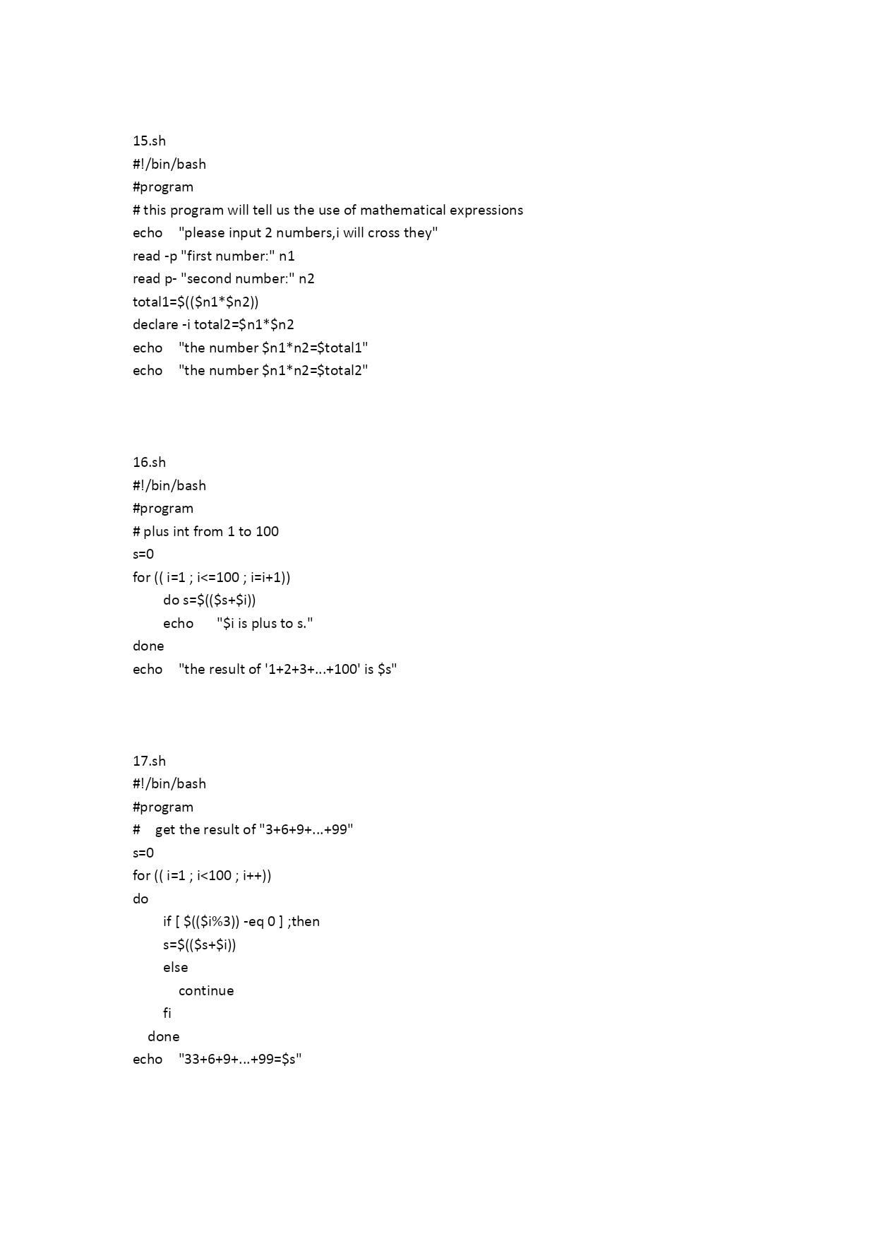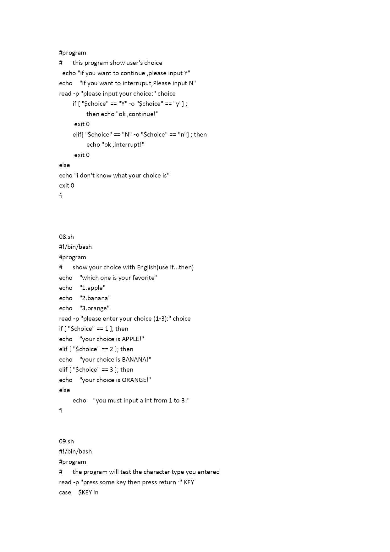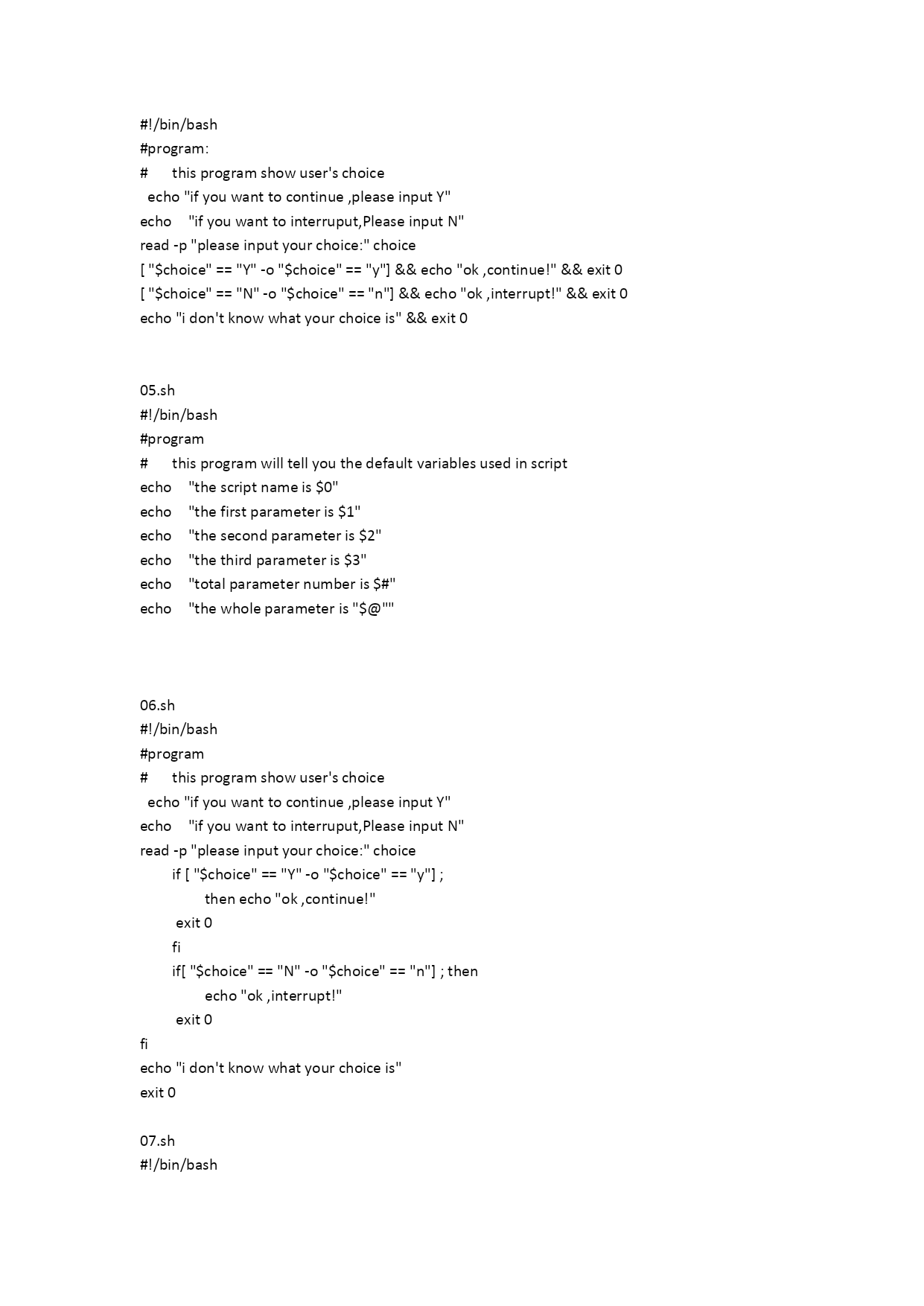 01.sh#!/bin/bash#program#thisprogramshows"Helloeveryone!welcometotheworldofshellscript"inyourscreen#History:#2013/03/25ccfirstreleaseecho"Helloeveryone!"echo"welcometotheworldoftheshellscript!"02.sh#!/bin/bash#program#thisprogramshows"Helloeveryone!welcometotheworldofshellscript"inyourscreen#History:#2013/03/25ccfirstreleaseread-p"pleaseenteryourname:"nameecho"Hello$name,"echo"welcometotheworldofshellscript!"03.sh#!/bin/bash#program:#letuserinputafilename,theprogramwillsearchthefilename#1)exist?2)fileordirectory?3)filepermissions#让用户输入文件名,并且判断用户是否真的有输入字符串echo-e"theprogramwillshowyouthatthefilename'stypeandpermissionwhichyouinput."read-p"inputafilename:"filenametest-z$filename&&echo"youmustinputafilename!"&&exit0#判断文件是否存在,如果不存在则结束脚本test!-e$filename&&echo"thefilewhosenamed$filenameisnotexit"&&exit0#判断是否是普通文件,如果不是则结束脚本test!-f$filename&&echo"thefilenameisnotaregularfile"&&exit0#文件存在且为普通文件,则开始判断文件的属性perm=""test-r$filename&&perm="$perm""&""readable"test-w$filename&&perm="$perm""&""writable"test-x$filename&&perm="$perm""&""executable"#输出判断信息echo"theregular&filename'spermissionis:$perm."04.sh#!/bin/bash#program:#thisprogramshowuser'schoiceecho"ifyouwanttocontinue,pleaseinputY"echo"ifyouwanttointerruput,PleaseinputN"read-p"pleaseinputyourchoice:"choice["$choice"=="Y"-o"$choice"=="y"]&&echo"ok,continue!"&&exit0["$choice"=="N"-o"$choice"=="n"]&&echo"ok,interrupt!"&&exit0echo"idon'tknowwhatyourchoiceis"&&exit005.sh#!/bin/bash#program#thisprogramwilltellyouthedefaultvariablesusedinscriptecho"thescriptnameis$0"echo"thefirstparameteris$1"echo"thesecondparameteris$2"echo"thethirdparameteris$3"echo"totalparameternumberis$#"echo"thewholeparameteris"$@""06.sh#!/bin/bash#program#thisprogramshowuser'schoiceecho"ifyouwanttocontinue,pleaseinputY"echo"ifyouwanttointerruput,PleaseinputN"read-p"pleaseinputyourchoice:"choiceif["$choice"=="Y"-o"$choice"=="y"];thenecho"ok,continue!"exit0fiif["$choice"==