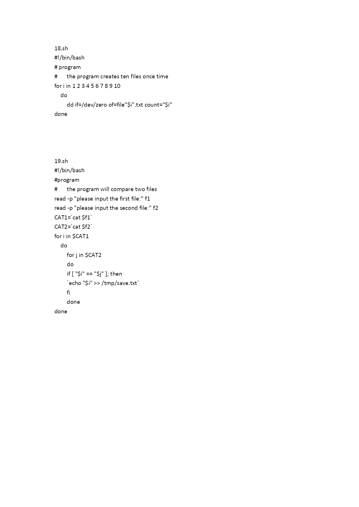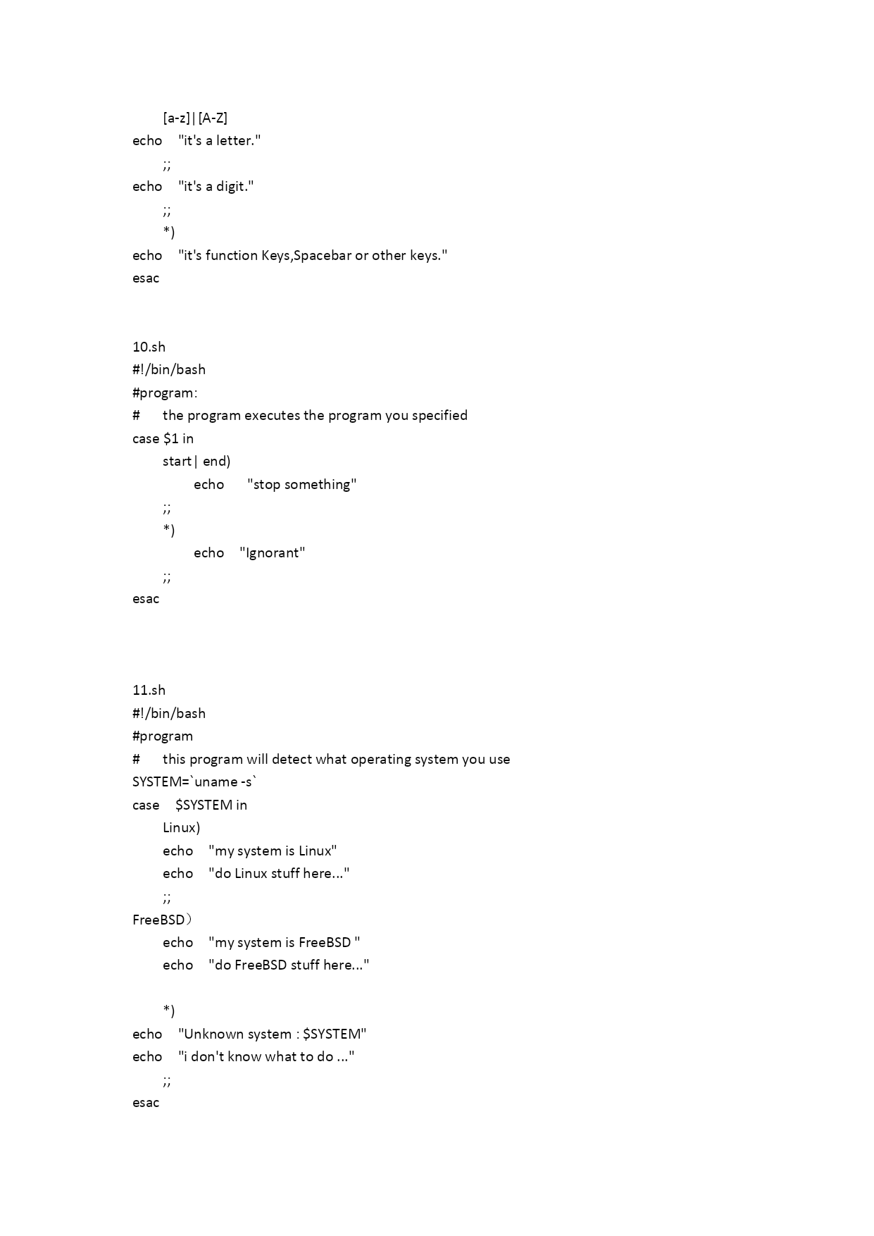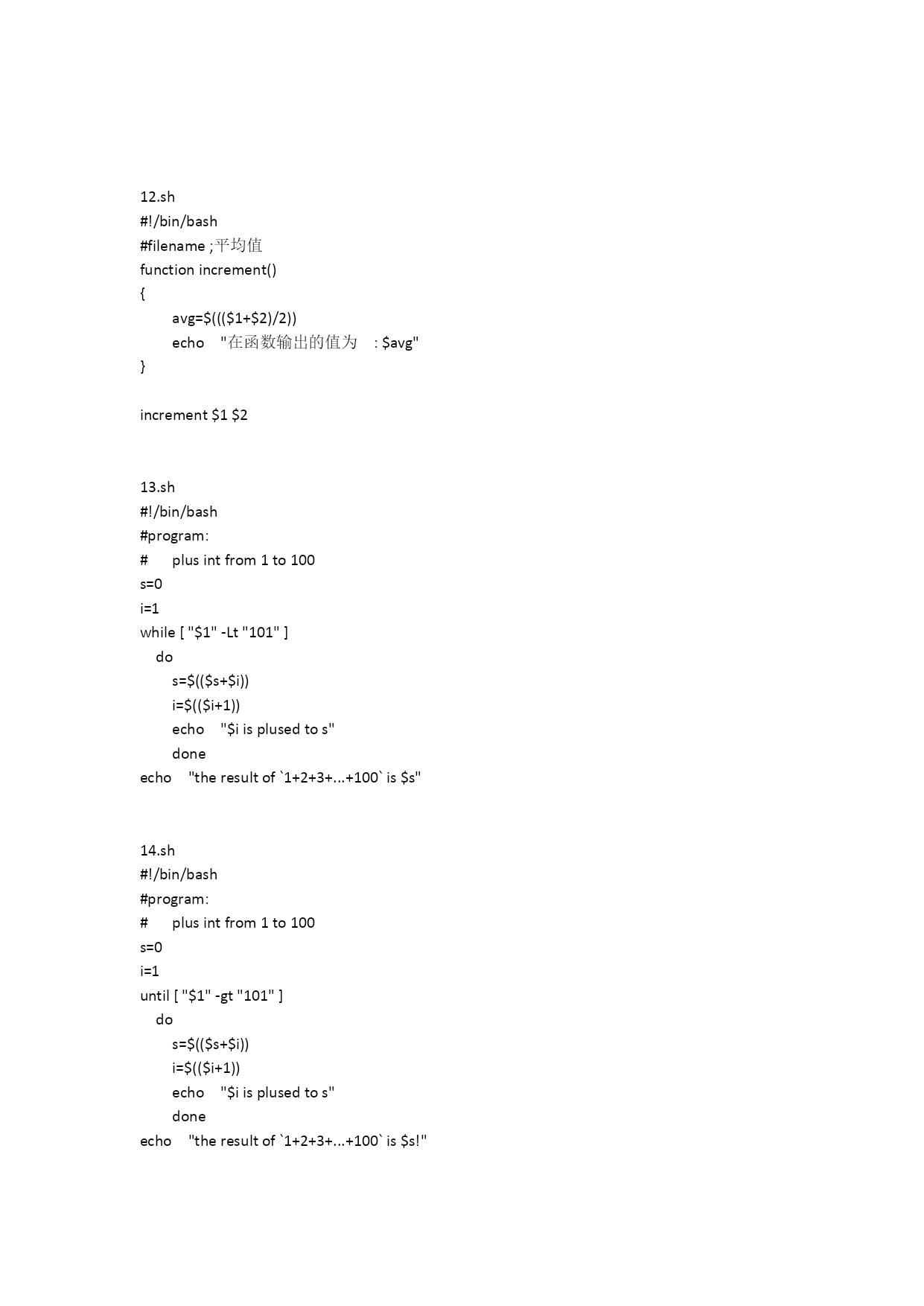 01.sh#!/bin/bash#program#thisprogramshows"Helloeveryone!welcometotheworldofshellscript"inyourscreen#History:#2013/03/25ccfirstreleaseecho"Helloeveryone!"echo"welcometotheworldoftheshellscript!"02.sh#!/bin/bash#program#thisprogramshows"Helloeveryone!welcometotheworldofshellscript"inyourscreen#History:#2013/03/25ccfirstreleaseread-p"pleaseenteryourname:"nameecho"Hello$name,"echo"welcometotheworldofshellscript!"03.sh#!/bin/bash#program:#letuserinputafilename,theprogramwillsearchthefilename#1)exist?2)fileordirectory?3)filepermissions#让用户输入文件名,并且判断用户是否真的有输入字符串echo-e"theprogramwillshowyouthatthefilename'stypeandpermissionwhichyouinput."read-p"inputafilename:"filenametest-z$filename&&echo"youmustinputafilename!"&&exit0#判断文件是否存在,如果不存在则结束脚本test!-e$filename&&echo"thefilewhosenamed$filenameisnotexit"&&exit0#判断是否是普通文件,如果不是则结束脚本test!-f$filename&&echo"thefilenameisnotaregularfile"&&exit0#文件存在且为普通文件,则开始判断文件的属性perm=""test-r$filename&&perm="$perm""&""readable"test-w$filename&&perm="$perm""&""writable"test-x$filename&&perm="$perm""&""executable"#输出判断信息echo"theregular&filename'spermissionis:$perm."04.sh#!/bin/bash#program:#thisprogramshowuser'schoiceecho"ifyouwanttocontinue,pleaseinputY"echo"ifyouwanttointerruput,PleaseinputN"read-p"pleaseinputyourchoice:"choice["$choice"=="Y"-o"$choice"=="y"]&&echo"ok,continue!"&&exit0["$choice"=="N"-o"$choice"=="n"]&&echo"ok,interrupt!"&&exit0echo"idon'tknowwhatyourchoiceis"&&exit005.sh#!/bin/bash#program#thisprogramwilltellyouthedefaultvariablesusedinscriptecho"thescriptnameis$0"echo"thefirstparameteris$1"echo"thesecondparameteris$2"echo"thethirdparameteris$3"echo"totalparameternumberis$#"echo"thewholeparameteris"$@""06.sh#!/bin/bash#program#thisprogramshowuser'schoiceecho"ifyouwanttocontinue,pleaseinputY"echo"ifyouwanttointerruput,PleaseinputN"read-p"pleaseinputyourchoice:"choiceif["$choice"=="Y"-o"$choice"=="y"];thenecho"ok,continue!"exit0fiif["$choice"==