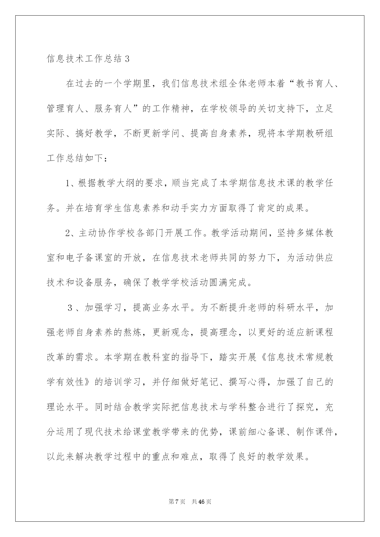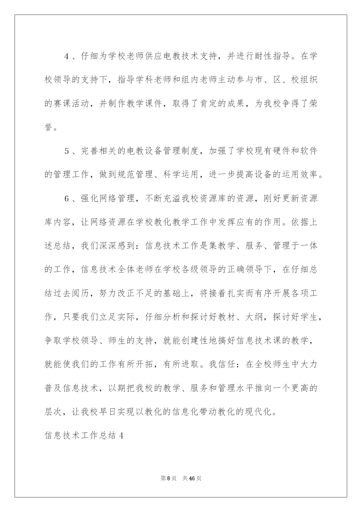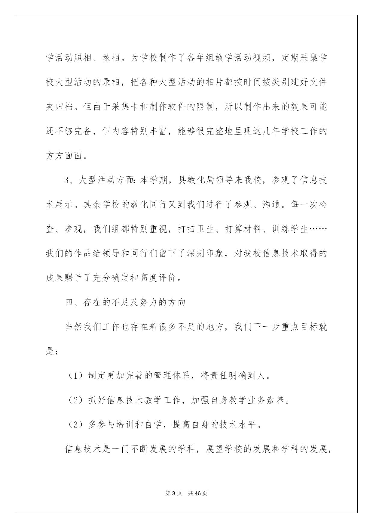第PAGE\*Arabic\*MERGEFORMAT46页共NUMPAGES\*Arabic\*MERGEFORMAT46页第PAGE\*MERGEFORMAT46页共NUMPAGES\*MERGEFORMAT46页第PAGE\*MERGEFORMAT46页共NUMPAGES\*MERGEFORMAT46页第PAGE\*MERGEFORMAT46页共NUMPAGES\*MERGEFORMAT46页第PAGE\*MERGEFORMAT46页共NUMPAGES\*MERGEFORMAT46页第PAGE\*MERGEFORMAT46页共NUMPAGES\*MERGEFORMAT46页第PAGE\*MERGEFORMAT46页共NUMPAGES\*MERGEFORMAT46页第PAGE\*MERGEFORMAT46页共NUMPAGES\*MERGEFORMAT46页第PAGE\*MERGEFORMAT46页共NUMPAGES\*MERGEFORMAT46页第PAGE\*MERGEFORMAT46页共NUMPAGES\*MERGEFORMAT46页第PAGE\*MERGEFORMAT46页共NUMPAGES\*MERGEFORMAT46页2022信息技术工作总结信息技术工作总结总结是事后对某一时期、某一项目或某些工作进行回顾和分析,从而做出带有规律性的结论,它可以帮助我们总结以往思想,发扬成果,因此我们要做好归纳,写好总结。那么你知道总结如何写吗?下面是我帮大家整理的信息技术工作总结,仅供参考,希望能够帮助到大家。信息技术工作总结1本学期在领导的指导下,信息技术中心紧紧围绕学校工作的总体要求,全体信息技术老师共同努力,树立服务、创新意识,主动努力,扎实工作。较好地完成了学期初制订的各项工作任务,现对一学期来的工作总结如下:一、教化教学工作学校严格执行课程安排。信息技术课老师能针对学生特点开展教学活动,不断探究、提高信息技术课教学质量。充分利用学生对电脑学习的爱好开展教学,课堂教学生动活泼、教学效果明显;努力培育学生计算机应用实力,使学生能运用现代教化技术解决实际问题,从而激发爱好,增加科技意识,提高创新、实践实力。主任和组长开学初听了每位微机老师一节课,并对每个人的课进行了总结和评价。检查老师备课、指导学生操作等状况,促使学校信息技术课教学朝着正规化、高效率方向发展。一月末,在惊慌打算全国远程教化检查信息技术展示活动时,全组老师又接到了往进修资源库上传资源的通知,通过细心设计,上网搜集、借鉴好的教学设计,把一节节精品教学设计上传到了资源库中。二、小组活动方面我们每老师带一个小组。在做好常规工作的同时,利用间操、午休、大课间及学生科任课时间对学生进行辅导,还要构思每个作品的创作思想,参赛心得等,并制作成演示文稿。我校上报的作品分获市、县一二三等奖。三、其他活动成长历练的天地1、网站建设方面:校内报道和每周工作做到刚好更新,定期审核校内频道和教学频道。2、视频制作方面:本学期我们组接着为学校的大型活动和教化教学活动照相、录相。为学校制作了各年组教学活动视频,定期采集学校大型活动的录相,把各种大型活动的相片都按时间按类别建好文件夹归档。但由于采集卡和制作软件的限制,所以制作出来的效果可能还不够完备,但内容特别丰富,能够很完整地呈现这几年学校工作的方方面面。3、大型活动方面:本学期,县教化局领导来我校,参观了信息技术展示。其余学校的教化同行又到我们进行了参观、沟通。每一次检查、参观,我们组都特别重视,打扫卫生、打算材料、训练学生……我们的作品给领导和同行们留下了深刻印象,对我校信息技术取得的成果赐予了充分确定和高度评价。四、存在的不足及努力的方向当然我们工作也存在着很多不足的地方,我们下一步重点目标就是:(1)制定更加完善的管理体系,将责任明确到人。(2)抓好信息技术教学工作,加强自身教学业务素养。(3)多参与培训和自学,提高自身的技术水平。信息技术是一门不断发展的学科,展望学校的发展和学科的发展,我们还有很多学问要学,还有很多事情要做。将来将进接着努力学习专业学问,提高自身修养,做一名学者型老师。使自身的思想品质、业务水平、教学实力得以提高和升华。信息技术工作总结2自从任教三年以来,我首先在师德上严格要求自我,要做一个合格的人民老师!与时俱进,爱岗敬业,为人师表,酷爱学生,敬重学生,争取让每个学生都能享受到最好的教化,都能有不一样程度的发展。三年来,踌躇满志的应届毕业生,在工作的励练下及各位领导、各位老师的帮忙下,我更加感觉到当老师的华蜜感与乐趣。“做一名好老师”是很多老师一生追求的目标