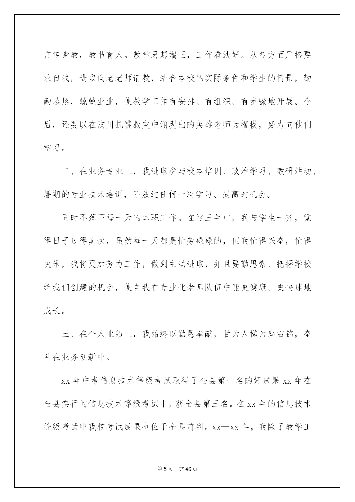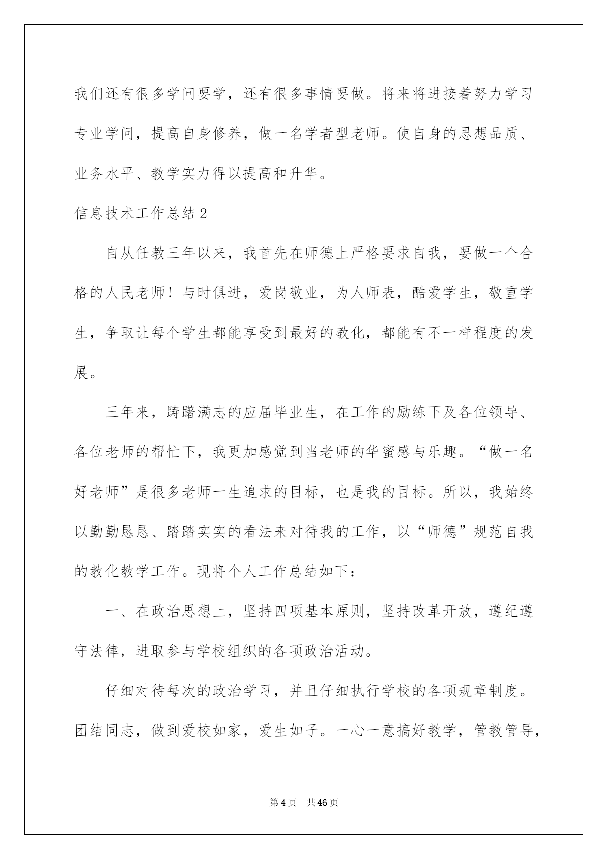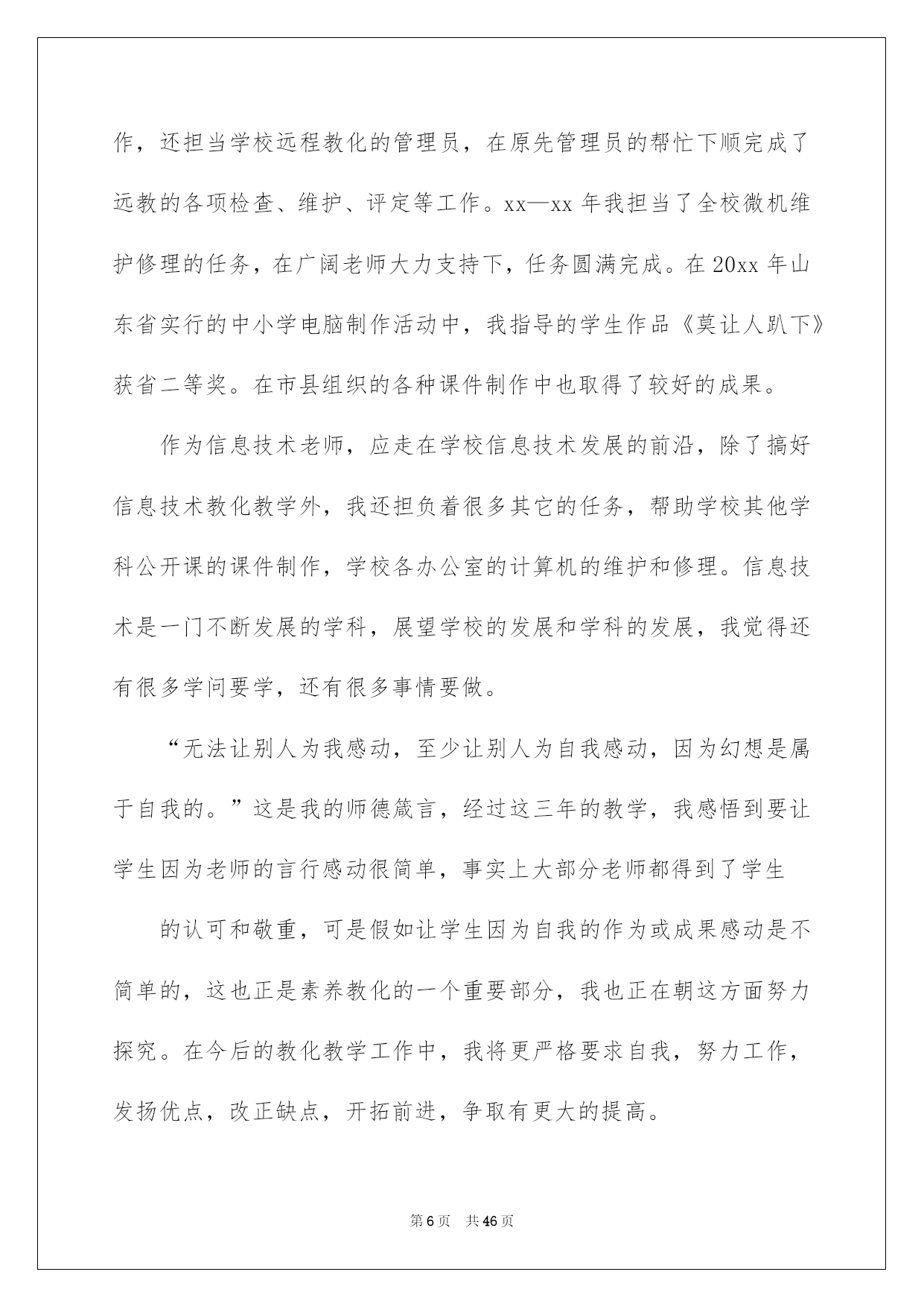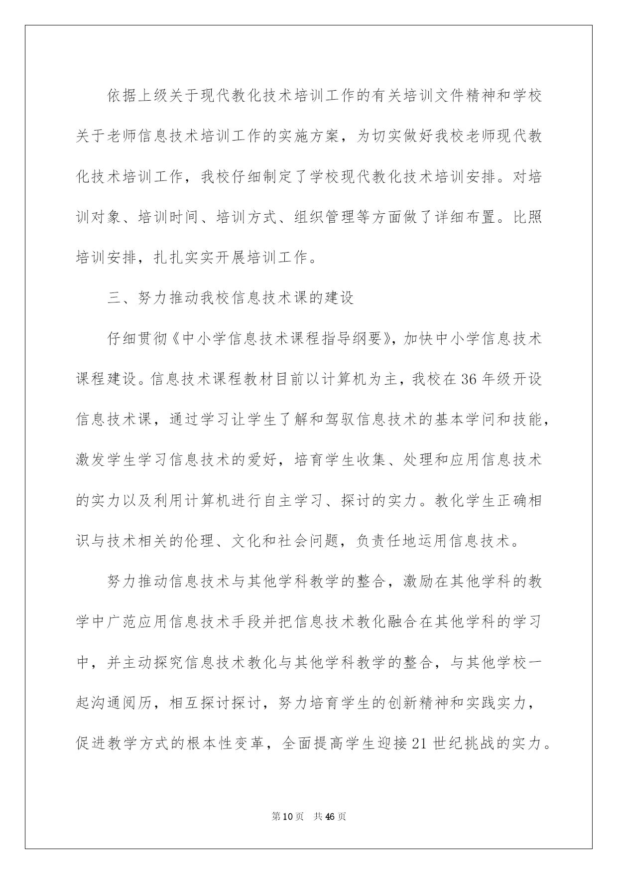 第PAGE\*Arabic\*MERGEFORMAT46页共NUMPAGES\*Arabic\*MERGEFORMAT46页第PAGE\*MERGEFORMAT46页共NUMPAGES\*MERGEFORMAT46页第PAGE\*MERGEFORMAT46页共NUMPAGES\*MERGEFORMAT46页第PAGE\*MERGEFORMAT46页共NUMPAGES\*MERGEFORMAT46页第PAGE\*MERGEFORMAT46页共NUMPAGES\*MERGEFORMAT46页第PAGE\*MERGEFORMAT46页共NUMPAGES\*MERGEFORMAT46页第PAGE\*MERGEFORMAT46页共NUMPAGES\*MERGEFORMAT46页第PAGE\*MERGEFORMAT46页共NUMPAGES\*MERGEFORMAT46页第PAGE\*MERGEFORMAT46页共NUMPAGES\*MERGEFORMAT46页第PAGE\*MERGEFORMAT46页共NUMPAGES\*MERGEFORMAT46页第PAGE\*MERGEFORMAT46页共NUMPAGES\*MERGEFORMAT46页2022信息技术工作总结信息技术工作总结总结是事后对某一时期、某一项目或某些工作进行回顾和分析,从而做出带有规律性的结论,它可以帮助我们总结以往思想,发扬成果,因此我们要做好归纳,写好总结。那么你知道总结如何写吗?下面是我帮大家整理的信息技术工作总结,仅供参考,希望能够帮助到大家。信息技术工作总结1本学期在领导的指导下,信息技术中心紧紧围绕学校工作的总体要求,全体信息技术老师共同努力,树立服务、创新意识,主动努力,扎实工作。较好地完成了学期初制订的各项工作任务,现对一学期来的工作总结如下:一、教化教学工作学校严格执行课程安排。信息技术课老师能针对学生特点开展教学活动,不断探究、提高信息技术课教学质量。充分利用学生对电脑学习的爱好开展教学,课堂教学生动活泼、教学效果明显;努力培育学生计算机应用实力,使学生能运用现代教化技术解决实际问题,从而激发爱好,增加科技意识,提高创新、实践实力。主任和组长开学初听了每位微机老师一节课,并对每个人的课进行了总结和评价。检查老师备课、指导学生操作等状况,促使学校信息技术课教学朝着正规化、高效率方向发展。一月末,在惊慌打算全国远程教化检查信息技术展示活动时,全组老师又接到了往进修资源库上传资源的通知,通过细心设计,上网搜集、借鉴好的教学设计,把一节节精品教学设计上传到了资源库中。二、小组活动方面我们每老师带一个小组。在做好常规工作的同时,利用间操、午休、大课间及学生科任课时间对学生进行辅导,还要构思每个作品的创作思想,参赛心得等,并制作成演示文稿。我校上报的作品分获市、县一二三等奖。三、其他活动成长历练的天地1、网站建设方面:校内报道和每周工作做到刚好更新,定期审核校内频道和教学频道。2、视频制作方面:本学期我们组接着为学校的大型活动和教化教学活动照相、录相。为学校制作了各年组教学活动视频,定期采集学校大型活动的录相,把各种大型活动的相片都按时间按类别建好文件夹归档。但由于采集卡和制作软件的限制,所以制作出来的效果可能还不够完备,但内容特别丰富,能够很完整地呈现这几年学校工作的方方面面。3、大型活动方面:本学期,县教化局领导来我校,参观了信息技术展示。其余学校的教化同行又到我们进行了参观、沟通。每一次检查、参观,我们组都特别重视,打扫卫生、打算材料、训练学生……我们的作品给领导和同行们留下了深刻印象,对我校信息技术取得的成果赐予了充分确定和高度评价。四、存在的不足及努力的方向当然我们工作也存在着很多不足的地方,我们下一步重点目标就是:(1)制定更加完善的管理体系,将责任明确到人。(2)抓好信息技术教学工作,加强自身教学业务素养。(3)多参与培训和自学,提高自身的技术水平。信息技术是一门不断发展的学科,展望学校的发展和学科的发展,我们还有很多学问要学,还有很多事情要做。将来将进接着努力学习专业学问,提高自身修养,做一名学者型老师。使自身的思想品质、业务水平、教学实力得以提高和升华。信息技术工作总结2自从任教三年以来,我首先在师德上严格要求自我,要做一个合格的人民老师!与时俱进,爱岗敬业,为人师表,酷爱学生,敬重学生,争取让每个学生都能享受到最好的教化,都能有不一样程度的发展。三年来,踌躇满志的应届毕业生,在工作的励练下及各位领导、各位老师的帮忙下,我更加感觉到当老师的华蜜感与乐趣。“做一名好老师”是很多老师一生追求的目标
