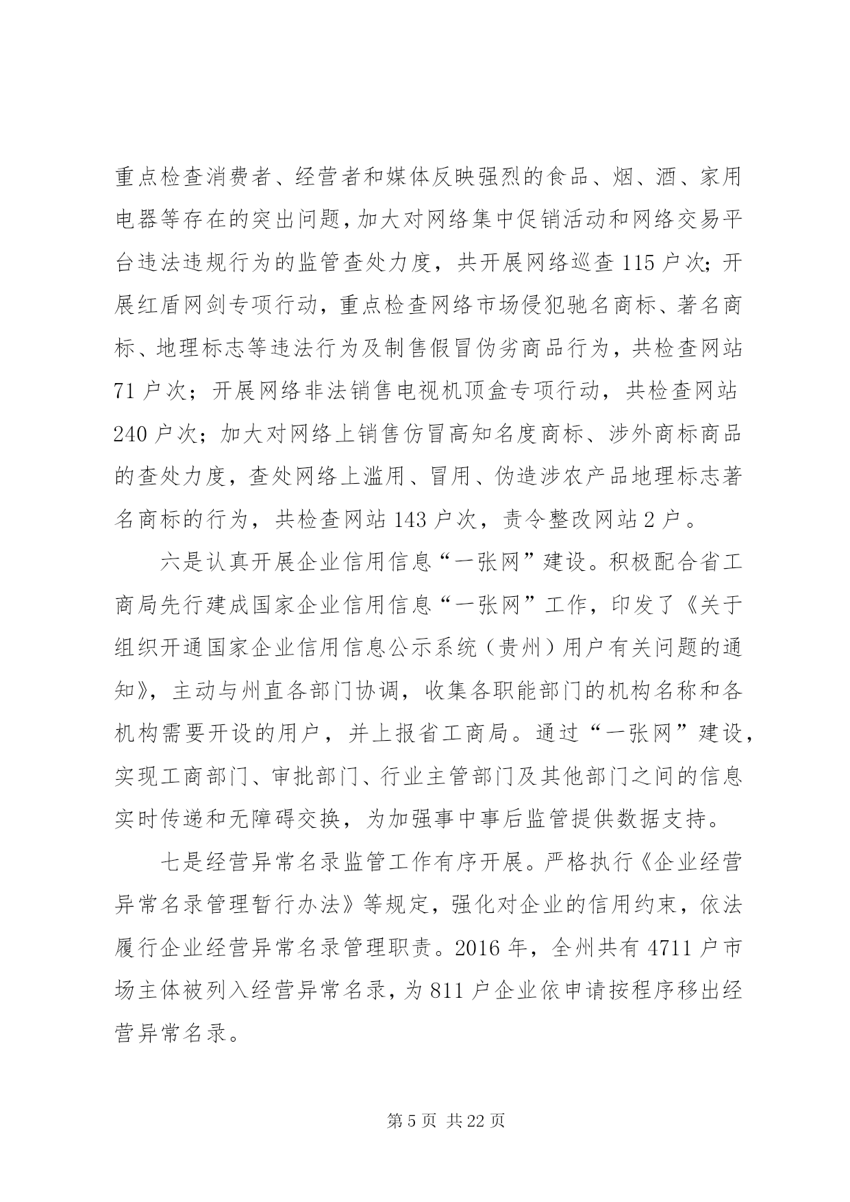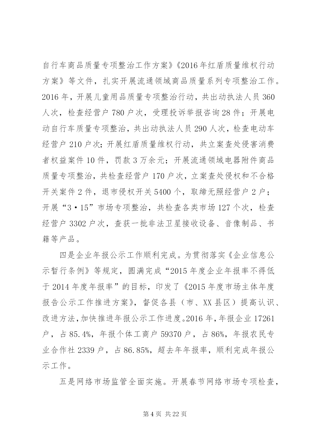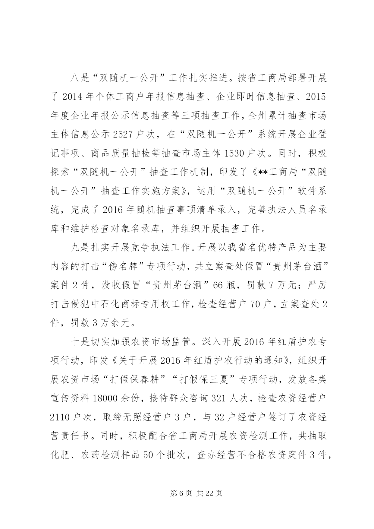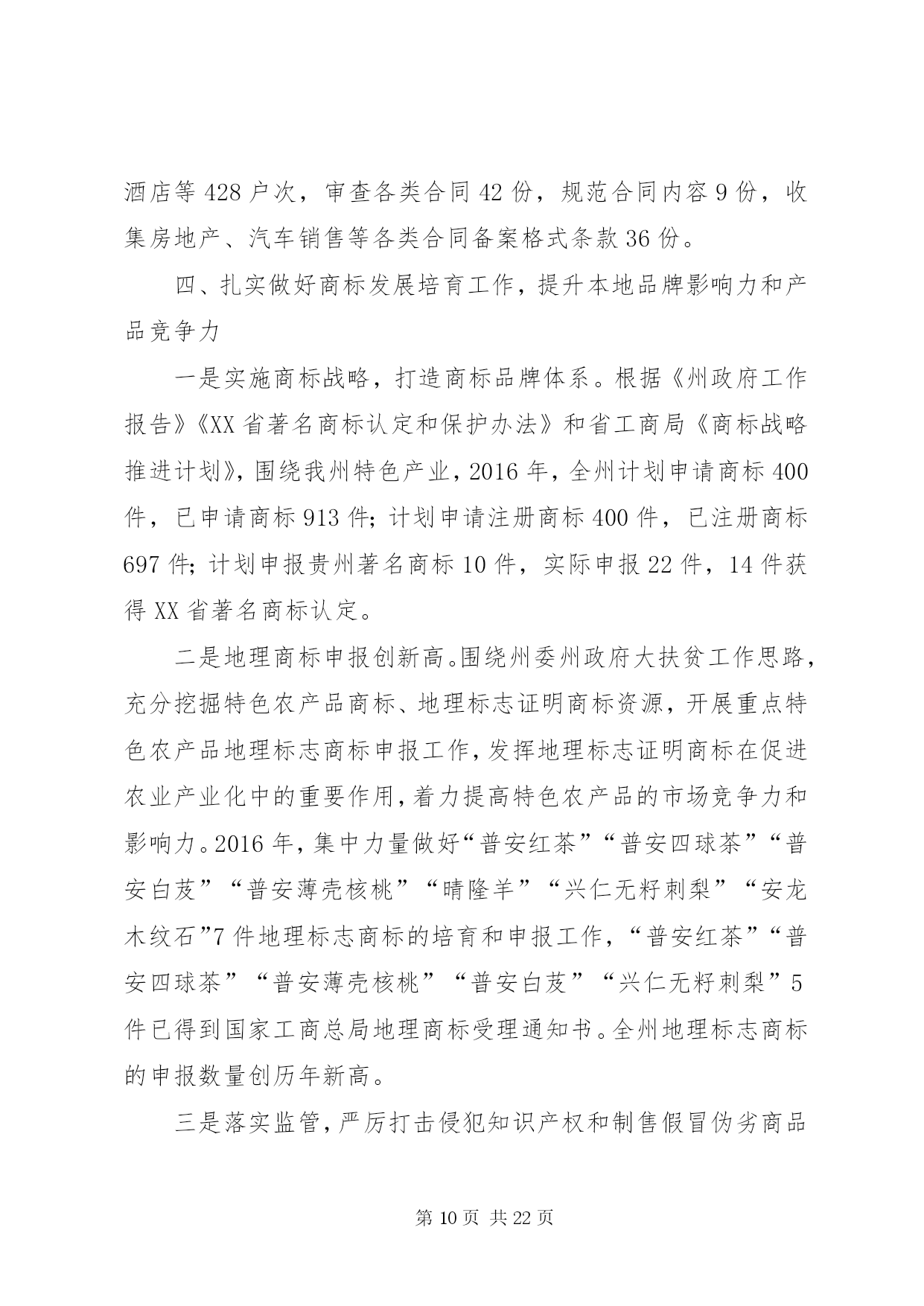 第PAGE\*Arabic\*MERGEFORMAT22页共NUMPAGES\*MERGEFORMAT22页工商局全年工作总结2016年,在州委州政府的坚强领导下,在省工商局的正确指导下,州工商局深入贯彻省州“两会”和全省工商行政管理工作会议精神,协调推进“四个全面”战略布局,贯彻落实五大发展理念,围绕州委“1+3+3”发展体系,着力营造宽松平等的准入环境、公平竞争的市场环境、安全放心的消费环境,全力推动“守底线、走新路、奔小康”工作迈上新台阶,取得新成效。一、深入推进商事登记制度改革,着力构建宽松平等的准入环境一是全面实施“五证合一、一照一码”改革。认真贯彻执行国务院和省政府有关“五证合一、一照一码”登记制度改革政策,在“三证合一、一照一码”改革的基础上,提请以州政府办名义下发《关于实施“五证合一、一照一码”登记制度改革的通知》,10月1日,与全国全省同步启动实施“五证合一、一照一码”登记制度改革,整合社会保险登记证和统计登记证,由工商行政管理部门核发加载法人和其他组织统一社会信用代码的营业执照。2016年,全州共办理“三证合一、一照一码”营业执照5946户,从10月1日至12月25日,新办理登记“五证合一、一照一码”营业执照2226户。二是启动实施个体工商户“两证整合”改革。根据国家工商总局和省工商局的安排部署,联合州国税局、州地税局、州发改委、州政府法制办印发了《关于转发省工商局等四部门转发的通知》,12月1日,与全国全省同步启动个体工商户“两证整合”改革,整合个体工商户营业执照和税务登记证,实现只需填写“一张表”、向“一个窗口”提交“一套材料”即可办理工商及税务登记。三是深入推进“先照后证”改革。按照国务院、省政府“先照后证”改革的要求,全面清理商事登记前置、后置审批事项,严格执行《XX省工商登记后置审批事项目录公告(第一批)》和《工商总局关于调整工商登记前置审批事项目录的通知》文件要求,主动通过**工商局政府门户网站公开《工商登记前置审批事项目录》和《企业变更登记、注销登记前置审批指导目录》。截至12月25日,全州共办理“先照后证”市场主体登记18654户,其中企业3917户,个体工商户14737户。四是全面深化登记注册便利化改革。充分利用“XX省工商局网上办事大厅”平台,推行网上申请、网上受理、网上审核、网上公示、网上发照等全程电子化登记管理方式,将“XX省工商行政管理网上办事大厅操作步骤”公示在**工商局政府门户网站,企业可在网上办理名称核准和注册登记等事项,实现企业登记管理信息化、便利化、规范化。通过推进商事制度改革,全州市场持续快速发展。截至12月25日,全州新增市场主体28615户,市场主体共发展到152661户,注册资金2167.8亿元,同比分别增长14.52%、102.37%,平均每天新增市场主体79户。二、加强事中事后监管,着力维护公平竞争的市场秩序一是“无传销城市”创建工作成效显著。制定《2016年创建无传销城市考评实施细则》和《关于进一步做好打击传销规范直销工作的通知》,大力推进“无传销城市”创建工作。共出动执法人员417人次,取缔传销窝点28个,抓获涉案人员108人,遣返32人,解救4人,移送司法机关4人。2016年6月,**被省打传联席办认定为XX省“无传销市(州)”。二是“守合同重信用”工作成果丰硕。深入开展“守合同重信用”申报复核工作,推行国家级、省级企业“守合同重信用”网上申报。组织各县(市、XX县区)市场监管局对今年复核、新申的州级“守合同重信用”企业进行审查,重点审查申报企业是否参加并完成2015年度企业信息年报公示、是否进入法院“失信被执行人”的“黑名单”系统。2016年,获得国家级“守合同重信用”企业5户,其中新申报获得1户,连续申报获得4户;获得省级“守合同重信用”企业112户,其中新申报获得31户,连续申报获得81户;获得州级“守合同重信用”企业157户,其中新申报获得59户,连续申报获得98户。三是认真开展流通领域商品质量整治。制定《2016年**流通领域儿童用品质量专项整治工作方案》《2016年流通领域电动自行车商品质量专项整治工作方案》《2016年红盾质量维权行动方案》等文件,扎实开展流通领域商品质量系列专项整治工作。2016年,开展儿童用品质量专项整治行动,共出动执法人员360人次,检查经营户780户次,受理投诉举报咨询28件;开展电动自行车质量专项整治,共出动执法人员290人次,检查电动车经营户210户次;开展红盾质量维权行动,共立案查处侵害消费者权益案件10件,罚款3万余元;开展流通领域电器附件商品质量专项整治,共检查经营户170户次,立案查处侵权和不合格开关案件2件,退市侵权开关5400个,取缔无照经营户2户;开展“3·15”市场专项整