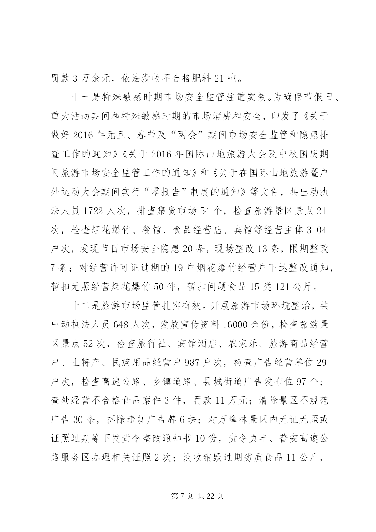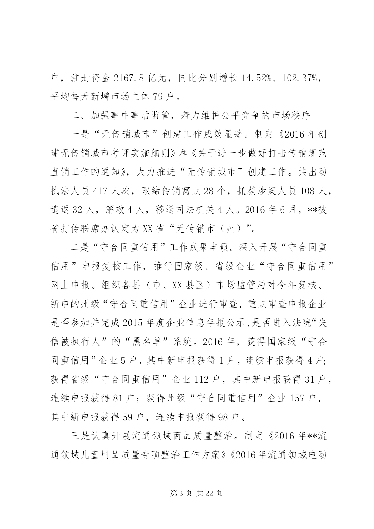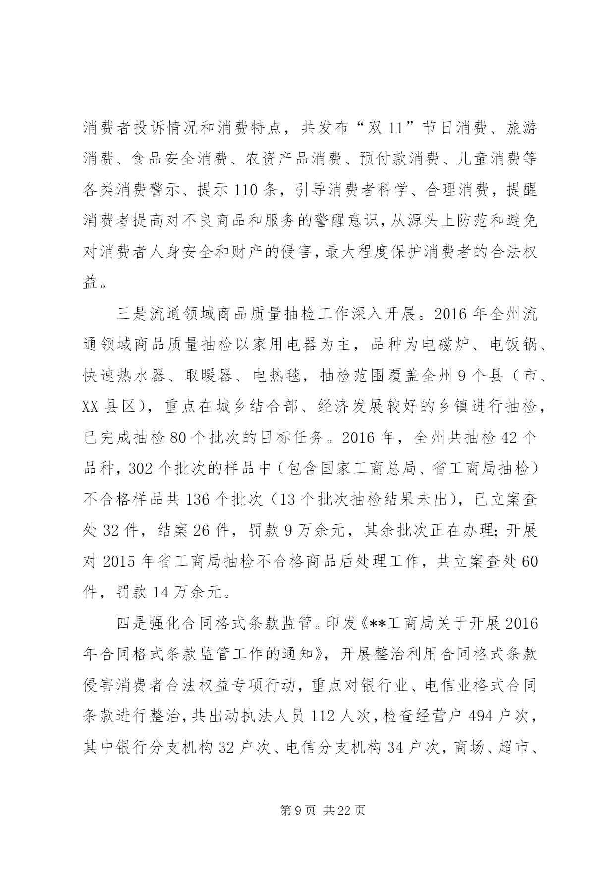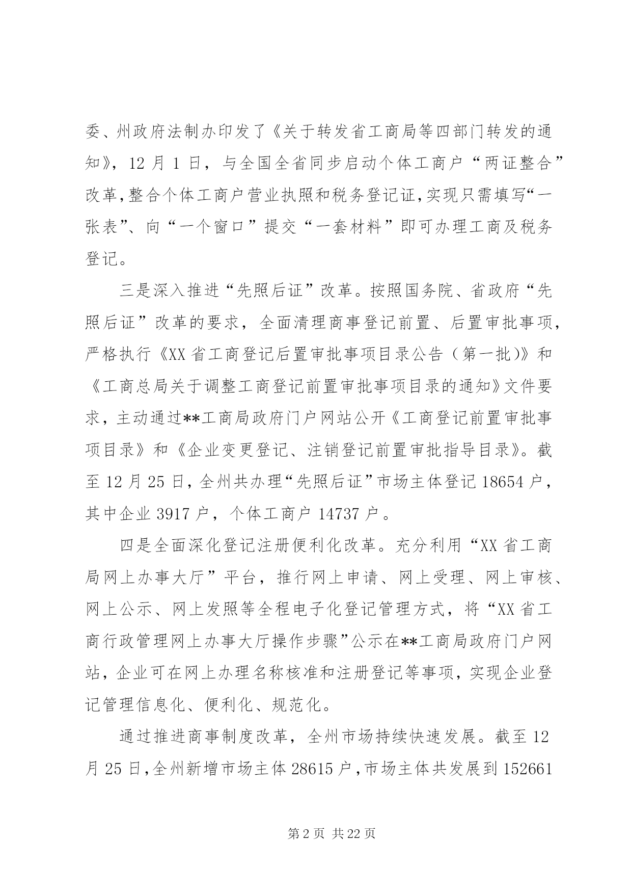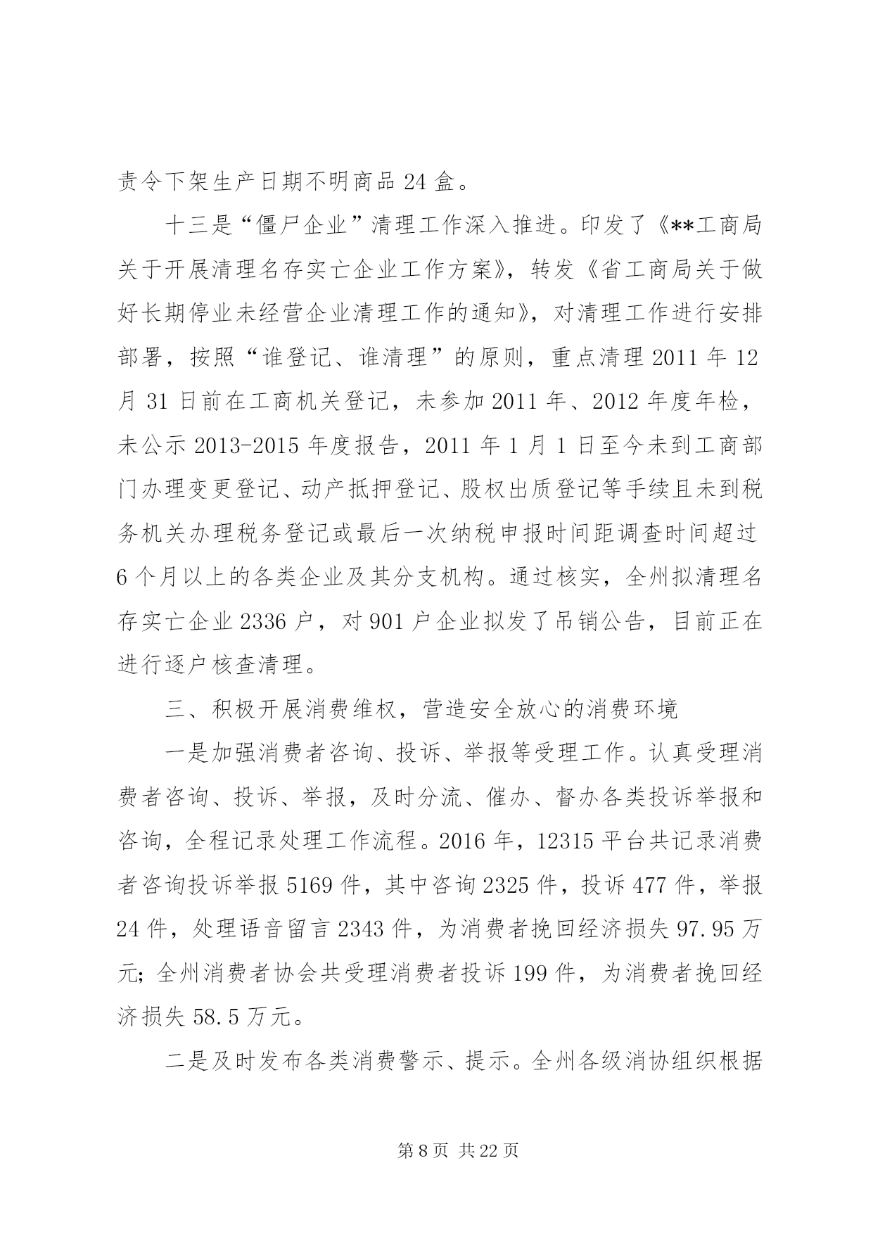 第PAGE\*Arabic\*MERGEFORMAT22页共NUMPAGES\*MERGEFORMAT22页工商局全年工作总结2016年,在州委州政府的坚强领导下,在省工商局的正确指导下,州工商局深入贯彻省州“两会”和全省工商行政管理工作会议精神,协调推进“四个全面”战略布局,贯彻落实五大发展理念,围绕州委“1+3+3”发展体系,着力营造宽松平等的准入环境、公平竞争的市场环境、安全放心的消费环境,全力推动“守底线、走新路、奔小康”工作迈上新台阶,取得新成效。一、深入推进商事登记制度改革,着力构建宽松平等的准入环境一是全面实施“五证合一、一照一码”改革。认真贯彻执行国务院和省政府有关“五证合一、一照一码”登记制度改革政策,在“三证合一、一照一码”改革的基础上,提请以州政府办名义下发《关于实施“五证合一、一照一码”登记制度改革的通知》,10月1日,与全国全省同步启动实施“五证合一、一照一码”登记制度改革,整合社会保险登记证和统计登记证,由工商行政管理部门核发加载法人和其他组织统一社会信用代码的营业执照。2016年,全州共办理“三证合一、一照一码”营业执照5946户,从10月1日至12月25日,新办理登记“五证合一、一照一码”营业执照2226户。二是启动实施个体工商户“两证整合”改革。根据国家工商总局和省工商局的安排部署,联合州国税局、州地税局、州发改委、州政府法制办印发了《关于转发省工商局等四部门转发的通知》,12月1日,与全国全省同步启动个体工商户“两证整合”改革,整合个体工商户营业执照和税务登记证,实现只需填写“一张表”、向“一个窗口”提交“一套材料”即可办理工商及税务登记。三是深入推进“先照后证”改革。按照国务院、省政府“先照后证”改革的要求,全面清理商事登记前置、后置审批事项,严格执行《XX省工商登记后置审批事项目录公告(第一批)》和《工商总局关于调整工商登记前置审批事项目录的通知》文件要求,主动通过**工商局政府门户网站公开《工商登记前置审批事项目录》和《企业变更登记、注销登记前置审批指导目录》。截至12月25日,全州共办理“先照后证”市场主体登记18654户,其中企业3917户,个体工商户14737户。四是全面深化登记注册便利化改革。充分利用“XX省工商局网上办事大厅”平台,推行网上申请、网上受理、网上审核、网上公示、网上发照等全程电子化登记管理方式,将“XX省工商行政管理网上办事大厅操作步骤”公示在**工商局政府门户网站,企业可在网上办理名称核准和注册登记等事项,实现企业登记管理信息化、便利化、规范化。通过推进商事制度改革,全州市场持续快速发展。截至12月25日,全州新增市场主体28615户,市场主体共发展到152661户,注册资金2167.8亿元,同比分别增长14.52%、102.37%,平均每天新增市场主体79户。二、加强事中事后监管,着力维护公平竞争的市场秩序一是“无传销城市”创建工作成效显著。制定《2016年创建无传销城市考评实施细则》和《关于进一步做好打击传销规范直销工作的通知》,大力推进“无传销城市”创建工作。共出动执法人员417人次,取缔传销窝点28个,抓获涉案人员108人,遣返32人,解救4人,移送司法机关4人。2016年6月,**被省打传联席办认定为XX省“无传销市(州)”。二是“守合同重信用”工作成果丰硕。深入开展“守合同重信用”申报复核工作,推行国家级、省级企业“守合同重信用”网上申报。组织各县(市、XX县区)市场监管局对今年复核、新申的州级“守合同重信用”企业进行审查,重点审查申报企业是否参加并完成2015年度企业信息年报公示、是否进入法院“失信被执行人”的“黑名单”系统。2016年,获得国家级“守合同重信用”企业5户,其中新申报获得1户,连续申报获得4户;获得省级“守合同重信用”企业112户,其中新申报获得31户,连续申报获得81户;获得州级“守合同重信用”企业157户,其中新申报获得59户,连续申报获得98户。三是认真开展流通领域商品质量整治。制定《2016年**流通领域儿童用品质量专项整治工作方案》《2016年流通领域电动自行车商品质量专项整治工作方案》《2016年红盾质量维权行动方案》等文件,扎实开展流通领域商品质量系列专项整治工作。2016年,开展儿童用品质量专项整治行动,共出动执法人员360人次,检查经营户780户次,受理投诉举报咨询28件;开展电动自行车质量专项整治,共出动执法人员290人次,检查电动车经营户210户次;开展红盾质量维权行动,共立案查处侵害消费者权益案件10件,罚款3万余元;开展流通领域电器附件商品质量专项整治,共检查经营户170户次,立案查处侵权和不合格开关案件2件,退市侵权开关5400个,取缔无照经营户2户;开展“3·15”市场专项整