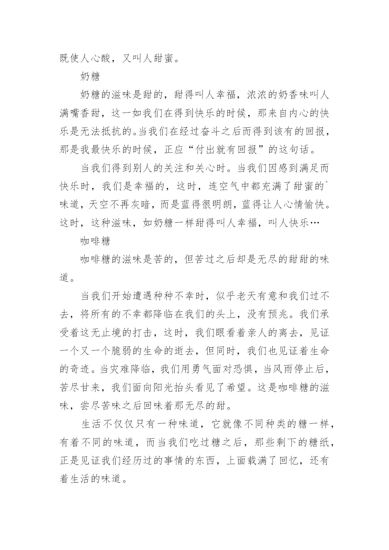 生活的滋味作文800字生活的滋味作文800字无论是在学校还是在社会中,大家一定都接触过作文吧,根据写作命题的特点,作文可以分为命题作文和非命题作文。还是对作文一筹莫展吗?以下是小编整理的生活的滋味作文800字,仅供参考,大家一起来看看吧。我们大家都知道,虽然糖的滋味都是甜的。可是,不同种类的糖有他不一样的甜法。有的是酸酸的甜,有的是甜甜的甜,还有的是苦中带甜。生活亦是如此,酸甜苦辣尽在其中。水果糖水果糖的滋味是酸甜酸甜的,这就像生活中的事一样。当父母在为我们不停的奔波时,而我们正坐在明朗的教室里为生活、社会、人生而愤愤不满。却不知道父母为我们付出的艰辛与汗水。可是,当我们在渐渐地长大,越来越明白事情,当看见父母那一双生满老茧的手,我们的心在痛。当下雨天,父母打着伞慌慌张张地到处找我们时,当伞不够大,回家时父母湿了半边肩膀,这时,我们眼含泪水。当看见父母的背渐渐弯下去,遥远地望着像苍老了一个世纪的老人,那时,我们的鼻子酸酸的。这些生活的琐事,平淡无奇却很伟大,让人感动,这种滋味,就如酸酸甜甜的水果糖一样,既使人心酸,又叫人甜蜜。奶糖奶糖的滋味是甜的,甜得叫人幸福,浓浓的奶香味叫人满嘴香甜,这一如我们在得到快乐的时候,那来自内心的快乐是无法抵抗的。当我们在经过奋斗之后而得到该有的回报,那是我最快乐的时候,正应“付出就有回报”的这句话。当我们得到别人的关注和关心时。当我们因感到满足而快乐时,我们是幸福的,这时,连空气中都充满了甜蜜的`味道,天空不再灰暗,而是蓝得很明朗,蓝得让人心情愉快。这时,这种滋味,如奶糖一样甜得叫人幸福,叫人快乐…咖啡糖咖啡糖的滋味是苦的,但苦过之后却是无尽的甜甜的味道。当我们开始遭遇种种不幸时,似乎老天有意和我们过不去,将所有的不幸都降临在我们的头上,没有预兆。我们承受着这无止境的打击,这时,我们眼看着亲人的离去,见证一个又一个脆弱的生命的逝去,但同时,我们也见证着生命的奇迹。当灾难降临,我们用勇气面对恐惧,当风雨停止后,苦尽甘来,我们面向阳光抬头看见了希望。这是咖啡糖的滋味,尝尽苦味之后回味着那无尽的甜。生活不仅仅只有一种味道,它就像不同种类的糖一样,有着不同的味道,而当我们吃过糖之后,那些剩下的糖纸,正是见证我们经历过的事情的东西,上面载满了回忆,还有着生活的味道。