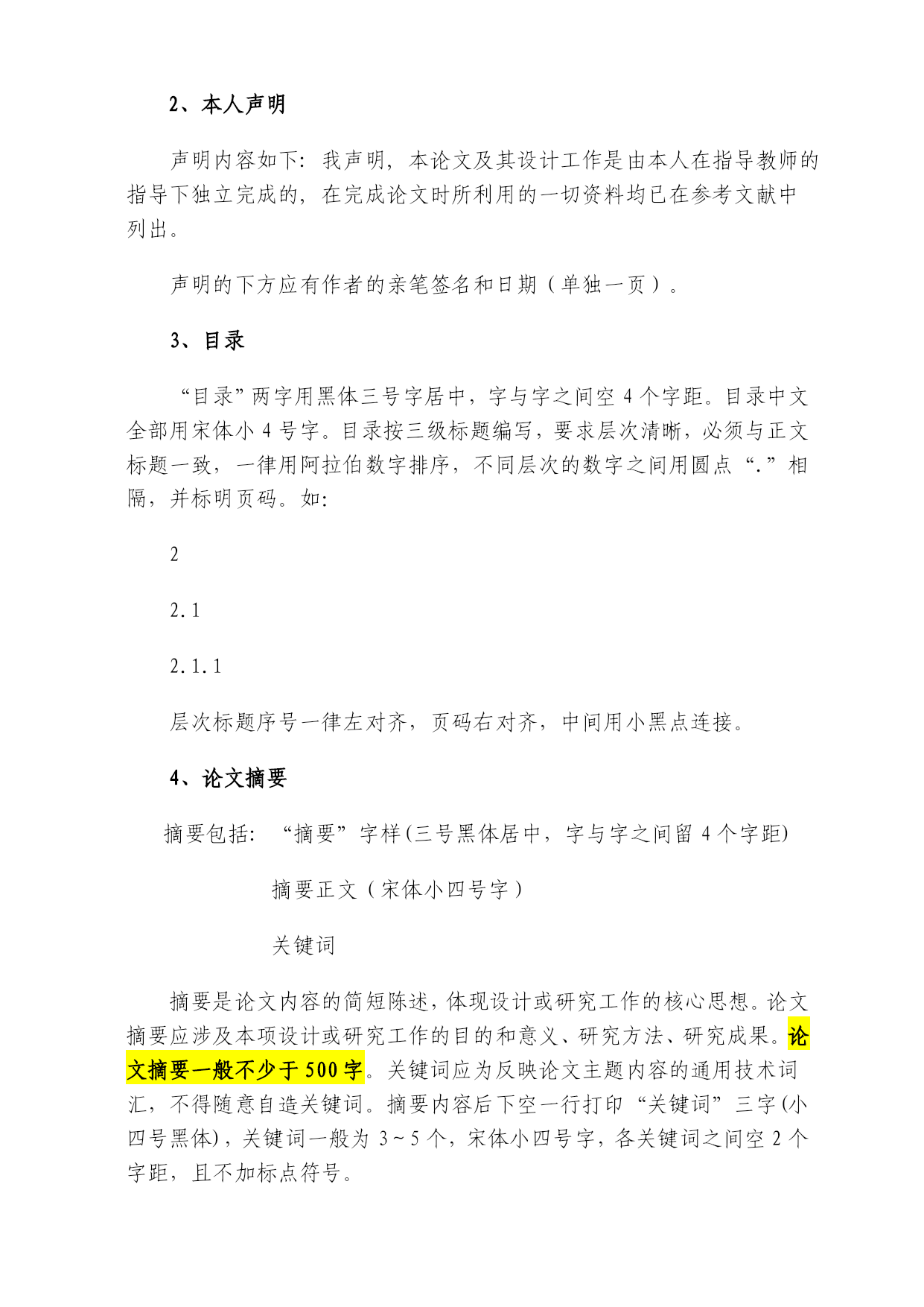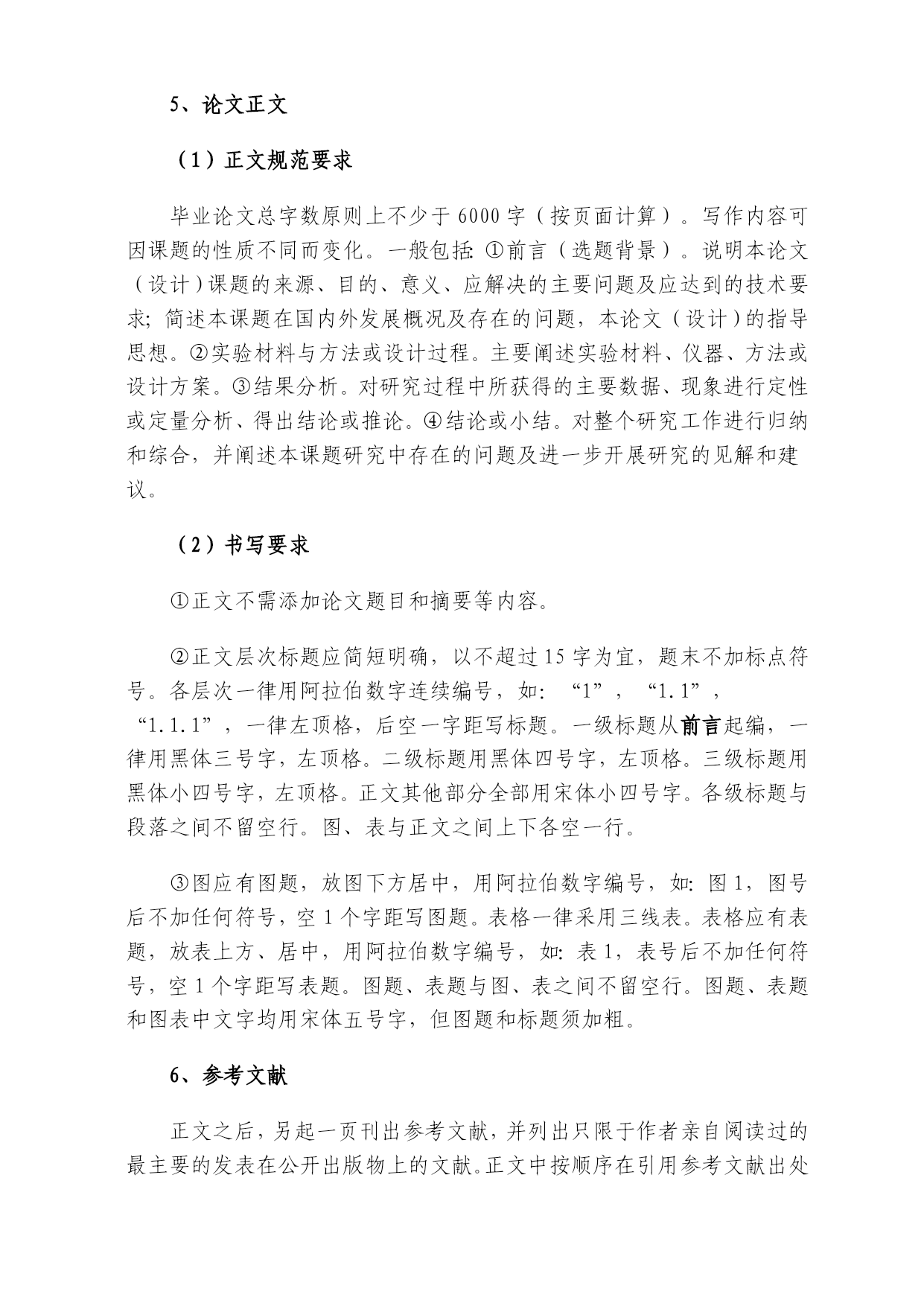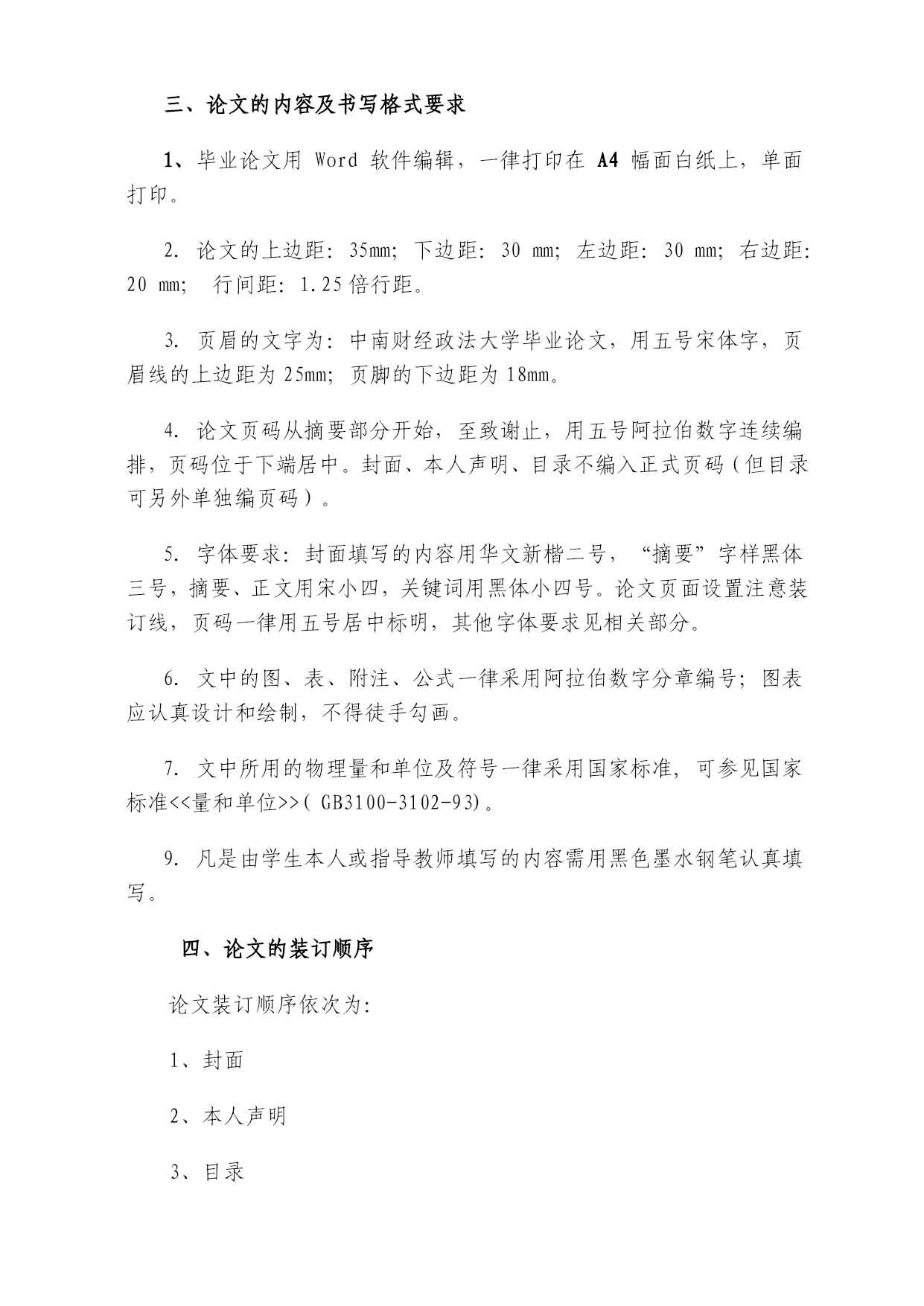 中南财经政法大学自修学院2012年下半年独立本科段毕业论文撰写和指导要求准考证号段在01440921****、01441011****、01441021****和01441111****且尚未答辩的同学必须参加本次答辩,为确保顺利毕业,务必详细阅读以下内容。01441121****、01441211****的同学尽可能也参加本次论文答辩一、毕业论文应在指导教师的指导下,由考生独立完成,不得请人代写或抄袭,论文字数不得少于6000字。指导教师主要是通过审阅考生论文的初稿,批阅对初稿的修改意见来对考生进行毕业论文撰写指导。二、考生可参照中南财经政法大学自修学院全日制自学考试本科毕业论文选题,或根据本人所学的专业自选自定毕业论文题目,但不得跨专业选题,如有跨专业选题,所写的论文无效。毕业论文初稿和定稿的撰写在计算机上完成,并用A4纸打印成稿。HYPERLINK"mailto:并就论文的电子档发675499174@qq.com"并将论文的电子档发993149979@qq.com邮箱。注:①考生在交初稿时一定要留下底稿,学校在返初稿意见时不寄还初稿。②论文封面上请注明:姓名、专业、准考证号、论文题目、联系方式。三、自修学院考务考籍部用计算机登记已交初稿的考生姓名、准考证号、通讯地址,根据考生的论文选题确定指导教师,及时将毕业论文初稿分发给指导教师。指导教师审阅考生毕业论文的初稿后,会认真批阅,提出对初稿的修改指导意见,并填写考生姓名、准考证号、指导教师本人的姓名、通讯地址、联系电话,再交考务考籍部。四、考生要根据指导教师对毕业论文初稿的修改指导意见,在2013年12月15日前完成定稿,装订好论文定稿(打印稿)后直接交给班主任程老师,再由班主任老师交学院考务考籍部,请指导教师按100分制对论文定稿评分,并写出评语。凡不能按时交毕业论文定稿者,均不得参加本次的毕业论文答辩考核。五、毕业论文答辩考核时间通知将于2013年4月份初通知具体论文答辩日期。如有不清楚请咨询班主任:程老师15377688536或办公室027-88049567注:1.交纸质论文的时候必须要先交齐第二年学费,否则不收论文。2.毕业论文选题切记避免扎堆,尽量选新颖的题目写作,这样可提高论文成绩及通过率。论文内容禁止抄袭,凡抄袭者被指导老师发现,后果自负。3.如有同学需拿学位证,本次论文答辩分数不能低于75分。附:一般论文具体要求(务必详细查看)论文一般要求毕业论文是培养学生综合能力的一个重要教学环节,是检验毕业生的专业理论基础知识、操作技能以及独立工作能力的一种手段,也是衡量学生是否达到培养目标、能否毕业的重要依据。为提高毕业论文的质量,现就毕业论文的内容和格式规范作如下要求:一、毕业论文的基本要求1、毕业论文内容文本结构规范论文由8个主要部分组成:(1)封面;(2)本人声明;(3)论文目录;(4)论文摘要;(5)毕业论文正文;(6)参考文献;(7)致谢。2、毕业论文应立论正确,推理严谨,说明透彻,层次分明,数据可靠,文字简练。3、毕业论文要求文理通顺,叙述简练,文图规范。文中引用的文献资料必须注明来源,使用的计量单位,绘图规范应符合国家标准。4、毕业论文需经指导教师审核通过后,才能进行毕业论文答辩。二、文本各项内容的要求1、封面封面采用学院编制的统一格式(附后),封面上填写论文题目、专业、班级、作者姓名、指导教师姓名等内容。中南财经政法大学毕业论文论文题目:姓名:专业:准考证号:联系方式:2012年月日2、本人声明声明内容如下:我声明,本论文及其设计工作是由本人在指导教师的指导下独立完成的,在完成论文时所利用的一切资料均已在参考文献中列出。声明的下方应有作者的亲笔签名和日期(单独一页)。3、目录“目录”两字用黑体三号字居中,字与字之间空4个字距。目录中文全部用宋体小4号字。目录按三级标题编写,要求层次清晰,必须与正文标题一致,一律用阿拉伯数字排序,不同层次的数字之间用圆点“.”相隔,并标明页码。如:22.12.1.1层次标题序号一律左对齐,页码右对齐,中间用小黑点连接。4、论文摘要摘要包括:“摘要”字样(三号黑体居中,字与字之间留4个字距)摘要正文(宋体小四号字)关键词摘要是论文内容的简短陈述,体现设计或研究工作的核心思想。论文摘要应涉及本项设计或研究工作的目的和意义、研究方法、研究成果。论文摘要一般不少于500字。关键词应为反映论文主题内容的通用技术词汇,不得随意自造关键词。摘要内容后下空一行打印“关键词”三字(小四号黑体),关键词一般为3~5个,宋体小四号字,各关键词之间空2个字距,且不加标点符号。5、论文正文(1)正文