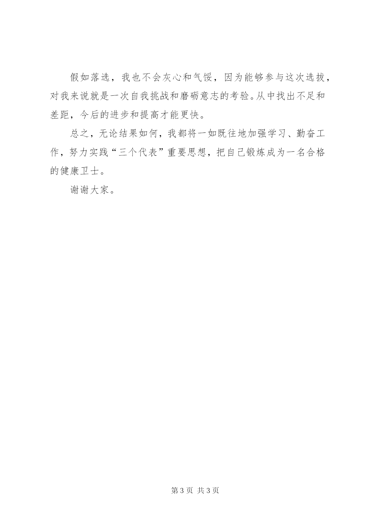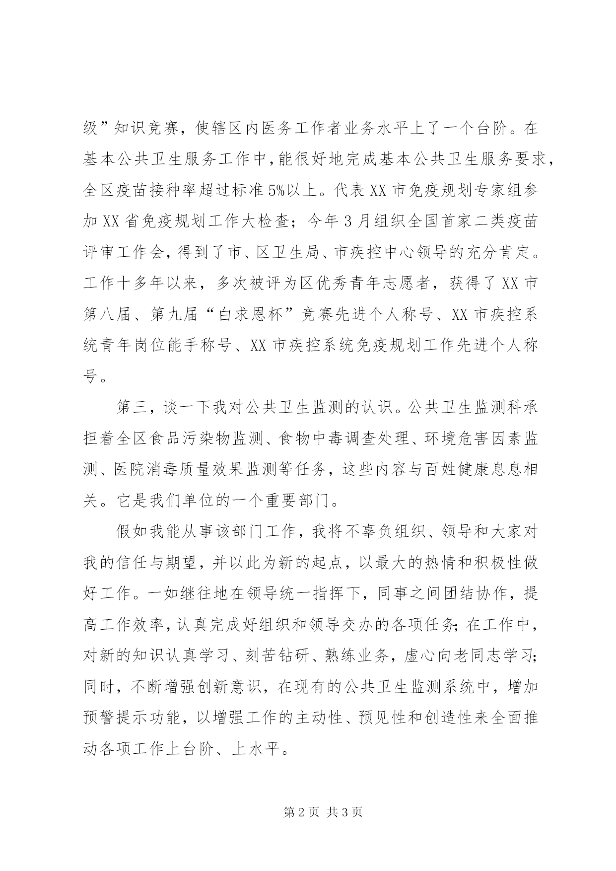第PAGE\*Arabic\*MERGEFORMAT3页共NUMPAGES\*MERGEFORMAT3页公共卫生科竞聘演讲稿竞选公共卫生科副科长演讲稿尊敬的各位领导、同事们:大家好。非常感谢领导给我这次机会,通过竞争上岗展示自己。我深深地感到这次竞岗具有非凡的意义,可以说她是一项使命、一种责任和一份荣耀,我非常珍惜。我竞选的岗位是公共卫生科副科长。首先,请允许作自我介绍。我于1995年毕业于XX市卫生学校,2006年取得中央党校本科学历,2010年取得XX省公共卫生全科医师,今年9月光荣地成为预备党员。参加工作至今一直在本单位从事免疫规划工作。其次,向领导汇报参加工作以来的点滴。在十多年的工作中,有着领导的关怀和培养,有着同事的帮助和关心下,我在政治觉悟上、业务能力上逐渐成熟起来,工作中兢兢业业、认认真真对待每件微小事件,至使工作有序顺利地进行。在2003年的抗击非典工作中,2009年的甲型h1n1流感暴发时,我总是以高度的责任感和强烈的事业心来认真负责的办好每件事情,不求荣誉,只求进步,为全区高危人群进行了疫苗接种,使全区疫情得到了有效的控制。在工作中,虚心向老同志学习,碰到不懂的问题及时请教;对社区卫生服务中心医务工作者做好业务指导,对家长所疑惑的问题,耐心解答。组织了辖区内“规范接种——安全升级”知识竞赛,使辖区内医务工作者业务水平上了一个台阶。在基本公共卫生服务工作中,能很好地完成基本公共卫生服务要求,全区疫苗接种率超过标准5%以上。代表XX市免疫规划专家组参加XX省免疫规划工作大检查;今年3月组织全国首家二类疫苗评审工作会,得到了市、区卫生局、市疾控中心领导的充分肯定。工作十多年以来,多次被评为区优秀青年志愿者,获得了XX市第八届、第九届“白求恩杯”竞赛先进个人称号、XX市疾控系统青年岗位能手称号、XX市疾控系统免疫规划工作先进个人称号。第三,谈一下我对公共卫生监测的认识。公共卫生监测科承担着全区食品污染物监测、食物中毒调查处理、环境危害因素监测、医院消毒质量效果监测等任务,这些内容与百姓健康息息相关。它是我们单位的一个重要部门。假如我能从事该部门工作,我将不辜负组织、领导和大家对我的信任与期望,并以此为新的起点,以最大的热情和积极性做好工作。一如继往地在领导统一指挥下,同事之间团结协作,提高工作效率,认真完成好组织和领导交办的各项任务;在工作中,对新的知识认真学习、刻苦钻研、熟练业务,虚心向老同志学习;同时,不断增强创新意识,在现有的公共卫生监测系统中,增加预警提示功能,以增强工作的主动性、预见性和创造性来全面推动各项工作上台阶、上水平。假如落选,我也不会灰心和气馁,因为能够参与这次选拔,对我来说就是一次自我挑战和磨砺意志的考验。从中找出不足和差距,今后的进步和提高才能更快。总之,无论结果如何,我都将一如既往地加强学习、勤奋工作,努力实践“三个代表”重要思想,把自己锻炼成为一名合格的健康卫士。谢谢大家。