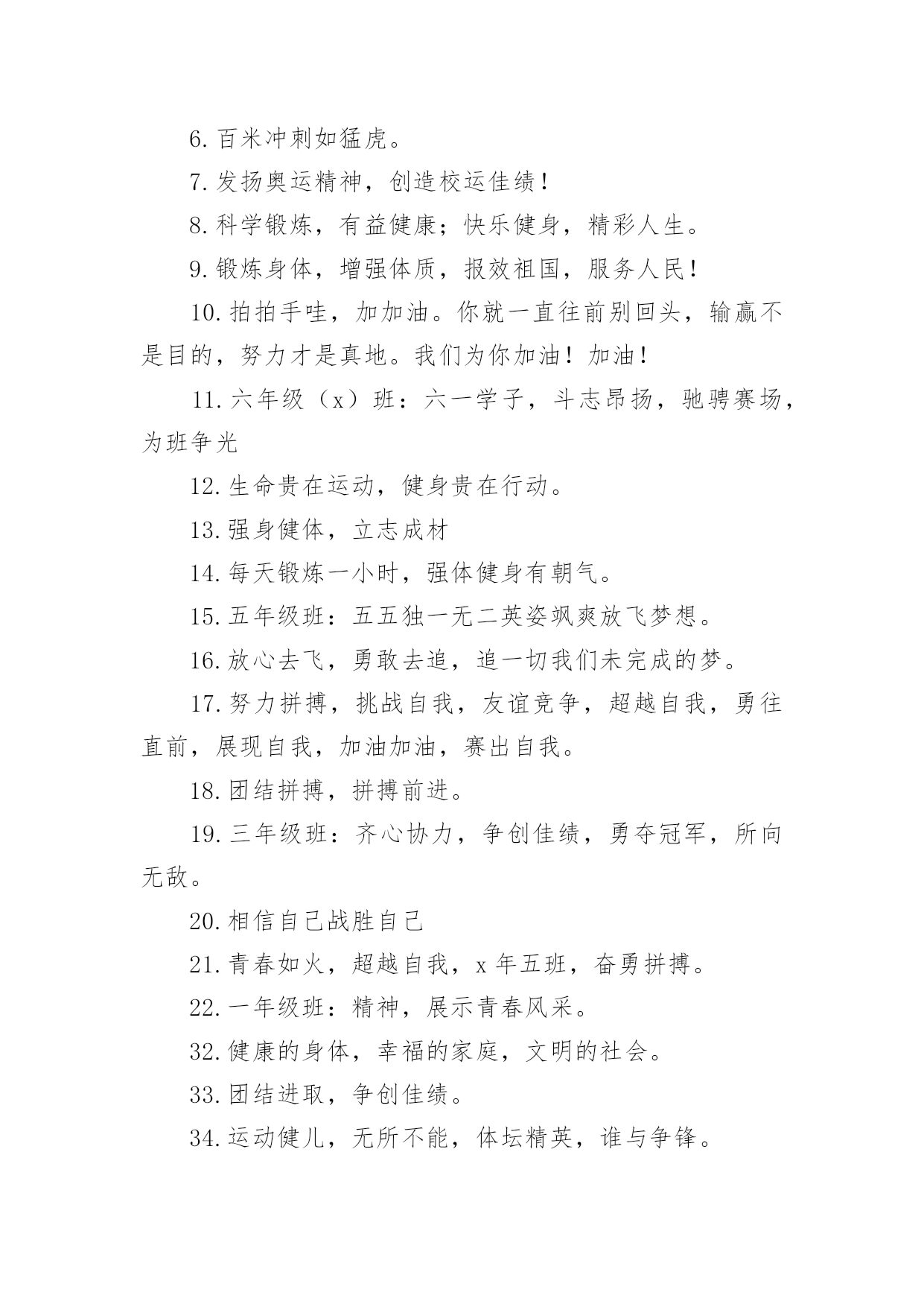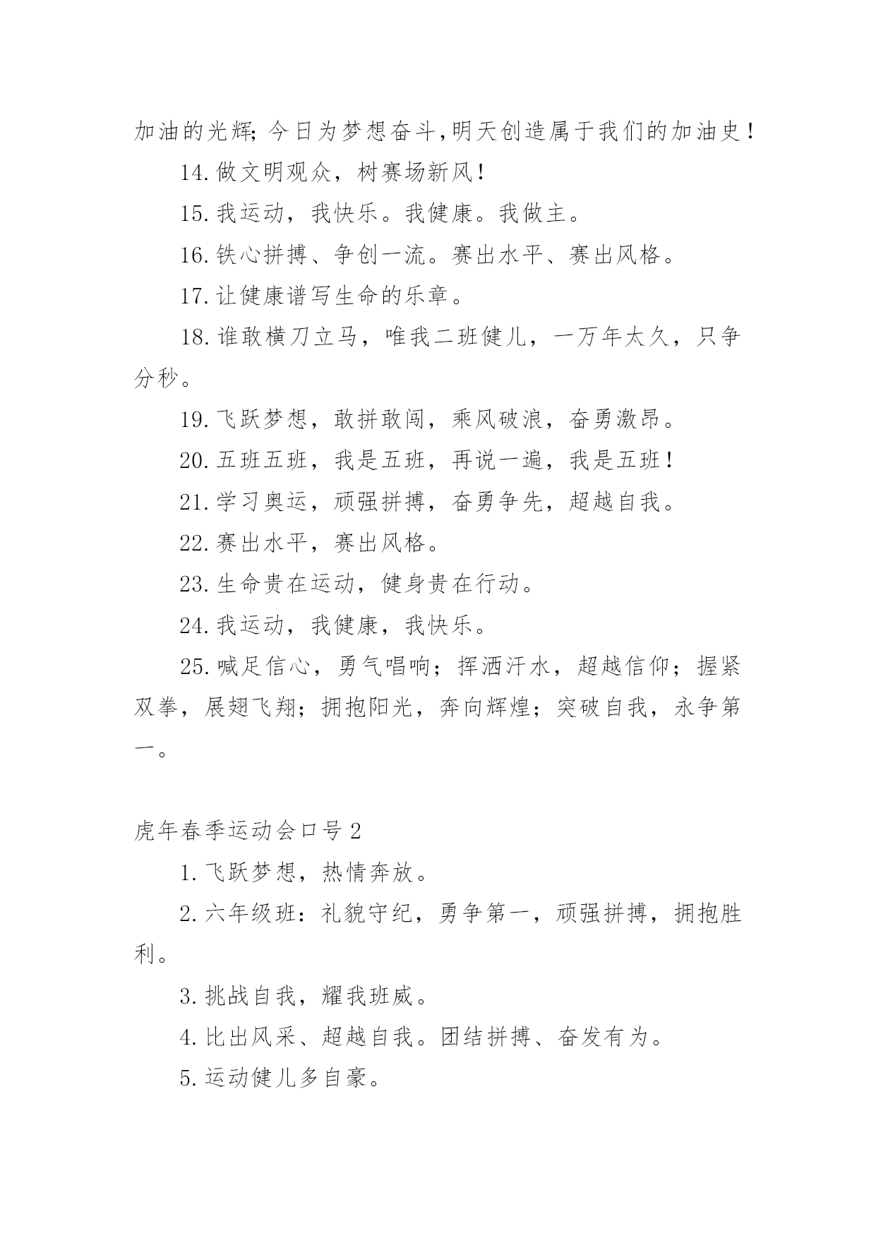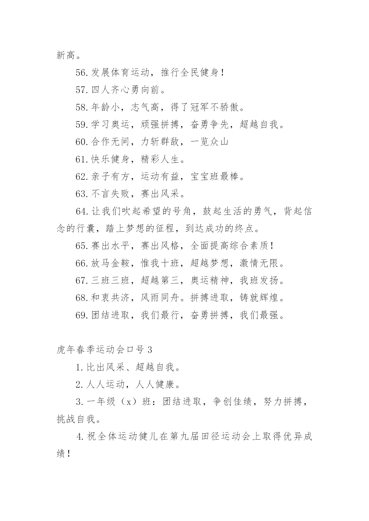 虎年春季运动会口号在现实生活或工作学习中,大家都看到过口号吧,高效的口号具有针对性,时效性,鼓动性和简洁性的特点。那么问题来了,到底什么样的口号才经典呢?以下是小编帮大家整理的虎年春季运动会口号,供大家参考借鉴,希望可以帮助到有需要的朋友。虎年春季运动会口号11.运动无处不在,生活更加精彩。2.团结第一,比赛第二。3.努力拼搏,挑战自我,友谊竞争,超越自我,勇往直前,展现自我,加油加油,赛出自我。4.青春似火,激情无限5.我运动,我健康,我快乐,运动伴随你和我。6.六年级班:六二精英,敢闯敢拼,齐心协力,争创佳绩。7.奋力拼搏,勇于攀登。8.健康你我他,幸福千万家。9.体坛青春际会,校园运动乐章!10.我健康,我快乐,我真的.很不错!11.拿出自己最美的英姿改变明天。参与就是是胜利。12.运动健康,快乐成长。13.奋斗,奋斗,成就奋斗的梦想;加油,加油,谱写加油的光辉;今日为梦想奋斗,明天创造属于我们的加油史!14.做文明观众,树赛场新风!15.我运动,我快乐。我健康。我做主。16.铁心拼搏、争创一流。赛出水平、赛出风格。17.让健康谱写生命的乐章。18.谁敢横刀立马,唯我二班健儿,一万年太久,只争分秒。19.飞跃梦想,敢拼敢闯,乘风破浪,奋勇激昂。20.五班五班,我是五班,再说一遍,我是五班!21.学习奥运,顽强拼搏,奋勇争先,超越自我。22.赛出水平,赛出风格。23.生命贵在运动,健身贵在行动。24.我运动,我健康,我快乐。25.喊足信心,勇气唱响;挥洒汗水,超越信仰;握紧双拳,展翅飞翔;拥抱阳光,奔向辉煌;突破自我,永争第一。虎年春季运动会口号21.飞跃梦想,热情奔放。2.六年级班:礼貌守纪,勇争第一,顽强拼搏,拥抱胜利。3.挑战自我,耀我班威。4.比出风采、超越自我。团结拼搏、奋发有为。5.运动健儿多自豪。6.百米冲刺如猛虎。7.发扬奥运精神,创造校运佳绩!8.科学锻炼,有益健康;快乐健身,精彩人生。9.锻炼身体,增强体质,报效祖国,服务人民!10.拍拍手哇,加加油。你就一直往前别回头,输赢不是目的,努力才是真地。我们为你加油!加油!11.六年级(x)班:六一学子,斗志昂扬,驰骋赛场,为班争光12.生命贵在运动,健身贵在行动。13.强身健体,立志成材14.每天锻炼一小时,强体健身有朝气。15.五年级班:五五独一无二英姿飒爽放飞梦想。16.放心去飞,勇敢去追,追一切我们未完成的梦。17.努力拼搏,挑战自我,友谊竞争,超越自我,勇往直前,展现自我,加油加油,赛出自我。18.团结拼搏,拼搏前进。19.三年级班:齐心协力,争创佳绩,勇夺冠军,所向无敌。20.相信自己战胜自己21.青春如火,超越自我,x年五班,奋勇拼搏。22.一年级班:精神,展示青春风采。32.健康的身体,幸福的家庭,文明的社会。33.团结进取,争创佳绩。34.运动健儿,无所不能,体坛精英,谁与争锋。35.奋斗改变命,梦想让我们与众不同。36.六年级(x)班:顽强拼搏,超越自我,不鸣则已,一鸣惊人。37.奋勇拼搏,影子飒爽。38.体坛青春际会,校园运动乐章!39.四班雄风,扬威大众。40.和本身比赛。为了明天,超越今天,我们最愉快!41.青春运动,友谊健康。42.秋风吹,战鼓擂,我们四(x)怕过谁!43.二年级(x)班:参与阳光体育,为我健儿喝彩。44.赛体育真谛,扬奥运精神。45.九班九班,法力无边,来我九班,早日成仙!46.放马金鞍,惟我十班。47.奋力拼搏、扬我班风、努力学习、勇争第一。48.别看我们年纪轻,要当体育大明星。49.超越极限,超越自我。50.鼓舞声愿你拼尽全力,喝彩声愿你坚持到底,夸赞声愿你不舍不弃,所有人为你加油!为的是使你努力拼搏,勇创佳绩!51.健康你我他,幸福千万家。52.青春似火,超越自我,放飞梦想,创造辉煌。53.锐不可当,超越自我,再创辉煌。54.谁更快,拼了才知道。55.四年级班:团结拼搏,勇往直前,放飞梦想,争创新高。56.发展体育运动,推行全民健身!57.四人齐心勇向前。58.年龄小,志气高,得了冠军不骄傲。59.学习奥运,顽强拼搏,奋勇争先,超越自我。60.合作无间,力斩群敌,一览众山61.快乐健身,精彩人生。62.亲子有方,运动有益,宝宝班最棒。63.不言失败,赛出风采。64.让我们吹起希望的号角,鼓起生活的勇气,背起信念的行囊,踏上梦想的征程,到达成功的终点。65.赛出水平,赛出风格,全面提高综合素质!66.放马金鞍,惟我十班,超越梦想,激情无限。67.三班三班,超越第三,奥运精神,我班发扬。68.和衷共济,风雨同舟。拼搏进取,铸就辉煌。69.团结进取,我们最行,奋勇拼搏,我们最强。虎年春季运动会口号31.比出风采、超越自我。2.人人运动,人人健康。3.一年级(x)班:团结进取,争创佳绩,努力拼搏,挑战自我。4.
