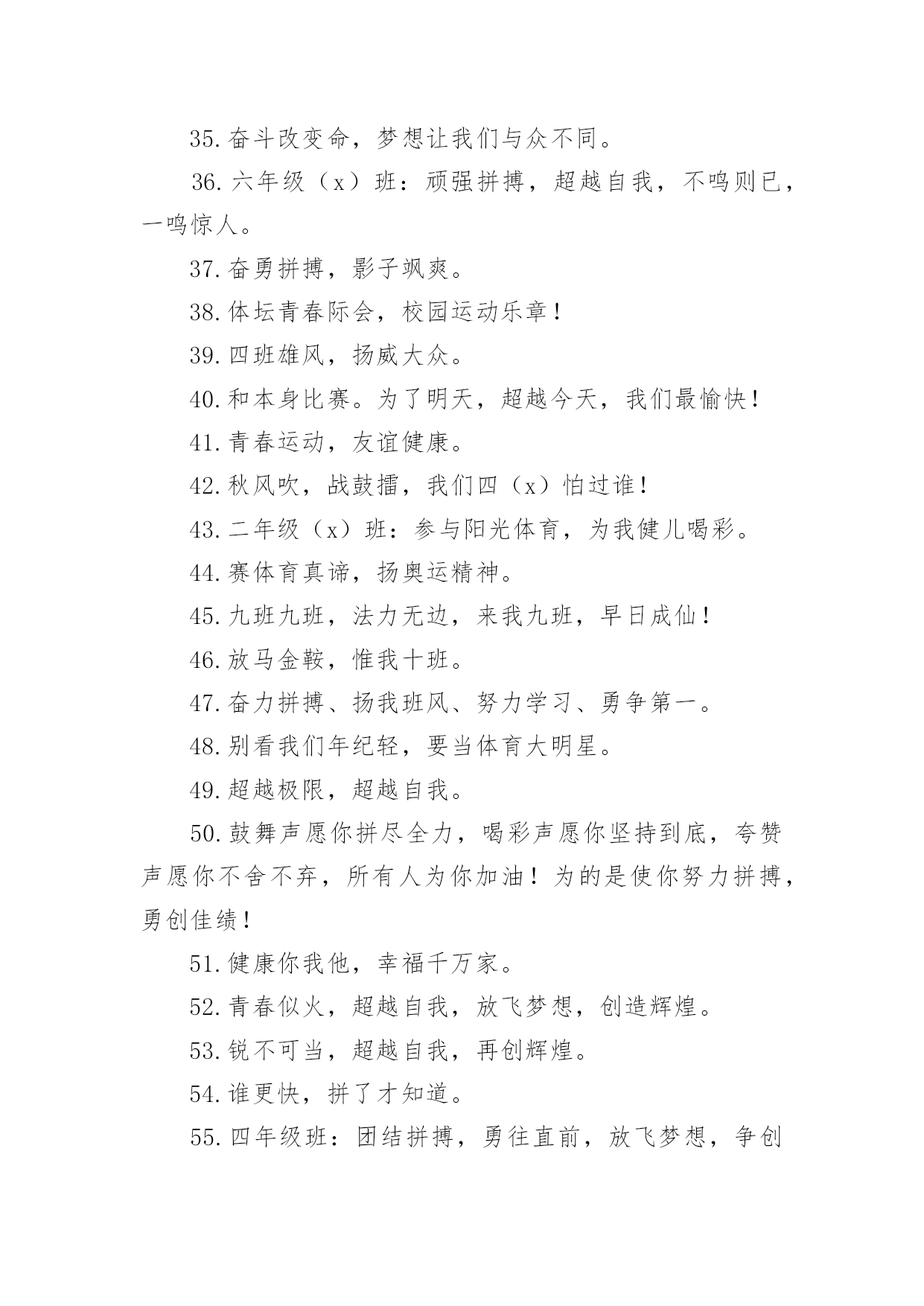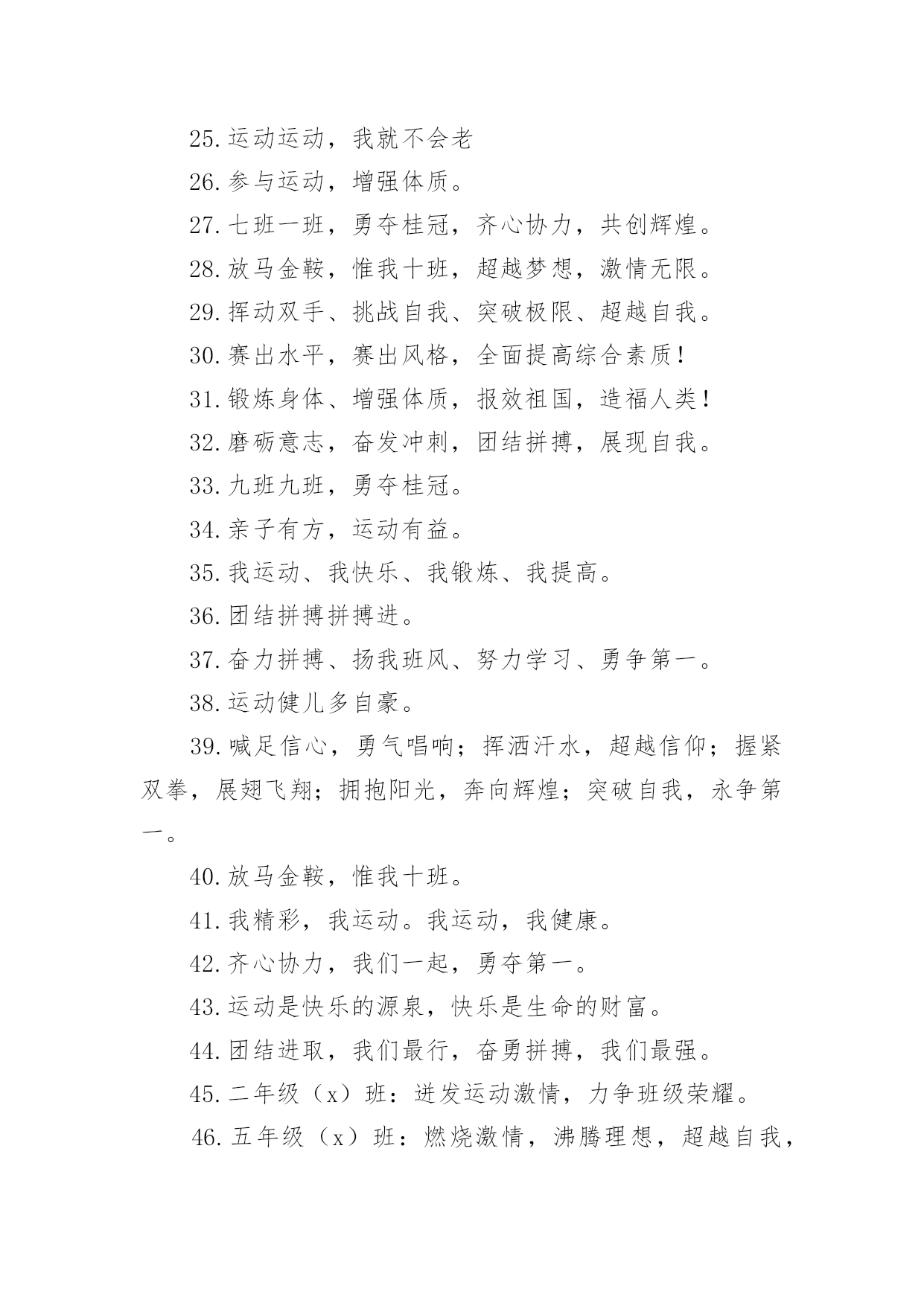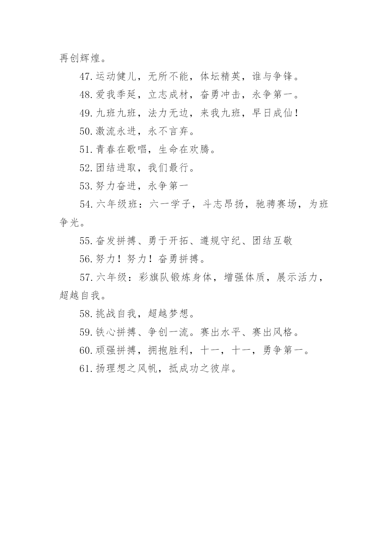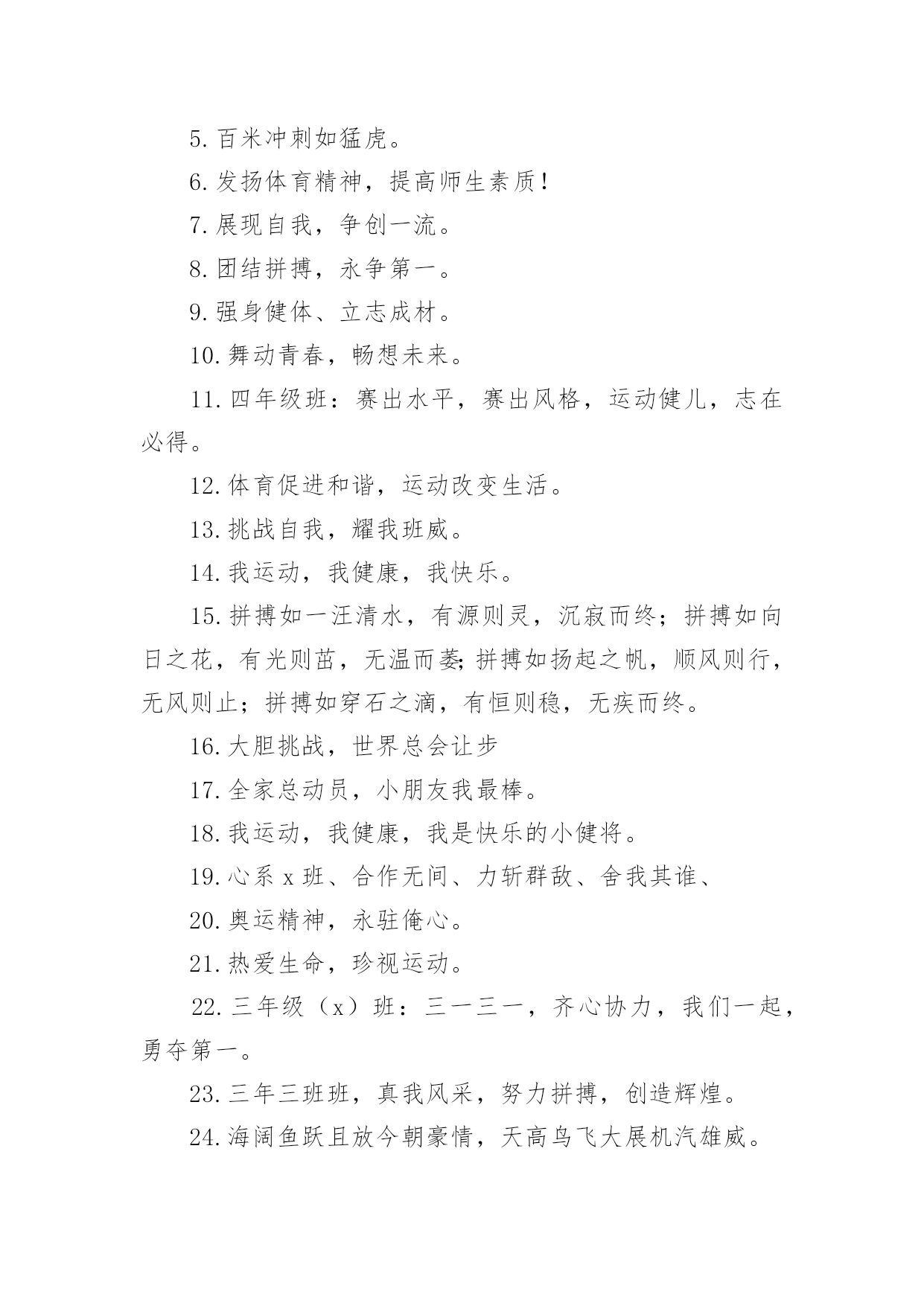 虎年春季运动会口号在现实生活或工作学习中,大家都看到过口号吧,高效的口号具有针对性,时效性,鼓动性和简洁性的特点。那么问题来了,到底什么样的口号才经典呢?以下是小编帮大家整理的虎年春季运动会口号,供大家参考借鉴,希望可以帮助到有需要的朋友。虎年春季运动会口号11.运动无处不在,生活更加精彩。2.团结第一,比赛第二。3.努力拼搏,挑战自我,友谊竞争,超越自我,勇往直前,展现自我,加油加油,赛出自我。4.青春似火,激情无限5.我运动,我健康,我快乐,运动伴随你和我。6.六年级班:六二精英,敢闯敢拼,齐心协力,争创佳绩。7.奋力拼搏,勇于攀登。8.健康你我他,幸福千万家。9.体坛青春际会,校园运动乐章!10.我健康,我快乐,我真的.很不错!11.拿出自己最美的英姿改变明天。参与就是是胜利。12.运动健康,快乐成长。13.奋斗,奋斗,成就奋斗的梦想;加油,加油,谱写加油的光辉;今日为梦想奋斗,明天创造属于我们的加油史!14.做文明观众,树赛场新风!15.我运动,我快乐。我健康。我做主。16.铁心拼搏、争创一流。赛出水平、赛出风格。17.让健康谱写生命的乐章。18.谁敢横刀立马,唯我二班健儿,一万年太久,只争分秒。19.飞跃梦想,敢拼敢闯,乘风破浪,奋勇激昂。20.五班五班,我是五班,再说一遍,我是五班!21.学习奥运,顽强拼搏,奋勇争先,超越自我。22.赛出水平,赛出风格。23.生命贵在运动,健身贵在行动。24.我运动,我健康,我快乐。25.喊足信心,勇气唱响;挥洒汗水,超越信仰;握紧双拳,展翅飞翔;拥抱阳光,奔向辉煌;突破自我,永争第一。虎年春季运动会口号21.飞跃梦想,热情奔放。2.六年级班:礼貌守纪,勇争第一,顽强拼搏,拥抱胜利。3.挑战自我,耀我班威。4.比出风采、超越自我。团结拼搏、奋发有为。5.运动健儿多自豪。6.百米冲刺如猛虎。7.发扬奥运精神,创造校运佳绩!8.科学锻炼,有益健康;快乐健身,精彩人生。9.锻炼身体,增强体质,报效祖国,服务人民!10.拍拍手哇,加加油。你就一直往前别回头,输赢不是目的,努力才是真地。我们为你加油!加油!11.六年级(x)班:六一学子,斗志昂扬,驰骋赛场,为班争光12.生命贵在运动,健身贵在行动。13.强身健体,立志成材14.每天锻炼一小时,强体健身有朝气。15.五年级班:五五独一无二英姿飒爽放飞梦想。16.放心去飞,勇敢去追,追一切我们未完成的梦。17.努力拼搏,挑战自我,友谊竞争,超越自我,勇往直前,展现自我,加油加油,赛出自我。18.团结拼搏,拼搏前进。19.三年级班:齐心协力,争创佳绩,勇夺冠军,所向无敌。20.相信自己战胜自己21.青春如火,超越自我,x年五班,奋勇拼搏。22.一年级班:精神,展示青春风采。32.健康的身体,幸福的家庭,文明的社会。33.团结进取,争创佳绩。34.运动健儿,无所不能,体坛精英,谁与争锋。35.奋斗改变命,梦想让我们与众不同。36.六年级(x)班:顽强拼搏,超越自我,不鸣则已,一鸣惊人。37.奋勇拼搏,影子飒爽。38.体坛青春际会,校园运动乐章!39.四班雄风,扬威大众。40.和本身比赛。为了明天,超越今天,我们最愉快!41.青春运动,友谊健康。42.秋风吹,战鼓擂,我们四(x)怕过谁!43.二年级(x)班:参与阳光体育,为我健儿喝彩。44.赛体育真谛,扬奥运精神。45.九班九班,法力无边,来我九班,早日成仙!46.放马金鞍,惟我十班。47.奋力拼搏、扬我班风、努力学习、勇争第一。48.别看我们年纪轻,要当体育大明星。49.超越极限,超越自我。50.鼓舞声愿你拼尽全力,喝彩声愿你坚持到底,夸赞声愿你不舍不弃,所有人为你加油!为的是使你努力拼搏,勇创佳绩!51.健康你我他,幸福千万家。52.青春似火,超越自我,放飞梦想,创造辉煌。53.锐不可当,超越自我,再创辉煌。54.谁更快,拼了才知道。55.四年级班:团结拼搏,勇往直前,放飞梦想,争创新高。56.发展体育运动,推行全民健身!57.四人齐心勇向前。58.年龄小,志气高,得了冠军不骄傲。59.学习奥运,顽强拼搏,奋勇争先,超越自我。60.合作无间,力斩群敌,一览众山61.快乐健身,精彩人生。62.亲子有方,运动有益,宝宝班最棒。63.不言失败,赛出风采。64.让我们吹起希望的号角,鼓起生活的勇气,背起信念的行囊,踏上梦想的征程,到达成功的终点。65.赛出水平,赛出风格,全面提高综合素质!66.放马金鞍,惟我十班,超越梦想,激情无限。67.三班三班,超越第三,奥运精神,我班发扬。68.和衷共济,风雨同舟。拼搏进取,铸就辉煌。69.团结进取,我们最行,奋勇拼搏,我们最强。虎年春季运动会口号31.比出风采、超越自我。2.人人运动,人人健康。3.一年级(x)班:团结进取,争创佳绩,努力拼搏,挑战自我。4.