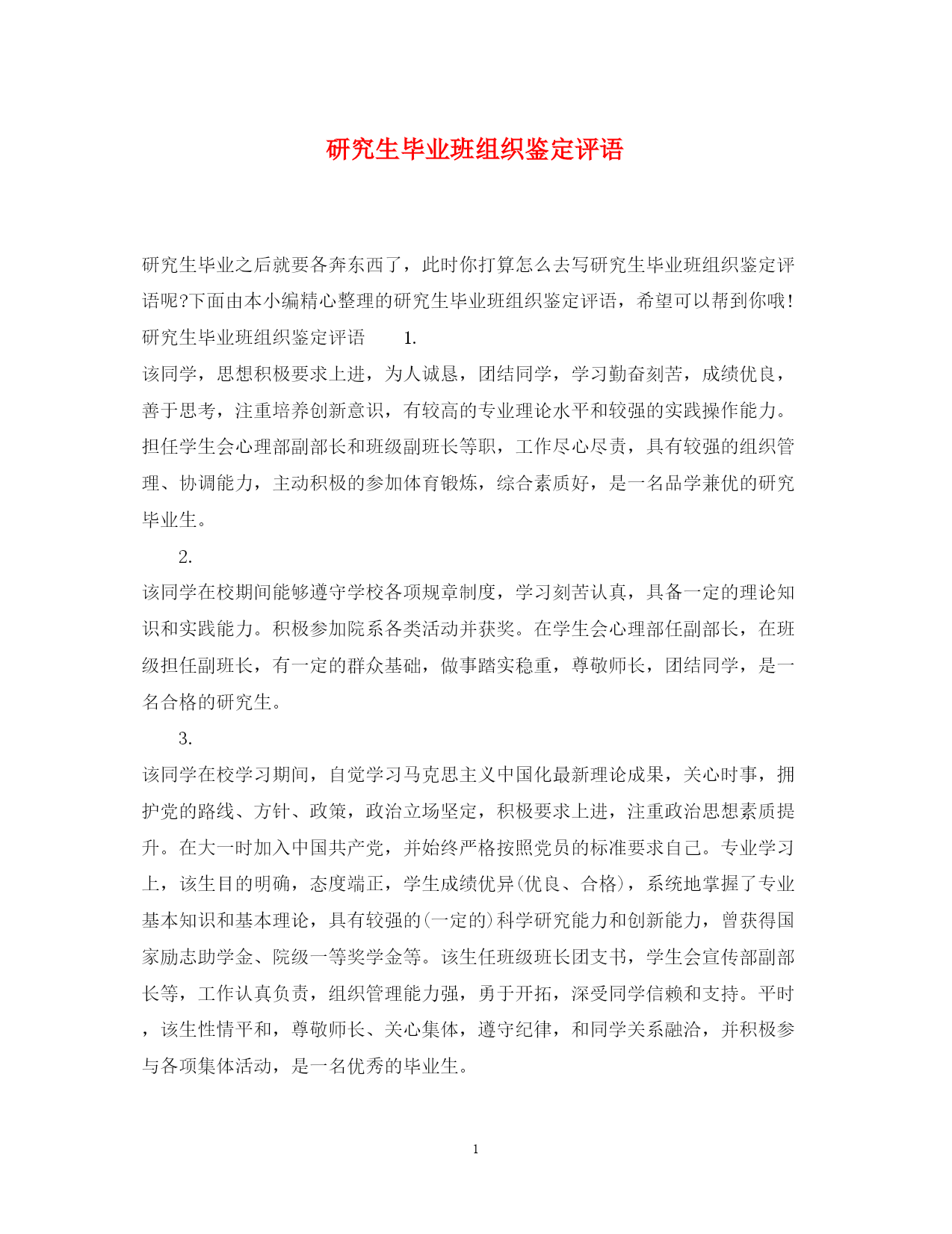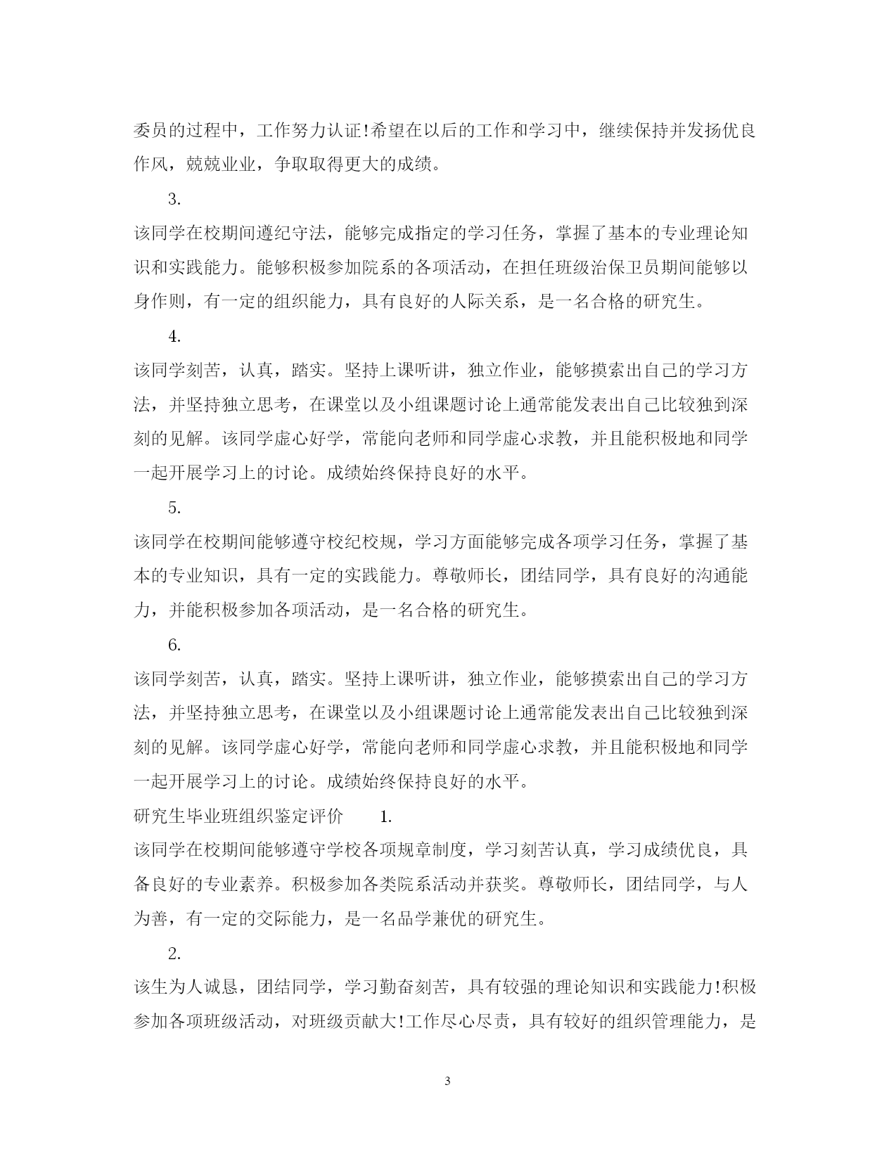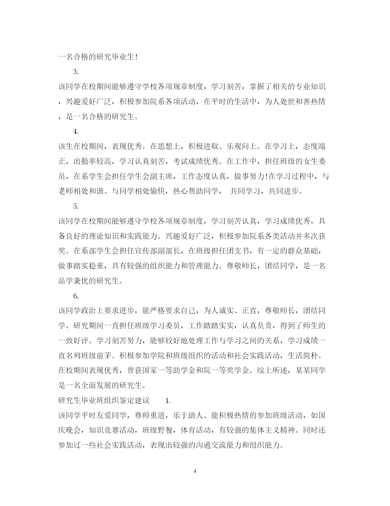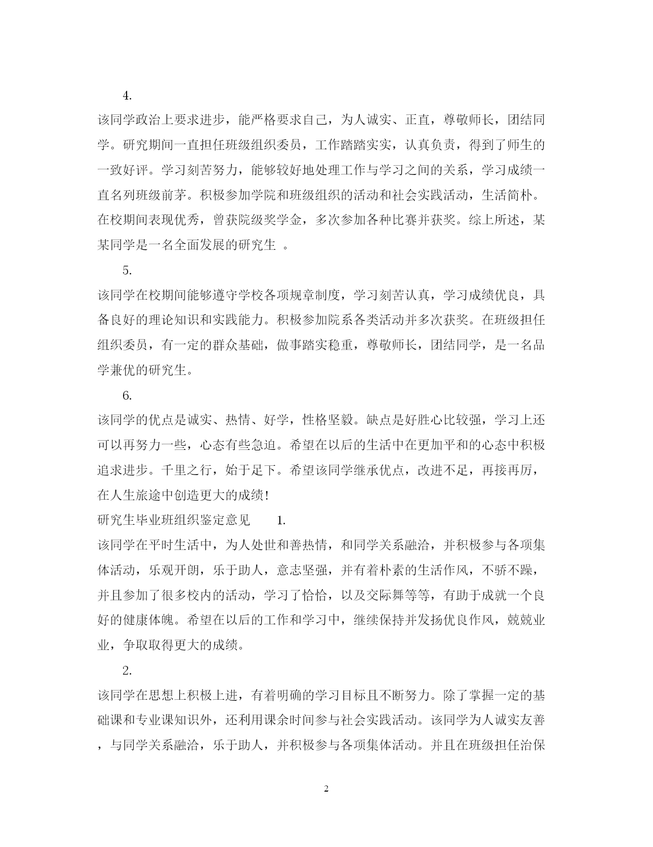 此资料由网络收集而来,如有侵权请告知上传者立即删除。资料共分享,我们负责传递知识。PAGEPAGE5研究生毕业班组织鉴定评语研究生毕业之后就要各奔东西了,此时你打算怎么去写研究生毕业班组织鉴定评语呢?下面由本小编精心整理的研究生毕业班组织鉴定评语,希望可以帮到你哦!研究生毕业班组织鉴定评语1.该同学,思想积极要求上进,为人诚恳,团结同学,学习勤奋刻苦,成绩优良,善于思考,注重培养创新意识,有较高的专业理论水平和较强的实践操作能力。担任学生会心理部副部长和班级副班长等职,工作尽心尽责,具有较强的组织管理、协调能力,主动积极的参加体育锻炼,综合素质好,是一名品学兼优的研究毕业生。2.该同学在校期间能够遵守学校各项规章制度,学习刻苦认真,具备一定的理论知识和实践能力。积极参加院系各类活动并获奖。在学生会心理部任副部长,在班级担任副班长,有一定的群众基础,做事踏实稳重,尊敬师长,团结同学,是一名合格的研究生。3.该同学在校学习期间,自觉学习马克思主义中国化最新理论成果,关心时事,拥护党的路线、方针、政策,政治立场坚定,积极要求上进,注重政治思想素质提升。在大一时加入中国共产党,并始终严格按照党员的标准要求自己。专业学习上,该生目的明确,态度端正,学生成绩优异(优良、合格),系统地掌握了专业基本知识和基本理论,具有较强的(一定的)科学研究能力和创新能力,曾获得国家励志助学金、院级一等奖学金等。该生任班级班长团支书,学生会宣传部副部长等,工作认真负责,组织管理能力强,勇于开拓,深受同学信赖和支持。平时,该生性情平和,尊敬师长、关心集体,遵守纪律,和同学关系融洽,并积极参与各项集体活动,是一名优秀的毕业生。4.该同学政治上要求进步,能严格要求自己,为人诚实、正直,尊敬师长,团结同学。研究期间一直担任班级组织委员,工作踏踏实实,认真负责,得到了师生的一致好评。学习刻苦努力,能够较好地处理工作与学习之间的关系,学习成绩一直名列班级前茅。积极参加学院和班级组织的活动和社会实践活动,生活简朴。在校期间表现优秀,曾获院级奖学金,多次参加各种比赛并获奖。综上所述,某某同学是一名全面发展的研究生。5.该同学在校期间能够遵守学校各项规章制度,学习刻苦认真,学习成绩优良,具备良好的理论知识和实践能力。积极参加院系各类活动并多次获奖。在班级担任组织委员,有一定的群众基础,做事踏实稳重,尊敬师长,团结同学,是一名品学兼优的研究生。6.该同学的优点是诚实、热情、好学,性格坚毅。缺点是好胜心比较强,学习上还可以再努力一些,心态有些急迫。希望在以后的生活中在更加平和的心态中积极追求进步。千里之行,始于足下。希望该同学继承优点,改进不足,再接再厉,在人生旅途中创造更大的成绩!研究生毕业班组织鉴定意见1.该同学在平时生活中,为人处世和善热情,和同学关系融洽,并积极参与各项集体活动,乐观开朗,乐于助人,意志坚强,并有着朴素的生活作风,不骄不躁,并且参加了很多校内的活动,学习了恰恰,以及交际舞等等,有助于成就一个良好的健康体魄。希望在以后的工作和学习中,继续保持并发扬优良作风,兢兢业业,争取取得更大的成绩。2.该同学在思想上积极上进,有着明确的学习目标且不断努力。除了掌握一定的基础课和专业课知识外,还利用课余时间参与社会实践活动。该同学为人诚实友善,与同学关系融洽,乐于助人,并积极参与各项集体活动。并且在班级担任治保委员的过程中,工作努力认证!希望在以后的工作和学习中,继续保持并发扬优良作风,兢兢业业,争取取得更大的成绩。3.该同学在校期间遵纪守法,能够完成指定的学习任务,掌握了基本的专业理论知识和实践能力。能够积极参加院系的各项活动,在担任班级治保卫员期间能够以身作则,有一定的组织能力,具有良好的人际关系,是一名合格的研究生。4.该同学刻苦,认真,踏实。坚持上课听讲,独立作业,能够摸索出自己的学习方法,并坚持独立思考,在课堂以及小组课题讨论上通常能发表出自己比较独到深刻的见解。该同学虚心好学,常能向老师和同学虚心求教,并且能积极地和同学一起开展学习上的讨论。成绩始终保持良好的水平。5.该同学在校期间能够遵守校纪校规,学习方面能够完成各项学习任务,掌握了基本的专业知识,具有一定的实践能力。尊敬师长,团结同学,具有良好的沟通能力,并能积极参加各项活动,是一名合格的研究生。6.该同学刻苦,认真,踏实。坚持上课听讲,独立作业,能够摸索出自己的学习方法,并坚持独立思考,在课堂以及小组课题讨论上通常能发表出自己比较独到深刻的见解。该同学虚心好学,常能向老师和同学虚心求教,并且能积极地和同学一起开展学习上的讨论。成绩始终保持良好的水平。研究生毕业班组织鉴定评价1.该同学在校期间能够遵守学校各项规章制度,学习刻苦认真,学习成绩优良,具备良好
