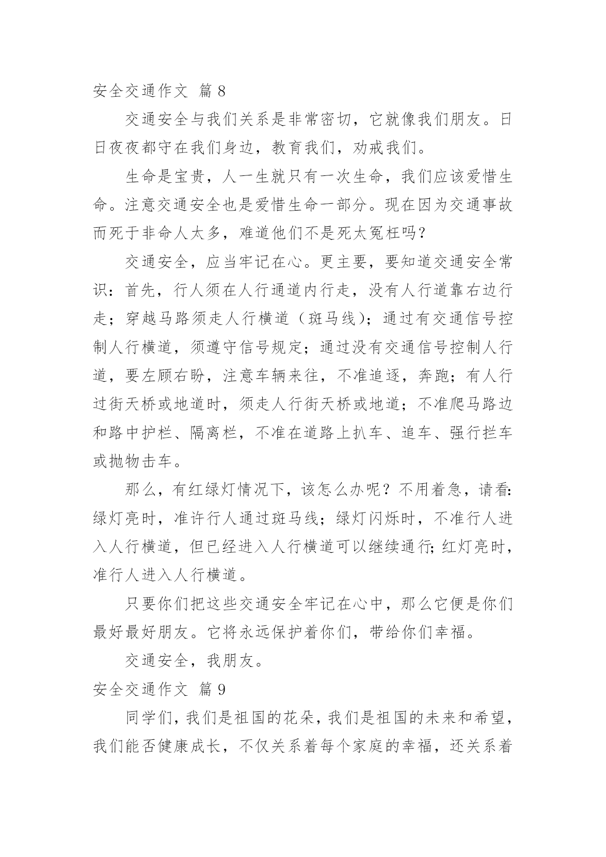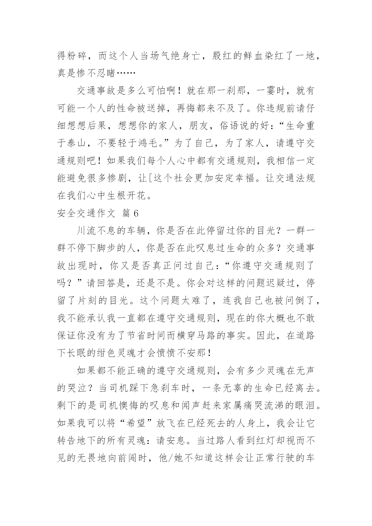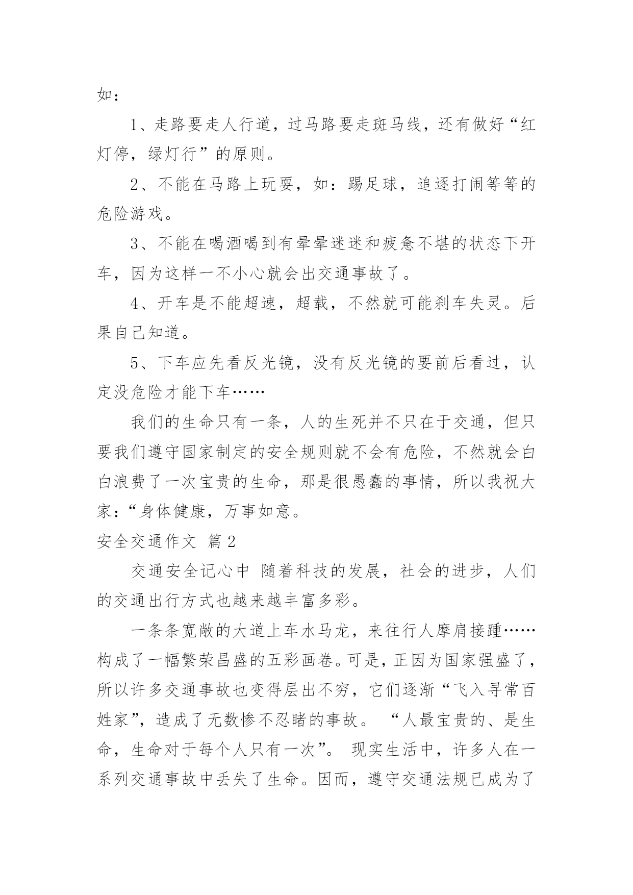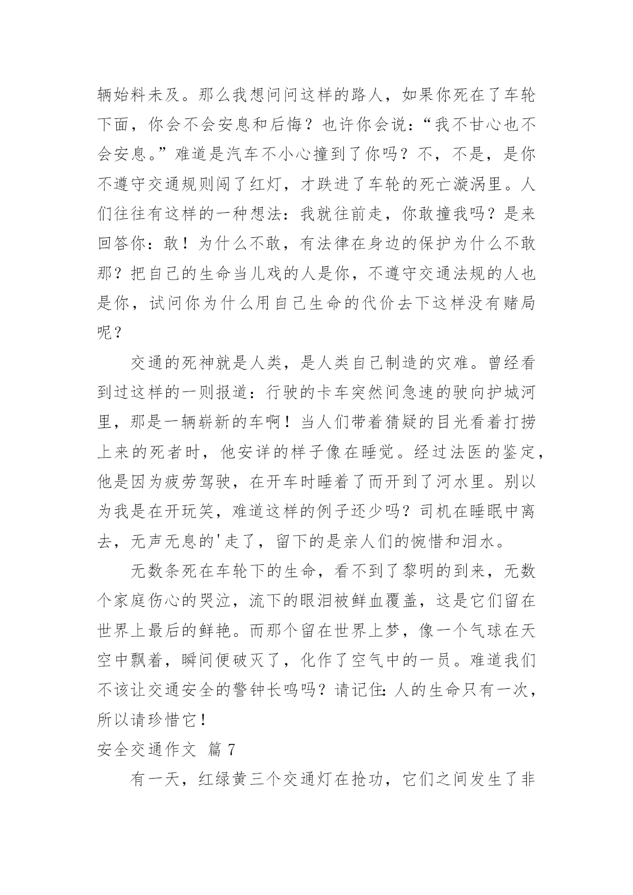 安全交通作文安全交通作文[精选]在学习、工作或生活中,大家一定都接触过作文吧,作文根据体裁的不同可以分为记叙文、说明文、应用文、议论文。怎么写作文才能避免踩雷呢?下面是小编为大家收集的安全交通作文9篇,欢迎大家分享。安全交通作文篇1今天火红的太阳从西边落下,明天可以从东边徐徐升起;小树嫩绿的叶子枯了可以再绿;花儿谢了可以在开……但是,人的生命却是一去不复返了,所以,我们要珍爱生命,珍爱生命就要从身边的小事做起。今天下午,我们班吴老师打开电视机,给我们播放了一些交通安全知识的图片,我看完后,便产生了深深的感想街上有些车都帖有“宁停三分,不抢一秒”的.标语吧,可谁能做到呢?除非是看到交警才制约一点,可一离开交警的视线,又有多少人会遵守交通规则呢?还有戴安全帽的问题,大人说小孩子戴不戴安全帽都没关系,反正有不罚款。难道你们戴安全帽就是为了不被罚款的话,那你们就大错特错了,你们也不想想,安全帽那安全两个字就是保护你的意思啊!你们说小孩子不用带安全帽,难道你们大人和小孩出了交通事故,就只有大人摔倒,难道小孩就不会了吗?所以,我们一定要自觉,只有自觉才是为生命带来了无形的保险。”为了保证自己的生命安全,我们必须紧记交通规则,比如:1、走路要走人行道,过马路要走斑马线,还有做好“红灯停,绿灯行”的原则。2、不能在马路上玩耍,如:踢足球,追逐打闹等等的危险游戏。3、不能在喝酒喝到有晕晕迷迷和疲惫不堪的状态下开车,因为这样一不小心就会出交通事故了。4、开车是不能超速,超载,不然就可能刹车失灵。后果自己知道。5、下车应先看反光镜,没有反光镜的要前后看过,认定没危险才能下车……我们的生命只有一条,人的生死并不只在于交通,但只要我们遵守国家制定的安全规则就不会有危险,不然就会白白浪费了一次宝贵的生命,那是很愚蠢的事情,所以我祝大家:“身体健康,万事如意。安全交通作文篇2交通安全记心中随着科技的发展,社会的进步,人们的交通出行方式也越来越丰富多彩。一条条宽敞的大道上车水马龙,来往行人摩肩接踵……构成了一幅繁荣昌盛的五彩画卷。可是,正因为国家强盛了,所以许多交通事故也变得层出不穷,它们逐渐“飞入寻常百姓家”,造成了无数惨不忍睹的事故。“人最宝贵的、是生命,生命对于每个人只有一次”。现实生活中,许多人在一系列交通事故中丢失了生命。因而,遵守交通法规已成为了当今刻不容缓的大事,但有许多人还是视交通法规如无物。20xx年6月30日晚上,震惊全国的“张明宝”案就发生了。他与朋友在金盛路“徐州土菜馆”喝酒后,还是知法故犯,驾车回家,沿途先后撞倒9名路人,并撞坏路边停放的6辆轿车,造成5人死亡、4人受伤。这是多么血淋淋的惨剧啊!正是因为这些肇事司机存在侥幸心理,所以才会导致这么多生命被夺走。其实,交通事故的隐患无处不在,有些就时刻在我们身边。它就像颗威力十足的炸药,一时大意,这颗埋伏在我们生活中的炸药就会爆炸,炸得家庭破碎,炸得人心悲苦。在我的印象中就有这么一件事:一天傍晚,天阴沉沉的。一群初中的学生刚放学,他们都一边骑着自行车,一边聊着天。其中有一个,似乎想要展示自己“无与伦比”的车技:一会儿在马路上跳“S”舞,一会儿来个单放手,一会儿又摇头晃脑地东瞅瞅西看看……正当他的同学都拍手叫好之时,一个满头白发、拄着拐杖的老爷爷正好在路中心穿过马路,他毫不提防路边猛然冒出个老爷爷,心慌之下,一个急刹车,却又把握不住,连车带人摔倒在地上,被120送往了医院。同学们,你们想过吗?当你骑着车在马路上追逐,当你与伙伴在马路上玩耍时,危险就在身边;当你的'亲朋好友不顾一切乱穿马路、闯红灯的时候,死神正在向他们招手……你知不知道这些无意间的举动会带来什么?生命是珍贵的,却也是脆弱的。在中小学生的伤亡事故中,车祸造成的原因是第一位的,而且大部分都是我们学生不遵守交通规则而引发的悲剧。我们必须学习和遵守交通规则,做到高高兴兴上学,平平安安回家。要敲响交通安全的警钟,永远铭记血的教训,学习交通全知识,遵守交通规则,提高交通安全意识,让生命之树矗立挺拔。安全交通作文篇3上帝即是公平的,也是吝啬的,他只给予每个在地球上的生物1次生命,所以我们一定要好好爱护自己的生命,但是,随着经济繁荣的发展,交通事业发达,车辆不停在公路上行驶,时常走进我们的生活,直接面对,而无法避免。因此,交通安全,人人须知。同学们,我们应该注意以下几点。1、乘坐公共车辆,应该遵守公共秩序,讲究社会公德,注意交通安全。2、候车时,应依次排队,站在道路边或站台上等候,不应拥挤在车行道上。3、上车时,应等汽车靠站停稳,先让车上的乘客下完车,再按次序上车,不能争先恐后。4、乘车时不要把身体的任何部位伸出手窗外,以免被对面来车或路边树木等刮伤;也不要向车窗外乱扔杂物,以免伤及他人。乘车时还要坐稳扶好,最好是系上安全带以免车辆紧急