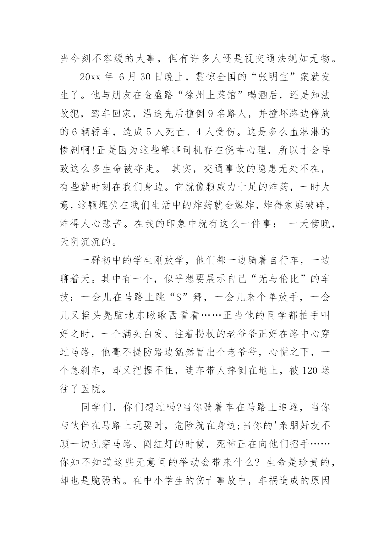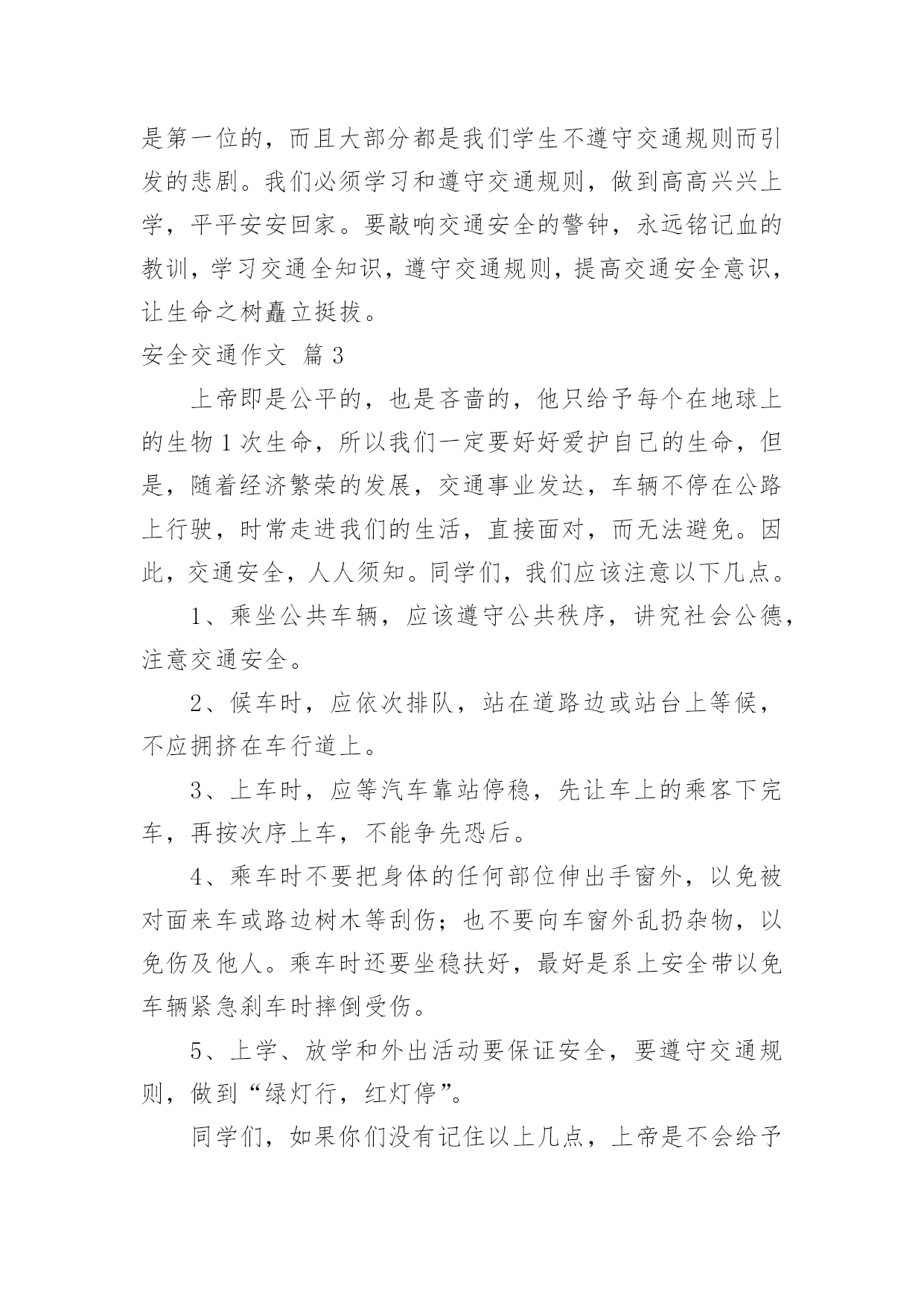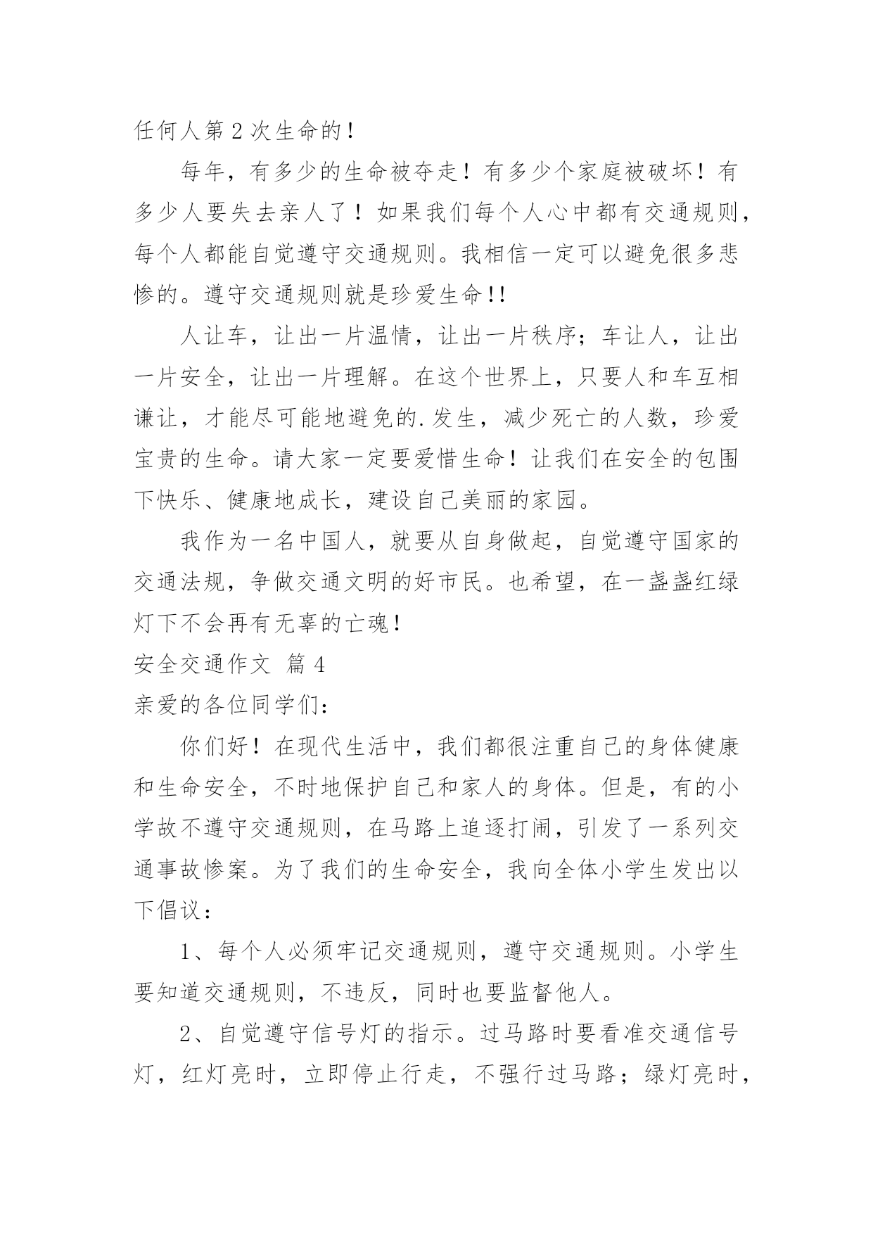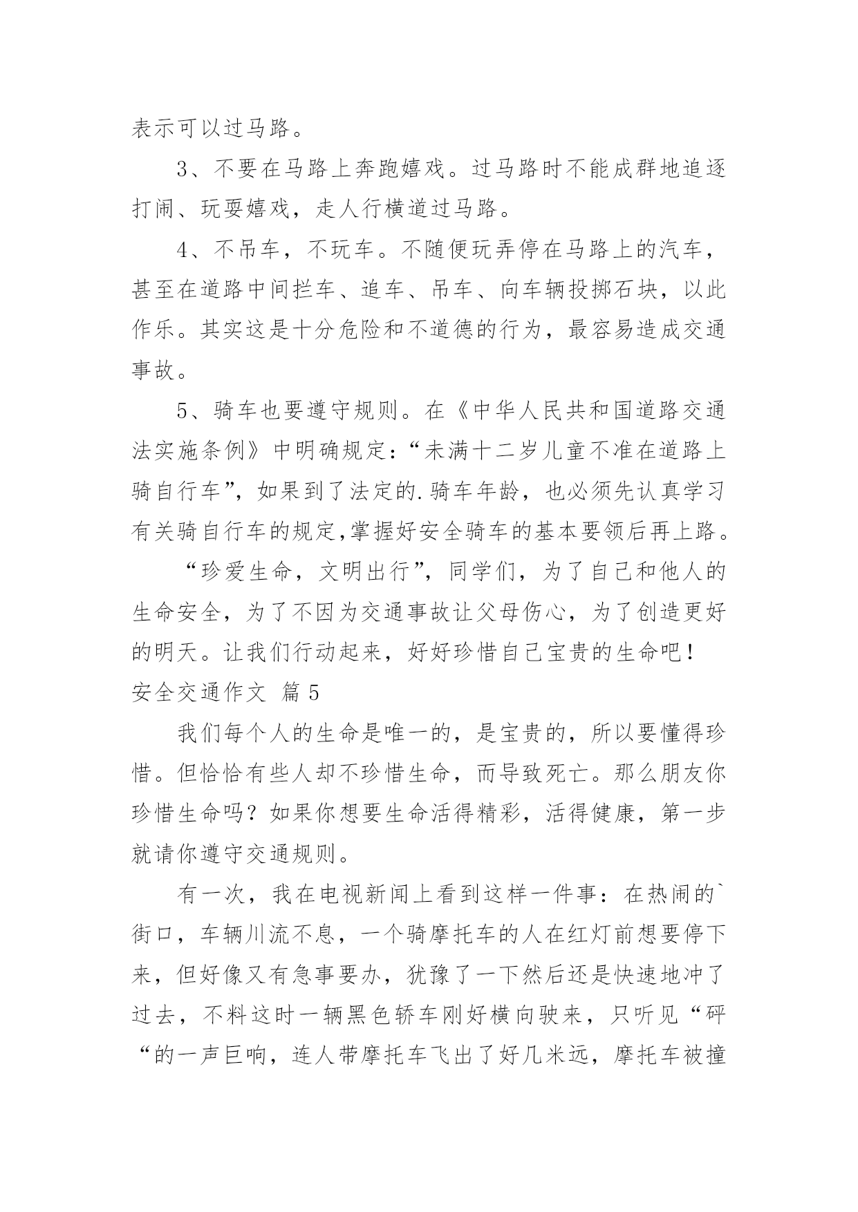 安全交通作文安全交通作文[精选]在学习、工作或生活中,大家一定都接触过作文吧,作文根据体裁的不同可以分为记叙文、说明文、应用文、议论文。怎么写作文才能避免踩雷呢?下面是小编为大家收集的安全交通作文9篇,欢迎大家分享。安全交通作文篇1今天火红的太阳从西边落下,明天可以从东边徐徐升起;小树嫩绿的叶子枯了可以再绿;花儿谢了可以在开……但是,人的生命却是一去不复返了,所以,我们要珍爱生命,珍爱生命就要从身边的小事做起。今天下午,我们班吴老师打开电视机,给我们播放了一些交通安全知识的图片,我看完后,便产生了深深的感想街上有些车都帖有“宁停三分,不抢一秒”的.标语吧,可谁能做到呢?除非是看到交警才制约一点,可一离开交警的视线,又有多少人会遵守交通规则呢?还有戴安全帽的问题,大人说小孩子戴不戴安全帽都没关系,反正有不罚款。难道你们戴安全帽就是为了不被罚款的话,那你们就大错特错了,你们也不想想,安全帽那安全两个字就是保护你的意思啊!你们说小孩子不用带安全帽,难道你们大人和小孩出了交通事故,就只有大人摔倒,难道小孩就不会了吗?所以,我们一定要自觉,只有自觉才是为生命带来了无形的保险。”为了保证自己的生命安全,我们必须紧记交通规则,比如:1、走路要走人行道,过马路要走斑马线,还有做好“红灯停,绿灯行”的原则。2、不能在马路上玩耍,如:踢足球,追逐打闹等等的危险游戏。3、不能在喝酒喝到有晕晕迷迷和疲惫不堪的状态下开车,因为这样一不小心就会出交通事故了。4、开车是不能超速,超载,不然就可能刹车失灵。后果自己知道。5、下车应先看反光镜,没有反光镜的要前后看过,认定没危险才能下车……我们的生命只有一条,人的生死并不只在于交通,但只要我们遵守国家制定的安全规则就不会有危险,不然就会白白浪费了一次宝贵的生命,那是很愚蠢的事情,所以我祝大家:“身体健康,万事如意。安全交通作文篇2交通安全记心中随着科技的发展,社会的进步,人们的交通出行方式也越来越丰富多彩。一条条宽敞的大道上车水马龙,来往行人摩肩接踵……构成了一幅繁荣昌盛的五彩画卷。可是,正因为国家强盛了,所以许多交通事故也变得层出不穷,它们逐渐“飞入寻常百姓家”,造成了无数惨不忍睹的事故。“人最宝贵的、是生命,生命对于每个人只有一次”。现实生活中,许多人在一系列交通事故中丢失了生命。因而,遵守交通法规已成为了当今刻不容缓的大事,但有许多人还是视交通法规如无物。20xx年6月30日晚上,震惊全国的“张明宝”案就发生了。他与朋友在金盛路“徐州土菜馆”喝酒后,还是知法故犯,驾车回家,沿途先后撞倒9名路人,并撞坏路边停放的6辆轿车,造成5人死亡、4人受伤。这是多么血淋淋的惨剧啊!正是因为这些肇事司机存在侥幸心理,所以才会导致这么多生命被夺走。其实,交通事故的隐患无处不在,有些就时刻在我们身边。它就像颗威力十足的炸药,一时大意,这颗埋伏在我们生活中的炸药就会爆炸,炸得家庭破碎,炸得人心悲苦。在我的印象中就有这么一件事:一天傍晚,天阴沉沉的。一群初中的学生刚放学,他们都一边骑着自行车,一边聊着天。其中有一个,似乎想要展示自己“无与伦比”的车技:一会儿在马路上跳“S”舞,一会儿来个单放手,一会儿又摇头晃脑地东瞅瞅西看看……正当他的同学都拍手叫好之时,一个满头白发、拄着拐杖的老爷爷正好在路中心穿过马路,他毫不提防路边猛然冒出个老爷爷,心慌之下,一个急刹车,却又把握不住,连车带人摔倒在地上,被120送往了医院。同学们,你们想过吗?当你骑着车在马路上追逐,当你与伙伴在马路上玩耍时,危险就在身边;当你的'亲朋好友不顾一切乱穿马路、闯红灯的时候,死神正在向他们招手……你知不知道这些无意间的举动会带来什么?生命是珍贵的,却也是脆弱的。在中小学生的伤亡事故中,车祸造成的原因是第一位的,而且大部分都是我们学生不遵守交通规则而引发的悲剧。我们必须学习和遵守交通规则,做到高高兴兴上学,平平安安回家。要敲响交通安全的警钟,永远铭记血的教训,学习交通全知识,遵守交通规则,提高交通安全意识,让生命之树矗立挺拔。安全交通作文篇3上帝即是公平的,也是吝啬的,他只给予每个在地球上的生物1次生命,所以我们一定要好好爱护自己的生命,但是,随着经济繁荣的发展,交通事业发达,车辆不停在公路上行驶,时常走进我们的生活,直接面对,而无法避免。因此,交通安全,人人须知。同学们,我们应该注意以下几点。1、乘坐公共车辆,应该遵守公共秩序,讲究社会公德,注意交通安全。2、候车时,应依次排队,站在道路边或站台上等候,不应拥挤在车行道上。3、上车时,应等汽车靠站停稳,先让车上的乘客下完车,再按次序上车,不能争先恐后。4、乘车时不要把身体的任何部位伸出手窗外,以免被对面来车或路边树木等刮伤;也不要向车窗外乱扔杂物,以免伤及他人。乘车时还要坐稳扶好,最好是系上安全带以免车辆紧急