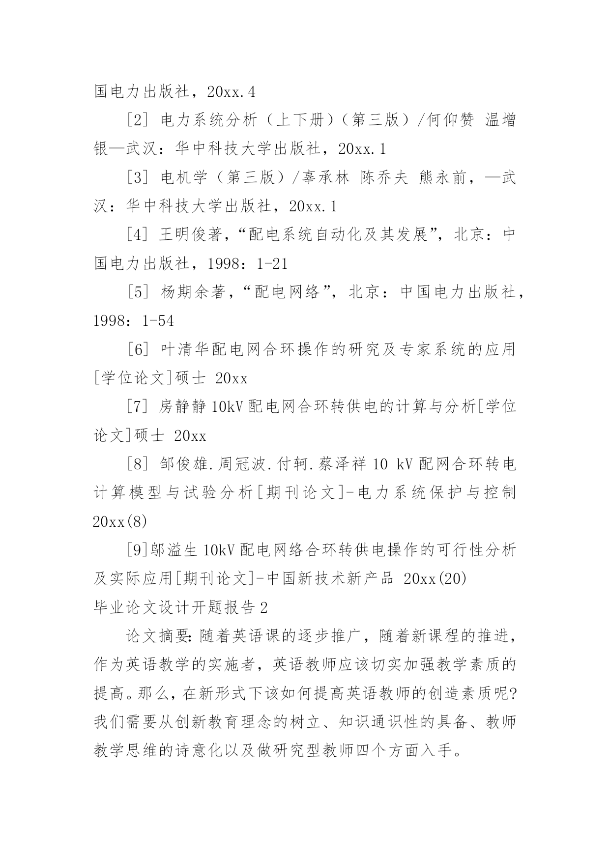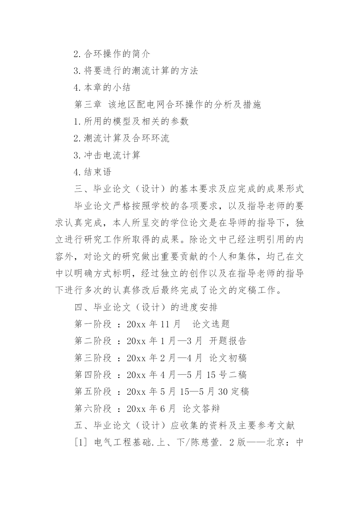 毕业论文设计开题报告毕业论文设计开题报告在人们越来越注重自身素养的今天,报告的适用范围越来越广泛,报告包含标题、正文、结尾等。其实写报告并没有想象中那么难,下面是小编帮大家整理的毕业论文设计开题报告,欢迎大家借鉴与参考,希望对大家有所帮助。毕业论文设计开题报告1课题:基于DG的电磁环网合解环的分析研究学院:学号:姓名:一、毕业论文(设计)题目的来源毕业论文题目结合了我所学的内容,所研究问题的实质和要点,以及老师的指导来最终确定了这个毕业论文的题目。二、毕业论文(设计)应完成的主要内容第一章绪论1.介绍配电网基本内容2.分布式发电系统的基本概念3.自己所做的工作第二章配电网合环研究的现状及其存在的问题1.国内外配电网合环研究的现状2.合环操作的简介3.将要进行的潮流计算的方法4.本章的小结第三章该地区配电网合环操作的分析及措施1.所用的模型及相关的参数2.潮流计算及合环环流3.冲击电流计算4.结束语三、毕业论文(设计)的基本要求及应完成的成果形式毕业论文严格按照学校的各项要求,以及指导老师的要求认真完成,本人所呈交的学位论文是在导师的指导下,独立进行研究工作所取得的成果。除论文中己经注明引用的内容外,对论文的研究做出重要贡献的个人和集体,均己在文中以明确方式标明,经过独立的创作以及在指导老师的指导下进行多次的认真修改后最终完成了论文的定稿工作。四、毕业论文(设计)的进度安排第一阶段:20xx年11月论文选题第二阶段:20xx年1月—3月开题报告第三阶段:20xx年2月—4月论文初稿第四阶段:20xx年4月—5月15号二稿第五阶段:20xx年5月15—5月30定稿第六阶段:20xx年6月论文答辩五、毕业论文(设计)应收集的资料及主要参考文献[1]电气工程基础.上、下/陈慈萱.2版——北京:中国电力出版社,20xx.4[2]电力系统分析(上下册)(第三版)/何仰赞温增银—武汉:华中科技大学出版社,20xx.1[3]电机学(第三版)/辜承林陈乔夫熊永前,—武汉:华中科技大学出版社,20xx.1[4]王明俊著,“配电系统自动化及其发展”,北京:中国电力出版社,1998:1-21[5]杨期余著,“配电网络”,北京:中国电力出版社,1998:1-54[6]叶清华配电网合环操作的研究及专家系统的应用[学位论文]硕士20xx[7]房静静10kV配电网合环转供电的计算与分析[学位论文]硕士20xx[8]邹俊雄.周冠波.付轲.蔡泽祥10kV配网合环转电计算模型与试验分析[期刊论文]-电力系统保护与控制20xx(8)[9]邬溢生10kV配电网络合环转供电操作的可行性分析及实际应用[期刊论文]-中国新技术新产品20xx(20)毕业论文设计开题报告2论文摘要:随着英语课的逐步推广,随着新课程的推进,作为英语教学的实施者,英语教师应该切实加强教学素质的提高。那么,在新形式下该如何提高英语教师的创造素质呢?我们需要从创新教育理念的树立、知识通识性的具备、教师教学思维的诗意化以及做研究型教师四个方面入手。世纪是知识经济时代,更是竞争的时代。在这些竞争中,人是最活跃也是最关键的因素。学校作为培养人才的主阵地,开展创造教育、培养创造性人才已成为新形势下教育发展的必然趋势。而创造教育的实施、创造教育体系的建立最直接的要素是建立一支创造型的教师队伍。那么,新形式下,如何塑造自己的创造素质,做一名创造型的教师呢?树立创新的教育理念教育观念是教育者从理性上认识教育的切入口,我们说,创造教育的实施依赖于教师,但并非所有的教师都能胜任这项教育,必须是具有创造意识、能够进行教育教学创新的教师方可。因为实现创造教育的目标必然要依赖教师的创造性素质和教育创新的实施,教育教学创新意识已成为塑造具有现代教师风采的核心要素。创新的教学观传统的教育观以知识传授作为教学的主要目的,以培养能熟练掌握已有知识的人才作为教育的主要目的,而创新的教育观则针对传统教育观实现了三个转变。第一,将知识传授为主的教育目标转变为增长经验、发展能力为主的教育目的使学生通过以教材为基础而展开的学习活动,获得认识和理解,并将所学知识应用于实际,在知识的应用中激发和培养学生的创造力。第二,将以教师为中心的教学方法转变为注重学生学习主动性的教学方法。创造性的教学鼓励学生对学习的主动参与,使教学成为在教师的引导下,学生对知识主动探索的过程。第三,将严格遵守常规的课堂转变为生动活泼、主动探索的课堂氛围。对于活泼好动的学生,要是过分强调对课堂纪律的遵守,便容易束缚学生的天性,使学生丧失了自由表现的机会和激情。所以英语尤其强调课堂氛围的轻松与活跃,因为只有在这样的氛围中,学生的心理得到放松,思维处于积极状态,创造潜能才能达到最大限度的发挥。建立新型的师生关系具有知识的通识性创造性的学习和教育教学创新都离不开知识作为载体。以