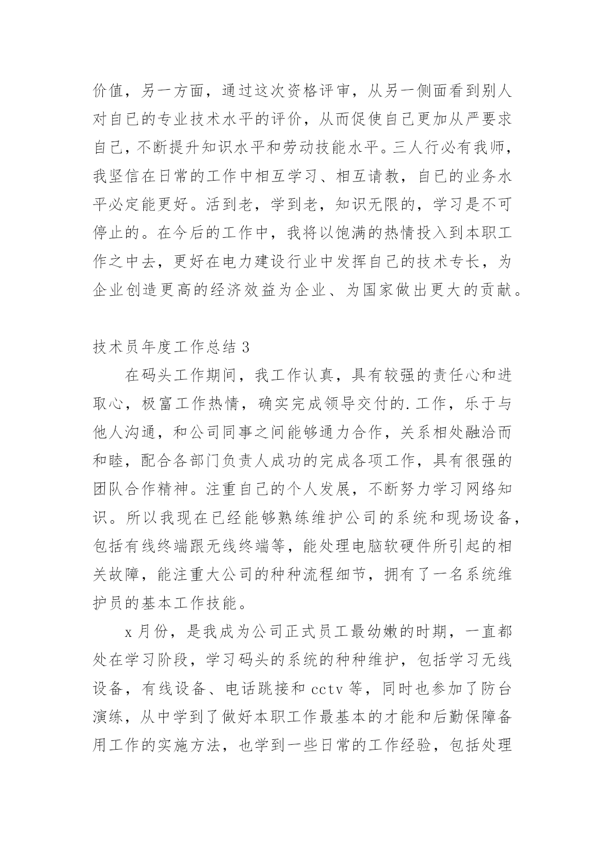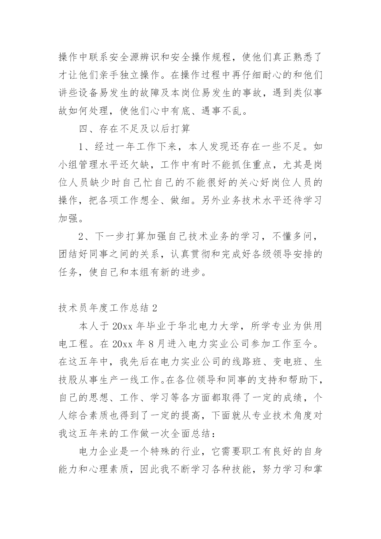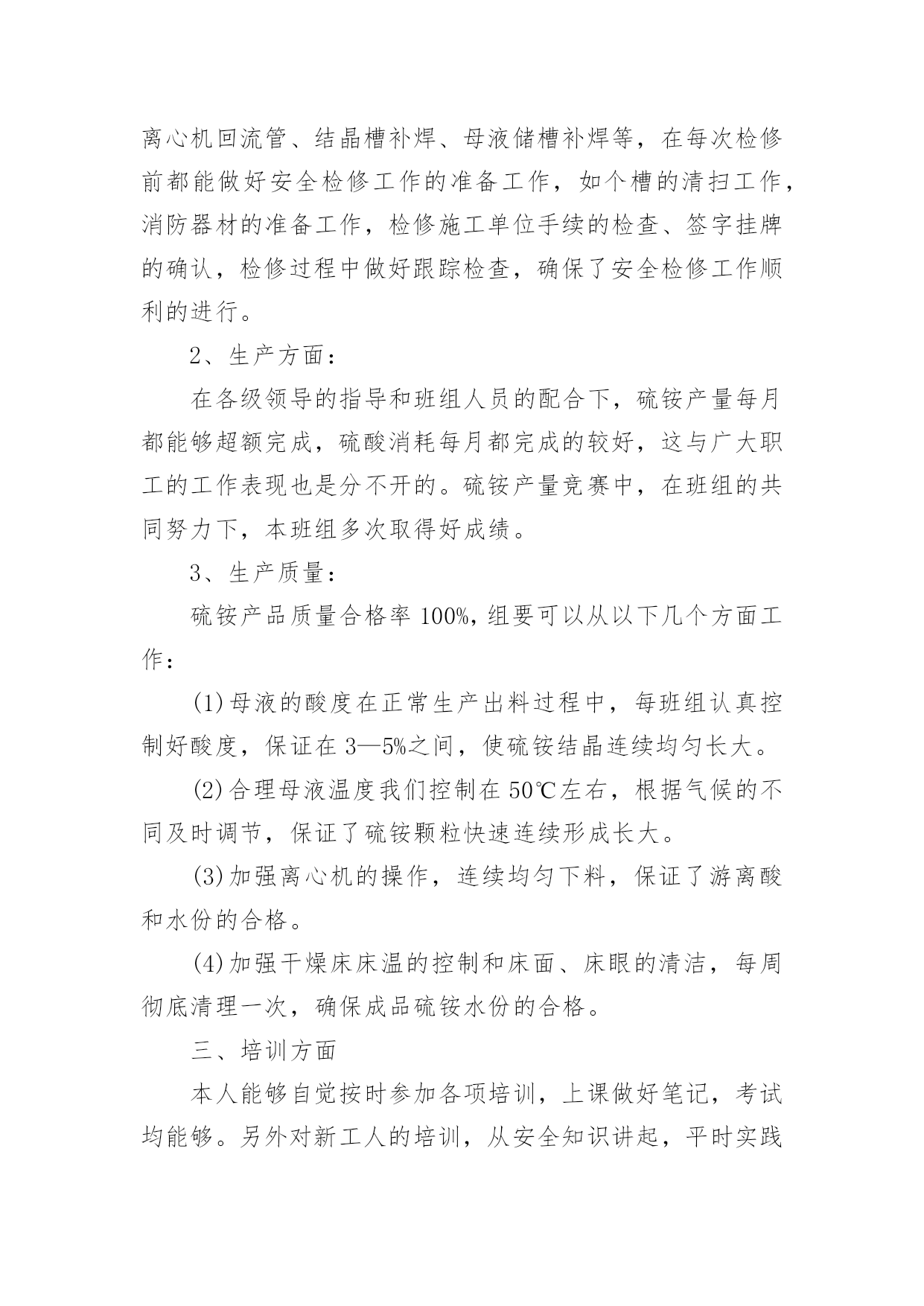 技术员年度工作总结总结就是把一个时段的学习、工作或其完成情况进行一次全面系统的总结,它是增长才干的一种好办法,不如立即行动起来写一份总结吧。如何把总结做到重点突出呢?以下是小编精心整理的技术员年度工作总结,仅供参考,大家一起来看看吧。技术员年度工作总结1转眼20xx年即将过去,回忆即将过去的一年个人的工作,学习了一些新知识,同时发现了一些不足,现将主要工作总结如下:一、劳动纪律,思想作风方面本人能遵守好各项规章制度,按时上下班,无迟到、早退现象。班中不做与工作无关的事严格按照操作规程操作,团结好同事,相互关心并认真贯彻和执行好上级领导的有关文件精神和要求,自觉维护好企业形象。二、安全生产方面1、安全方面:本人上班前能够自觉的穿戴好劳保用品,认真参加各项安全培训,做好笔记。牢固树立起“安全第一,预防为主”的思想,并认真贯彻到每位组员,真正做到生产在忙安全不忘。从而保证了本组各类安全事故为“零”,在1—10月份本班组涉及到危险、一级动火作业几十起,如在焊接满流槽,离心机回流管、结晶槽补焊、母液储槽补焊等,在每次检修前都能做好安全检修工作的准备工作,如个槽的清扫工作,消防器材的准备工作,检修施工单位手续的检查、签字挂牌的确认,检修过程中做好跟踪检查,确保了安全检修工作顺利的进行。2、生产方面:在各级领导的指导和班组人员的配合下,硫铵产量每月都能够超额完成,硫酸消耗每月都完成的较好,这与广大职工的工作表现也是分不开的。硫铵产量竞赛中,在班组的共同努力下,本班组多次取得好成绩。3、生产质量:硫铵产品质量合格率100%,组要可以从以下几个方面工作:(1)母液的酸度在正常生产出料过程中,每班组认真控制好酸度,保证在3—5%之间,使硫铵结晶连续均匀长大。(2)合理母液温度我们控制在50℃左右,根据气候的不同及时调节,保证了硫铵颗粒快速连续形成长大。(3)加强离心机的操作,连续均匀下料,保证了游离酸和水份的合格。(4)加强干燥床床温的控制和床面、床眼的清洁,每周彻底清理一次,确保成品硫铵水份的合格。三、培训方面本人能够自觉按时参加各项培训,上课做好笔记,考试均能够。另外对新工人的培训,从安全知识讲起,平时实践操作中联系安全源辨识和安全操作规程,使他们真正熟悉了才让他们亲手独立操作。在操作过程中再仔细耐心的和他们讲些设备易发生的故障及本岗位易发生的事故,遇到类似事故如何处理,使他们心中有底、遇事不乱。四、存在不足及以后打算1、经过一年工作下来,本人发现还存在一些不足。如小组管理水平还欠缺,工作中有时不能抓住重点,尤其是岗位人员缺少时自己忙自己的不能很好的关心好岗位人员的操作,把各项工作想全、做细。另外业务技术水平还待学习加强。2、下一步打算加强自己技术业务的学习,不懂多问,团结好同事之间的关系,认真贯彻和完成好各级领导安排的任务,使自己和本组有新的进步。技术员年度工作总结2本人于20xx年毕业于华北电力大学,所学专业为供用电工程。在20xx年8月进入电力实业公司参加工作至今。在这五年中,我先后在电力实业公司的线路班、变电班、生技股从事生产一线工作。在各位领导和同事的支持和帮助下,自己的思想、工作、学习等各方面都取得了一定的成绩,个人综合素质也得到了一定的提高,下面就从专业技术角度对我这五年来的工作做一次全面总结:电力企业是一个特殊的行业,它需要职工有良好的自身能力和心理素质,因此我不断学习各种技能,努力学习和掌握电力系统运行方式及其特点,了解全地区的配电网运行情况,同时能根据各类电气设备的需要,掌握相关的电工基础、电工材料、高压工程技术专业知识,能根据现场电气设备运行情况选择运行方式及经济运行方法,根据实际运行经验,正确处理电气系统的设备故障以及系统突发性事故,初步了解班组管理和生产技术管理的基本常识,进一步加强自己的业务水平。一、学习生产运行专业知识,提高岗位劳动技能。从20xx年参加工作,领导为了让我尽快转变角色,熟悉工作环境,适应生产要求,我先后被分配至电力实业公司的线路班和变电班从事线路架设、电缆敷设、高压试验、继保及变电检修等工作。工作伊始,我发现学校里学到的专业知识同生产实际有很大的不同和差距。为此我努力学习生产运行专业知识,努力提高自己的岗位劳动技能,在短短的一年内,我主动吸收老师傅们的工作经验,虚心向他们请教工作中的技术问题,并通过自己的努力,迅速掌握了线路和变电运行的生产程序及各种一、二次设备的规范、参数。二、从事施工设计和技术管理工作。20xx年年底,我被分配到电力实业公司生技股,主要负责输配电线路的设计和施工。此时,正是农网改造初期,工作量十分大,在时间紧任务重的形势下,我边工作边学习,很快就步入了正规。首先跟随老师傅们勤下现场,并对照自己原有的各项知识使自己的理论知识和实践更好的结合,一方面放弃休息时间利用各种资料进行