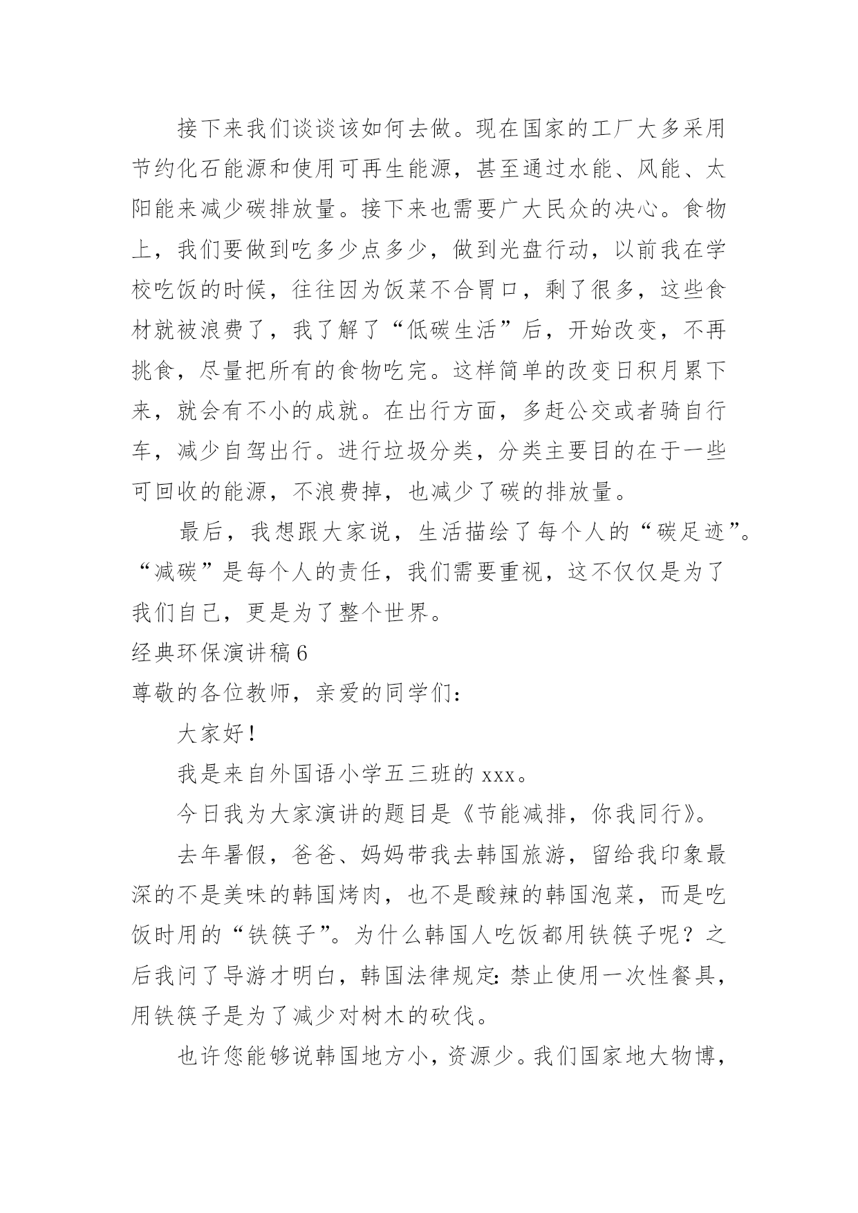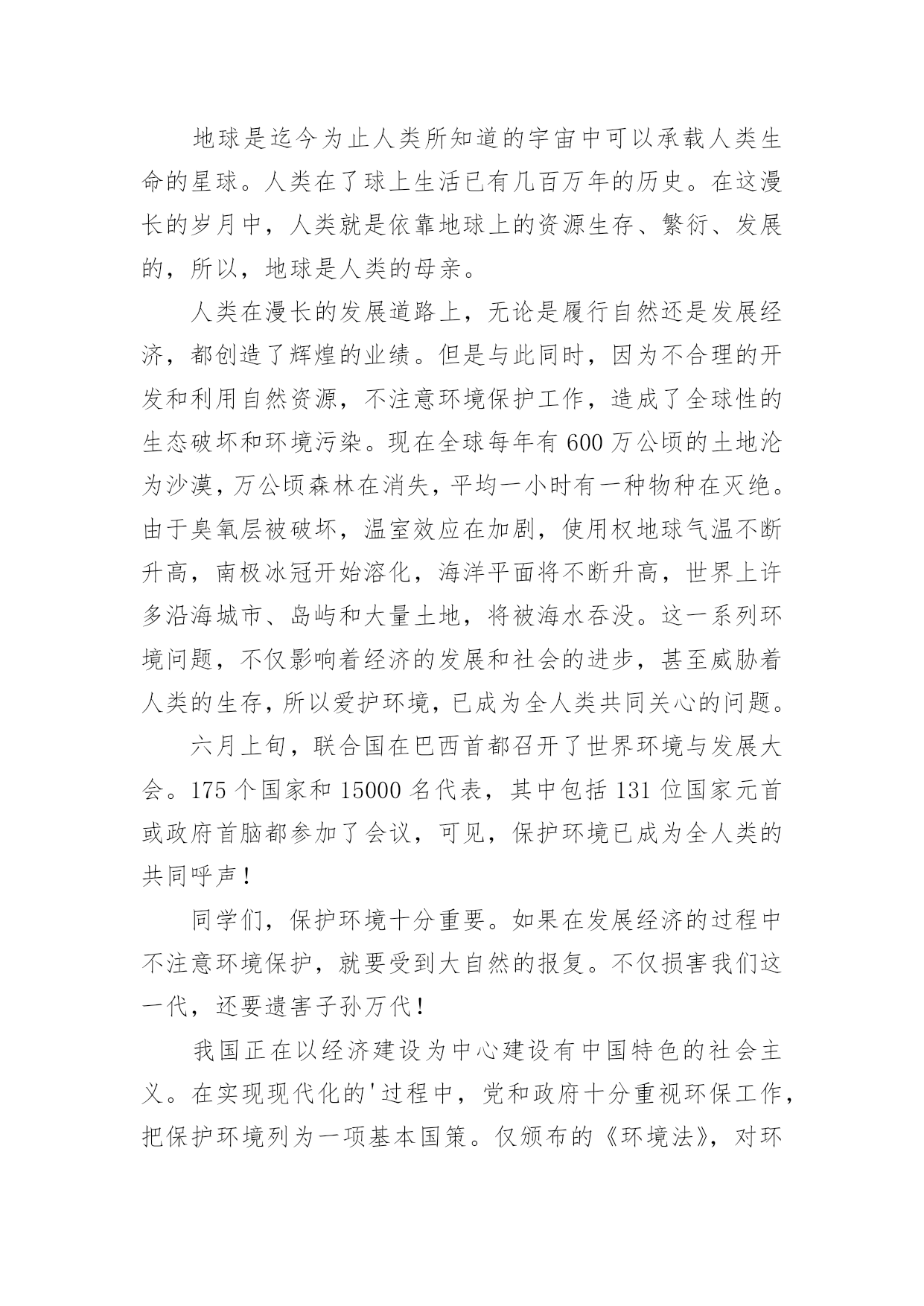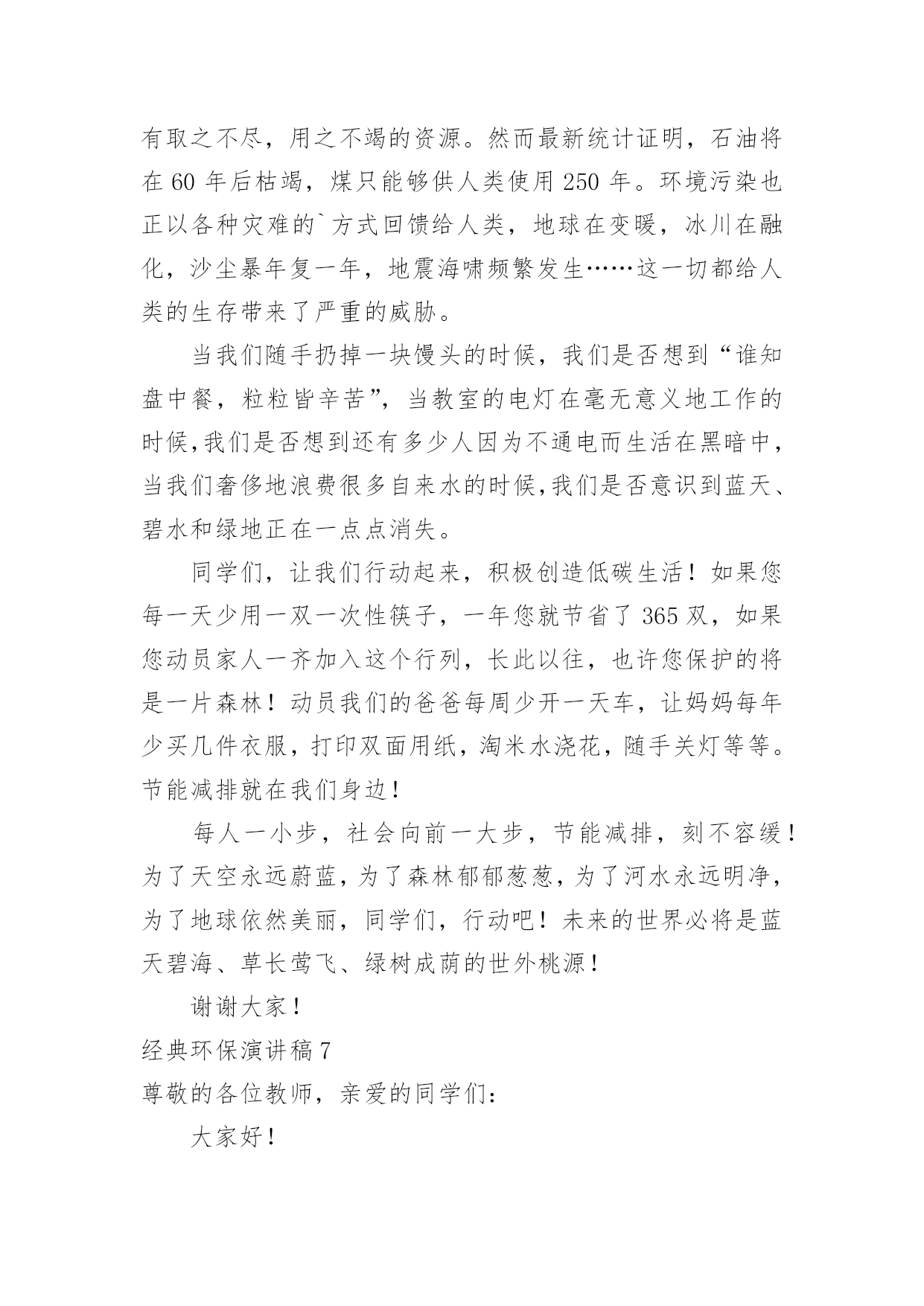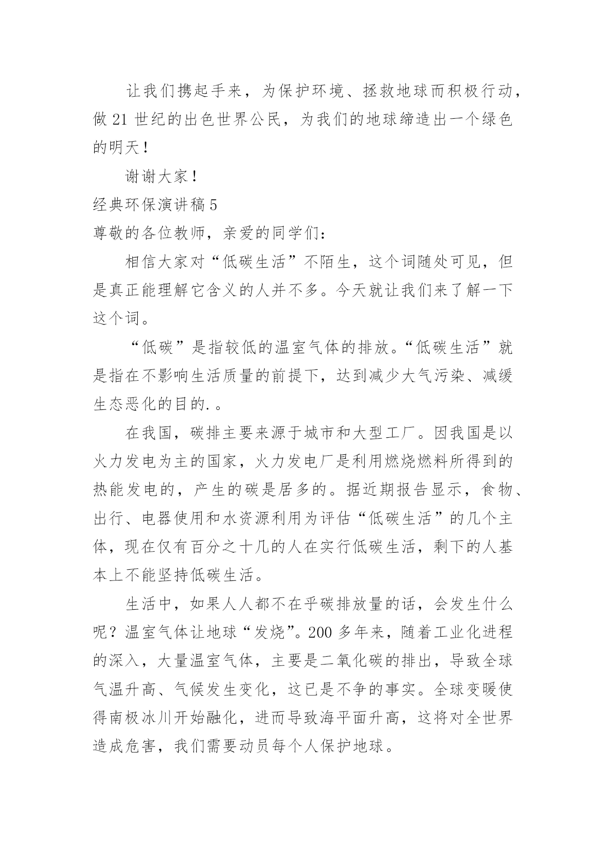 环保演讲稿经典环保演讲稿演讲稿可以按照用途、性质等来划分,是演讲上一个重要的准备工作。在我们平凡的日常里,需要使用演讲稿的事情愈发增多,那么一般演讲稿是怎么写的呢?下面是小编为大家收集的经典环保演讲稿,供大家参考借鉴,希望可以帮助到有需要的朋友。经典环保演讲稿1全体少先队员们:春天到了,万物复苏,小鸟也从远方飞来了。为了保护益鸟益虫,保护生态平衡,我建议全体少先队员开展“爱护动物,保护树木”的活动。一、现在夏天即将到来,青蛙正在不断繁殖,许多卖青蛙的人又做起了缺德的事情,胡乱的捕杀青蛙,当大家发现的`时候,一定要及时制止。二、在放学或者上学的路上,发现珍稀动物时,不可自作主张,把拉回家自己饲养,一定要向有关部门报告。三、不掏鸟窝,不拿鸟蛋,每个人利用课余时间为鸟做人工鸟窝,引鸟儿在自己的家乡安家落户。全体少先队员们,让我们行动起来,为保护环境,保护大自然作出一份努力吧!经典环保演讲稿2敬爱的老师,亲爱的同学们:大家好!从我做起!地球上的人口越来越多,人类必须要更好地保护环境。这样,人们才能长期生存在地球上。可是,随着各类工厂日渐增多,污染也随之而来,工厂所放出的污染和废气,更是有害人类和环境。可有些工厂的老板,为了自我赚黑心钱,而不顾他人的.健康,真是太可恶了!还有那些吃便当的人们、吃完随手乱扔垃圾。更有那些随便乱砍、乱伐的人们。请,所有这些有缺点的人们,必须改掉这个不道德的坏习惯!所以,我们要大声地呼吁世界上所有的人们,从小事做起,从我做起,从此刻做起!人人都要严格大胆地监督,抓住重罚,决不手软!尤其是工厂的老板们!保护环境,人人有责!这样,环境慢慢地又能够变回从前那个没有污染,随处可触的清新空气。还有那清澈见底一眼就能瞧见河底有几种石子的颜色。更能随处可见那美丽、花草树木的风采!啊!人们又能够回到从前那个美丽、无污染的大自然中去。经典环保演讲稿3各位同学:大家好,我是xx班的xxx。近年来,随着经济的快速发展,经济与环境的矛盾日益尖锐,水体污染,沙尘肆虐,水土流失,洪涝干旱,环境污染与破坏已严重威胁到人类的健康与生存。作为21世纪的主人,每个同学更要有保护环境的时代责任感。现在我们虽然还是学生,但是,我们可以从身边小事做起,从爱护学校环境做起,“心系全球,着眼身边,立足校园”。我们要从节约一张纸、一滴水、一度电、一粒米做起,争做“低碳一族”,养成节能环保习惯,享受绿色健康生活,呵护人类共同家园。我国主要电力的生产方式依然是火力发电站,在生产电能的过程中需要燃烧大量的煤炭和冷却用水,其中产生的碳排放量依然相当可观。火力发电站生产一度电大约需要花费千克标准煤和4升冷却用水,相应产生千克的二氧化碳、千克二氧化硫、千克氮氧化物以及千克碳粉尘。而一度电可以让25瓦的电灯连续点亮40小时,或保证一台冰箱运转24小时。在我们学校中仍有长明灯现象,学生洗手水龙头开的过大;餐厅饭菜乱倒,有一种行为俗称“眼大肚子小”,买饭菜过多吃不了或不合自己胃口随手倒掉。“勿以善小而不为,勿以恶小而为之”。我们每个人都应该养成良好的卫生习惯。我们不仅仅停留在,捡起一片纸;打扫一堆垃圾;珍惜一株花木;爱护一棵小草。作为高中生的我们可以这样做:1、看到光线充足,能主动把教室里灯关掉。2、看见自来水龙头没关紧,你能上前动手把它能拧紧;3、就餐时吃多少买多少,不攀比,不浪费,不吃零食,尽量减少餐巾纸的使用;生活垃圾要分类,便于回收利用。4、没使用完的作业本可以用作草稿,纸张双面尽量用,笔芯用完再换;5、多走路、多骑自行车、多乘公交车。6、少买不必要的衣服。一件普通的衣服从原料到成衣再到最终被遗弃,都在排放二氧化碳。少买一件不必要的衣服就可以减少二氧化碳排放。另外,棉质衣服比化纤衣服排碳量少,多穿棉质衣服多穿校服也是低碳生活的'一部分。如果能做到以上这些,那你就是一名节约资源、践行低碳生活的好学生……“低碳一族”正以自己生活细节的改变证明:气候变化已经不再只是环保主义者、政府官员和专家学者关心的问题,而是与我们每个人息息相关。在提倡健康生活已成潮流的今天,“低碳生活”不再只是一种理想,更是一种值得期待的新的生活方式。让我们积极行动起来,从你我做起,从小事做起,从身边做起,从现在做起。以实际行动来爱护我们美丽的校园。经典环保演讲稿4尊敬的各位教师,亲爱的同学们:大家好!环境保护对我们来说并不是一个新问题,我国政府也早就提出了明确的治理目标。作为现实生活中的每一个普通人,虽然不可能都直接从事环保工作,但我们完全可以从小事做起,从我做起。当看到洗手间的水龙头在滴水时,是不是能够举手关上呢?当电池用完后能否分类收藏处理而不是随手扔掉呢?当购物时能否自觉不使用超薄塑料袋呢?一件件小事虽然都很不起眼,但却体现我们究竟具备了多少环保意识。人类对环境的`保护,归根结底是基于保护