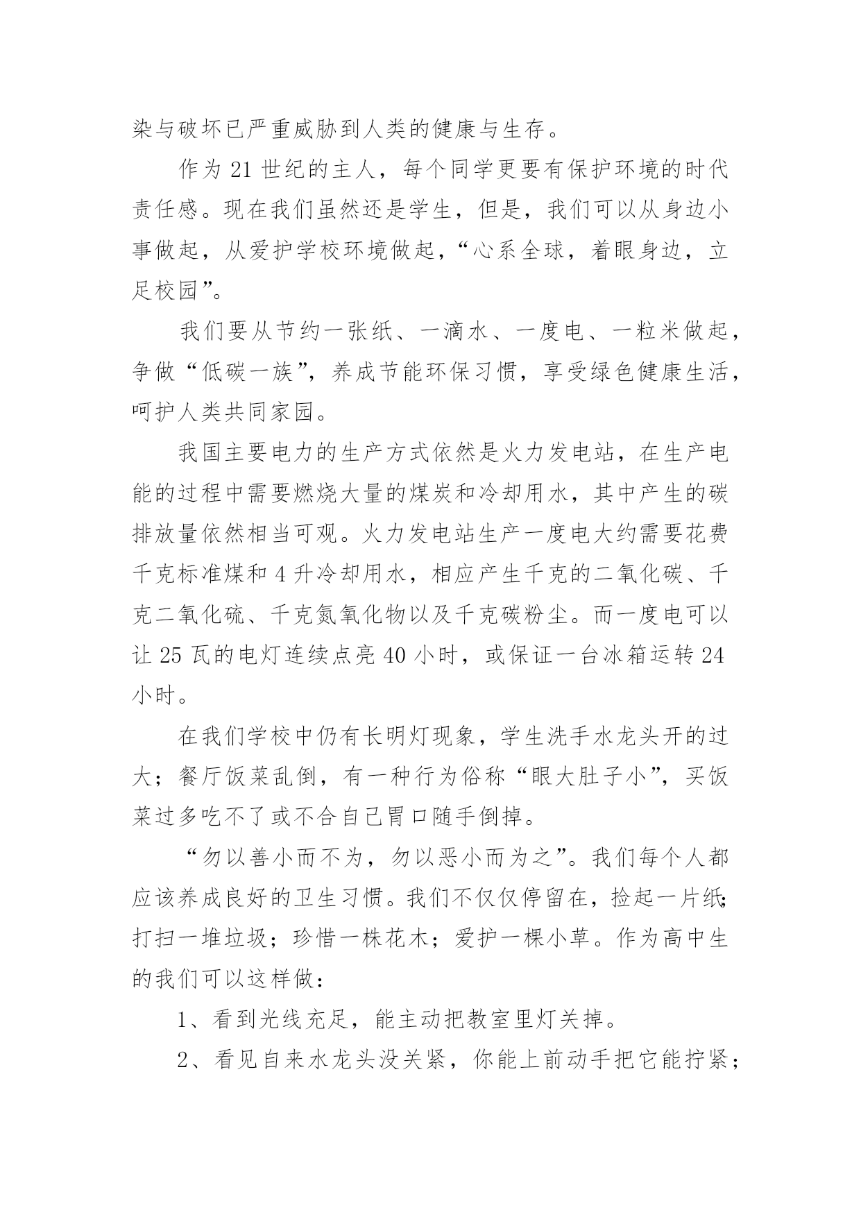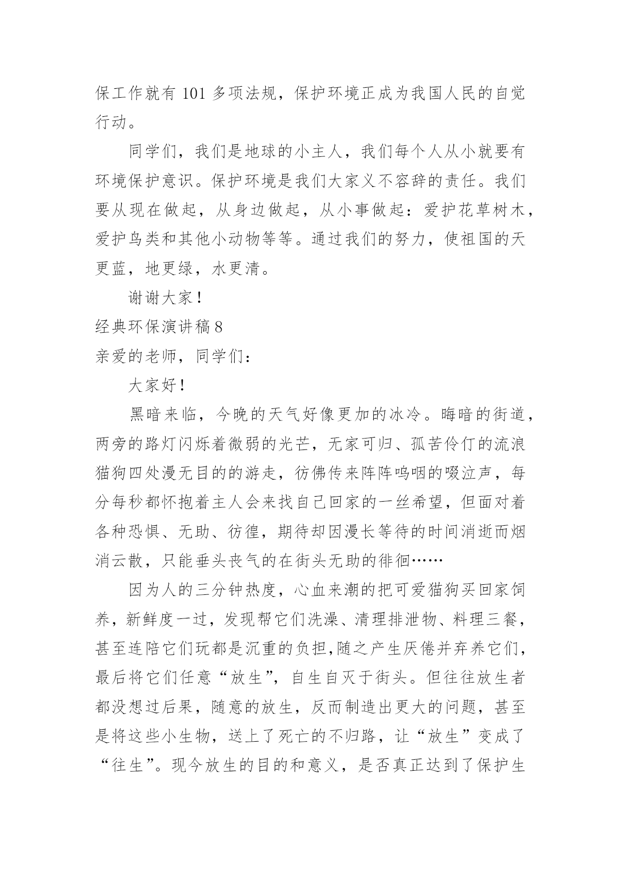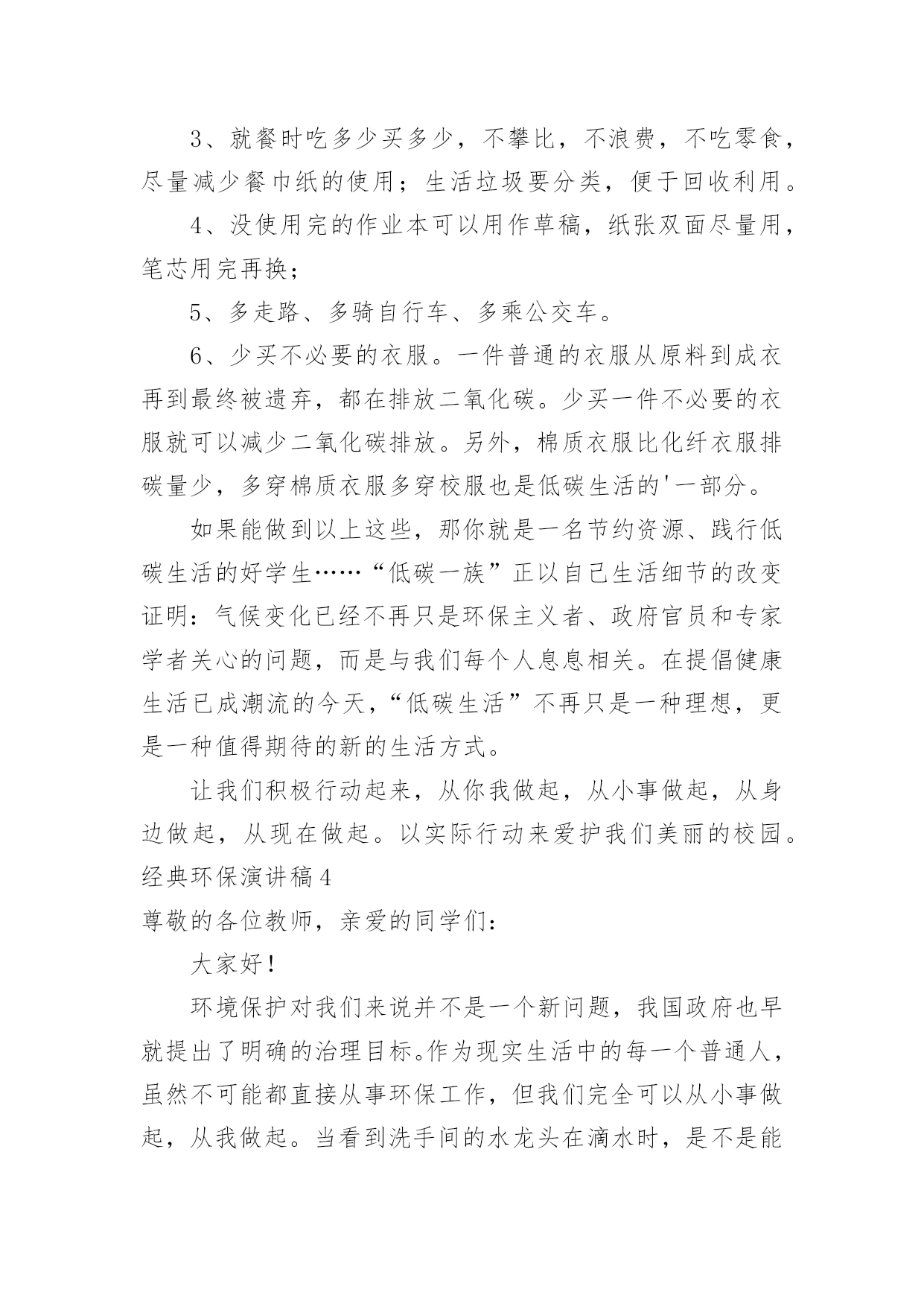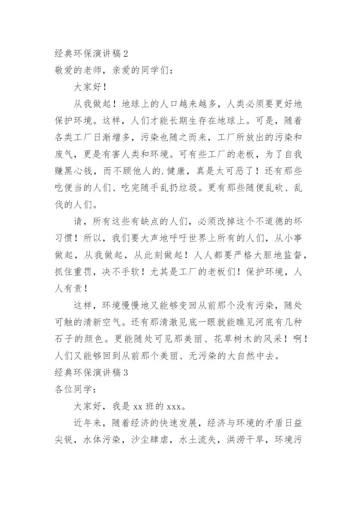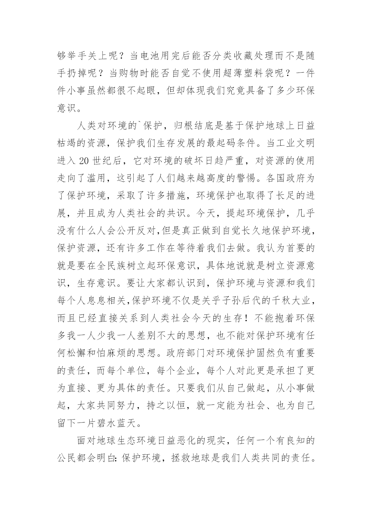 环保演讲稿经典环保演讲稿演讲稿可以按照用途、性质等来划分,是演讲上一个重要的准备工作。在我们平凡的日常里,需要使用演讲稿的事情愈发增多,那么一般演讲稿是怎么写的呢?下面是小编为大家收集的经典环保演讲稿,供大家参考借鉴,希望可以帮助到有需要的朋友。经典环保演讲稿1全体少先队员们:春天到了,万物复苏,小鸟也从远方飞来了。为了保护益鸟益虫,保护生态平衡,我建议全体少先队员开展“爱护动物,保护树木”的活动。一、现在夏天即将到来,青蛙正在不断繁殖,许多卖青蛙的人又做起了缺德的事情,胡乱的捕杀青蛙,当大家发现的`时候,一定要及时制止。二、在放学或者上学的路上,发现珍稀动物时,不可自作主张,把拉回家自己饲养,一定要向有关部门报告。三、不掏鸟窝,不拿鸟蛋,每个人利用课余时间为鸟做人工鸟窝,引鸟儿在自己的家乡安家落户。全体少先队员们,让我们行动起来,为保护环境,保护大自然作出一份努力吧!经典环保演讲稿2敬爱的老师,亲爱的同学们:大家好!从我做起!地球上的人口越来越多,人类必须要更好地保护环境。这样,人们才能长期生存在地球上。可是,随着各类工厂日渐增多,污染也随之而来,工厂所放出的污染和废气,更是有害人类和环境。可有些工厂的老板,为了自我赚黑心钱,而不顾他人的.健康,真是太可恶了!还有那些吃便当的人们、吃完随手乱扔垃圾。更有那些随便乱砍、乱伐的人们。请,所有这些有缺点的人们,必须改掉这个不道德的坏习惯!所以,我们要大声地呼吁世界上所有的人们,从小事做起,从我做起,从此刻做起!人人都要严格大胆地监督,抓住重罚,决不手软!尤其是工厂的老板们!保护环境,人人有责!这样,环境慢慢地又能够变回从前那个没有污染,随处可触的清新空气。还有那清澈见底一眼就能瞧见河底有几种石子的颜色。更能随处可见那美丽、花草树木的风采!啊!人们又能够回到从前那个美丽、无污染的大自然中去。经典环保演讲稿3各位同学:大家好,我是xx班的xxx。近年来,随着经济的快速发展,经济与环境的矛盾日益尖锐,水体污染,沙尘肆虐,水土流失,洪涝干旱,环境污染与破坏已严重威胁到人类的健康与生存。作为21世纪的主人,每个同学更要有保护环境的时代责任感。现在我们虽然还是学生,但是,我们可以从身边小事做起,从爱护学校环境做起,“心系全球,着眼身边,立足校园”。我们要从节约一张纸、一滴水、一度电、一粒米做起,争做“低碳一族”,养成节能环保习惯,享受绿色健康生活,呵护人类共同家园。我国主要电力的生产方式依然是火力发电站,在生产电能的过程中需要燃烧大量的煤炭和冷却用水,其中产生的碳排放量依然相当可观。火力发电站生产一度电大约需要花费千克标准煤和4升冷却用水,相应产生千克的二氧化碳、千克二氧化硫、千克氮氧化物以及千克碳粉尘。而一度电可以让25瓦的电灯连续点亮40小时,或保证一台冰箱运转24小时。在我们学校中仍有长明灯现象,学生洗手水龙头开的过大;餐厅饭菜乱倒,有一种行为俗称“眼大肚子小”,买饭菜过多吃不了或不合自己胃口随手倒掉。“勿以善小而不为,勿以恶小而为之”。我们每个人都应该养成良好的卫生习惯。我们不仅仅停留在,捡起一片纸;打扫一堆垃圾;珍惜一株花木;爱护一棵小草。作为高中生的我们可以这样做:1、看到光线充足,能主动把教室里灯关掉。2、看见自来水龙头没关紧,你能上前动手把它能拧紧;3、就餐时吃多少买多少,不攀比,不浪费,不吃零食,尽量减少餐巾纸的使用;生活垃圾要分类,便于回收利用。4、没使用完的作业本可以用作草稿,纸张双面尽量用,笔芯用完再换;5、多走路、多骑自行车、多乘公交车。6、少买不必要的衣服。一件普通的衣服从原料到成衣再到最终被遗弃,都在排放二氧化碳。少买一件不必要的衣服就可以减少二氧化碳排放。另外,棉质衣服比化纤衣服排碳量少,多穿棉质衣服多穿校服也是低碳生活的'一部分。如果能做到以上这些,那你就是一名节约资源、践行低碳生活的好学生……“低碳一族”正以自己生活细节的改变证明:气候变化已经不再只是环保主义者、政府官员和专家学者关心的问题,而是与我们每个人息息相关。在提倡健康生活已成潮流的今天,“低碳生活”不再只是一种理想,更是一种值得期待的新的生活方式。让我们积极行动起来,从你我做起,从小事做起,从身边做起,从现在做起。以实际行动来爱护我们美丽的校园。经典环保演讲稿4尊敬的各位教师,亲爱的同学们:大家好!环境保护对我们来说并不是一个新问题,我国政府也早就提出了明确的治理目标。作为现实生活中的每一个普通人,虽然不可能都直接从事环保工作,但我们完全可以从小事做起,从我做起。当看到洗手间的水龙头在滴水时,是不是能够举手关上呢?当电池用完后能否分类收藏处理而不是随手扔掉呢?当购物时能否自觉不使用超薄塑料袋呢?一件件小事虽然都很不起眼,但却体现我们究竟具备了多少环保意识。人类对环境的`保护,归根结底是基于保护