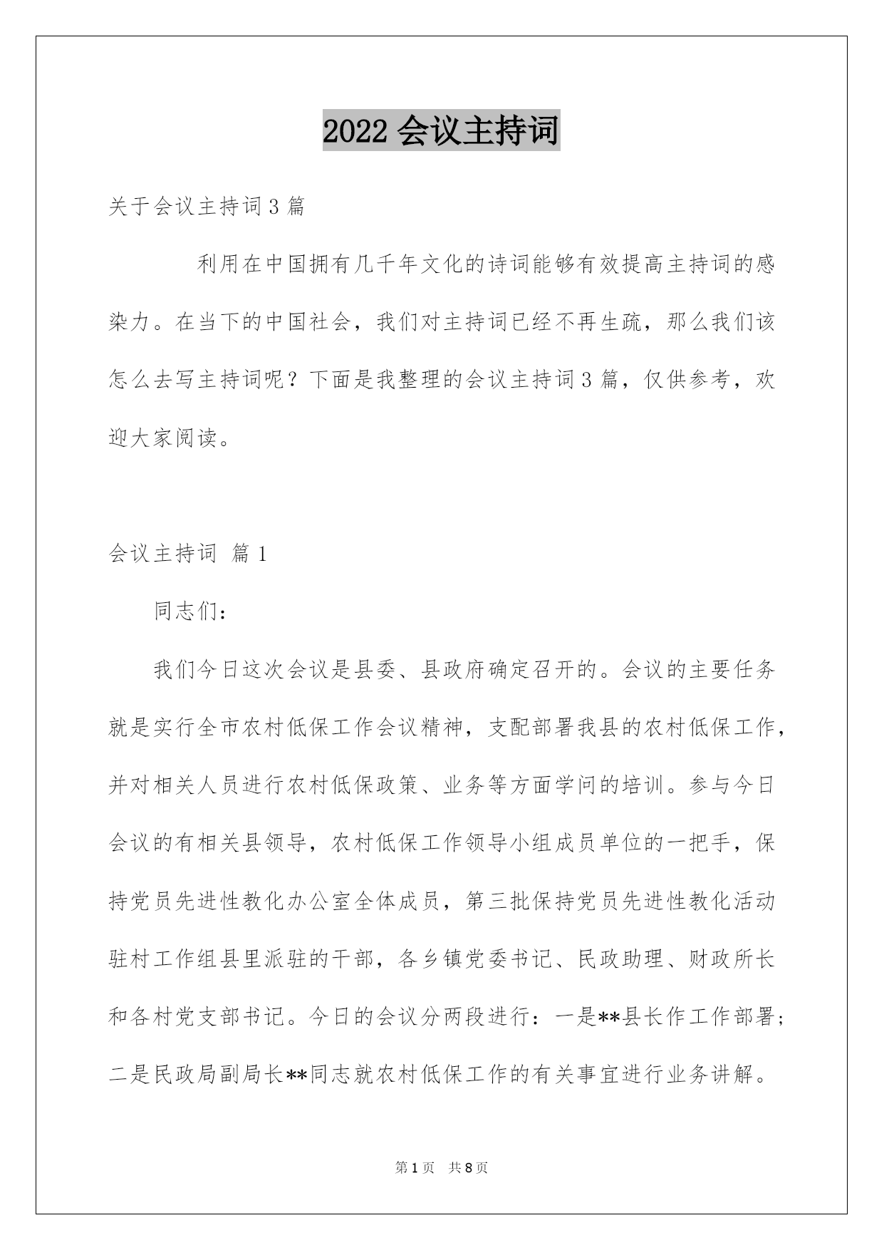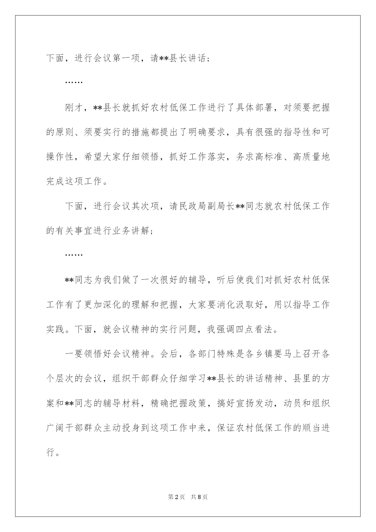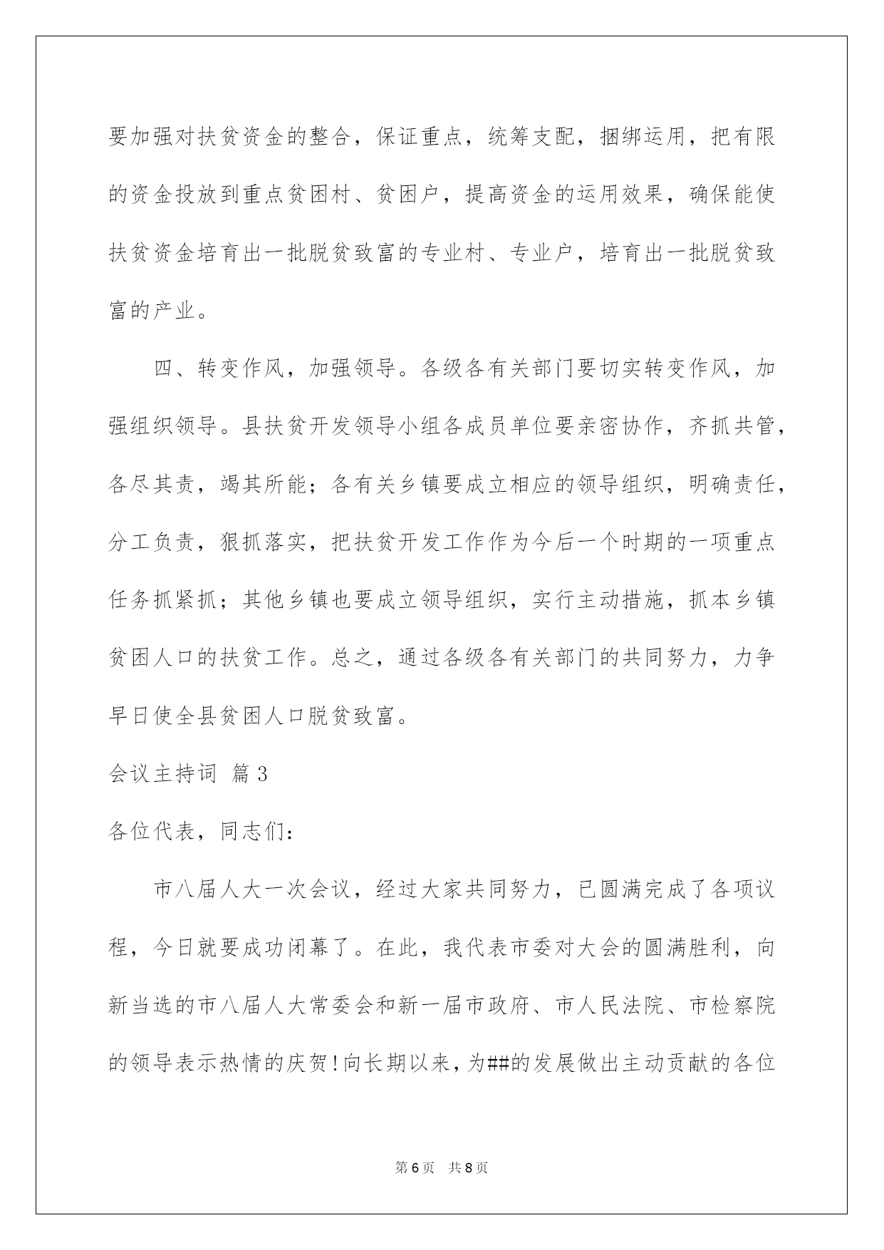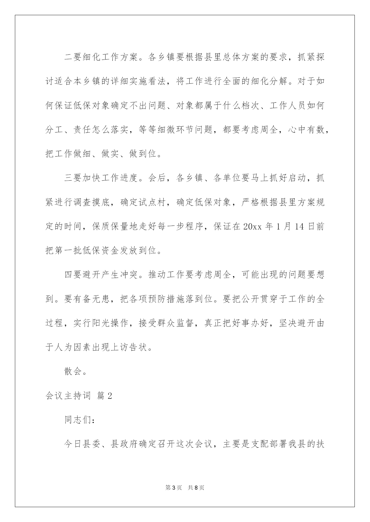 第PAGE\*Arabic\*MERGEFORMAT8页共NUMPAGES\*Arabic\*MERGEFORMAT8页第PAGE\*MERGEFORMAT8页共NUMPAGES\*MERGEFORMAT8页第PAGE\*MERGEFORMAT8页共NUMPAGES\*MERGEFORMAT8页第PAGE\*MERGEFORMAT8页共NUMPAGES\*MERGEFORMAT8页第PAGE\*MERGEFORMAT8页共NUMPAGES\*MERGEFORMAT8页第PAGE\*MERGEFORMAT8页共NUMPAGES\*MERGEFORMAT8页第PAGE\*MERGEFORMAT8页共NUMPAGES\*MERGEFORMAT8页第PAGE\*MERGEFORMAT8页共NUMPAGES\*MERGEFORMAT8页第PAGE\*MERGEFORMAT8页共NUMPAGES\*MERGEFORMAT8页第PAGE\*MERGEFORMAT8页共NUMPAGES\*MERGEFORMAT8页第PAGE\*MERGEFORMAT8页共NUMPAGES\*MERGEFORMAT8页2022会议主持词关于会议主持词3篇利用在中国拥有几千年文化的诗词能够有效提高主持词的感染力。在当下的中国社会,我们对主持词已经不再生疏,那么我们该怎么去写主持词呢?下面是我整理的会议主持词3篇,仅供参考,欢迎大家阅读。会议主持词篇1同志们:我们今日这次会议是县委、县政府确定召开的。会议的主要任务就是实行全市农村低保工作会议精神,支配部署我县的农村低保工作,并对相关人员进行农村低保政策、业务等方面学问的培训。参与今日会议的有相关县领导,农村低保工作领导小组成员单位的一把手,保持党员先进性教化办公室全体成员,第三批保持党员先进性教化活动驻村工作组县里派驻的干部,各乡镇党委书记、民政助理、财政所长和各村党支部书记。今日的会议分两段进行:一是**县长作工作部署;二是民政局副局长**同志就农村低保工作的有关事宜进行业务讲解。下面,进行会议第一项,请**县长讲话;……刚才,**县长就抓好农村低保工作进行了具体部署,对须要把握的原则、须要实行的措施都提出了明确要求,具有很强的指导性和可操作性,希望大家仔细领悟,抓好工作落实,务求高标准、高质量地完成这项工作。下面,进行会议其次项,请民政局副局长**同志就农村低保工作的有关事宜进行业务讲解;……**同志为我们做了一次很好的辅导,听后使我们对抓好农村低保工作有了更加深化的理解和把握,大家要消化汲取好,用以指导工作实践。下面,就会议精神的实行问题,我强调四点看法。一要领悟好会议精神。会后,各部门特殊是各乡镇要马上召开各个层次的会议,组织干部群众仔细学习**县长的讲话精神、县里的方案和**同志的辅导材料,精确把握政策,搞好宣扬发动,动员和组织广阔干部群众主动投身到这项工作中来,保证农村低保工作的顺当进行。二要细化工作方案。各乡镇要根据县里总体方案的要求,抓紧探讨适合本乡镇的详细实施看法,将工作进行全面的细化分解。对于如何保证低保对象确定不出问题、对象都属于什么档次、工作人员如何分工、责任怎么落实,等等细微环节问题,都要考虑周全,心中有数,把工作做细、做实、做到位。三要加快工作进度。会后,各乡镇、各单位要马上抓好启动,抓紧进行调查摸底,确定试点村,确定低保对象,严格根据县里方案规定的时间,保质保量地走好每一步程序,保证在20xx年1月14日前把第一批低保资金发放到位。四要避开产生冲突。推动工作要考虑周全,可能出现的问题要想到。要有备无患,把各项预防措施落到位。要把公开贯穿于工作的全过程,实行阳光操作,接受群众监督,真正把好事办好,坚决避开由于人为因素出现上访告状。散会。会议主持词篇2同志们:今日县委、县政府确定召开这次会议,主要是支配部署我县的扶贫任务,探讨探究新形势下扶贫开发工作的思路和措施,进一步统一思想,提高相识,明确责任,强化措施,努力把我县的扶贫开发工作推向一个新的台阶。刚才,李县长代表县委、县政府就做扶贫开发工作讲了很的看法,扶贫开发的四个重点乡镇作了表态发言,最终县委孙书记作了重要讲话。孙书记的讲话和李县长讲的看法,对我县扶贫开发工作的任务目标、政策规定和工作措施都提出了明确而详细的要求,四个乡镇的表态发言也都很。为实行这次会议精神,抓扶贫工作的落实,下面再强调几点:一、统一思想,提高相识。扶贫开发是“三农”工作的一项重点工作,它关注的是弱势群体,事关贫困群众的生存与发展,是我们党在贫困地区实践“三个代表”的'详细行动,也是实现农夫共同致富的要求。各