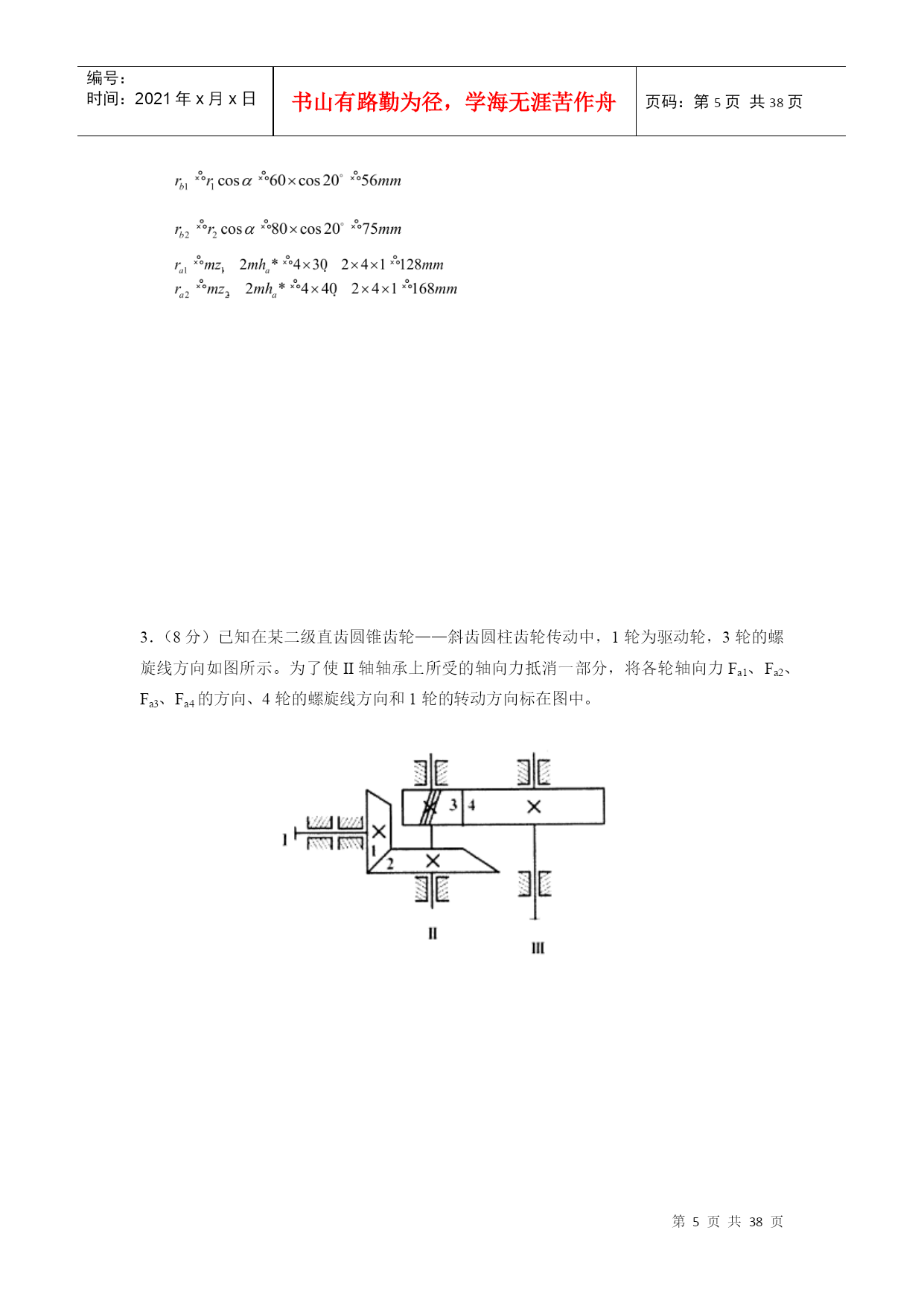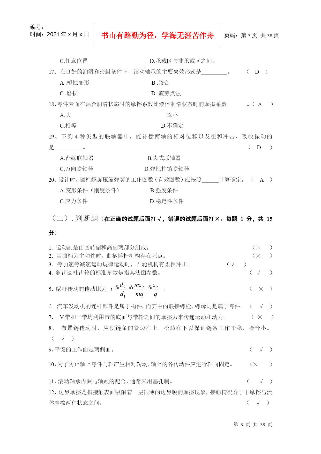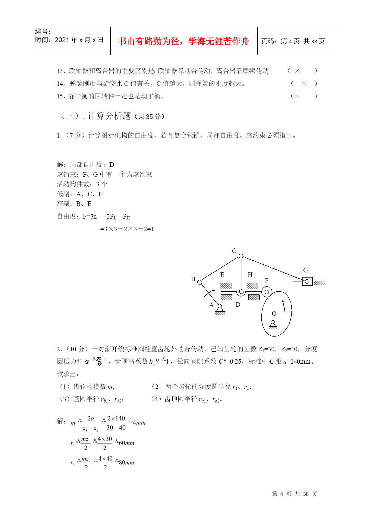 编号:时间:2021年x月x日书山有路勤为径,学海无涯苦作舟页码:第PAGE38页共NUMPAGES38页第PAGE\*MERGEFORMAT38页共NUMPAGES\*MERGEFORMAT38页郑州大学现代远程教育《机械设计基础》课程考核要求说明:本课程考核形式为提交作业,完成后请保存为WORD2003版本格式的文档,登陆学习平台提交,并检查和确认提交成功(能够下载,并且内容无误即为提交成功)。作业要求1.作业题中涉及到的公式、符号以教材为主;2.课程设计题按照课堂上讲的“课程设计任务与要求”完成。设计计算说明书不少于20页。作业内容(一).选择题(在每小题的四个备选答案中选出一个正确的答案,并将正确答案的号码填在题干的括号内,每小题1分,共20分)1.当计算一机构的自由度为3时,该机构需要个主动件才能具有确定的运动。(C)A.0B.1C.3D.52.在平面机构中,每增加一个高副将引入。(C)A.0个约束B.1个约束C.2个约束D.3个约束3.在曲柄摇杆机构中,压力角与传动角的关系为。(C)A.相等B.压力角大于传动角C.互余D.压力角小于传动角4.无急回特性的平面四杆机构,其极位夹角为。(B)A.<B.=C.≥D.>5.在凸轮机构设计中,其压力角越大,传动效率。(A)A.越低B.越高C.不变D.不确定6.一般常用螺栓上的螺纹属于。(A)A.普通螺纹B.管螺纹C.英制螺纹D.矩形螺纹7.齿轮齿廓渐开线的形状取决于其的直径。(D)A.齿顶圆B.齿根圆C.基圆D.分度圆8.闭式软齿面齿轮传动中,齿轮的主要失效形式为。(D)A.齿面胶合B.齿面磨损C.齿根断裂D.齿面点蚀9.普通圆柱蜗杆传动中,蜗杆的标准模数规定在。(B)A.法面B.端面C.中间平面D.任意平面10.常用来传递空间两交错轴运动的齿轮机构是。(D)A.直齿圆柱齿轮B.直齿圆锥齿轮C.斜齿圆锥齿轮D.蜗轮蜗杆11.下列8种机械零件:涡轮的叶片,飞机的螺旋桨,往复式内燃机的曲轴,拖拉机发动机的气门弹簧,起重机的起重吊钩,火车车轮,自行车的链条,纺织机的纱锭。其中有是专用零件。(D)A.3种B.4种C.5种D.6种12、带传动采用张紧轮的目的是_______。(D)A.减轻带的弹性滑动B.提高带的寿命C.改变带的运动方向D.调节带的拉力13、在链传动中,链速的不均匀性主要取决于_______。(C)A.主动链轮齿数B.从动链轮齿数C.链的节距D.链的长度14、当被联接件中有一个厚度较大,而且两被联接件不需要经常拆装的场合,一般选用_______。(B)A.螺栓联接B.螺钉联接C.双头螺柱联接D.紧定螺钉联接15、计算表明某钢制调质处理的轴刚度不够,采用______措施可以提高轴的刚度。(A)A.增加轴的直径尺寸B.用合金钢代替碳素钢C.采用淬火处理D.加大支撑间距16、为了把润滑油导入整个摩擦表面之间,应在轴瓦的开设油沟。(A)A.非承载区B.承载区C.任意位置D.承载区与非承载区之间。17、在良好的润滑和密封条件下,滚动轴承的主要失效形式是。(D)A.塑性变形B.胶合C.磨损D.疲劳点蚀18、零件表面在混合润滑状态时的摩擦系数比液体润滑状态时的摩擦系数。(A)A.大B.小C.相等D.不确定19、下列4种类型的联轴器中,能补偿两轴的相对位移以及缓和冲击、吸收振动的是。(D)A.凸缘联轴器B.齿式联轴器C.万向联轴器D.弹性柱销联轴器20、设计时,圆柱螺旋压缩弹簧的工作圈数(有效圈数)应按照计算确定。(A)A.变形条件(刚度条件)B.强度条件C.应力条件D.稳定性条件(二).判断题(在正确的试题后面打√,错误的试题后面打×。每题1分,共15分)1.运动副是由回转副和高副两部分组成。(×)2.当曲柄为主动件时,曲柄摇杆机构存在死点。(×)3.等加速等减速运动规律运动时,凸轮机构有柔性冲击。(√)4.斜齿圆柱齿轮的标准参数是指其法面参数。(√)5.蜗杆传动的传动比为。(×)6.汽车发动机的连杆部件是属于构件,而其中的联接螺栓、螺母则是属于零件。(√)7、V带和平带均利用带的底面与带轮之间的摩擦力来传递运动和动力。(×)8、布置链传动时,应使链条的紧边在上,松边在下以保证链条工作平稳,噪音小。(√)9、平键的工作面是两侧面。(√)10、为了防止轴上零件与轴产生相对转动,轴上的各传动件应进行轴向固定。(×)11、滚动轴承内圈与轴颈的配合,通常采用基孔制。(√)12、边界摩擦是指接触表面吸附着一层很薄的边界膜的摩擦现象,接触情况介于干摩擦与流体摩擦两种状态之间。(√