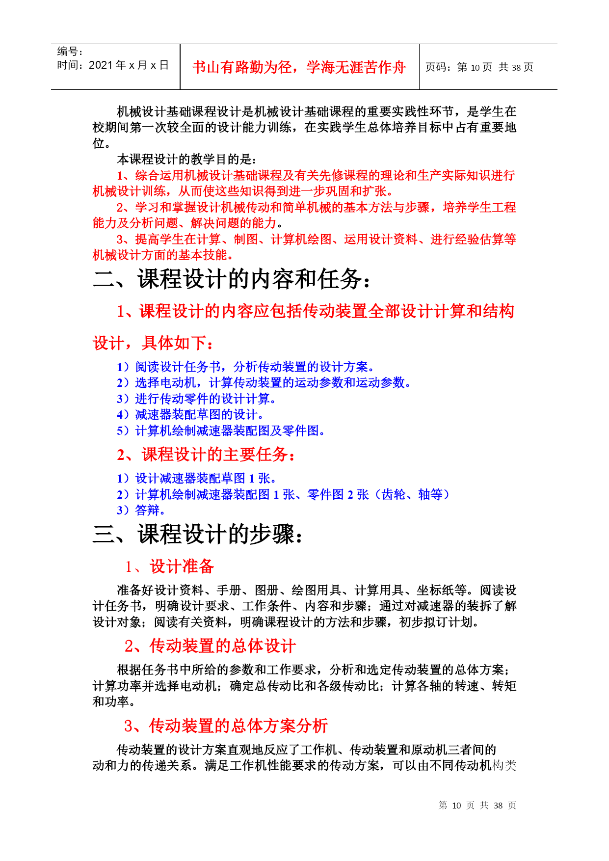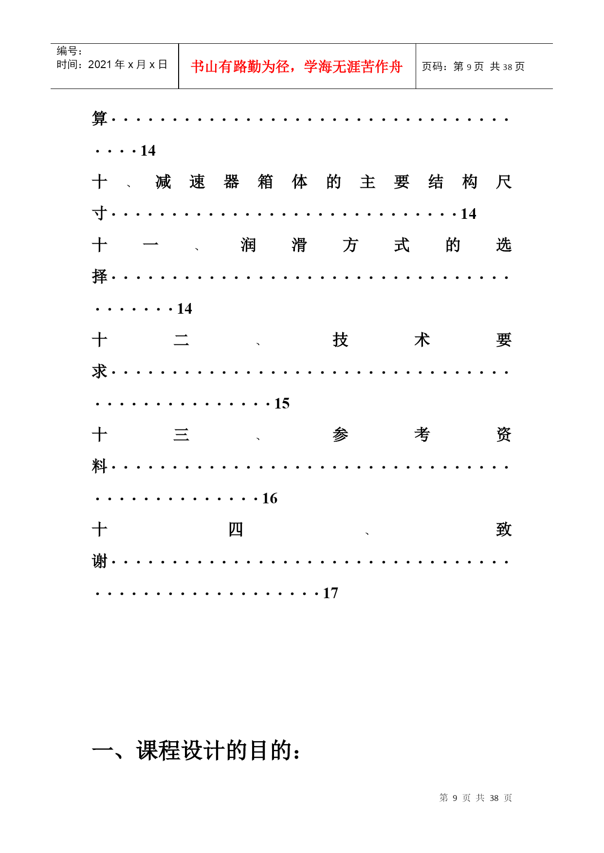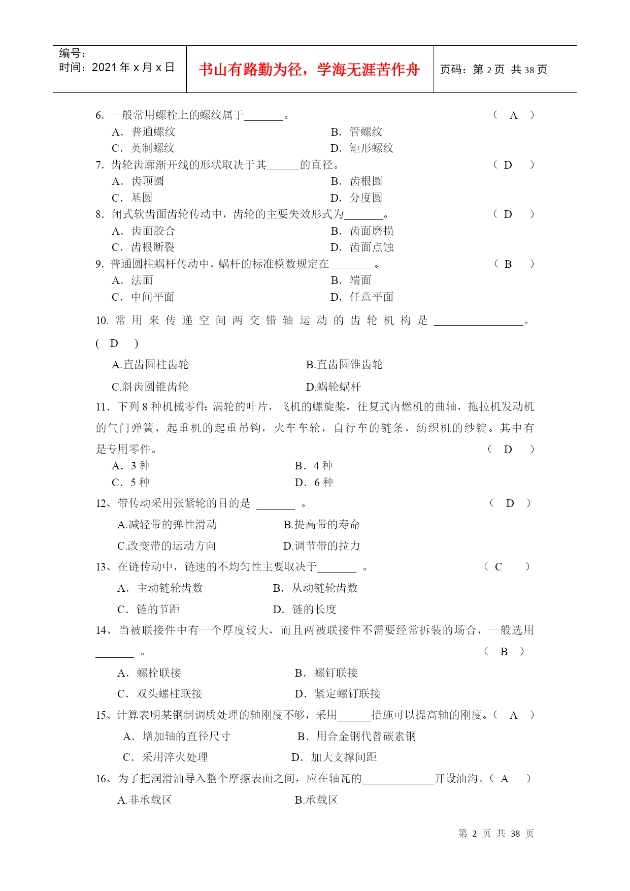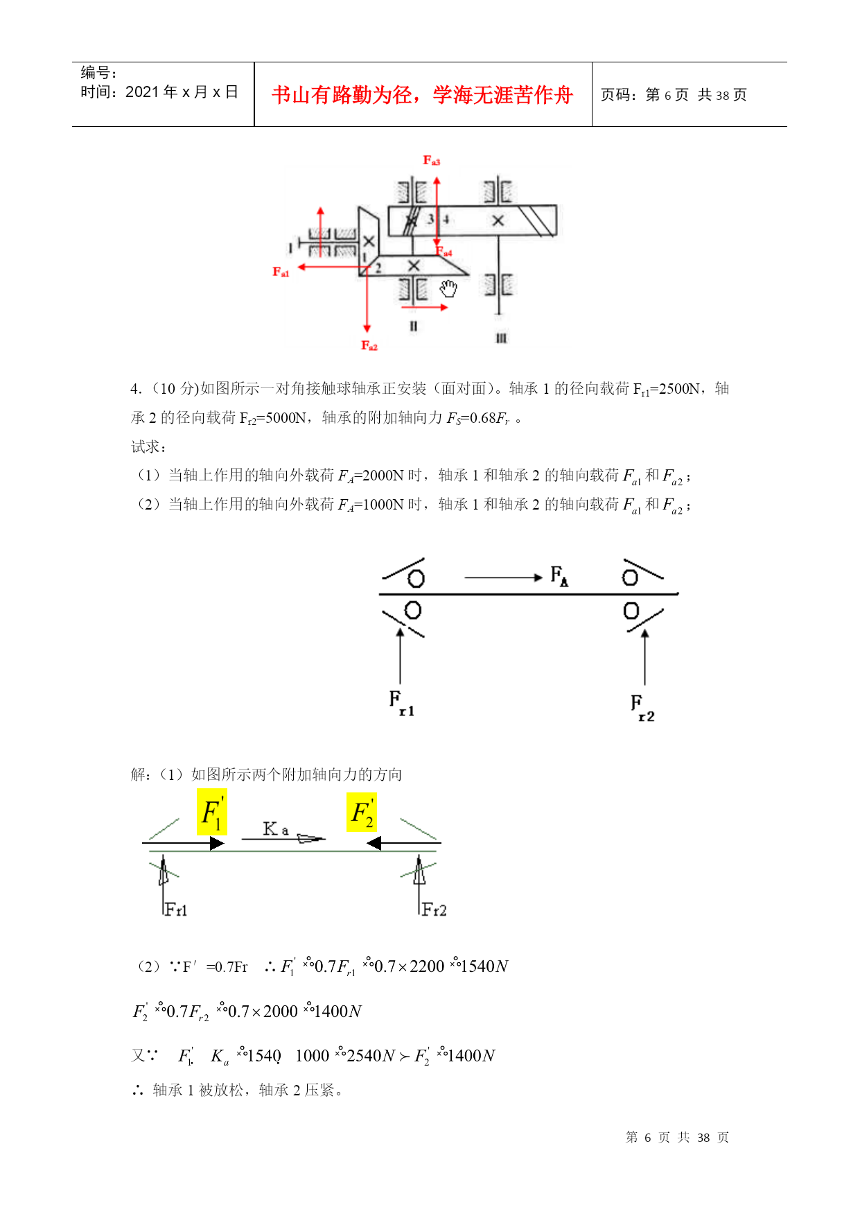 编号:时间:2021年x月x日书山有路勤为径,学海无涯苦作舟页码:第PAGE38页共NUMPAGES38页第PAGE\*MERGEFORMAT38页共NUMPAGES\*MERGEFORMAT38页郑州大学现代远程教育《机械设计基础》课程考核要求说明:本课程考核形式为提交作业,完成后请保存为WORD2003版本格式的文档,登陆学习平台提交,并检查和确认提交成功(能够下载,并且内容无误即为提交成功)。作业要求1.作业题中涉及到的公式、符号以教材为主;2.课程设计题按照课堂上讲的“课程设计任务与要求”完成。设计计算说明书不少于20页。作业内容(一).选择题(在每小题的四个备选答案中选出一个正确的答案,并将正确答案的号码填在题干的括号内,每小题1分,共20分)1.当计算一机构的自由度为3时,该机构需要个主动件才能具有确定的运动。(C)A.0B.1C.3D.52.在平面机构中,每增加一个高副将引入。(C)A.0个约束B.1个约束C.2个约束D.3个约束3.在曲柄摇杆机构中,压力角与传动角的关系为。(C)A.相等B.压力角大于传动角C.互余D.压力角小于传动角4.无急回特性的平面四杆机构,其极位夹角为。(B)A.<B.=C.≥D.>5.在凸轮机构设计中,其压力角越大,传动效率。(A)A.越低B.越高C.不变D.不确定6.一般常用螺栓上的螺纹属于。(A)A.普通螺纹B.管螺纹C.英制螺纹D.矩形螺纹7.齿轮齿廓渐开线的形状取决于其的直径。(D)A.齿顶圆B.齿根圆C.基圆D.分度圆8.闭式软齿面齿轮传动中,齿轮的主要失效形式为。(D)A.齿面胶合B.齿面磨损C.齿根断裂D.齿面点蚀9.普通圆柱蜗杆传动中,蜗杆的标准模数规定在。(B)A.法面B.端面C.中间平面D.任意平面10.常用来传递空间两交错轴运动的齿轮机构是。(D)A.直齿圆柱齿轮B.直齿圆锥齿轮C.斜齿圆锥齿轮D.蜗轮蜗杆11.下列8种机械零件:涡轮的叶片,飞机的螺旋桨,往复式内燃机的曲轴,拖拉机发动机的气门弹簧,起重机的起重吊钩,火车车轮,自行车的链条,纺织机的纱锭。其中有是专用零件。(D)A.3种B.4种C.5种D.6种12、带传动采用张紧轮的目的是_______。(D)A.减轻带的弹性滑动B.提高带的寿命C.改变带的运动方向D.调节带的拉力13、在链传动中,链速的不均匀性主要取决于_______。(C)A.主动链轮齿数B.从动链轮齿数C.链的节距D.链的长度14、当被联接件中有一个厚度较大,而且两被联接件不需要经常拆装的场合,一般选用_______。(B)A.螺栓联接B.螺钉联接C.双头螺柱联接D.紧定螺钉联接15、计算表明某钢制调质处理的轴刚度不够,采用______措施可以提高轴的刚度。(A)A.增加轴的直径尺寸B.用合金钢代替碳素钢C.采用淬火处理D.加大支撑间距16、为了把润滑油导入整个摩擦表面之间,应在轴瓦的开设油沟。(A)A.非承载区B.承载区C.任意位置D.承载区与非承载区之间。17、在良好的润滑和密封条件下,滚动轴承的主要失效形式是。(D)A.塑性变形B.胶合C.磨损D.疲劳点蚀18、零件表面在混合润滑状态时的摩擦系数比液体润滑状态时的摩擦系数。(A)A.大B.小C.相等D.不确定19、下列4种类型的联轴器中,能补偿两轴的相对位移以及缓和冲击、吸收振动的是。(D)A.凸缘联轴器B.齿式联轴器C.万向联轴器D.弹性柱销联轴器20、设计时,圆柱螺旋压缩弹簧的工作圈数(有效圈数)应按照计算确定。(A)A.变形条件(刚度条件)B.强度条件C.应力条件D.稳定性条件(二).判断题(在正确的试题后面打√,错误的试题后面打×。每题1分,共15分)1.运动副是由回转副和高副两部分组成。(×)2.当曲柄为主动件时,曲柄摇杆机构存在死点。(×)3.等加速等减速运动规律运动时,凸轮机构有柔性冲击。(√)4.斜齿圆柱齿轮的标准参数是指其法面参数。(√)5.蜗杆传动的传动比为。(×)6.汽车发动机的连杆部件是属于构件,而其中的联接螺栓、螺母则是属于零件。(√)7、V带和平带均利用带的底面与带轮之间的摩擦力来传递运动和动力。(×)8、布置链传动时,应使链条的紧边在上,松边在下以保证链条工作平稳,噪音小。(√)9、平键的工作面是两侧面。(√)10、为了防止轴上零件与轴产生相对转动,轴上的各传动件应进行轴向固定。(×)11、滚动轴承内圈与轴颈的配合,通常采用基孔制。(√)12、边界摩擦是指接触表面吸附着一层很薄的边界膜的摩擦现象,接触情况介于干摩擦与流体摩擦两种状态之间。(√