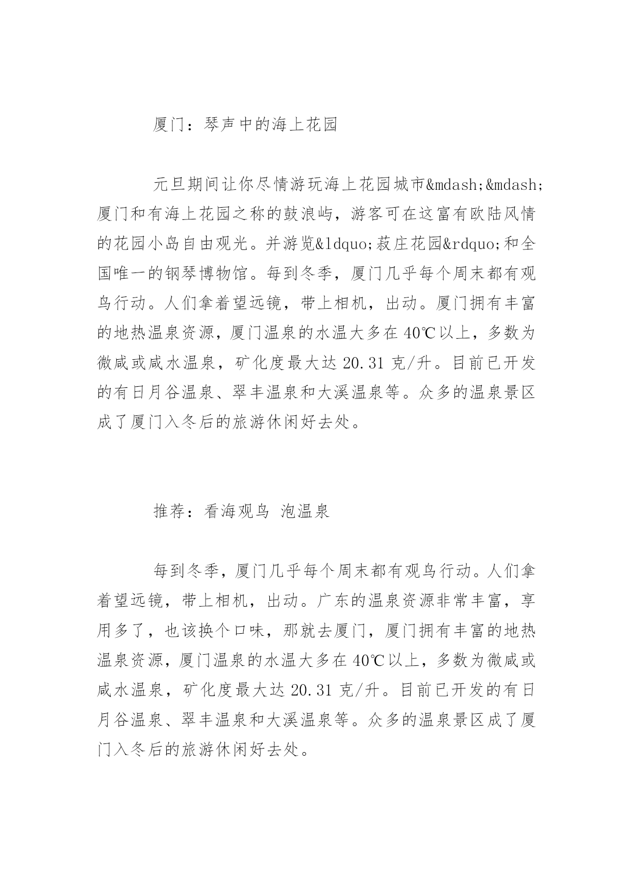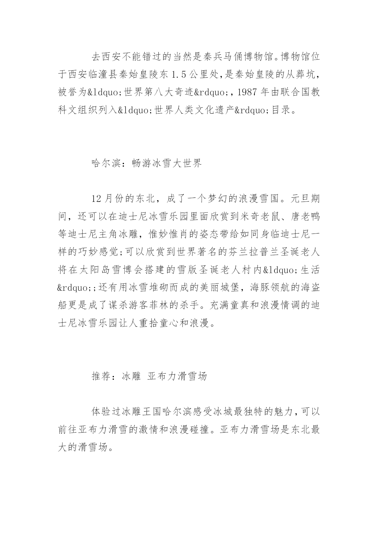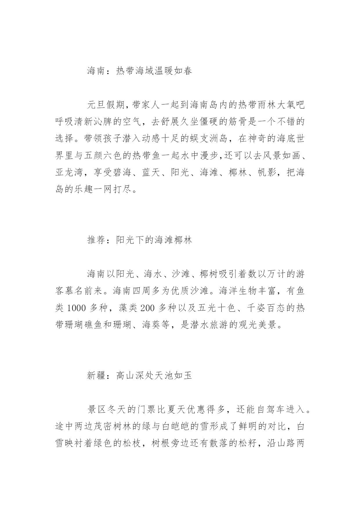 春节去哪里旅游2017春节去哪里旅游2017春节如约而至,打算这个春节带家人出游的朋友可以开始规划这个春节的出游路线了。如果暂时还没有特别想去的地方的话,不妨从这篇2017节旅游好去处中寻找一下灵感!,希望对大家有所帮助!更多内容请关注应届毕业生网!西安:穿越千年古都感受历史厚重西安对于醉心于探寻东方文化和华夏文明源流的游客来说,中原就如同一座浩翰的天然历史博物馆。元旦期间,游客可以在西安参观秦朝兵马俑、游历西安古城,参观陕西博物馆和河南博物院,尽看中原文化经典。还能在法门寺感悟着厚重历史,一切都是那么的惬意。推荐:兵马俑、法门寺等古迹去西安不能错过的当然是秦兵马俑博物馆。博物馆位于西安临潼县秦始皇陵东1.5公里处,是秦始皇陵的从葬坑,被誉为“世界第八大奇迹”,1987年由联合国教科文组织列入“世界人类文化遗产”目录。哈尔滨:畅游冰雪大世界12月份的东北,成了一个梦幻的浪漫雪国。元旦期间,还可以在迪士尼冰雪乐园里面欣赏到米奇老鼠、唐老鸭等迪士尼主角冰雕,惟妙惟肖的姿态带给如同身临迪士尼一样的巧妙感觉;可以欣赏到世界著名的芬兰拉普兰圣诞老人将在太阳岛雪博会搭建的雪版圣诞老人村内“生活”;还有用冰雪堆砌而成的美丽城堡,海豚领航的海盗船更是成了谋杀游客菲林的杀手。充满童真和浪漫情调的迪士尼冰雪乐园让人重拾童心和浪漫。推荐:冰雕亚布力滑雪场体验过冰雕王国哈尔滨感受冰城最独特的魅力,可以前往亚布力滑雪的激情和浪漫碰撞。亚布力滑雪场是东北最大的滑雪场。厦门:琴声中的海上花园元旦期间让你尽情游玩海上花园城市——厦门和有海上花园之称的鼓浪屿,游客可在这富有欧陆风情的花园小岛自由观光。并游览“菽庄花园”和全国唯一的钢琴博物馆。每到冬季,厦门几乎每个周末都有观鸟行动。人们拿着望远镜,带上相机,出动。厦门拥有丰富的地热温泉资源,厦门温泉的水温大多在40℃以上,多数为微咸或咸水温泉,矿化度最大达20.31克/升。目前已开发的有日月谷温泉、翠丰温泉和大溪温泉等。众多的温泉景区成了厦门入冬后的旅游休闲好去处。推荐:看海观鸟泡温泉每到冬季,厦门几乎每个周末都有观鸟行动。人们拿着望远镜,带上相机,出动。广东的温泉资源非常丰富,享用多了,也该换个口味,那就去厦门,厦门拥有丰富的地热温泉资源,厦门温泉的水温大多在40℃以上,多数为微咸或咸水温泉,矿化度最大达20.31克/升。目前已开发的有日月谷温泉、翠丰温泉和大溪温泉等。众多的温泉景区成了厦门入冬后的旅游休闲好去处。九寨沟:冰水交融琉璃世界元旦到九寨沟估计能欣赏银装素裹。雪后放晴时,树正、诺日朗、珍珠滩、箭竹海等瀑布前的每棵树都吊起了冰挂,离瀑布最近的几棵柏树还会挂起冰葫芦。冬日九寨的景色有着冰清玉洁的优雅和纯净,当然它也富于变幻,高纬度银装素裹的山岭峰谷成为冬日里一道洁白的风景线;中纬度的海子上呈现着半冰半水难得一见的美景,犹如艺术大师精心绘出的一幅幅绝伦无比的经典画作。游玩亮点:蓝宝石般的水水是九寨沟的灵魂,冬季到九寨沟看雪,更要看水。因为富含矿物质,这里的水是不结冰的,七彩池水依旧七彩。张扬透明的水像是童话里的.蓝宝石,虽有雪花飘荡其上,依旧不改风采。七彩的水中有长年不烂的枯枝,还有一种无鳞鱼,静静地凝视水面,方才能看到小小银色的鱼儿穿梭。黄山:满山雾凇动静皆宜俗话说“黄山四季皆胜景,唯有腊冬景更佳”,所以元旦是黄山赏景的最佳时期。雪后的黄山,漫山遍野的冰雪之花,如冰雕玉琢,晶莹剔透。尤其是以奇松、怪石、云海、温泉著称于世的“四绝”,更具有独特的山岳风光景观。黄山的动态美则来源于云海。黄山云海最佳去处在玉屏楼前、清凉台上、排云亭、白鹅岭、光明顶。由于元旦时天已寒冷,北方冷空气频频南下,雨雪天气较多,致使山谷底层水汽充沛。雨雪过后极易形成云海,而且凝结的高度一般都在1000米左右,如果遇到晴天,风小,云海比较稳定,有时能持续长达3天之久。云海有时风平浪静,有时虚无飘缈如薄纱,亦会如一铺万顷的平铺云。推荐:雪中的奇松怪石雾凇、雨凇、冰挂是冬季黄山的又一亮点。“凇”,即是云雾滴、雨滴在地面物体上的冻结物,由云雾凝结而成的称为雾凇,由雨滴凝结而成的称为雨凇。雾凇、雨凇有时则凝结成钟乳石般的冰挂,犹如珠帘长垂,风吹树动,冰挂撞击,叮叮当当,宛如一曲曲动听的音乐,和谐有节,清脆悦耳。海南:热带海域温暖如春元旦假期,带家人一起到海南岛内的热带雨林大氧吧呼吸清新沁脾的空气,去舒展久坐僵硬的筋骨是一个不错的选择。带领孩子潜入动感十足的蜈支洲岛,在神奇的海底世界里与五颜六色的热带鱼一起