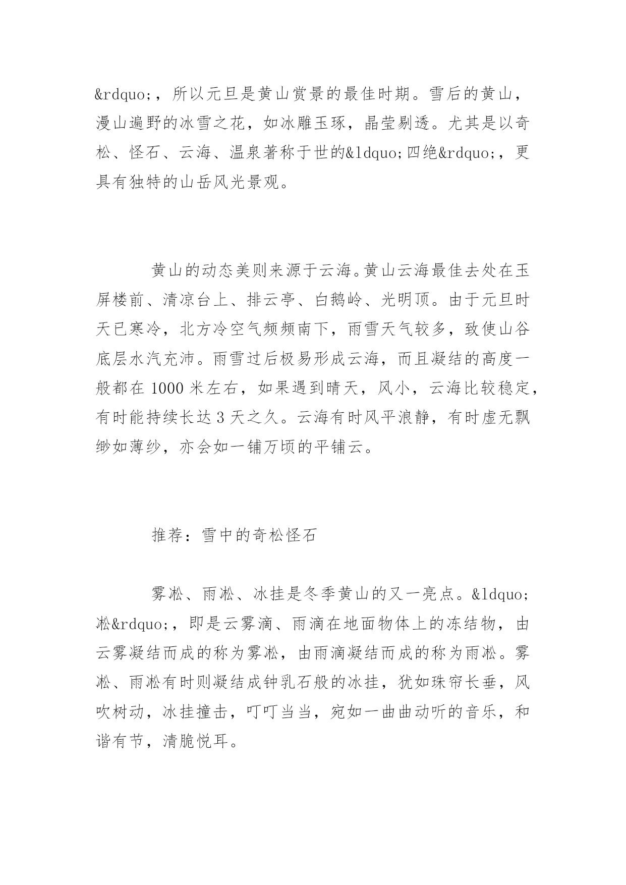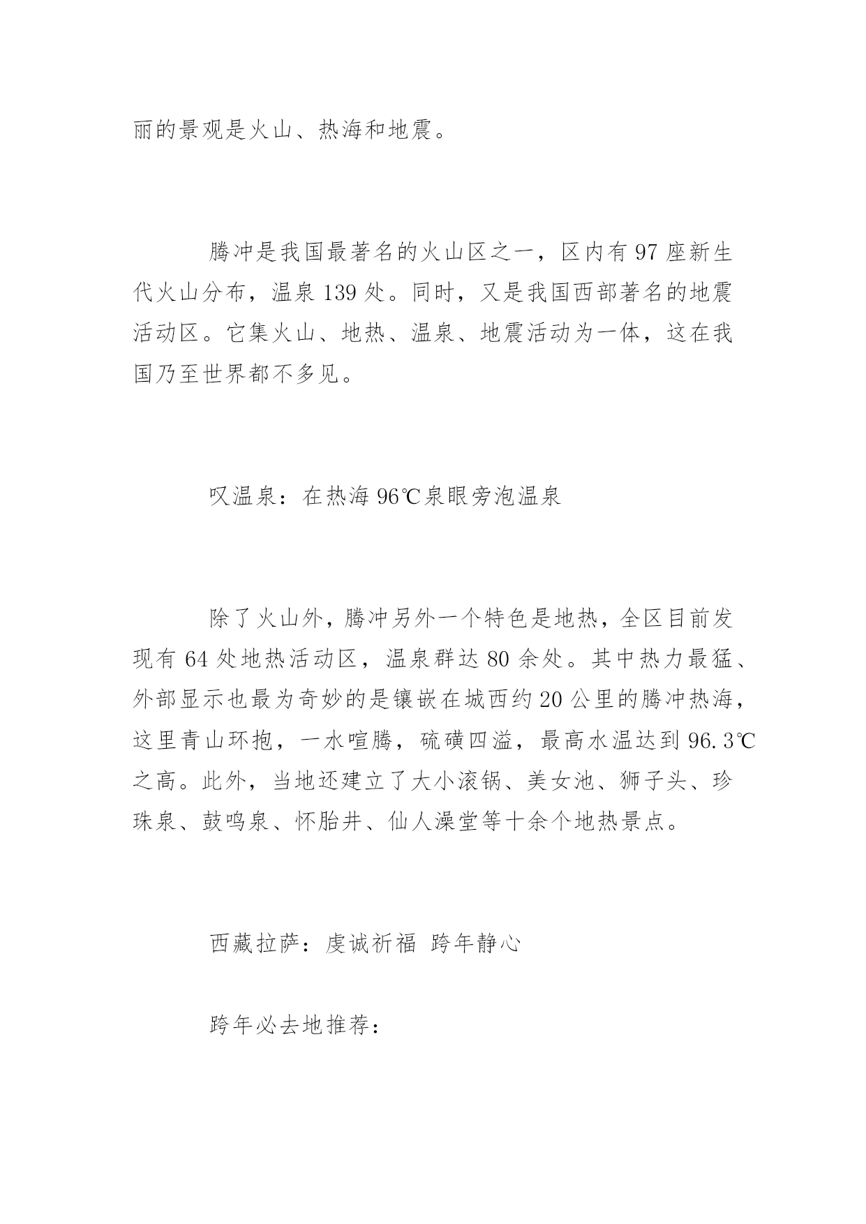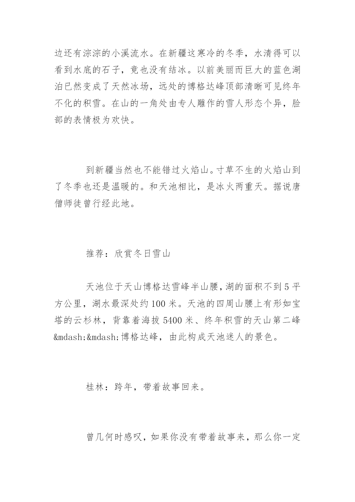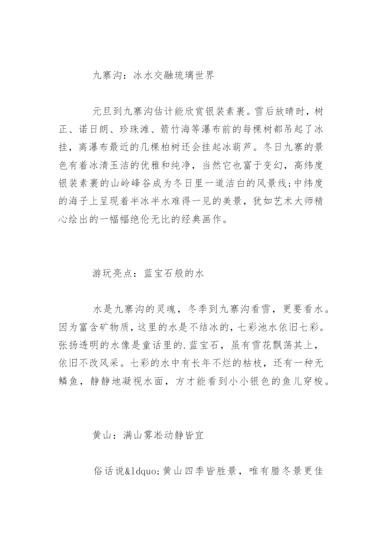 春节去哪里旅游2017春节去哪里旅游2017春节如约而至,打算这个春节带家人出游的朋友可以开始规划这个春节的出游路线了。如果暂时还没有特别想去的地方的话,不妨从这篇2017节旅游好去处中寻找一下灵感!,希望对大家有所帮助!更多内容请关注应届毕业生网!西安:穿越千年古都感受历史厚重西安对于醉心于探寻东方文化和华夏文明源流的游客来说,中原就如同一座浩翰的天然历史博物馆。元旦期间,游客可以在西安参观秦朝兵马俑、游历西安古城,参观陕西博物馆和河南博物院,尽看中原文化经典。还能在法门寺感悟着厚重历史,一切都是那么的惬意。推荐:兵马俑、法门寺等古迹去西安不能错过的当然是秦兵马俑博物馆。博物馆位于西安临潼县秦始皇陵东1.5公里处,是秦始皇陵的从葬坑,被誉为“世界第八大奇迹”,1987年由联合国教科文组织列入“世界人类文化遗产”目录。哈尔滨:畅游冰雪大世界12月份的东北,成了一个梦幻的浪漫雪国。元旦期间,还可以在迪士尼冰雪乐园里面欣赏到米奇老鼠、唐老鸭等迪士尼主角冰雕,惟妙惟肖的姿态带给如同身临迪士尼一样的巧妙感觉;可以欣赏到世界著名的芬兰拉普兰圣诞老人将在太阳岛雪博会搭建的雪版圣诞老人村内“生活”;还有用冰雪堆砌而成的美丽城堡,海豚领航的海盗船更是成了谋杀游客菲林的杀手。充满童真和浪漫情调的迪士尼冰雪乐园让人重拾童心和浪漫。推荐:冰雕亚布力滑雪场体验过冰雕王国哈尔滨感受冰城最独特的魅力,可以前往亚布力滑雪的激情和浪漫碰撞。亚布力滑雪场是东北最大的滑雪场。厦门:琴声中的海上花园元旦期间让你尽情游玩海上花园城市——厦门和有海上花园之称的鼓浪屿,游客可在这富有欧陆风情的花园小岛自由观光。并游览“菽庄花园”和全国唯一的钢琴博物馆。每到冬季,厦门几乎每个周末都有观鸟行动。人们拿着望远镜,带上相机,出动。厦门拥有丰富的地热温泉资源,厦门温泉的水温大多在40℃以上,多数为微咸或咸水温泉,矿化度最大达20.31克/升。目前已开发的有日月谷温泉、翠丰温泉和大溪温泉等。众多的温泉景区成了厦门入冬后的旅游休闲好去处。推荐:看海观鸟泡温泉每到冬季,厦门几乎每个周末都有观鸟行动。人们拿着望远镜,带上相机,出动。广东的温泉资源非常丰富,享用多了,也该换个口味,那就去厦门,厦门拥有丰富的地热温泉资源,厦门温泉的水温大多在40℃以上,多数为微咸或咸水温泉,矿化度最大达20.31克/升。目前已开发的有日月谷温泉、翠丰温泉和大溪温泉等。众多的温泉景区成了厦门入冬后的旅游休闲好去处。九寨沟:冰水交融琉璃世界元旦到九寨沟估计能欣赏银装素裹。雪后放晴时,树正、诺日朗、珍珠滩、箭竹海等瀑布前的每棵树都吊起了冰挂,离瀑布最近的几棵柏树还会挂起冰葫芦。冬日九寨的景色有着冰清玉洁的优雅和纯净,当然它也富于变幻,高纬度银装素裹的山岭峰谷成为冬日里一道洁白的风景线;中纬度的海子上呈现着半冰半水难得一见的美景,犹如艺术大师精心绘出的一幅幅绝伦无比的经典画作。游玩亮点:蓝宝石般的水水是九寨沟的灵魂,冬季到九寨沟看雪,更要看水。因为富含矿物质,这里的水是不结冰的,七彩池水依旧七彩。张扬透明的水像是童话里的.蓝宝石,虽有雪花飘荡其上,依旧不改风采。七彩的水中有长年不烂的枯枝,还有一种无鳞鱼,静静地凝视水面,方才能看到小小银色的鱼儿穿梭。黄山:满山雾凇动静皆宜俗话说“黄山四季皆胜景,唯有腊冬景更佳”,所以元旦是黄山赏景的最佳时期。雪后的黄山,漫山遍野的冰雪之花,如冰雕玉琢,晶莹剔透。尤其是以奇松、怪石、云海、温泉著称于世的“四绝”,更具有独特的山岳风光景观。黄山的动态美则来源于云海。黄山云海最佳去处在玉屏楼前、清凉台上、排云亭、白鹅岭、光明顶。由于元旦时天已寒冷,北方冷空气频频南下,雨雪天气较多,致使山谷底层水汽充沛。雨雪过后极易形成云海,而且凝结的高度一般都在1000米左右,如果遇到晴天,风小,云海比较稳定,有时能持续长达3天之久。云海有时风平浪静,有时虚无飘缈如薄纱,亦会如一铺万顷的平铺云。推荐:雪中的奇松怪石雾凇、雨凇、冰挂是冬季黄山的又一亮点。“凇”,即是云雾滴、雨滴在地面物体上的冻结物,由云雾凝结而成的称为雾凇,由雨滴凝结而成的称为雨凇。雾凇、雨凇有时则凝结成钟乳石般的冰挂,犹如珠帘长垂,风吹树动,冰挂撞击,叮叮当当,宛如一曲曲动听的音乐,和谐有节,清脆悦耳。海南:热带海域温暖如春元旦假期,带家人一起到海南岛内的热带雨林大氧吧呼吸清新沁脾的空气,去舒展久坐僵硬的筋骨是一个不错的选择。带领孩子潜入动感十足的蜈支洲岛,在神奇的海底世界里与五颜六色的热带鱼一起