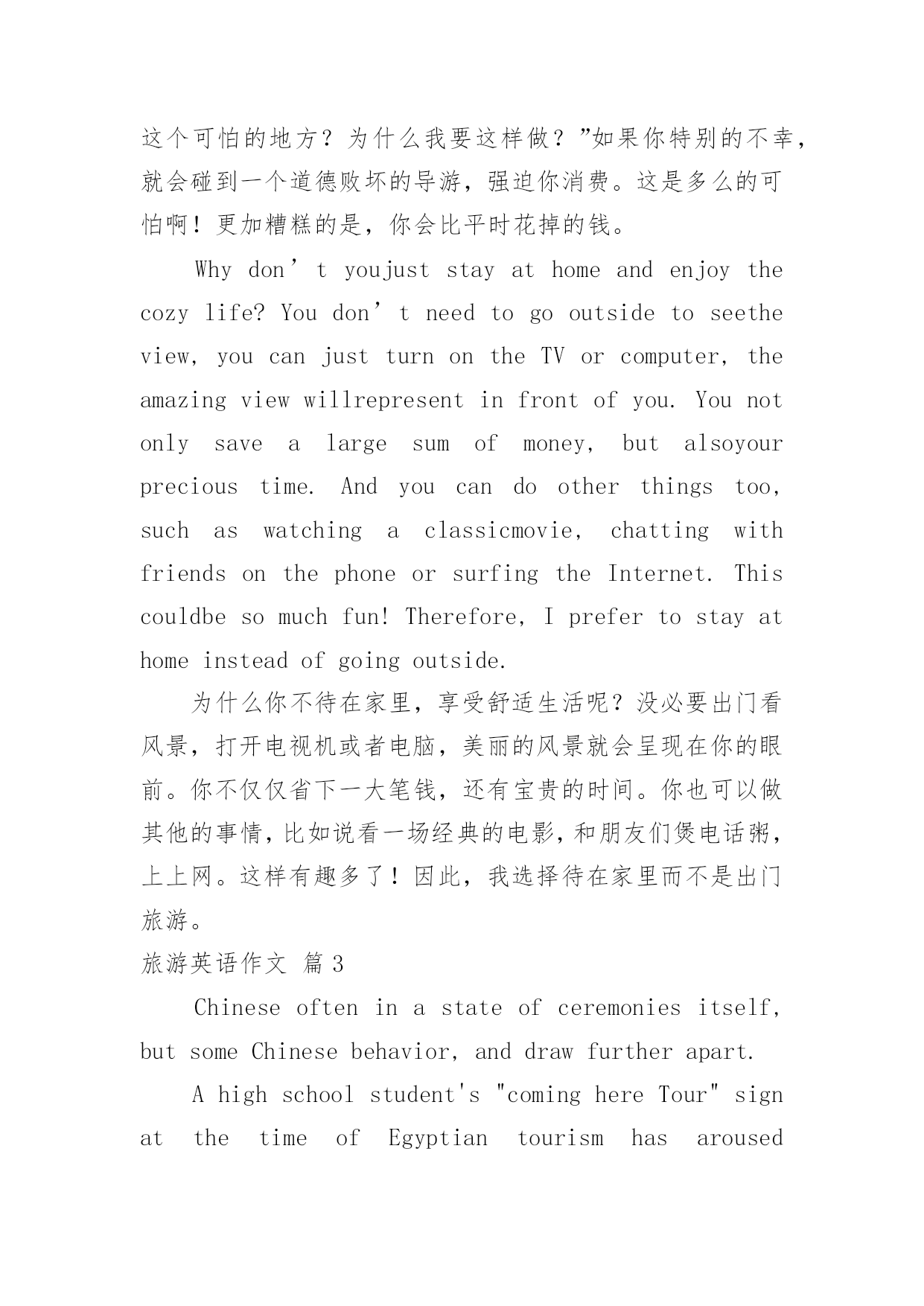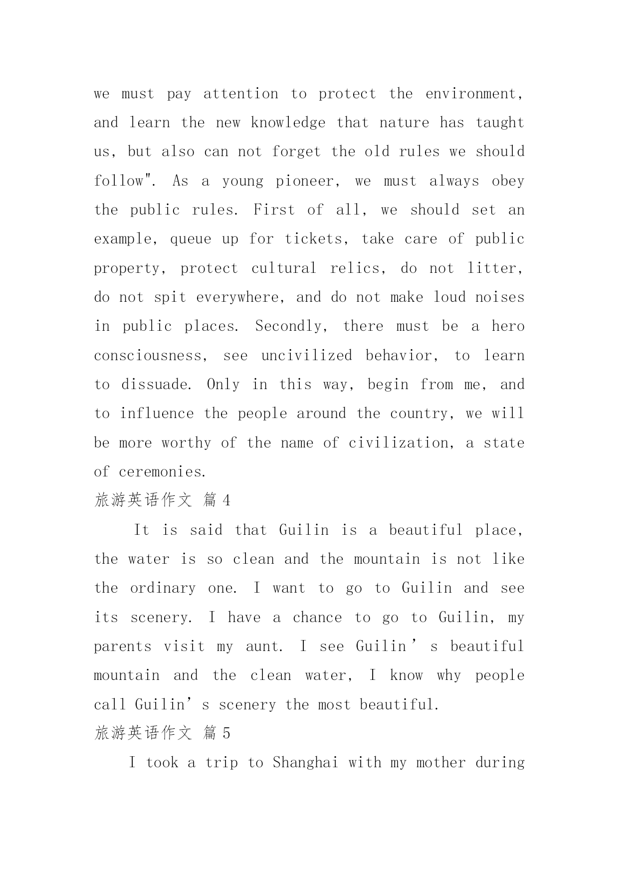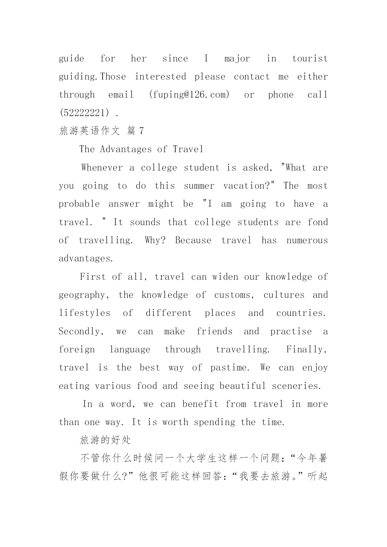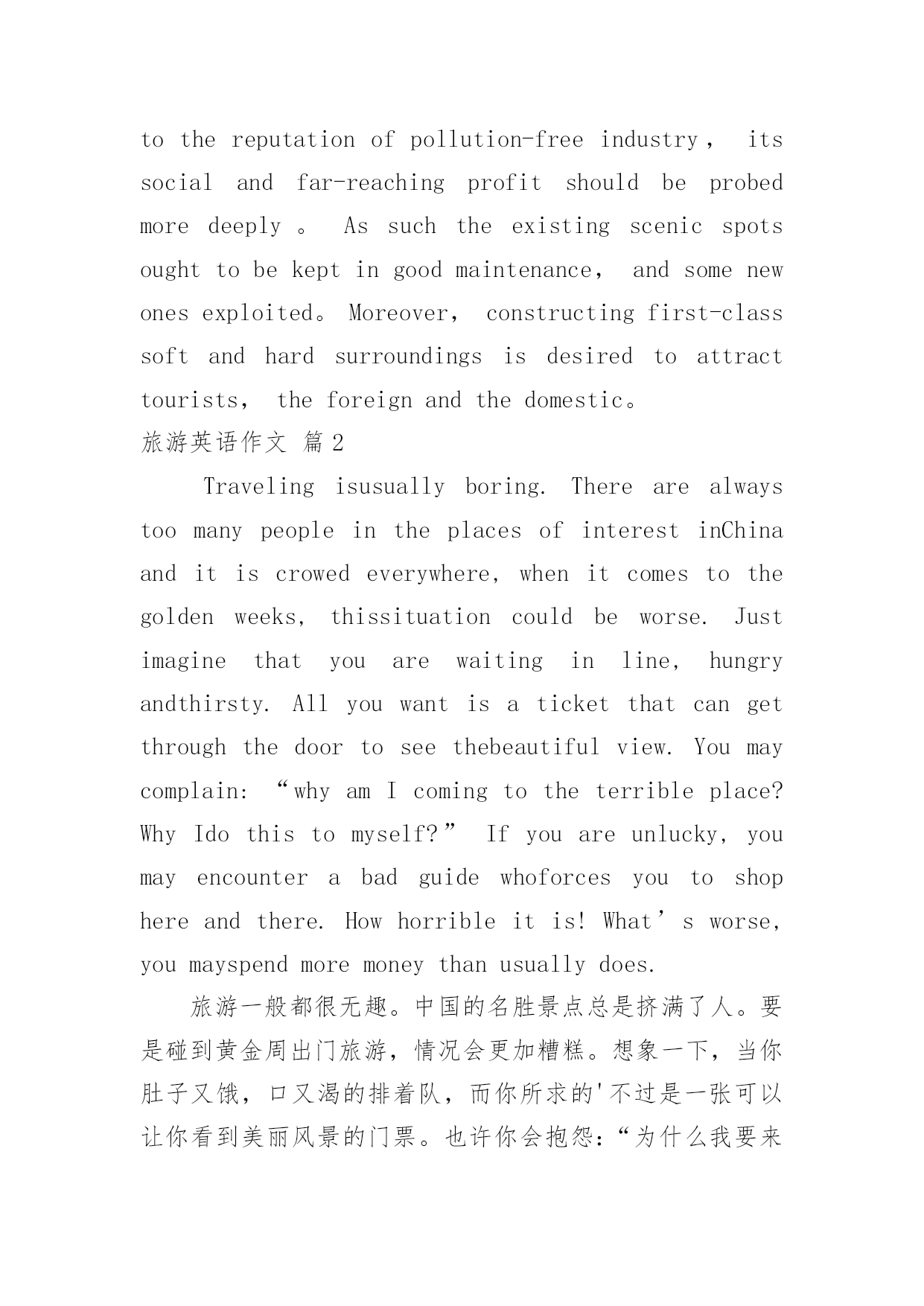 旅游英语作文有关旅游英语作文汇总7篇在平平淡淡的学习、工作、生活中,许多人都有过写作文的经历,对作文都不陌生吧,作文根据体裁的不同可以分为记叙文、说明文、应用文、议论文。那么,怎么去写作文呢?下面是小编帮大家整理的旅游英语作文7篇,仅供参考,希望能够帮助到大家。旅游英语作文篇1Therearevariedwaysofdefiningtourism。Somepeopleregarditasapollution-freeindustry;othersthinkofitaninvisibleschool,Botharebasedonanacceptedfactthattourismcannotonlyproduceprofitsbearingnopollutionalongwith,buthelpbroadenknowledgeandfortifyhealthy。Asidefromtheabovethereexistsawidespreadtheory,claimingthatwhateverisoftheabilitytoincreaseincapitalbelongstoproductiveindustry。Inthissense,tourismshouldholdapositioninthescopeandoughttobetreatedassuch。Itistruethatthereissomesenseinthetheory,yetanotherequallyorevenmoreimportantaspectshouldbegrantedmorepublicityto。Tourism,intermsofitsobjectivepurposes,hasasocialfunctionwhichcontributestohumanmunication。Comingfromvadoussocialbackgrounds,havingmotivesandgoalsofeverykind,touristsgettogether,drawcloseandexchangeideasoftheirown,fromwhichafreshstateofmindwillbecreated。Sowhatkindofproductionisit?Tothequestionweshouldhavegoodreasontogiveaproperanswer:itisaspiritproduction,areproductionofrelationsofproduction。Andthemorefrequentlysuchexchangesaremade,themoregoodtheywilldotopromotingsocialandeconomicdevelopmentofthemutual。Ifitisthecasethatmakingmoneythroughtourismmeansadentwehavemade,soitforetellsafortunetoprovideculturalservicealongwithtourism。Therefore,tokeepcloseeyesonthelatterinvolveschangingourmindsfirst,thatis,tourismisbynomeansapureeconomicconcept,buttakesplentyofideologicalactivitiesasitscontent。Tosumup,unlikeothereconomicforms,theprofitsfromtourismeconomycannotbemeasuredpletelybymeansofhowmuchoutputvalue,profit,andforeignexchangeitwillproduce。Inadditiontothereputationofpollution-freeindustry,itssocialandfar-reachingprofitshouldbeprobedmoredeeply。Assuchtheexistingscenicspotsoughttobekeptingoodmaintenance,andsomenewonesexploited。Moreover,constructingfirst-classsoftandhardsurroundingsisdesiredtoattracttourists,theforeignandthedomestic。旅游英语作文篇2Travelingisusuallyboring.Therearealwaystoomanypeople