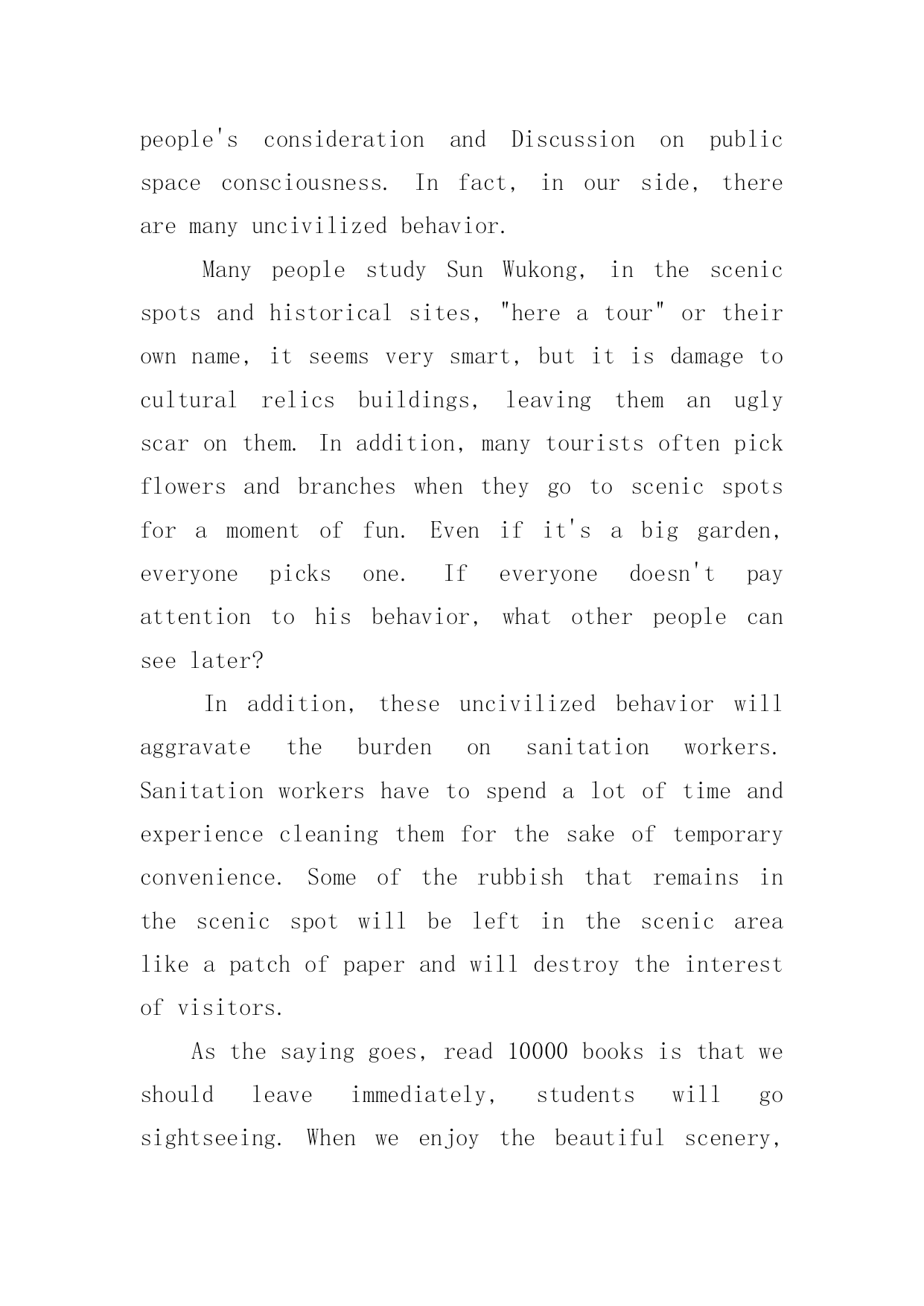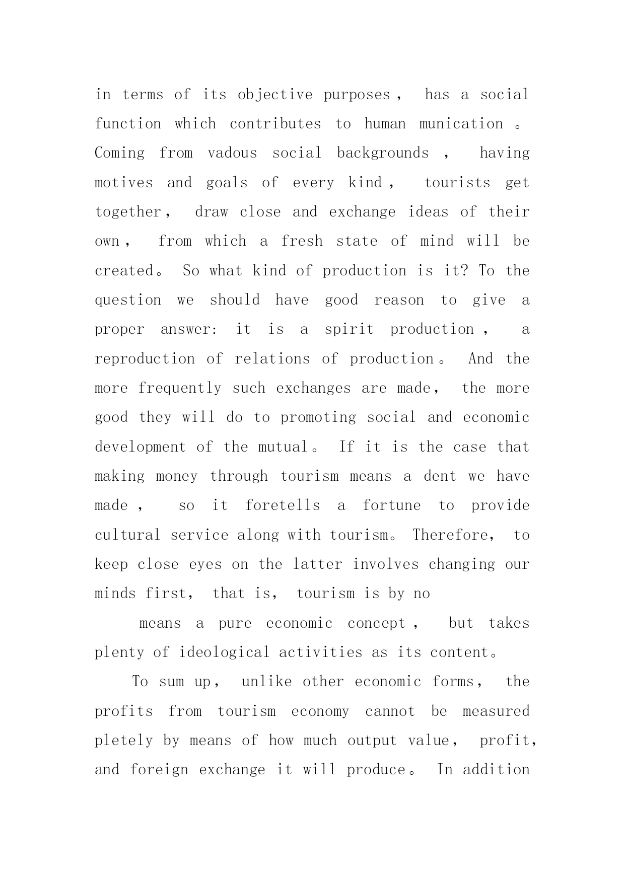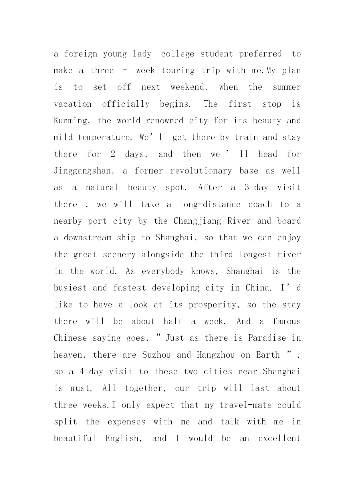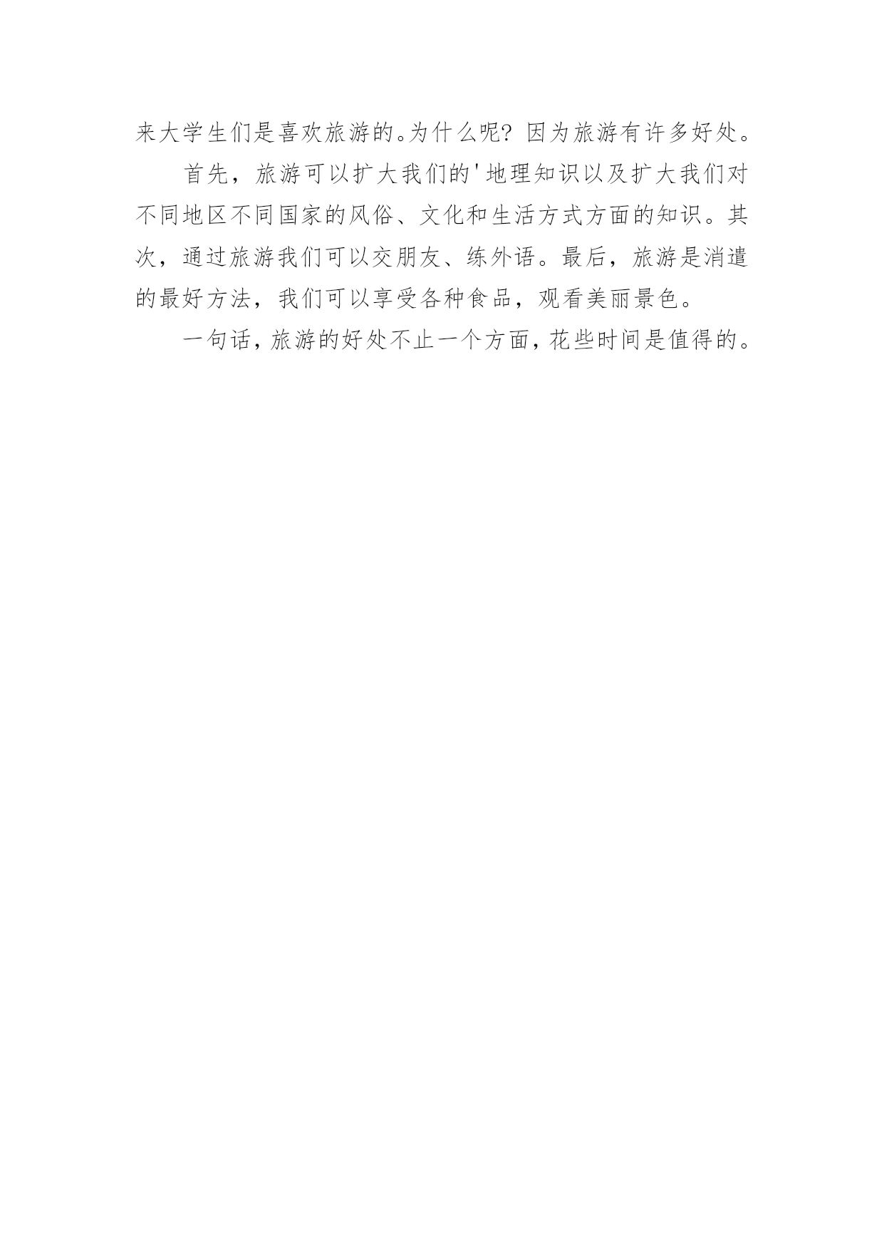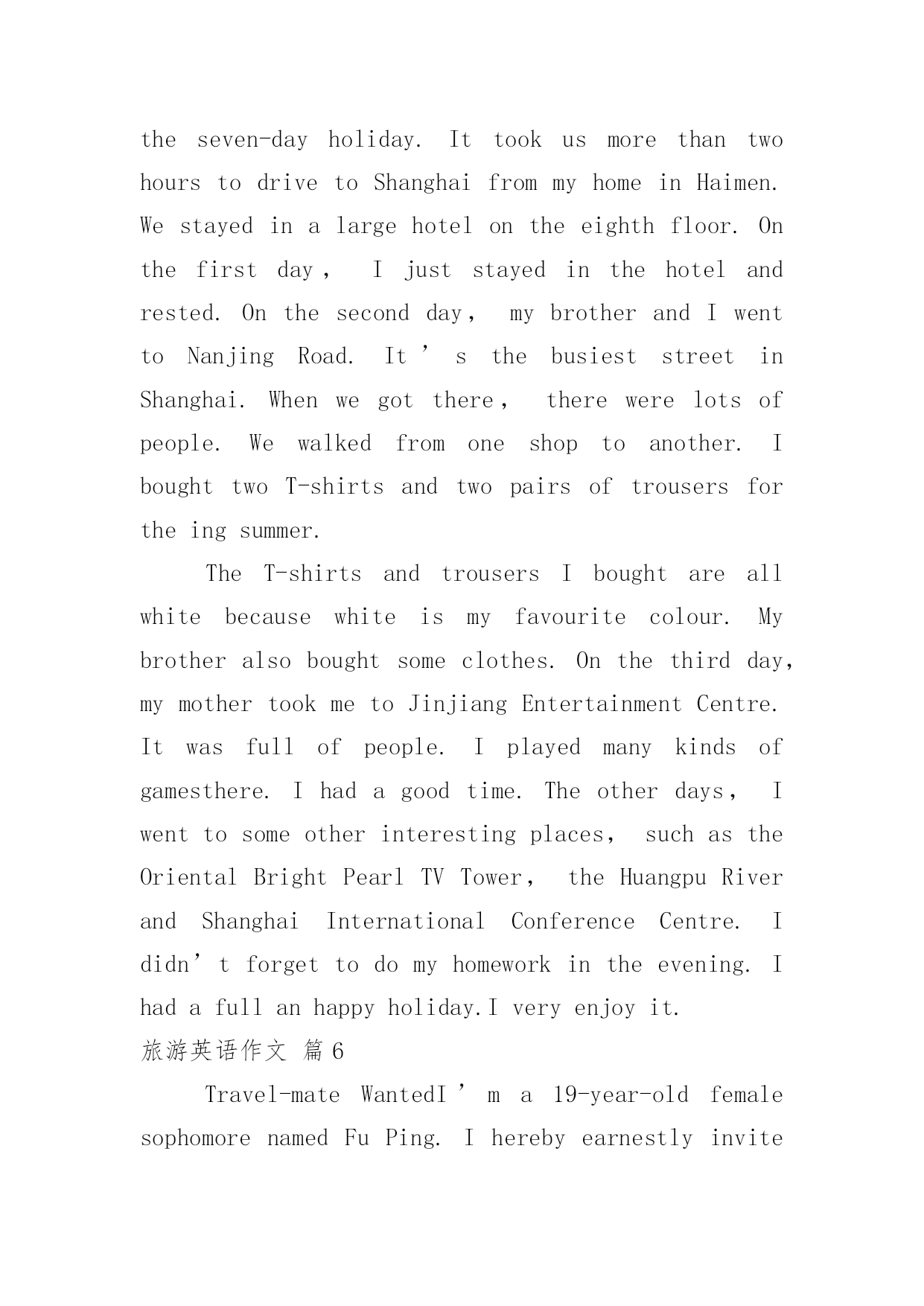 旅游英语作文有关旅游英语作文汇总7篇在平平淡淡的学习、工作、生活中,许多人都有过写作文的经历,对作文都不陌生吧,作文根据体裁的不同可以分为记叙文、说明文、应用文、议论文。那么,怎么去写作文呢?下面是小编帮大家整理的旅游英语作文7篇,仅供参考,希望能够帮助到大家。旅游英语作文篇1Therearevariedwaysofdefiningtourism。Somepeopleregarditasapollution-freeindustry;othersthinkofitaninvisibleschool,Botharebasedonanacceptedfactthattourismcannotonlyproduceprofitsbearingnopollutionalongwith,buthelpbroadenknowledgeandfortifyhealthy。Asidefromtheabovethereexistsawidespreadtheory,claimingthatwhateverisoftheabilitytoincreaseincapitalbelongstoproductiveindustry。Inthissense,tourismshouldholdapositioninthescopeandoughttobetreatedassuch。Itistruethatthereissomesenseinthetheory,yetanotherequallyorevenmoreimportantaspectshouldbegrantedmorepublicityto。Tourism,intermsofitsobjectivepurposes,hasasocialfunctionwhichcontributestohumanmunication。Comingfromvadoussocialbackgrounds,havingmotivesandgoalsofeverykind,touristsgettogether,drawcloseandexchangeideasoftheirown,fromwhichafreshstateofmindwillbecreated。Sowhatkindofproductionisit?Tothequestionweshouldhavegoodreasontogiveaproperanswer:itisaspiritproduction,areproductionofrelationsofproduction。Andthemorefrequentlysuchexchangesaremade,themoregoodtheywilldotopromotingsocialandeconomicdevelopmentofthemutual。Ifitisthecasethatmakingmoneythroughtourismmeansadentwehavemade,soitforetellsafortunetoprovideculturalservicealongwithtourism。Therefore,tokeepcloseeyesonthelatterinvolveschangingourmindsfirst,thatis,tourismisbynomeansapureeconomicconcept,buttakesplentyofideologicalactivitiesasitscontent。Tosumup,unlikeothereconomicforms,theprofitsfromtourismeconomycannotbemeasuredpletelybymeansofhowmuchoutputvalue,profit,andforeignexchangeitwillproduce。Inadditiontothereputationofpollution-freeindustry,itssocialandfar-reachingprofitshouldbeprobedmoredeeply。Assuchtheexistingscenicspotsoughttobekeptingoodmaintenance,andsomenewonesexploited。Moreover,constructingfirst-classsoftandhardsurroundingsisdesiredtoattracttourists,theforeignandthedomestic。旅游英语作文篇2Travelingisusuallyboring.Therearealwaystoomanypeople
