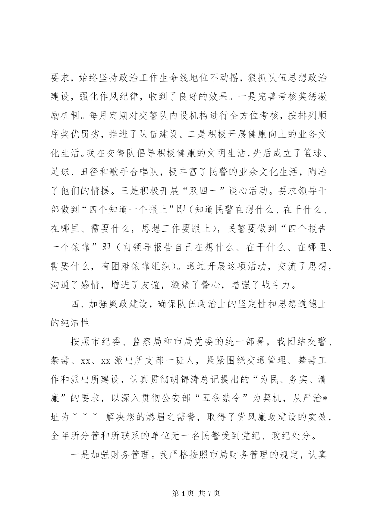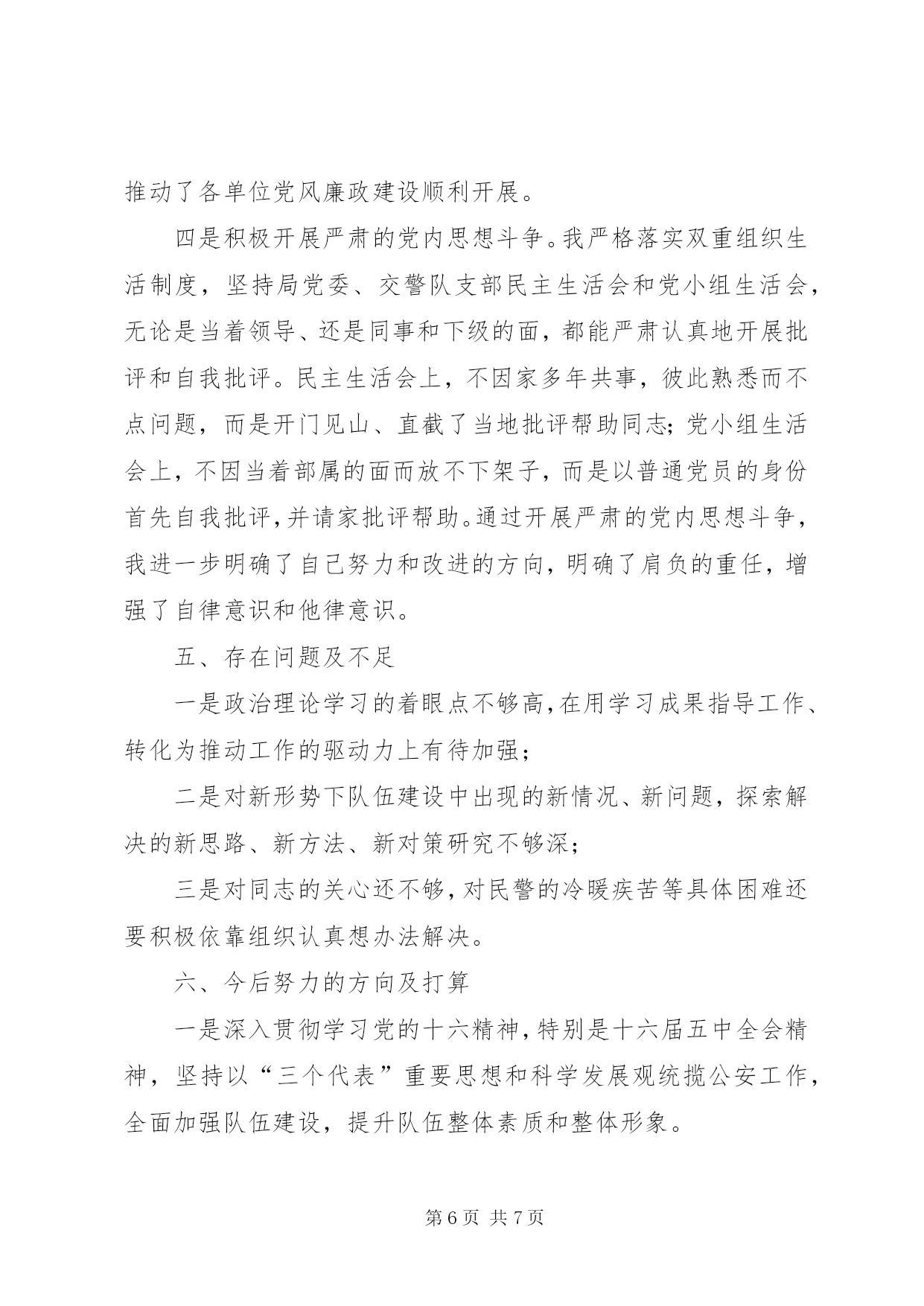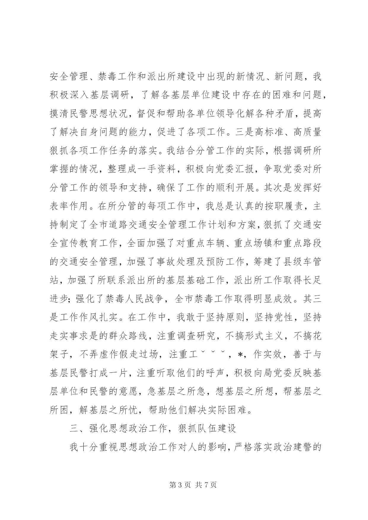 第PAGE\*Arabic\*MERGEFORMAT7页共NUMPAGES\*MERGEFORMAT7页公安交通副局长述职报告二00x年,在市委、市政府和市局党委的正确领导下,我紧紧围绕市局中心工作和分管工作,按照“抓班子带队伍,抓管理树形象,抓创新求发展”的工作思路,与时俱进,开拓创新,全面加强交、巡警和禁毒队伍建设,狠抓道路交通安全工作,努力推进道路交通安全管理和禁毒人民战争上新台阶,为我市经济发展和社会事业的进步营造了良好的交通安全环境和社会治安环境。一、注重理论学习,不断提高政治素养没有政治上的成熟,就不可能有理性的思维。我清醒地认识到,只有不断地用科学理论武装头脑,才能提高根本素质,切实担负起巩固共产党执政地位、维护国家长治久安、保障人民安居乐业的政治和社会责任,才能找到解决当前国家深化改革和公安队伍正规化建设中出现的新情况、新问题的新对策和新方法。因此,无论工作多忙、时间多紧,都能自觉主动地挤出时间学习“三个代表”重要思想和党的十六精神。积极参加局里开展的保持共产党员先进性教育活动。根据党委工作分工,我在抓好自身学习的同时,还及时组织交警、巡警、禁毒队和联系的xx、xx派出所等单位的民警认真学习。学习中,我注重在全面、正确领会和掌握“三个代表”和十六精神体系和实质上下功夫,把学习科学理论同改造世界观、人生观,树立“立警为公,执法为民”、激发昂扬的精神状态结合起来,同端正执法指导思想,提高执法质量和执法水平结合起来,同解决公安规范化建设重点难点问题,特别是新时期公安队伍正规化建设等问题,指导工作落实结合起来,使理论学习成为抓工作落实的驱动力,转化为在工作实践中落实讲政治要求的具体能力。使广民警更好地坚持立警为公、执法为民,更好地做到求真务实,开拓创新,勤政高效,廉洁清正,使公安交通管理工作、禁毒工作、派出所基层基础工作体现了时代性,为建设平安xx、构建和谐社会创造了良好的交通安全环境和社会治安环境。自身科学判断形势,准确把握局,驾驭治安局势、严格公正执法的能力显著提高。二、勤奋敬业,工作作风扎实一是始终保持了昂扬的精神状态。身为公安局副局长兼交警队队长,除了抓好道路交通安全管理工作外,还分管了禁毒工作和交巡警工作,联系了xx派出所和xx派出所,我始终坚持高标准、严要求,创造性地开展工作。今年,xx市政府开展了道路交通安全“百日会战”等一系列交通安全专项整治行动,xx市公安局开展了“秋季攻势”系列行动,我按照市局党委的总体部署,和交警、禁毒队班子同志一道,主持制定了道路交通安全“百日会战”和“秋风行动”工作方案,并积极组织实施,两项专项行动受到了xx市局的肯定,“秋风行动”禁毒专项斗争排名xx市局前十名。二是深入基层抓落实。针对新形势下出现道路交通安全管理、禁毒工作和派出所建设中出现的新情况、新问题,我积极深入基层调研,了解各基层单位建设中存在的困难和问题,摸清民警思想状况,督促和帮助各单位领导化解各种矛盾,提高了解决自身问题的能力,促进了各项工作。三是高标准、高质量狠抓各项工作任务的落实。我结合分管工作的实际,根据调研所掌握的情况,整理成一手资料,积极向党委汇报,争取党委对所分管工作的领导和支持,确保了工作的顺利开展。其次是发挥好表率作用。在所分管的每项工作中,我总是认真的按职履责,主持制定了全市道路交通安全管理工作计划和方案,狠抓了交通安全宣传教育工作,全面加强了对重点车辆、重点场镇和重点路段的交通安全管理,加强了事故处理及预防工作,筹建了县级车管站,加强了所联系派出所的基层基础工作,派出所工作取得长足进步;强化了禁毒人民战争,全市禁毒工作取得明显成效。其三是工作作风扎实。在工作中,我敢于坚持原则,坚持党性,坚持走实事求是的群众路线,注重调查研究,不搞形式主义,不搞花架子,不弄虚作假走过场,注重工ˇˇˇ,*,作实效,善于与基层民警打成一片,注重听取他们的呼声,积极向局党委反映基层单位和民警的意愿,急基层之所急,想基层之所想,帮基层之所困,解基层之所忧,帮助他们解决实际困难。三、强化思想政治工作,狠抓队伍建设我十分重视思想政治工作对人的影响,严格落实政治建警的要求,始终坚持政治工作生命线地位不动摇,狠抓队伍思想政治建设,强化作风纪律,收到了良好的效果。一是完善考核奖惩激励机制。每月定期对交警队内设机构进行全方位考核,按排列顺序奖优罚劣,推进了队伍建设。二是积极开展健康向上的业务文化生活。我在交警队倡导积极健康的文明生活,先后成立了篮球、足球、田径和歌手合唱队,极丰富了民警的业余文化生活,陶冶了他们的情操。三是积极开展“双四一”谈心活动。要求领导干部做到“四个知道一个跟上”即(知道民警在想什么、在干什么、在哪里、需要什么,思想工作要跟上),民警要做到“四个报告一个依靠”即(向领导报告自己在想什
