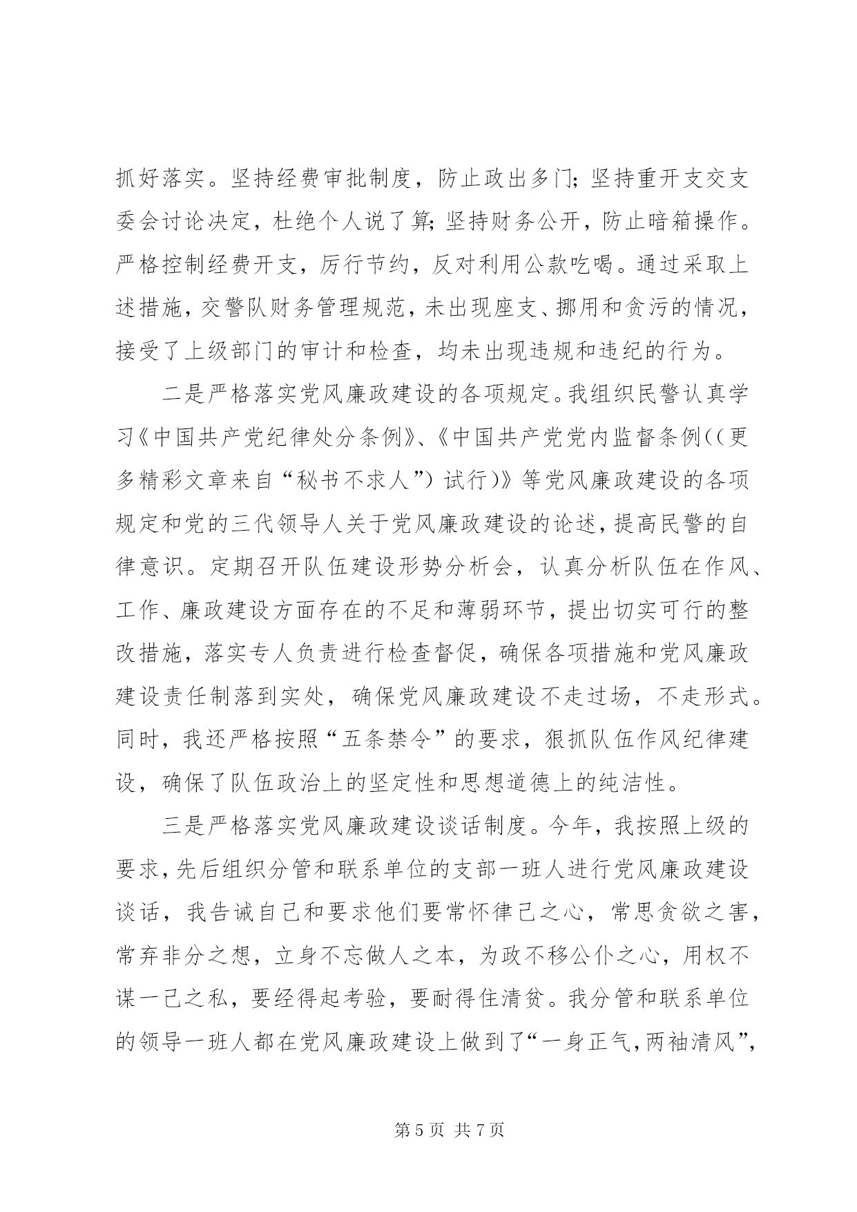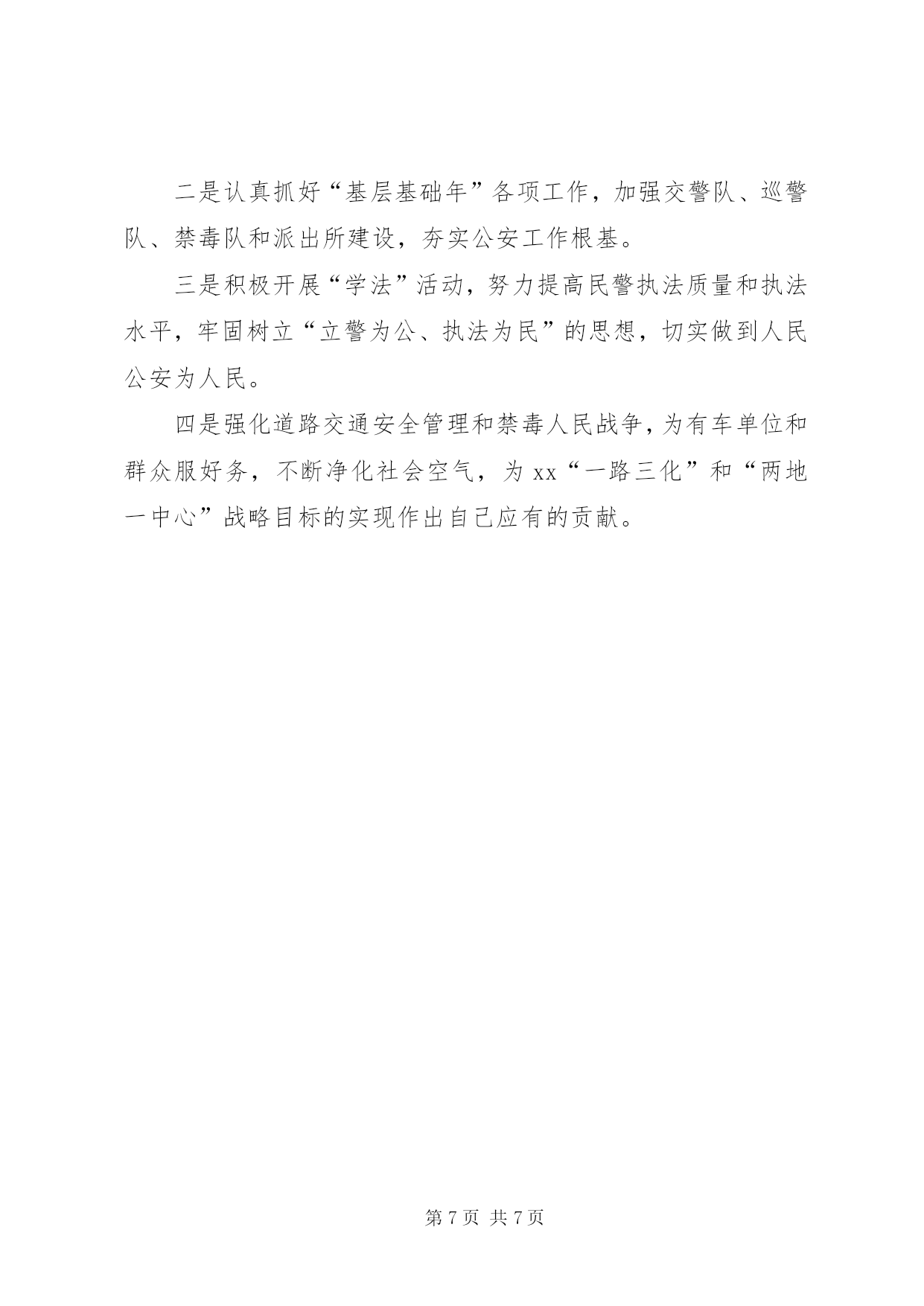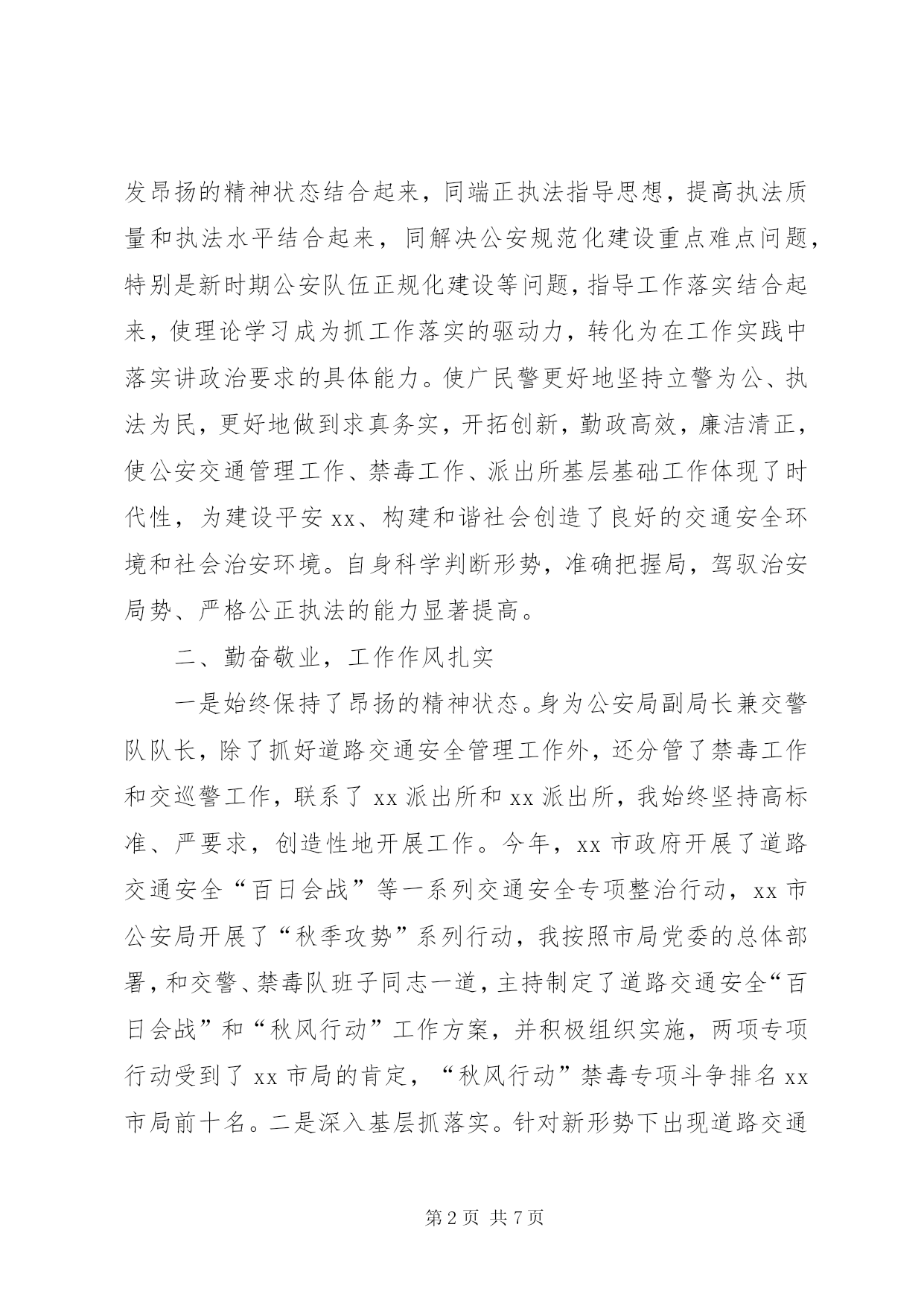 第PAGE\*Arabic\*MERGEFORMAT7页共NUMPAGES\*MERGEFORMAT7页公安交通副局长述职报告二00x年,在市委、市政府和市局党委的正确领导下,我紧紧围绕市局中心工作和分管工作,按照“抓班子带队伍,抓管理树形象,抓创新求发展”的工作思路,与时俱进,开拓创新,全面加强交、巡警和禁毒队伍建设,狠抓道路交通安全工作,努力推进道路交通安全管理和禁毒人民战争上新台阶,为我市经济发展和社会事业的进步营造了良好的交通安全环境和社会治安环境。一、注重理论学习,不断提高政治素养没有政治上的成熟,就不可能有理性的思维。我清醒地认识到,只有不断地用科学理论武装头脑,才能提高根本素质,切实担负起巩固共产党执政地位、维护国家长治久安、保障人民安居乐业的政治和社会责任,才能找到解决当前国家深化改革和公安队伍正规化建设中出现的新情况、新问题的新对策和新方法。因此,无论工作多忙、时间多紧,都能自觉主动地挤出时间学习“三个代表”重要思想和党的十六精神。积极参加局里开展的保持共产党员先进性教育活动。根据党委工作分工,我在抓好自身学习的同时,还及时组织交警、巡警、禁毒队和联系的xx、xx派出所等单位的民警认真学习。学习中,我注重在全面、正确领会和掌握“三个代表”和十六精神体系和实质上下功夫,把学习科学理论同改造世界观、人生观,树立“立警为公,执法为民”、激发昂扬的精神状态结合起来,同端正执法指导思想,提高执法质量和执法水平结合起来,同解决公安规范化建设重点难点问题,特别是新时期公安队伍正规化建设等问题,指导工作落实结合起来,使理论学习成为抓工作落实的驱动力,转化为在工作实践中落实讲政治要求的具体能力。使广民警更好地坚持立警为公、执法为民,更好地做到求真务实,开拓创新,勤政高效,廉洁清正,使公安交通管理工作、禁毒工作、派出所基层基础工作体现了时代性,为建设平安xx、构建和谐社会创造了良好的交通安全环境和社会治安环境。自身科学判断形势,准确把握局,驾驭治安局势、严格公正执法的能力显著提高。二、勤奋敬业,工作作风扎实一是始终保持了昂扬的精神状态。身为公安局副局长兼交警队队长,除了抓好道路交通安全管理工作外,还分管了禁毒工作和交巡警工作,联系了xx派出所和xx派出所,我始终坚持高标准、严要求,创造性地开展工作。今年,xx市政府开展了道路交通安全“百日会战”等一系列交通安全专项整治行动,xx市公安局开展了“秋季攻势”系列行动,我按照市局党委的总体部署,和交警、禁毒队班子同志一道,主持制定了道路交通安全“百日会战”和“秋风行动”工作方案,并积极组织实施,两项专项行动受到了xx市局的肯定,“秋风行动”禁毒专项斗争排名xx市局前十名。二是深入基层抓落实。针对新形势下出现道路交通安全管理、禁毒工作和派出所建设中出现的新情况、新问题,我积极深入基层调研,了解各基层单位建设中存在的困难和问题,摸清民警思想状况,督促和帮助各单位领导化解各种矛盾,提高了解决自身问题的能力,促进了各项工作。三是高标准、高质量狠抓各项工作任务的落实。我结合分管工作的实际,根据调研所掌握的情况,整理成一手资料,积极向党委汇报,争取党委对所分管工作的领导和支持,确保了工作的顺利开展。其次是发挥好表率作用。在所分管的每项工作中,我总是认真的按职履责,主持制定了全市道路交通安全管理工作计划和方案,狠抓了交通安全宣传教育工作,全面加强了对重点车辆、重点场镇和重点路段的交通安全管理,加强了事故处理及预防工作,筹建了县级车管站,加强了所联系派出所的基层基础工作,派出所工作取得长足进步;强化了禁毒人民战争,全市禁毒工作取得明显成效。其三是工作作风扎实。在工作中,我敢于坚持原则,坚持党性,坚持走实事求是的群众路线,注重调查研究,不搞形式主义,不搞花架子,不弄虚作假走过场,注重工ˇˇˇ,*,作实效,善于与基层民警打成一片,注重听取他们的呼声,积极向局党委反映基层单位和民警的意愿,急基层之所急,想基层之所想,帮基层之所困,解基层之所忧,帮助他们解决实际困难。三、强化思想政治工作,狠抓队伍建设我十分重视思想政治工作对人的影响,严格落实政治建警的要求,始终坚持政治工作生命线地位不动摇,狠抓队伍思想政治建设,强化作风纪律,收到了良好的效果。一是完善考核奖惩激励机制。每月定期对交警队内设机构进行全方位考核,按排列顺序奖优罚劣,推进了队伍建设。二是积极开展健康向上的业务文化生活。我在交警队倡导积极健康的文明生活,先后成立了篮球、足球、田径和歌手合唱队,极丰富了民警的业余文化生活,陶冶了他们的情操。三是积极开展“双四一”谈心活动。要求领导干部做到“四个知道一个跟上”即(知道民警在想什么、在干什么、在哪里、需要什么,思想工作要跟上),民警要做到“四个报告一个依靠”即(向领导报告自己在想什