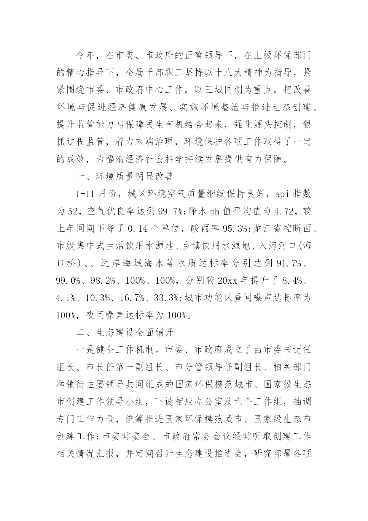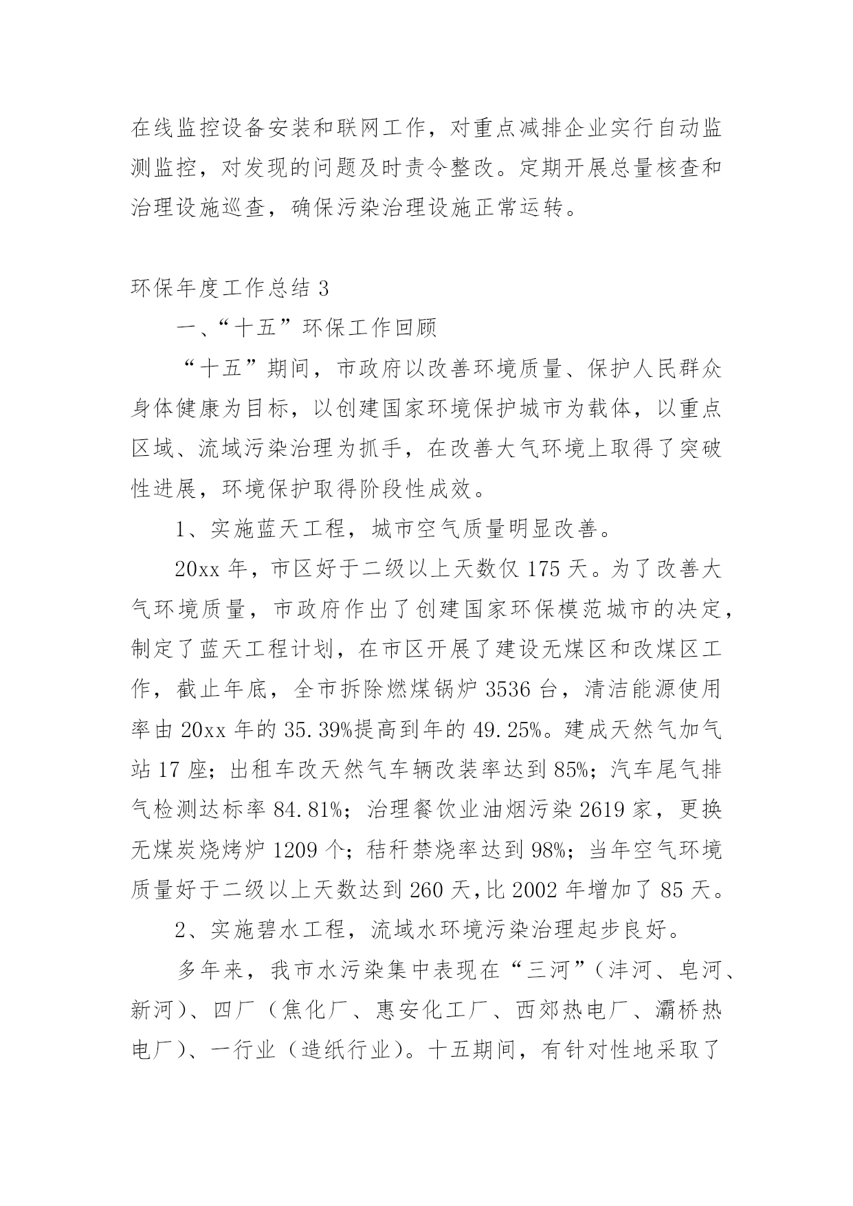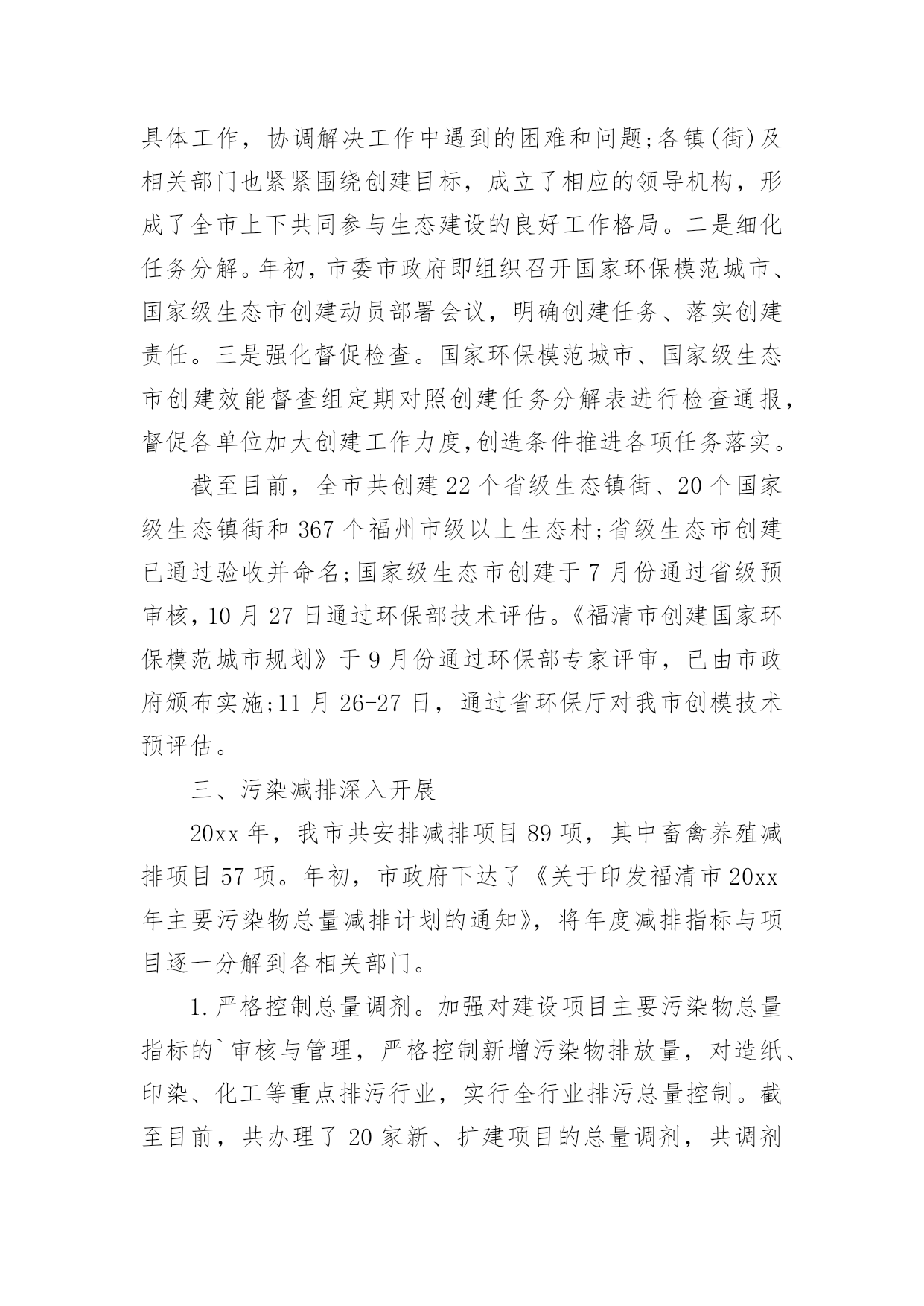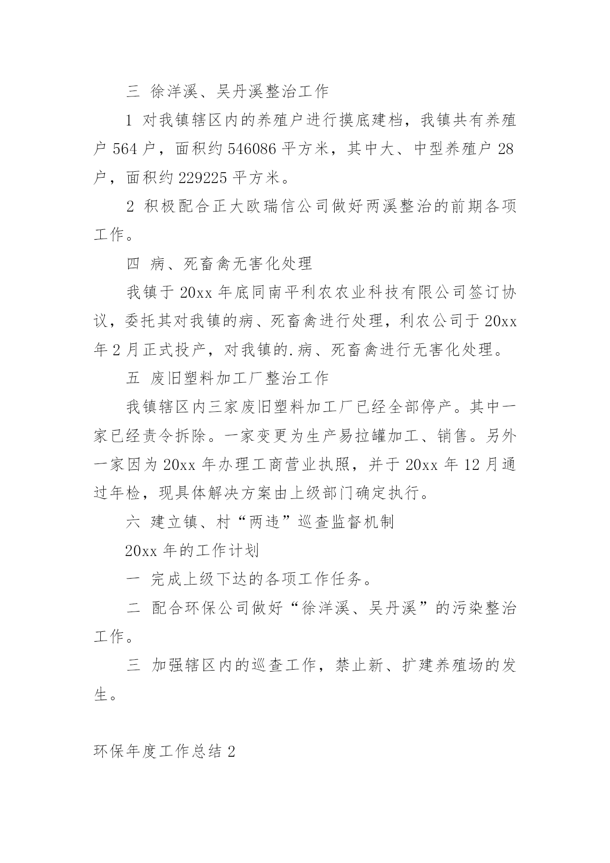 环保年度工作总结环保年度工作总结(15篇)总结是指社会团体、企业单位和个人在自身的某一时期、某一项目或某些工作告一段落或者全部完成后进行回顾检查、分析评价,从而肯定成绩,得到经验,找出差距,得出教训和一些规律性认识的一种书面材料,它可以帮助我们总结以往思想,发扬成绩,不妨坐下来好好写写总结吧。如何把总结做到重点突出呢?下面是小编为大家收集的环保年度工作总结,欢迎大家分享。环保年度工作总结120xx年,在上级业务部门的指导下,在镇党委、政府的正确领导下,我站完成了以下工作任务,现总结如下:一辖区内的自行拆除猪栏和新、扩建猪栏拆除情况120xx年我镇对辖区内的养殖户进行引导和整治,其中自行拆除猪栏面积46866.65平方米。220xx年10月,对在巡查中发现的新、扩建猪栏“吴丹村、罗坑村”中的四户养殖户进行责令拆除,拆除猪栏面积538.9平方米。二污染减排工作我镇今年对辖区内列入减排的养殖户共有5户,已经完成4户,还有一户设施已经基本完成,但还未报送减排材料。三徐洋溪、吴丹溪整治工作1对我镇辖区内的养殖户进行摸底建档,我镇共有养殖户564户,面积约546086平方米,其中大、中型养殖户28户,面积约229225平方米。2积极配合正大欧瑞信公司做好两溪整治的前期各项工作。四病、死畜禽无害化处理我镇于20xx年底同南平利农农业科技有限公司签订协议,委托其对我镇的病、死畜禽进行处理,利农公司于20xx年2月正式投产,对我镇的.病、死畜禽进行无害化处理。五废旧塑料加工厂整治工作我镇辖区内三家废旧塑料加工厂已经全部停产。其中一家已经责令拆除。一家变更为生产易拉罐加工、销售。另外一家因为20xx年办理工商营业执照,并于20xx年12月通过年检,现具体解决方案由上级部门确定执行。六建立镇、村“两违”巡查监督机制20xx年的工作计划一完成上级下达的各项工作任务。二配合环保公司做好“徐洋溪、吴丹溪”的污染整治工作。三加强辖区内的巡查工作,禁止新、扩建养殖场的发生。环保年度工作总结2今年,在市委、市政府的正确领导下,在上级环保部门的精心指导下,全局干部职工坚持以十八大精神为指导,紧紧围绕市委、市政府中心工作,以三城同创为重点,把改善环境与促进经济健康发展、实施环境整治与推进生态创建、提升监管能力与保障民生有机结合起来,强化源头控制,狠抓过程监管,着力末端治理,环境保护各项工作取得了一定的成效,为福清经济社会科学持续发展提供有力保障。一、环境质量明显改善1-11月份,城区环境空气质量继续保持良好,api指数为52,空气优良率达到99.7%;降水ph值平均值为4.72,较上年同期下降了0.14个单位,酸雨率95.3%;龙江省控断面、市级集中式生活饮用水源地、乡镇饮用水源地、入海河口(海口桥)、、近岸海域海水等水质达标率分别达到91.7%、99.0%、98.2%、100%、100%,分别较20xx年提升了8.4%、4.1%、10.3%、16.7%、33.3%;城市功能区昼间噪声达标率为100%,夜间噪声达标率为100%。二、生态建设全面铺开一是健全工作机制。市委、市政府成立了由市委书记任组长、市长任第一副组长、市分管领导任副组长、相关部门和镇街主要领导共同组成的国家环保模范城市、国家级生态市创建工作领导小组,下设相应办公室及六个工作组,抽调专门工作力量,统筹推进国家环保模范城市、国家级生态市创建工作;市委常委会、市政府常务会议经常听取创建工作相关情况汇报,并定期召开生态建设推进会,研究部署各项具体工作,协调解决工作中遇到的困难和问题;各镇(街)及相关部门也紧紧围绕创建目标,成立了相应的领导机构,形成了全市上下共同参与生态建设的良好工作格局。二是细化任务分解。年初,市委市政府即组织召开国家环保模范城市、国家级生态市创建动员部署会议,明确创建任务、落实创建责任。三是强化督促检查。国家环保模范城市、国家级生态市创建效能督查组定期对照创建任务分解表进行检查通报,督促各单位加大创建工作力度,创造条件推进各项任务落实。截至目前,全市共创建22个省级生态镇街、20个国家级生态镇街和367个福州市级以上生态村;省级生态市创建已通过验收并命名;国家级生态市创建于7月份通过省级预审核,10月27日通过环保部技术评估。《福清市创建国家环保模范城市规划》于9月份通过环保部专家评审,已由市政府颁布实施;11月26-27日,通过省环保厅对我市创模技术预评估。三、污染减排深入开展20xx年,我市共安排减排项目89项,其中畜禽养殖减排项目57项。年初,市政府下达了《关于印发福清市20xx年主要污染物总量减排计划的通知》,将年度减排指标与项目逐一分解到各相关部门。1.严格控制总量调剂。加强对建设项目主要污染物总量指标的`审核与管理,严格控制新增污染物排放量,对造纸、印染、化工等重点排污