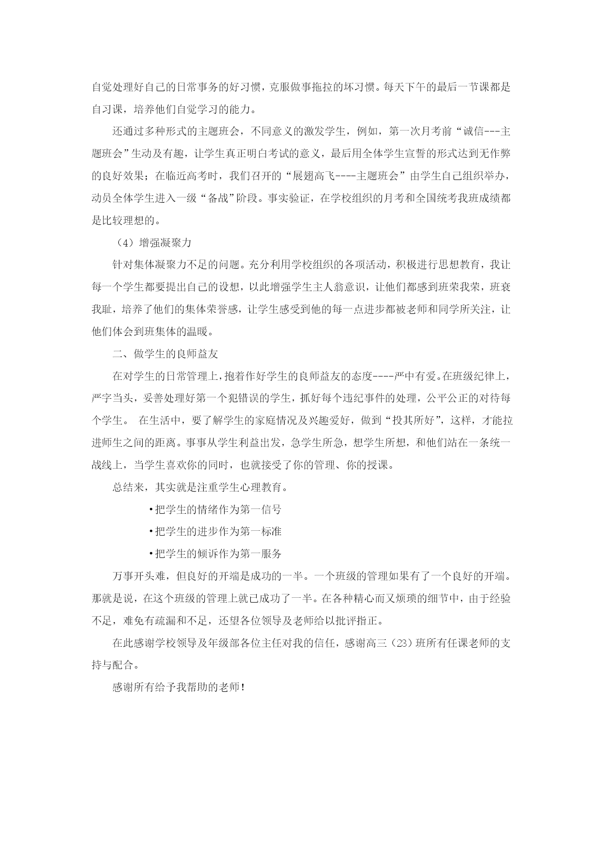 灵台一中2016年高三(23)班高考质量分析及班级管理心得体会陈小东2016年高考成绩揭晓,现将高三(23)班情况简要汇报如下:今年我班参考文化课人数为32人,其中,体育15人,有14人参加了全省体育统考,1人由于受伤等原因未能参加。音乐14人,舞蹈1人,传媒2人。高考成绩2本上线体育10人,其中一人文化课未上2本线,音乐上线6人,其中3人文化课未上2本线。班主任在班级管理中,扮演着多重角色,担负着多种责任,发挥着特殊的作用,班主任工作的优劣直接影响到学生的成长。对于班级管理我有以下体会:一、分析研究学生经过分析,我估计学生可能有以下问题:一是学生大多数学生从普通生进入特长班,会产生较大的心理落差,部分学生可能会自暴自弃;二是学习积极性不足,学习习惯不好;三是由于新集体刚刚形成,集体凝聚力不足;四是有部分学生经常迟到,上课玩手机,大多数女同学小话多对班风造成不良影响。这些问题的存在必然会成为班级进步的重大障碍。因此,我便把工作重点放在如何解决这些问题上。针对上述问题,我采取了一些措施,也取得了一定的成效。(1)树立信心,激发斗志为消除学生因特长生的心理障碍,我利用第一次的班会课向学生说明进入高三的学习任务,部分同学月考成绩并不是因为学习成绩很差,而是由于月考时的疏忽大意,导致了成绩不理想,二班的同学通过努力,照样可以考上大学,老师对考好的同学与没考好的同学会一视同仁,又鼓励他们把精力集中在学习上,不要再对月考成绩不理想的事耿耿于怀,要把目光放长这一些,总结经验教训,做好充分准备,向下一个目标进发(2)树立明确的目标一个人如果没有理想,就好像大海上一艘迷失方向的船,飘到哪儿算哪儿,没有目标,就没有动力。学生刚进入高三学习,我积极创造机会对他们进行理想教育。我要求学生制订学习计划,把对理想的追求转化为学习动力。把他们的理想和奋斗目标贴在墙上,激励学生努力学习。(3)学风建设在学习方面,认真检查学生的课内课外作业,督促学生保质保量的完成每天的学习任务。收交作业对于二班的学生是一项困难,我班把这项工作交给各科课代表负责,科代表手中有全班的名单,每次作业一一核实,每周一班会向全班公布一次,长此下去,使学生逐渐养成自觉处理好自己的日常事务的好习惯,克服做事拖拉的坏习惯。每天下午的最后一节课都是自习课,培养他们自觉学习的能力。还通过多种形式的主题班会,不同意义的激发学生,例如,第一次月考前“诚信---主题班会”生动及有趣,让学生真正明白考试的意义,最后用全体学生宣誓的形式达到无作弊的良好效果;在临近高考时,我们召开的“展翅高飞----主题班会”由学生自己组织举办,动员全体学生进入一级“备战”阶段。事实验证,在学校组织的月考和全国统考我班成绩都是比较理想的。(4)增强凝聚力针对集体凝聚力不足的问题。充分利用学校组织的各项活动,积极进行思想教育,我让每一个学生都要提出自己的设想,以此增强学生主人翁意识,让他们都感到班荣我荣,班衰我耻,培养了他们的集体荣誉感,让学生感受到他的每一点进步都被老师和同学所关注,让他们体会到班集体的温暖。二、做学生的良师益友在对学生的日常管理上,抱着作好学生的良师益友的态度----严中有爱。在班级纪律上,严字当头,妥善处理好第一个犯错误的学生,抓好每个违纪事件的处理,公平公正的对待每个学生。在生活中,要了解学生的家庭情况及兴趣爱好,做到“投其所好”,这样,才能拉进师生之间的距离。事事从学生利益出发,急学生所急,想学生所想,和他们站在一条统一战线上,当学生喜欢你的同时,也就接受了你的管理、你的授课。总结来,其实就是注重学生心理教育。把学生的情绪作为第一信号把学生的进步作为第一标准把学生的倾诉作为第一服务万事开头难,但良好的开端是成功的一半。一个班级的管理如果有了一个良好的开端。那就是说,在这个班级的管理上就已成功了一半。在各种精心而又烦琐的细节中,由于经验不足,难免有疏漏和不足,还望各位领导及老师给以批评指正。在此感谢学校领导及年级部各位主任对我的信任,感谢高三(23)班所有任课老师的支持与配合。感谢所有给予我帮助的老师!