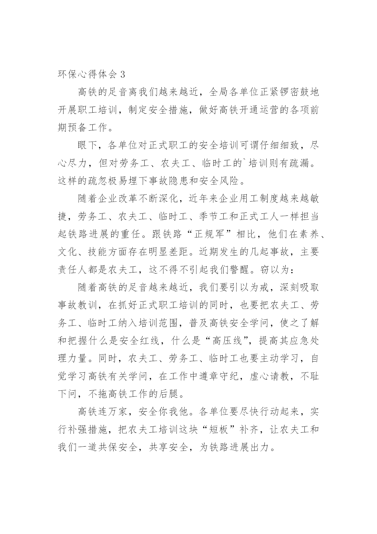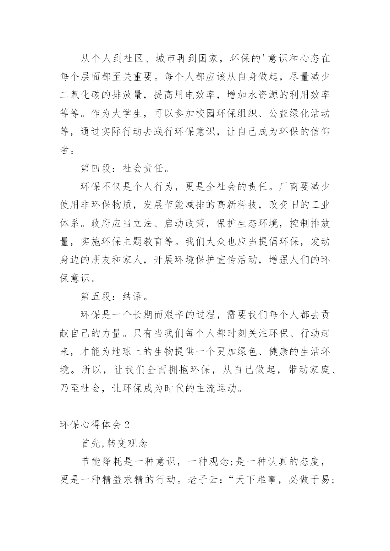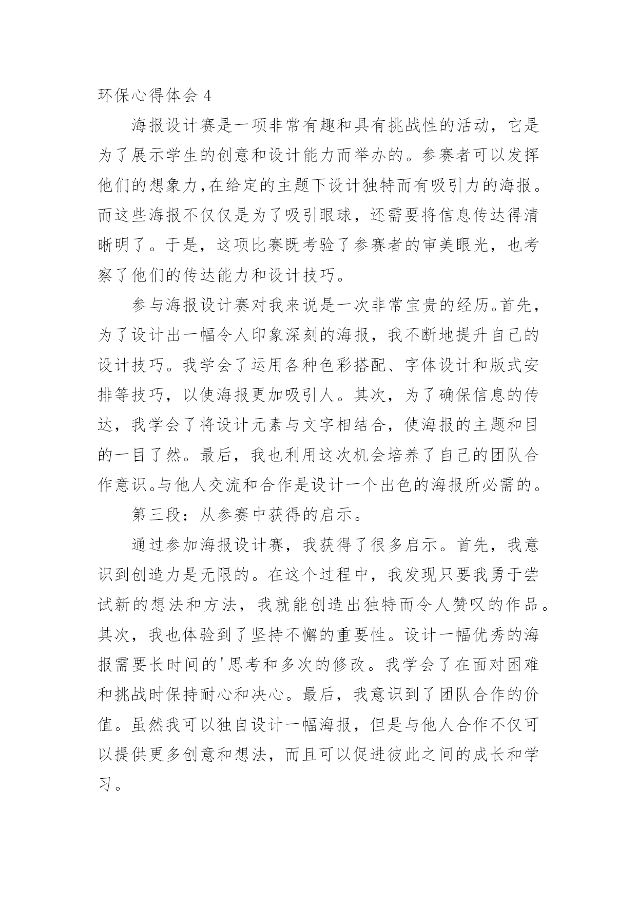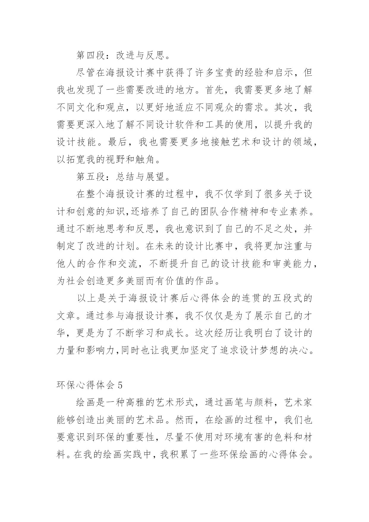 环保心得体会环保心得体会【常用15篇】在平日里,心中难免会有一些新的想法,心得体会是很好的记录方式,这么做能够提升我们的书面表达能力。那么你知道心得体会如何写吗?下面是小编精心整理的环保心得体会,仅供参考,希望能够帮助到大家。环保心得体会1近年来,全球气候变化、水污染、空气污染、垃圾处理等环境问题越来越严重,各国政府和社会各界也越来越重视环保问题。我也在日常生活中努力着,尝试种植绿植、减少使用塑料袋等,这些小小的努力或许微不足道,但如果每个人都参与其中,对于环保事业来说也将会有不可忽视的积极影响。第二段:环保的意义。环保并不仅仅是让我们的环境更加美好,更重要的是保护我们繁衍生息的家园。环保的实施可以减少自然灾害的发生,改善人类健康,延长地球的寿命等。同时,环保也可以为人类经济发展提供保障,发展环保产业需要大量人力、物力和财力,这些都会成为经济发展的资本。环保在经济发展中扮演着愈加重要和不可或缺的角色。第三段:自我行动。从个人到社区、城市再到国家,环保的'意识和心态在每个层面都至关重要。每个人都应该从自身做起,尽量减少二氧化碳的排放量,提高用电效率,增加水资源的利用效率等等。作为大学生,可以参加校园环保组织、公益绿化活动等,通过实际行动去践行环保意识,让自己成为环保的信仰者。第四段:社会责任。环保不仅是个人行为,更是全社会的责任。厂商要减少使用非环保物质,发展节能减排的高新科技,改变旧的工业体系。政府应当立法、启动政策,保护生态环境,控制排放量,实施环保主题教育等。我们大众也应当提倡环保,发动身边的朋友和家人,开展环境保护宣传活动,增强人们的环保意识。第五段:结语。环保是一个长期而艰辛的过程,需要我们每个人都去贡献自己的力量。只有当我们每个人都时刻关注环保、行动起来,才能为地球上的生物提供一个更加绿色、健康的生活环境。所以,让我们全面拥抱环保,从自己做起,带动家庭、乃至社会,让环保成为时代的主流运动。环保心得体会2首先,转变观念节能降耗是一种意识,一种观念;是一种认真的态度,更是一种精益求精的行动。老子云:“天下难事,必做于易;天下大事,必做于细”。还提出了想成就一番事业必须从简做起,从细微处入手。对于个人是一样的道理,在现实工作中,需要我们节能降耗的工作很多,例如:车间的蒸汽,我们的蒸汽是从动力厂输送过来的,400元/t,一个小沙眼一天最少排出(3-4)吨蒸汽,这样一天至少浪费1200元,这样下去一月、一年,成本又会增加多少呢?及时的补好沙眼一年下来我们就能节省很多,李主任强调:尽管面临难题,如每个人注重节约,那么长期以往就会节约很多,而现阶段内仍有部分员工不够重视,这样一直发展下去就会出现1+1≠2的现象。其次消除“习惯了、看惯了、无所谓”的.思想各班组尽快制定节能降耗计划、方案及制度,不断进行分析讨论,通过对前期数据的分析,找出问题所在,然后制定详细可行的控制措施,并落实管理责任,将管理责任具体化、明确化。不断完善和改善“节能降耗”制度。提高员工节能降耗的积极性,做到事事有人管,时时有人查,时时有计划,事事有总结。通过考核、奖励、处罚等方法,引导、培训、推进节能降耗,那么日积月累下来工作作风与效率就会有一个显著的提升。总之,通过这次培训学习,使我系统、全面地了解了节能降耗的意义重大,洞悉了节能降耗在现实工作、生活中对于个人、企业乃至整个社会的深远的现实意义。我将立足本岗位工作,放眼未来,与同事们一起立足岗位从点滴做起,为公司更好、更快发展添一份力。环保心得体会3高铁的足音离我们越来越近,全局各单位正紧锣密鼓地开展职工培训,制定安全措施,做好高铁开通运营的各项前期预备工作。眼下,各单位对正式职工的安全培训可谓仔细细致,尽心尽力,但对劳务工、农夫工、临时工的`培训则有疏漏。这样的疏忽极易埋下事故隐患和安全风险。随着企业改革不断深化,近年来企业用工制度越来越敏捷,劳务工、农夫工、临时工、季节工和正式工人一样担当起铁路进展的重任。跟铁路“正规军”相比,他们在素养、文化、技能方面存在明显差距。近期发生的几起事故,主要责任人都是农夫工,这不得不引起我们警醒。窃以为:随着高铁的足音越来越近,我们要引以为戒,深刻吸取事故教训,在抓好正式职工培训的同时,也要把农夫工、劳务工、临时工纳入培训范围,普及高铁安全学问,使之了解和把握什么是安全红线,什么是“高压线”,提高其应急处理力量。同时,农夫工、劳务工、临时工也要主动学习,自觉学习高铁有关学问,在工作中遵章守纪,虚心请教,不耻下问,不拖高铁工作的后腿。高铁连万家,安全你我他。各单位要尽快行动起来,实行补强措施,把农夫工培训这块“短板”补齐,让农夫工和我们一道共保安全,共享安全,为铁路进展出力。环保心得体会4海报设计赛是一项非常有趣和具有挑战性的活动,它是为了展示学生的创意和设计能力而举办的