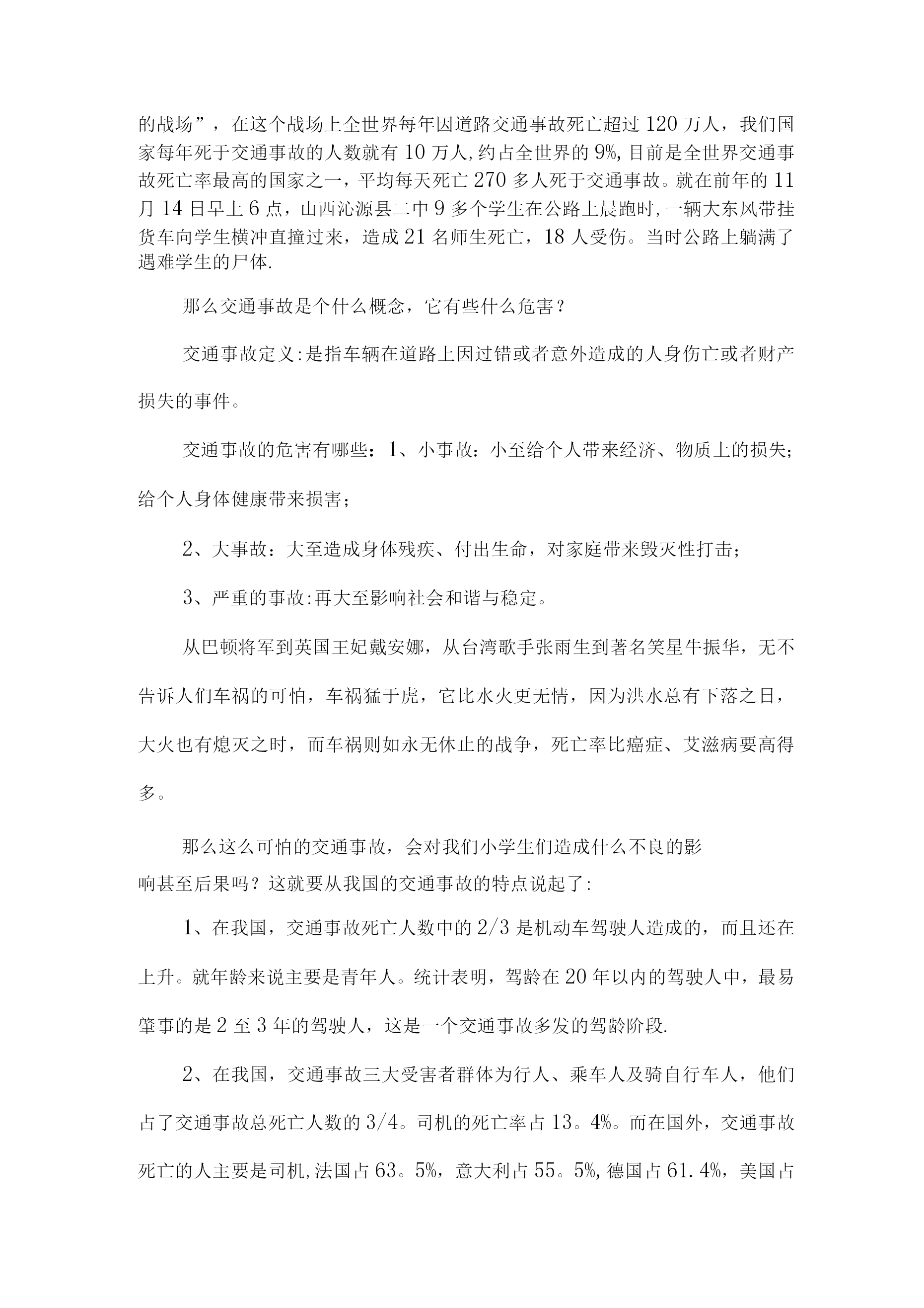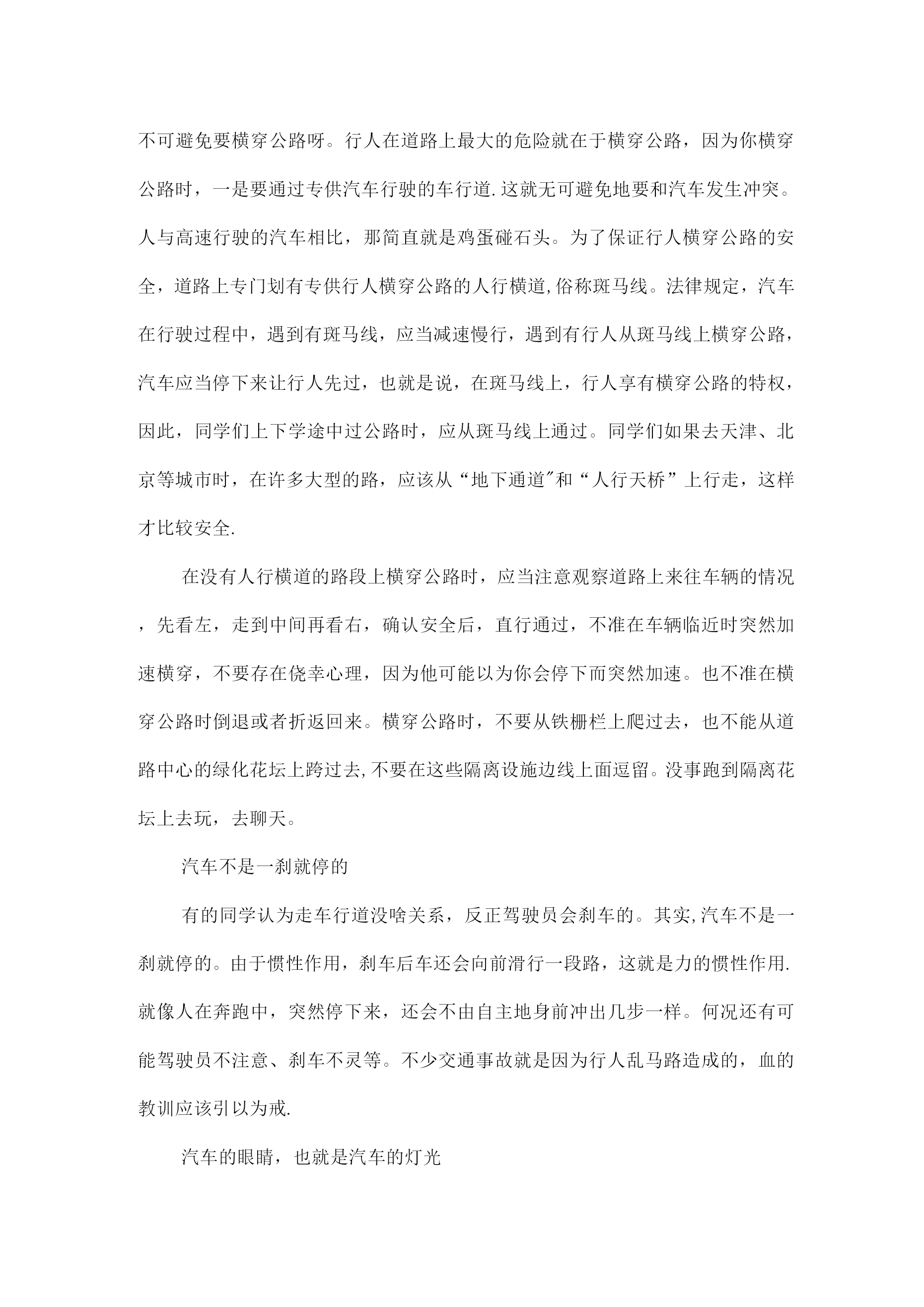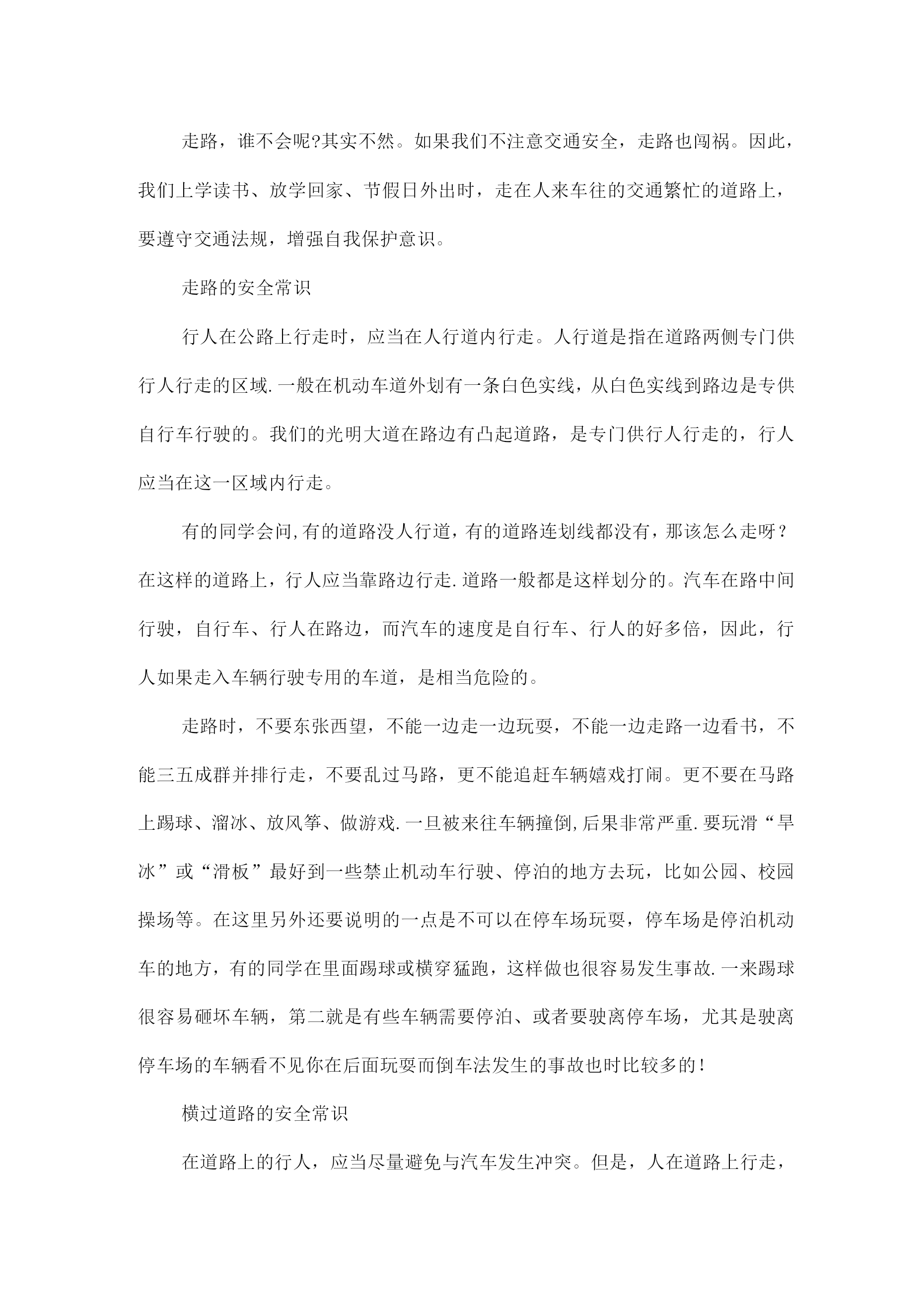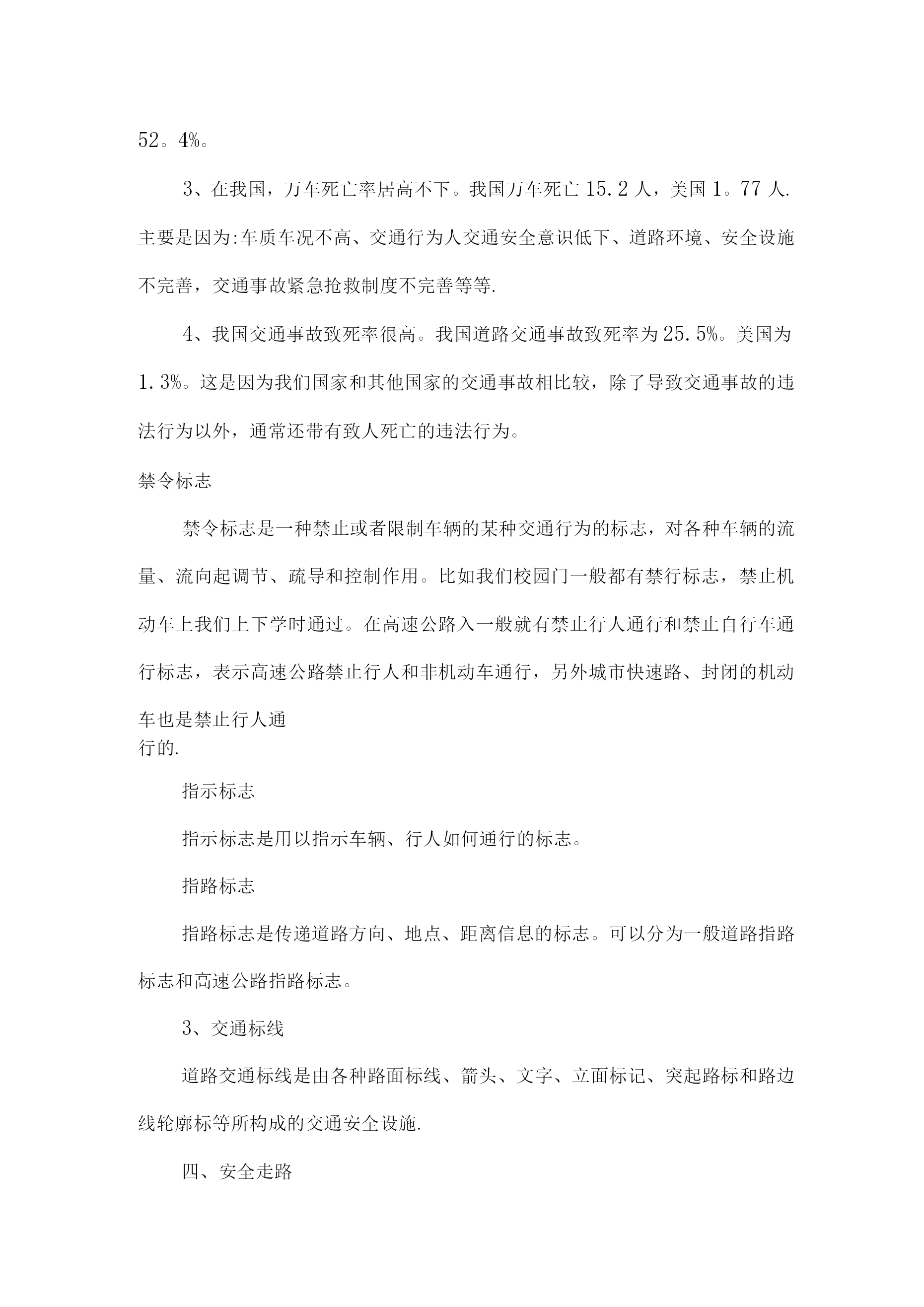 交通安全知识讲座“衣”、"食”、“住”、“行”,是人们生活中的四件大事,“行”就是交通.“高高兴兴上学去,平平安安回家来”成为师长和同学们共同的心愿,今天我们就来学习什么是交通,怎么样才能平安的从事交通。一、基本知识道路交通,是指人们的出行、物品的运输在道路范围内两地之间的通行。人、车、路是道路交通三要素,车和路是两个客观因素,人是主观因素,也是决定道路交通是否畅通和安全的决定性因素。道路交通的产生与发展,大体经历了三个时代:步行时代、马车时代和汽车时代。在学校有两类人,一类是教职员工,另一类就是学生。那么在道路交通中我们把人划分为以下几类:驾驶员、骑车人、乘车人、行人,还有其他人员:比如交警、道路的养护人员等,当然主要还是前四类从事交通行为。咱们来看,在四种行为人中,谁是强者,谁是弱者?强者之间、弱者之间的对话,好像拳击手之间,都不会有危险出现,但是强者和弱者之间碰撞,就有可能遭受很大的损伤。我们同学通常所属交通行为中的弱者,那么我们如何避免与马路上的强者一一汽车发生接触,我们一步一步来看。二、面临的交通安全形势随着国民经济的发展,改变了我们的生活,最明显的就是人们的生活节奏加快了,外出更加频繁,路面变得日益车水马龙,交通流量增长迅猛。这本来应该是一片忙碌而又祥和、欢乐的环境,同学们可否知道,马路其实是一个“无硝烟的战场”,在这个战场上全世界每年因道路交通事故死亡超过120万人,我们国家每年死于交通事故的人数就有10万人,约占全世界的9%,目前是全世界交通事故死亡率最高的国家之一,平均每天死亡270多人死于交通事故。就在前年的11月14日早上6点,山西沁源县二中9多个学生在公路上晨跑时,一辆大东风带挂货车向学生横冲直撞过来,造成21名师生死亡,18人受伤。当时公路上躺满了遇难学生的尸体.那么交通事故是个什么概念,它有些什么危害?交通事故定义:是指车辆在道路上因过错或者意外造成的人身伤亡或者财产损失的事件。交通事故的危害有哪些:1、小事故:小至给个人带来经济、物质上的损失;给个人身体健康带来损害;2、大事故:大至造成身体残疾、付出生命,对家庭带来毁灭性打击;3、严重的事故:再大至影响社会和谐与稳定。从巴顿将军到英国王妃戴安娜,从台湾歌手张雨生到著名笑星牛振华,无不告诉人们车祸的可怕,车祸猛于虎,它比水火更无情,因为洪水总有下落之日,大火也有熄灭之时,而车祸则如永无休止的战争,死亡率比癌症、艾滋病要高得多。那么这么可怕的交通事故,会对我们小学生们造成什么不良的影响甚至后果吗?这就要从我国的交通事故的特点说起了:1、在我国,交通事故死亡人数中的2/3是机动车驾驶人造成的,而且还在上升。就年龄来说主要是青年人。统计表明,驾龄在20年以内的驾驶人中,最易肇事的是2至3年的驾驶人,这是一个交通事故多发的驾龄阶段.2、在我国,交通事故三大受害者群体为行人、乘车人及骑自行车人,他们占了交通事故总死亡人数的3/4。司机的死亡率占13。4%。而在国外,交通事故死亡的人主要是司机,法国占63。5%,意大利占55。5%,德国占61.4%,美国占52。4%。3、在我国,万车死亡率居高不下。我国万车死亡15.2人,美国1。77人.主要是因为:车质车况不高、交通行为人交通安全意识低下、道路环境、安全设施不完善,交通事故紧急抢救制度不完善等等.4、我国交通事故致死率很高。我国道路交通事故致死率为25.5%。美国为1.3%。这是因为我们国家和其他国家的交通事故相比较,除了导致交通事故的违法行为以外,通常还带有致人死亡的违法行为。禁令标志禁令标志是一种禁止或者限制车辆的某种交通行为的标志,对各种车辆的流量、流向起调节、疏导和控制作用。比如我们校园门一般都有禁行标志,禁止机动车上我们上下学时通过。在高速公路入一般就有禁止行人通行和禁止自行车通行标志,表示高速公路禁止行人和非机动车通行,另外城市快速路、封闭的机动车也是禁止行人通行的.指示标志指示标志是用以指示车辆、行人如何通行的标志。指路标志指路标志是传递道路方向、地点、距离信息的标志。可以分为一般道路指路标志和高速公路指路标志。3、交通标线道路交通标线是由各种路面标线、箭头、文字、立面标记、突起路标和路边线轮廓标等所构成的交通安全设施.四、安全走路走路,谁不会呢?其实不然。如果我们不注意交通安全,走路也闯祸。因此,我们上学读书、放学回家、节假日外出时,走在人来车往的交通繁忙的道路上,要遵守交通法规,增强自我保护意识。走路的安全常识行人在公路上行走时,应当在人行道内行走。人行道是指在道路两侧专门供行人行走的区域.一般在机动车道外划有一条白色实线,从白色实线到路边是专供自行车行驶的。我们的光明大道在路边有凸起道路,是专门供行人行走的,行人应当在