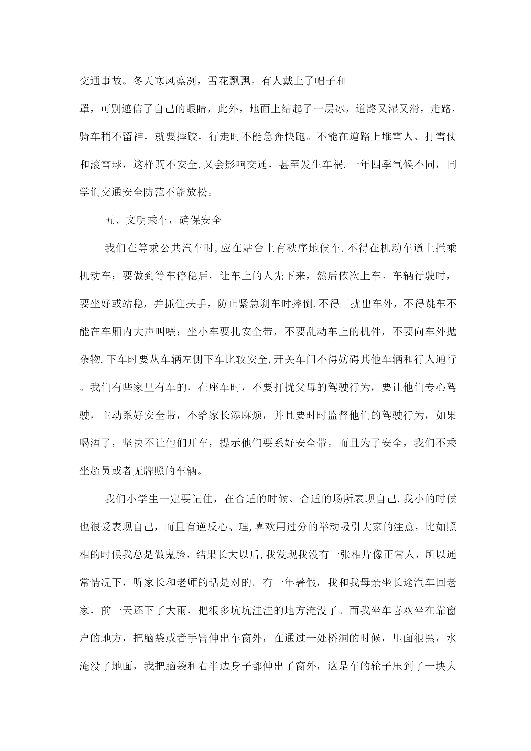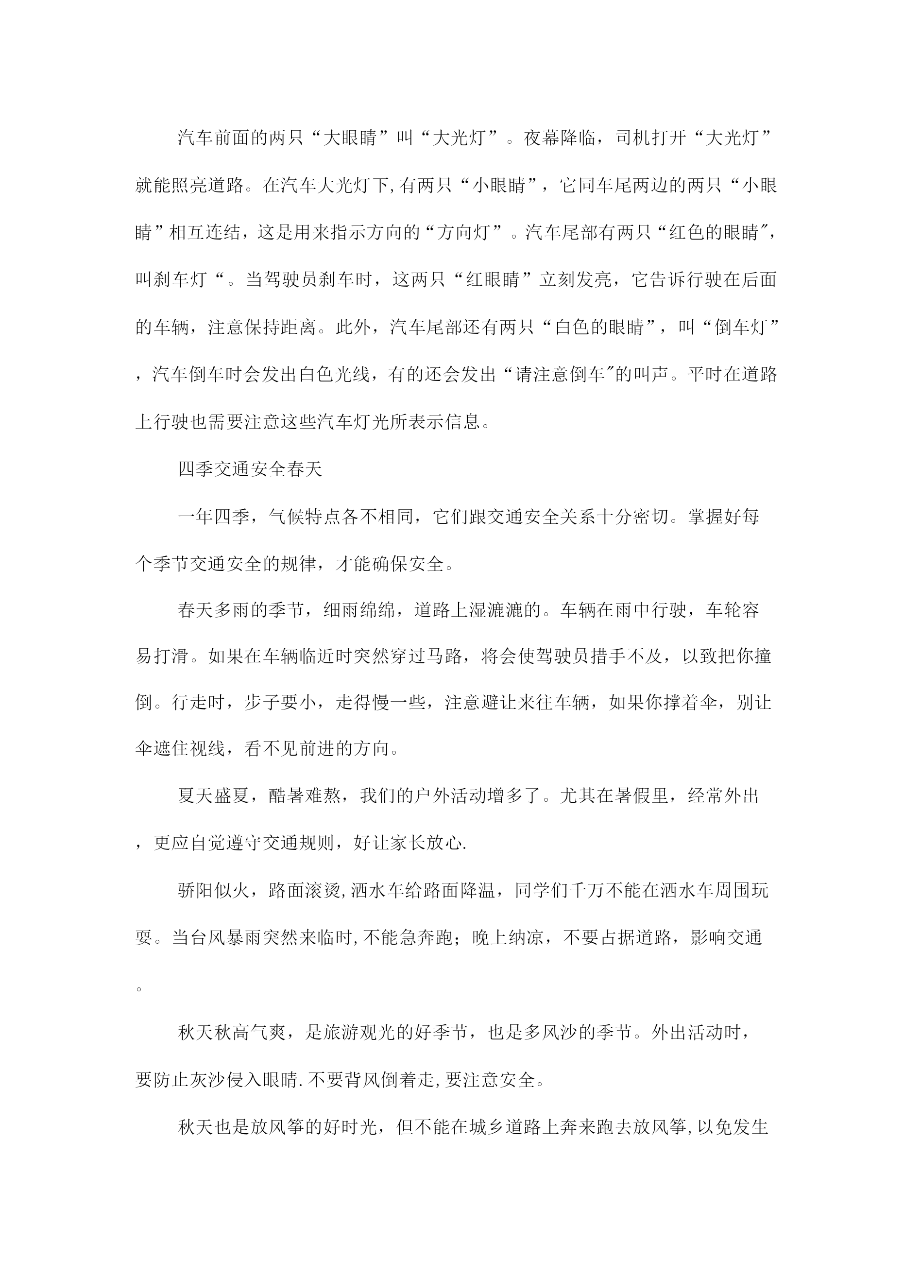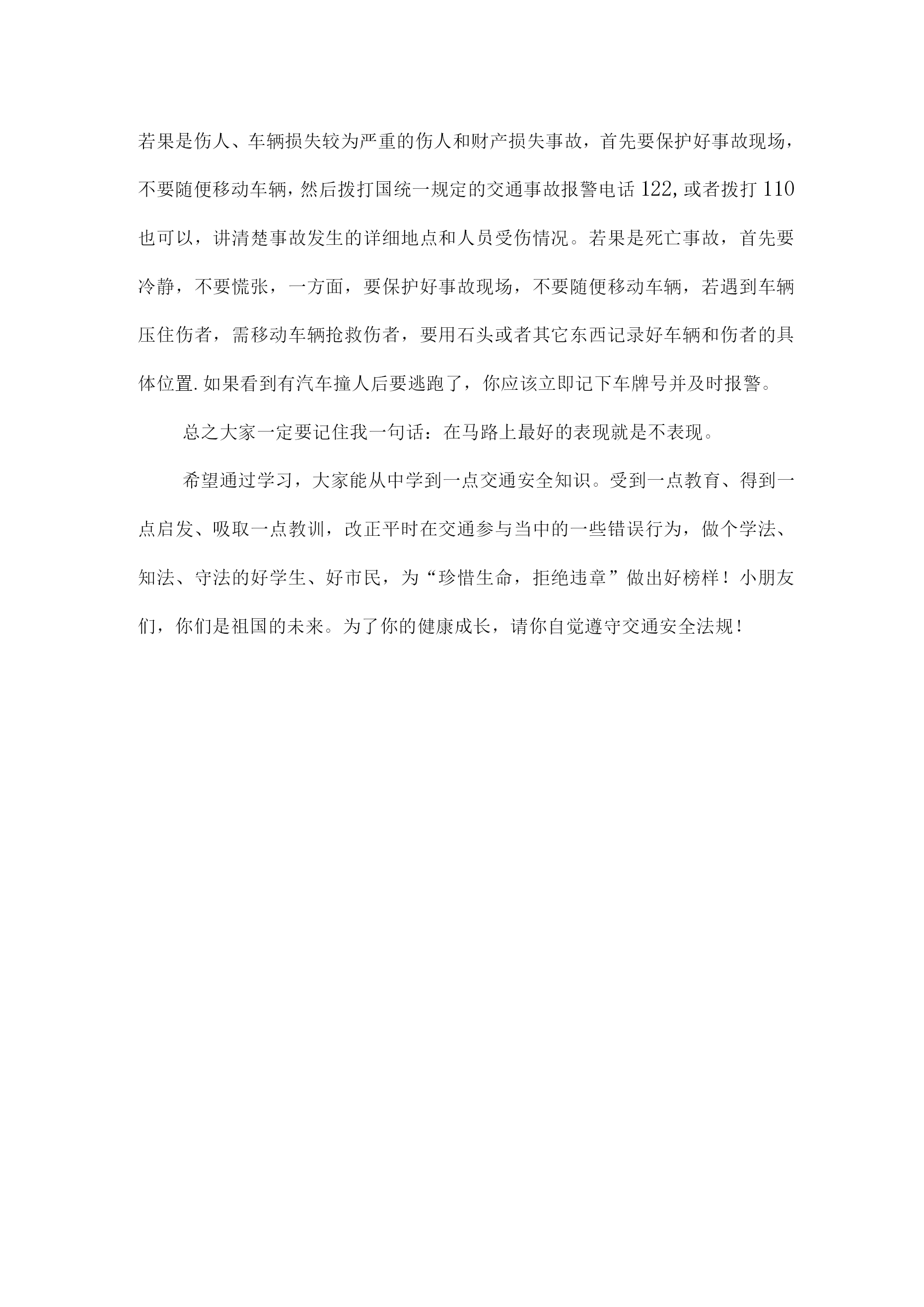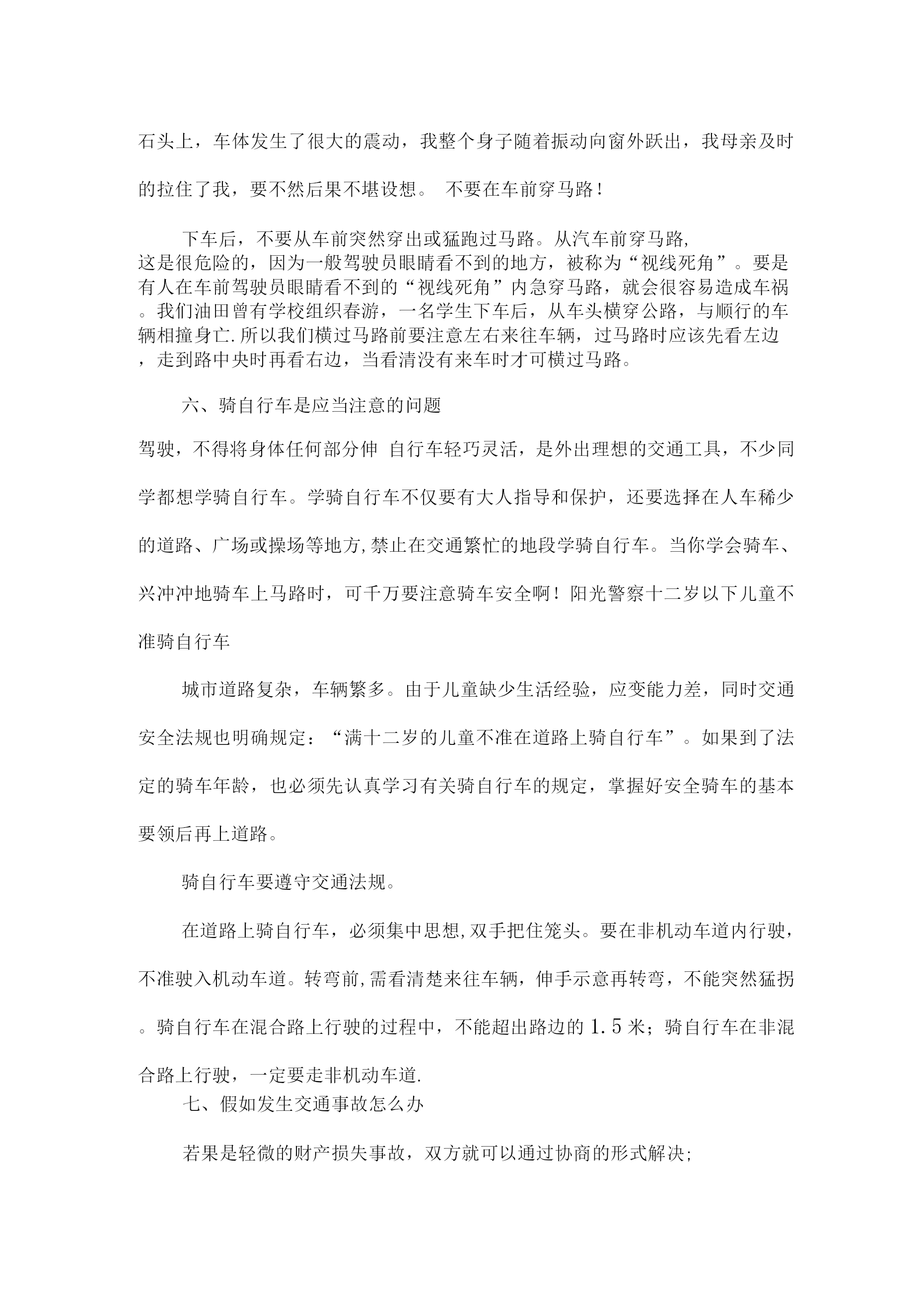 交通安全知识讲座“衣”、"食”、“住”、“行”,是人们生活中的四件大事,“行”就是交通.“高高兴兴上学去,平平安安回家来”成为师长和同学们共同的心愿,今天我们就来学习什么是交通,怎么样才能平安的从事交通。一、基本知识道路交通,是指人们的出行、物品的运输在道路范围内两地之间的通行。人、车、路是道路交通三要素,车和路是两个客观因素,人是主观因素,也是决定道路交通是否畅通和安全的决定性因素。道路交通的产生与发展,大体经历了三个时代:步行时代、马车时代和汽车时代。在学校有两类人,一类是教职员工,另一类就是学生。那么在道路交通中我们把人划分为以下几类:驾驶员、骑车人、乘车人、行人,还有其他人员:比如交警、道路的养护人员等,当然主要还是前四类从事交通行为。咱们来看,在四种行为人中,谁是强者,谁是弱者?强者之间、弱者之间的对话,好像拳击手之间,都不会有危险出现,但是强者和弱者之间碰撞,就有可能遭受很大的损伤。我们同学通常所属交通行为中的弱者,那么我们如何避免与马路上的强者一一汽车发生接触,我们一步一步来看。二、面临的交通安全形势随着国民经济的发展,改变了我们的生活,最明显的就是人们的生活节奏加快了,外出更加频繁,路面变得日益车水马龙,交通流量增长迅猛。这本来应该是一片忙碌而又祥和、欢乐的环境,同学们可否知道,马路其实是一个“无硝烟的战场”,在这个战场上全世界每年因道路交通事故死亡超过120万人,我们国家每年死于交通事故的人数就有10万人,约占全世界的9%,目前是全世界交通事故死亡率最高的国家之一,平均每天死亡270多人死于交通事故。就在前年的11月14日早上6点,山西沁源县二中9多个学生在公路上晨跑时,一辆大东风带挂货车向学生横冲直撞过来,造成21名师生死亡,18人受伤。当时公路上躺满了遇难学生的尸体.那么交通事故是个什么概念,它有些什么危害?交通事故定义:是指车辆在道路上因过错或者意外造成的人身伤亡或者财产损失的事件。交通事故的危害有哪些:1、小事故:小至给个人带来经济、物质上的损失;给个人身体健康带来损害;2、大事故:大至造成身体残疾、付出生命,对家庭带来毁灭性打击;3、严重的事故:再大至影响社会和谐与稳定。从巴顿将军到英国王妃戴安娜,从台湾歌手张雨生到著名笑星牛振华,无不告诉人们车祸的可怕,车祸猛于虎,它比水火更无情,因为洪水总有下落之日,大火也有熄灭之时,而车祸则如永无休止的战争,死亡率比癌症、艾滋病要高得多。那么这么可怕的交通事故,会对我们小学生们造成什么不良的影响甚至后果吗?这就要从我国的交通事故的特点说起了:1、在我国,交通事故死亡人数中的2/3是机动车驾驶人造成的,而且还在上升。就年龄来说主要是青年人。统计表明,驾龄在20年以内的驾驶人中,最易肇事的是2至3年的驾驶人,这是一个交通事故多发的驾龄阶段.2、在我国,交通事故三大受害者群体为行人、乘车人及骑自行车人,他们占了交通事故总死亡人数的3/4。司机的死亡率占13。4%。而在国外,交通事故死亡的人主要是司机,法国占63。5%,意大利占55。5%,德国占61.4%,美国占52。4%。3、在我国,万车死亡率居高不下。我国万车死亡15.2人,美国1。77人.主要是因为:车质车况不高、交通行为人交通安全意识低下、道路环境、安全设施不完善,交通事故紧急抢救制度不完善等等.4、我国交通事故致死率很高。我国道路交通事故致死率为25.5%。美国为1.3%。这是因为我们国家和其他国家的交通事故相比较,除了导致交通事故的违法行为以外,通常还带有致人死亡的违法行为。禁令标志禁令标志是一种禁止或者限制车辆的某种交通行为的标志,对各种车辆的流量、流向起调节、疏导和控制作用。比如我们校园门一般都有禁行标志,禁止机动车上我们上下学时通过。在高速公路入一般就有禁止行人通行和禁止自行车通行标志,表示高速公路禁止行人和非机动车通行,另外城市快速路、封闭的机动车也是禁止行人通行的.指示标志指示标志是用以指示车辆、行人如何通行的标志。指路标志指路标志是传递道路方向、地点、距离信息的标志。可以分为一般道路指路标志和高速公路指路标志。3、交通标线道路交通标线是由各种路面标线、箭头、文字、立面标记、突起路标和路边线轮廓标等所构成的交通安全设施.四、安全走路走路,谁不会呢?其实不然。如果我们不注意交通安全,走路也闯祸。因此,我们上学读书、放学回家、节假日外出时,走在人来车往的交通繁忙的道路上,要遵守交通法规,增强自我保护意识。走路的安全常识行人在公路上行走时,应当在人行道内行走。人行道是指在道路两侧专门供行人行走的区域.一般在机动车道外划有一条白色实线,从白色实线到路边是专供自行车行驶的。我们的光明大道在路边有凸起道路,是专门供行人行走的,行人应当在