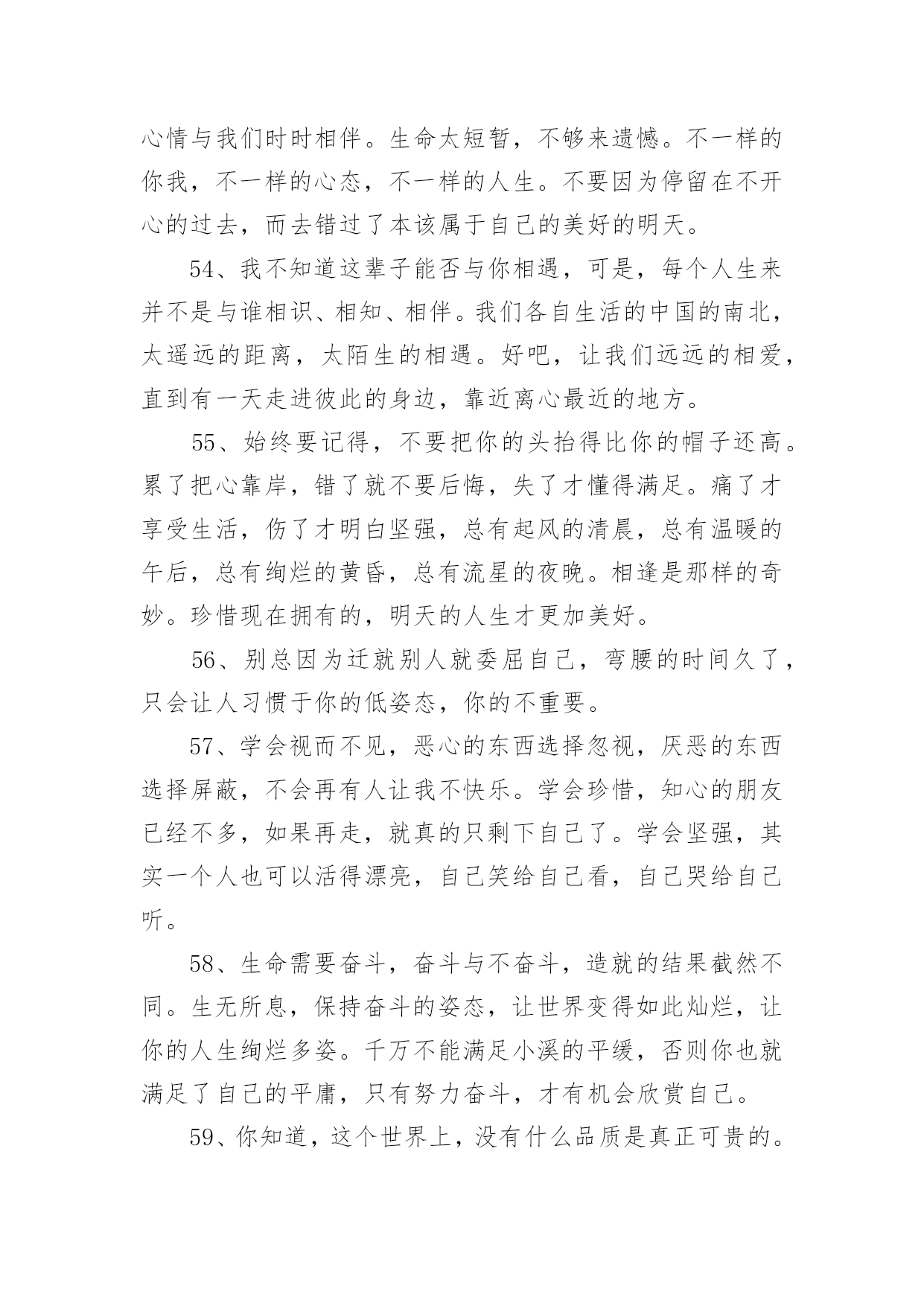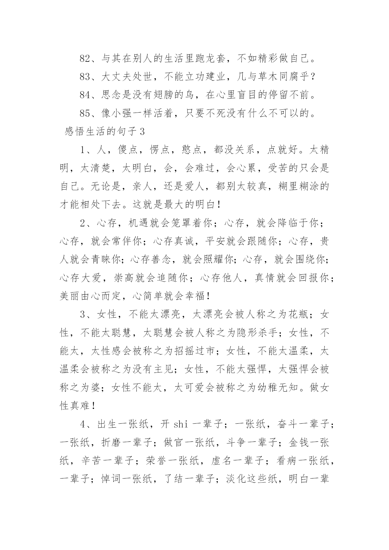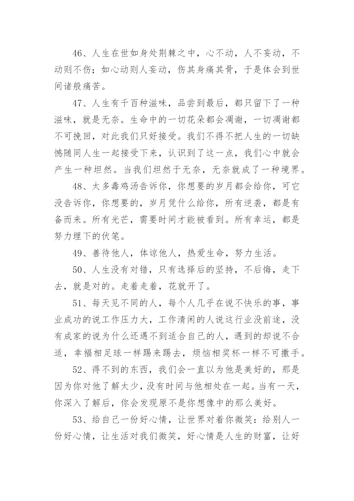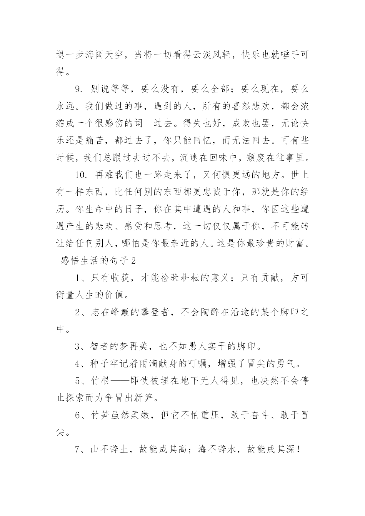 感悟生活的句子感悟生活的句子在平凡的学习、工作、生活中,大家肯定对各类句子都很熟悉吧,句子是由词或词组构成的,是具有一定语调并表达一个完整意思的语言运用单位。那什么样的句子才算得上是经典呢?以下是小编为大家收集的感悟生活的句子,希望对大家有所帮助。感悟生活的句子11.知世故而不世故才是最善良的成熟。生活如水,人生似茶。会有人说你好,也会有人说你不好,但只要我们做人做事问心无愧,就不必执着于他人的评判。当有人对你施不敬的言语,请不要在意,更不要因此而起烦恼,因为这些言语改变不了事实,却可能搅乱你的心。心如果乱了,一切就都乱了。2.生活,宁静就好,做人,简单就好。生活里有两大误区:一是生活给人看,二是看别人生活。不要去让其他人分散你的注意力。专注于你的目标,去做积极的人、相信就在你身边。不要让其他事情分心了你的目标,这些都无助于实现你的目标。3.不去惦记得失,不去顾虑成败,面对生活,从容、镇静,无论结果如何,笑脸相迎,乐观对待,即使,前途渺茫,道路曲折,依然坚信,路,就在脚下。人生,所有的一切,就是破解,就是明了。奋斗,就是一种证明,告诉我们前行,不惧生活的艰辛,相信,你能。4.当生活因为这样的真相日趋平静,我终于知道,我再也无法向我渴望的每一个远方,致以深深的敬意。痛苦是比较出来的,幸福是珍惜得来的。越是计较心理越不平衡,越不平衡烦恼越多,我们因此变得不从容。胜过对手的最好办法,不是去斗争和报复,而是让自己比对手更强大。5.生活本没有绝对的是与非,看起来幸福的人,心里也许有难言的苦;学会坦然,你就会在遭遇挫折时收获一份执著,在获得成功时保持一份本色;学会坦然,你就学会了勇于面对所有的痛苦;学会了珍惜所有的幸福。学会坦然,就是一种不屈。6.太当心了,做人没有意思。凡事顺其自然;遇事处之泰然;生活原本就是如此的滑稽,不要总怀疑春色总在别人家,关键在于调整自己的视角和心境。与人不攀不比,走好自己的路,欣赏身边的景,平淡而真实。7.你去了很多地方,做了很多事情,生活是旋律,不论快慢,要努力使每一天都开心而有意义,没有人可以回到过去从头再来,但是每个人都可以从今天开始,创造一个全新的结局。不管怎样,生活还是继续行进。8.善待自己的人一定是快乐无比的。因为快乐,我们脚步轻快。因为快乐,我们活得从容。因为快乐,我们工作得心应手。因为快乐,我们也容易予人快乐。其实很多时候,悲伤只是一种心情,而快乐可以自己给。无论感情还是事业,退一步海阔天空,当将一切看得云淡风轻,快乐也就唾手可得。9.别说等等,要么没有,要么全部;要么现在,要么永远。我们做过的事,遇到的人,所有的喜怒悲欢,都会浓缩成一个很感伤的词—过去。得失也好,成败也罢,无论快乐还是痛苦,都过去了,你只能回忆,而无法回去。可有些时候,我们总跟过去过不去,沉迷在回味中,颓废在往事里。10.再难我们也一路走来了,又何惧更远的地方。世上有一样东西,比任何别的东西都更忠诚于你,那就是你的经历。你生命中的日子,你在其中遭遇的人和事,你因这些遭遇产生的悲欢、感受和思考,这一切仅仅属于你,不可能转让给任何别人,哪怕是你最亲近的人。这是你最珍贵的财富。感悟生活的句子21、只有收获,才能检验耕耘的意义;只有贡献,方可衡量人生的价值。2、志在峰巅的攀登者,不会陶醉在沿途的某个脚印之中。3、智者的梦再美,也不如愚人实干的脚印。4、种子牢记着雨滴献身的叮嘱,增强了冒尖的勇气。5、竹根——即使被埋在地下无人得见,也决然不会停止探索而力争冒出新笋。6、竹笋虽然柔嫩,但它不怕重压,敢于奋斗、敢于冒尖。7、山不辞土,故能成其高;海不辞水,故能成其深!8、山涧的泉水经过一路曲折,才唱出一支美妙的歌。9、岸边的奇花异草,是拘留不住奔腾向前的江水的。10、自然界没有风风雨雨,大地就不会春华秋实。11、只有创造,才是真正的享受,只有拼搏,才是充实的生活。12、只有登上山顶,才能看到那边的风光。13、只有脚踏实地的人,大地才乐意留下他的脚印。14、山路不象坦途那样匍匐在人们足下。15、山路曲折盘旋,但毕竟朝着顶峰延伸。16、生命力的意义在于拼搏,因为世界本身就是一个竞技场。17、生命力顽强的种子,从不对瘠土唱诅咒的歌。18、失败是什么?没有什么,只是更走近成功一步;成功是什么?就是走过了所有通向失败的路,只剩下一条路,那就是成功的路。19、如果缺少破土面出并与风雪拼搏的勇气,种子的前途并不比落叶美妙一分。20、如果为了安全而不和大海在一起,船就失去了存在的意义。21、在避风的港湾里,找不到昂扬的帆。22、事常与人违,事总在人为。23、事业的大厦如缺乏毅力的支柱,只能是空中楼阁。24、收获是事业的雨量计;聚集着奋斗者洒落的每滴汗珠。25、谁把安逸当成幸福的花朵,那么等到结果时节,他只能望着空枝叹息。26、松驰的琴弦,永远奏不出时代