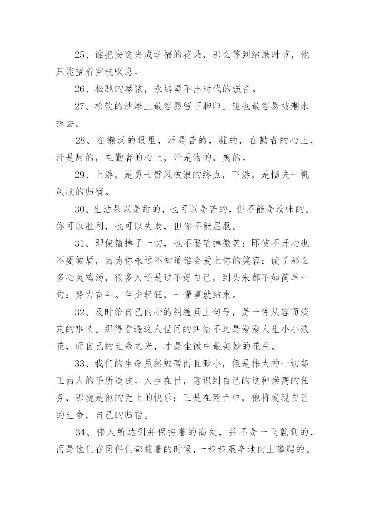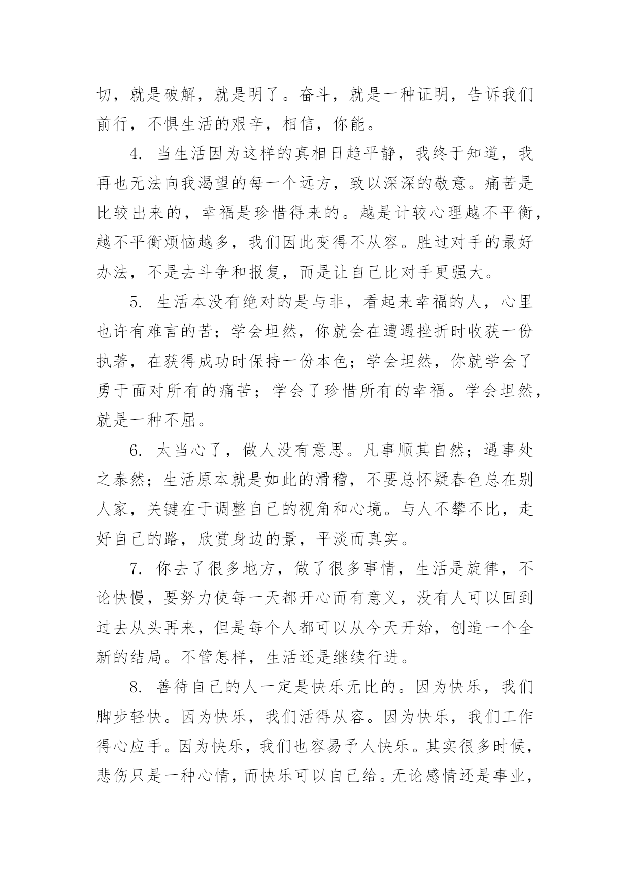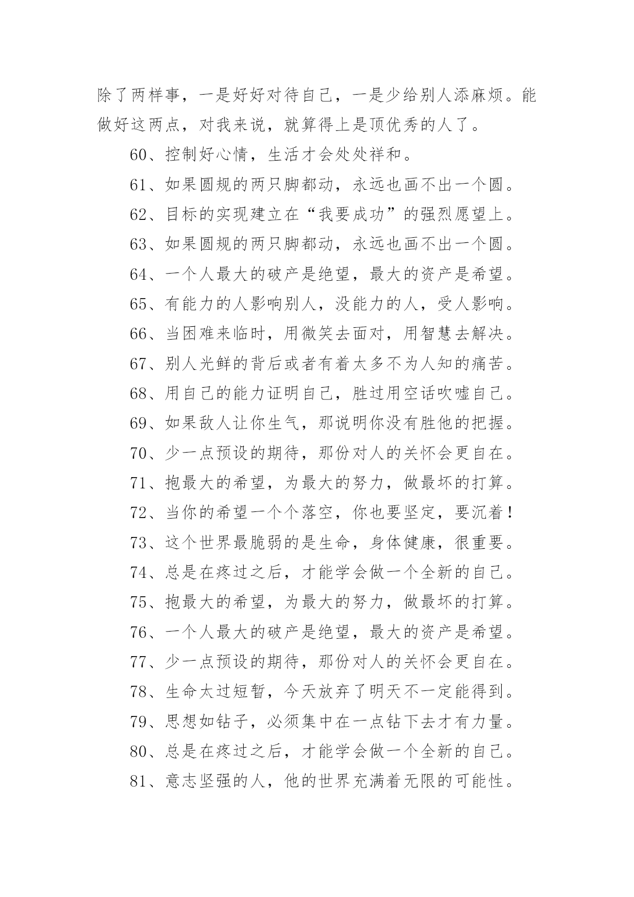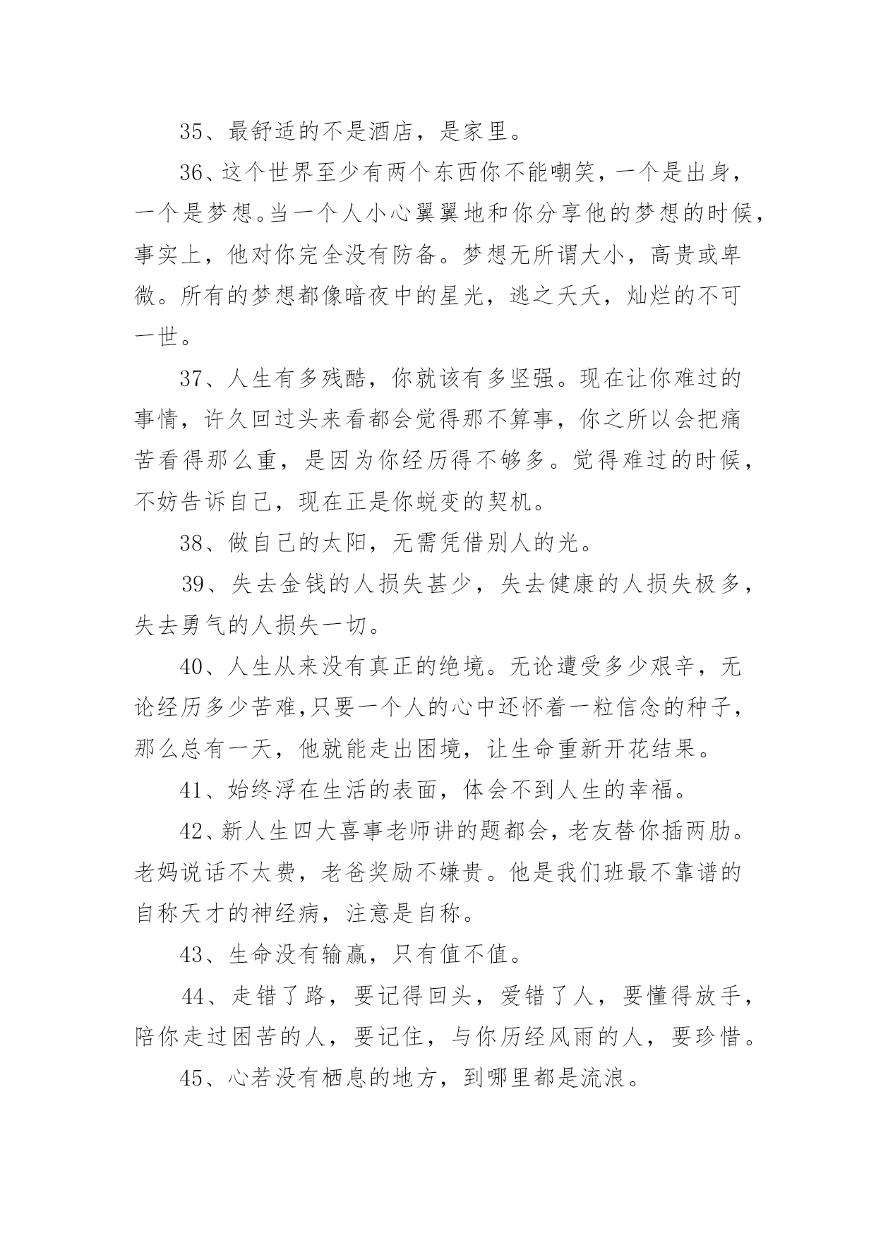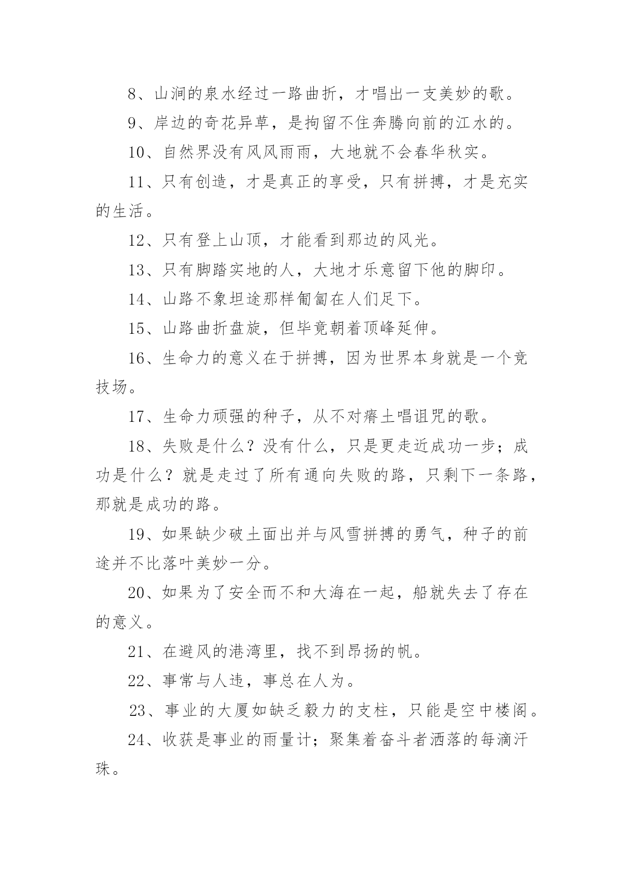 感悟生活的句子感悟生活的句子在平凡的学习、工作、生活中,大家肯定对各类句子都很熟悉吧,句子是由词或词组构成的,是具有一定语调并表达一个完整意思的语言运用单位。那什么样的句子才算得上是经典呢?以下是小编为大家收集的感悟生活的句子,希望对大家有所帮助。感悟生活的句子11.知世故而不世故才是最善良的成熟。生活如水,人生似茶。会有人说你好,也会有人说你不好,但只要我们做人做事问心无愧,就不必执着于他人的评判。当有人对你施不敬的言语,请不要在意,更不要因此而起烦恼,因为这些言语改变不了事实,却可能搅乱你的心。心如果乱了,一切就都乱了。2.生活,宁静就好,做人,简单就好。生活里有两大误区:一是生活给人看,二是看别人生活。不要去让其他人分散你的注意力。专注于你的目标,去做积极的人、相信就在你身边。不要让其他事情分心了你的目标,这些都无助于实现你的目标。3.不去惦记得失,不去顾虑成败,面对生活,从容、镇静,无论结果如何,笑脸相迎,乐观对待,即使,前途渺茫,道路曲折,依然坚信,路,就在脚下。人生,所有的一切,就是破解,就是明了。奋斗,就是一种证明,告诉我们前行,不惧生活的艰辛,相信,你能。4.当生活因为这样的真相日趋平静,我终于知道,我再也无法向我渴望的每一个远方,致以深深的敬意。痛苦是比较出来的,幸福是珍惜得来的。越是计较心理越不平衡,越不平衡烦恼越多,我们因此变得不从容。胜过对手的最好办法,不是去斗争和报复,而是让自己比对手更强大。5.生活本没有绝对的是与非,看起来幸福的人,心里也许有难言的苦;学会坦然,你就会在遭遇挫折时收获一份执著,在获得成功时保持一份本色;学会坦然,你就学会了勇于面对所有的痛苦;学会了珍惜所有的幸福。学会坦然,就是一种不屈。6.太当心了,做人没有意思。凡事顺其自然;遇事处之泰然;生活原本就是如此的滑稽,不要总怀疑春色总在别人家,关键在于调整自己的视角和心境。与人不攀不比,走好自己的路,欣赏身边的景,平淡而真实。7.你去了很多地方,做了很多事情,生活是旋律,不论快慢,要努力使每一天都开心而有意义,没有人可以回到过去从头再来,但是每个人都可以从今天开始,创造一个全新的结局。不管怎样,生活还是继续行进。8.善待自己的人一定是快乐无比的。因为快乐,我们脚步轻快。因为快乐,我们活得从容。因为快乐,我们工作得心应手。因为快乐,我们也容易予人快乐。其实很多时候,悲伤只是一种心情,而快乐可以自己给。无论感情还是事业,退一步海阔天空,当将一切看得云淡风轻,快乐也就唾手可得。9.别说等等,要么没有,要么全部;要么现在,要么永远。我们做过的事,遇到的人,所有的喜怒悲欢,都会浓缩成一个很感伤的词—过去。得失也好,成败也罢,无论快乐还是痛苦,都过去了,你只能回忆,而无法回去。可有些时候,我们总跟过去过不去,沉迷在回味中,颓废在往事里。10.再难我们也一路走来了,又何惧更远的地方。世上有一样东西,比任何别的东西都更忠诚于你,那就是你的经历。你生命中的日子,你在其中遭遇的人和事,你因这些遭遇产生的悲欢、感受和思考,这一切仅仅属于你,不可能转让给任何别人,哪怕是你最亲近的人。这是你最珍贵的财富。感悟生活的句子21、只有收获,才能检验耕耘的意义;只有贡献,方可衡量人生的价值。2、志在峰巅的攀登者,不会陶醉在沿途的某个脚印之中。3、智者的梦再美,也不如愚人实干的脚印。4、种子牢记着雨滴献身的叮嘱,增强了冒尖的勇气。5、竹根——即使被埋在地下无人得见,也决然不会停止探索而力争冒出新笋。6、竹笋虽然柔嫩,但它不怕重压,敢于奋斗、敢于冒尖。7、山不辞土,故能成其高;海不辞水,故能成其深!8、山涧的泉水经过一路曲折,才唱出一支美妙的歌。9、岸边的奇花异草,是拘留不住奔腾向前的江水的。10、自然界没有风风雨雨,大地就不会春华秋实。11、只有创造,才是真正的享受,只有拼搏,才是充实的生活。12、只有登上山顶,才能看到那边的风光。13、只有脚踏实地的人,大地才乐意留下他的脚印。14、山路不象坦途那样匍匐在人们足下。15、山路曲折盘旋,但毕竟朝着顶峰延伸。16、生命力的意义在于拼搏,因为世界本身就是一个竞技场。17、生命力顽强的种子,从不对瘠土唱诅咒的歌。18、失败是什么?没有什么,只是更走近成功一步;成功是什么?就是走过了所有通向失败的路,只剩下一条路,那就是成功的路。19、如果缺少破土面出并与风雪拼搏的勇气,种子的前途并不比落叶美妙一分。20、如果为了安全而不和大海在一起,船就失去了存在的意义。21、在避风的港湾里,找不到昂扬的帆。22、事常与人违,事总在人为。23、事业的大厦如缺乏毅力的支柱,只能是空中楼阁。24、收获是事业的雨量计;聚集着奋斗者洒落的每滴汗珠。25、谁把安逸当成幸福的花朵,那么等到结果时节,他只能望着空枝叹息。26、松驰的琴弦,永远奏不出时代