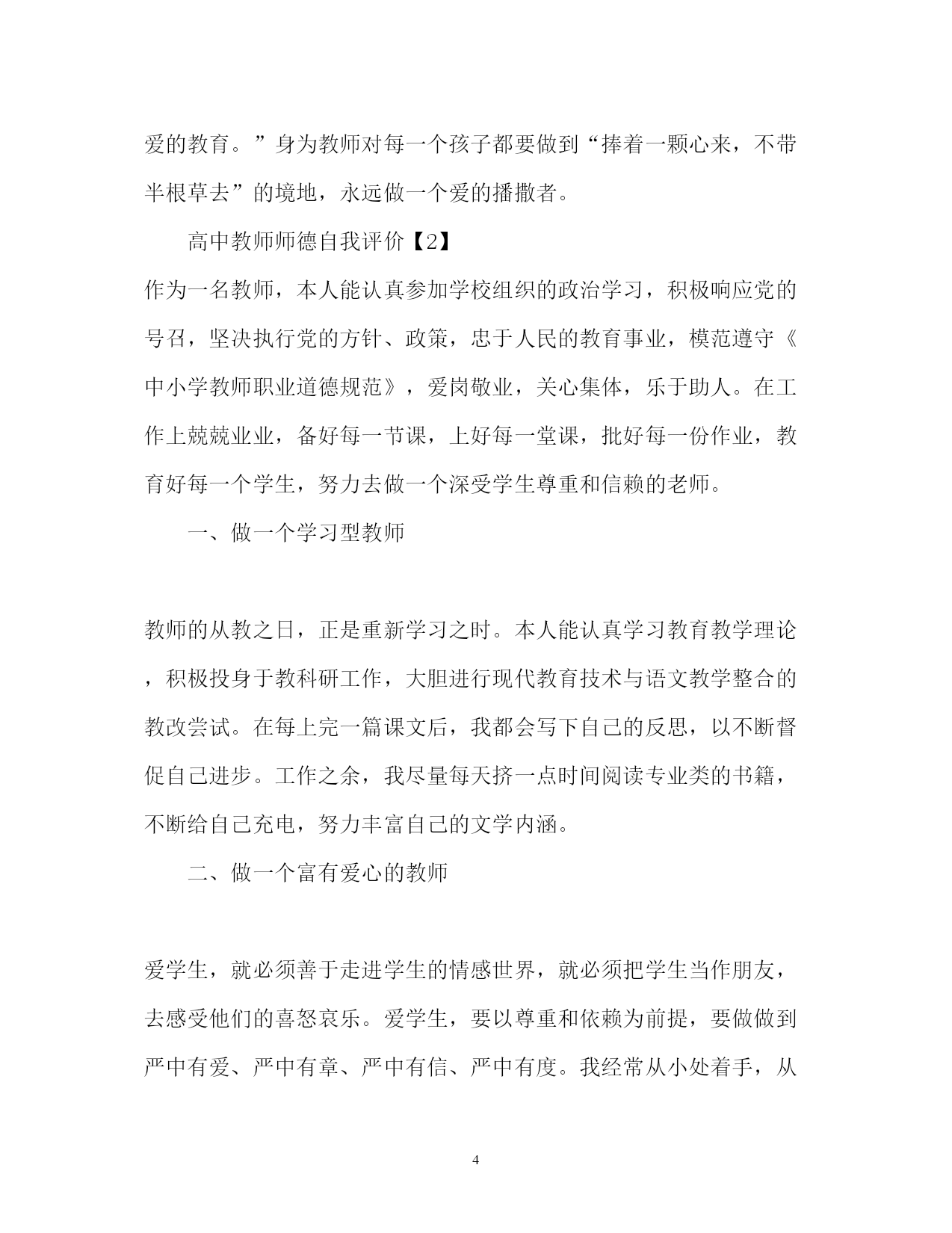 此资料由网络收集而来,如有侵权请告知上传者立即删除。资料共分享,我们负责传递知识。PAGEPAGE6高中教师师德自我评价2018高中教师师德自我评价高中教师师德自我评价【1】对于师德,我们并不陌生。不同时代对师德有不同的要求,现代师德是对古代师德的继承与发展,知识经济时代对师德赋予了新的内涵。通过暑期的学习,我对师德师风教育的重要意义有较明确的认识,对小学教师职业道德规范内容也更熟悉了。让我知道了:1。爱岗敬业、献身教育是师德的基本要求2.热爱学生、教书育人是师德的核心3、更新观念、努力创新是师德的新发展4.以身作则、为人师表是师德的人格力量5.终身学习、不断进取是师德的升华对照>和>的要求,结合自己的教育工作生涯,自我剖析如下:一,主动意识不强。有时对待一些中心工作抱着保持原有的态度,不愿深入,遇事不愿多想,心想反正上有领导,领导咋说我咋办,肯定错不了。许多工作到推不掉时才仓促动手做。二,工作协调性差。总认为自己能做好的事情不必劳驾他人,一人受累一人顶,到头来吃得苦多,犯的错多,弄得自己受屈,他人埋怨。三,平时不注意自身形象,不拘小节。说话随口无心,想说就说,不分场合、对象,谈话不注意方式方法。四,关心、帮助后进生做得不够,与学生的谈心交流、沟通较少,做了许多自认为是不错却得不到别人理解的事。五,情绪易激动,言行有时过激,自控能力不强。六,纪律方面,虽然我每天坚持早到迟退,但有时也开小差。以上不足之处,恳请各位领导、同事多多批评指正。如何加强师德修养?我认为可以从以下几方面做起:1、更新教育观念,彻底改变以往那种惩罚学生是为学生好的错误思想,主动、积极地建立一种民主、平等、和谐的师生关系,尊重学生人格,热爱学生,尤其要热爱差生和后进生。2、树立几个意识:(1)牢固树立“育人先做人,正人先正己”的意识,要求别人做到,自己坚决要做到。(2)牢固树立“学校无小事,事事都育人;教师无小节,处处作表率”的意识,以教书育人为本职,作学生、教师的表率。(3)牢固树立服务意识,忧患意识,竞争意识,增强使命感、紧迫感和危机感。3、积极调整心态,明确自身的“责、权、义”,正确处理奉献与索取、集体与个人、名利和道义之间的关系。4作为班主任要严以律己,要求学生做到的,自己首先做到,坚持上班早到迟退,准时上课,按时下课。班中不脱岗。总之,我要加强学习,振奋精神,努力完成本职工作。二是从严治教,加强自身建设,进行教学上的改革,努力教育好我们的学生----祖国的花朵;三是振奋精神,以百倍的干劲投身于社会主义教育事业。教科文总干事马约翰先生说的.:“世界上只有一种教育——爱的教育。”身为教师对每一个孩子都要做到“捧着一颗心来,不带半根草去”的境地,永远做一个爱的播撒者。高中教师师德自我评价【2】作为一名教师,本人能认真参加学校组织的政治学习,积极响应党的号召,坚决执行党的方针、政策,忠于人民的教育事业,模范遵守《中小学教师职业道德规范》,爱岗敬业,关心集体,乐于助人。在工作上兢兢业业,备好每一节课,上好每一堂课,批好每一份作业,教育好每一个学生,努力去做一个深受学生尊重和信赖的老师。一、做一个学习型教师教师的从教之日,正是重新学习之时。本人能认真学习教育教学理论,积极投身于教科研工作,大胆进行现代教育技术与语文教学整合的教改尝试。在每上完一篇课文后,我都会写下自己的反思,以不断督促自己进步。工作之余,我尽量每天挤一点时间阅读专业类的书籍,不断给自己充电,努力丰富自己的文学内涵。二、做一个富有爱心的教师爱学生,就必须善于走进学生的情感世界,就必须把学生当作朋友,去感受他们的喜怒哀乐。爱学生,要以尊重和依赖为前提,要做做到严中有爱、严中有章、严中有信、严中有度。我经常从小处着手,从学生关心的事寻求最佳教育时机,给学生春风沐浴般的教育。作为班主任,我主动做好学生的思想工作,经常找一些不同层次的学生谈心,努力进入每个学生的内心世界,了解他们真正需要的是什么。其次,我和家长也积极共同探讨教育孩子的方法,或上门家访或主动打电话给家长,使家长的教育更具理性。三、做一个理念新的教师目前,新一轮的基础教育改革已经全面推开,在认真学习新课程理念的基础上,结合自己所教的学科,积极探索有效的教学方法。在英语课上,我把英语知识与学生的生活相结合,为学生创设一个富有生活气息的学习情境,同时注重学生的探究发现,引导学生在学习中学会合作交流,提高学习能力。使学生的知识来源不只是老师,更多的是来自对书本的理解和与同伴的交流,促使学生在学习中学会学习。回顾一年来的工作,在得与失中思索,自己一直奉行踏实工作、虚心学习的原则,而这或喜或忧、或得或失的点点滴滴必将成为我生命中的绚丽色彩,点缀着我的人生,